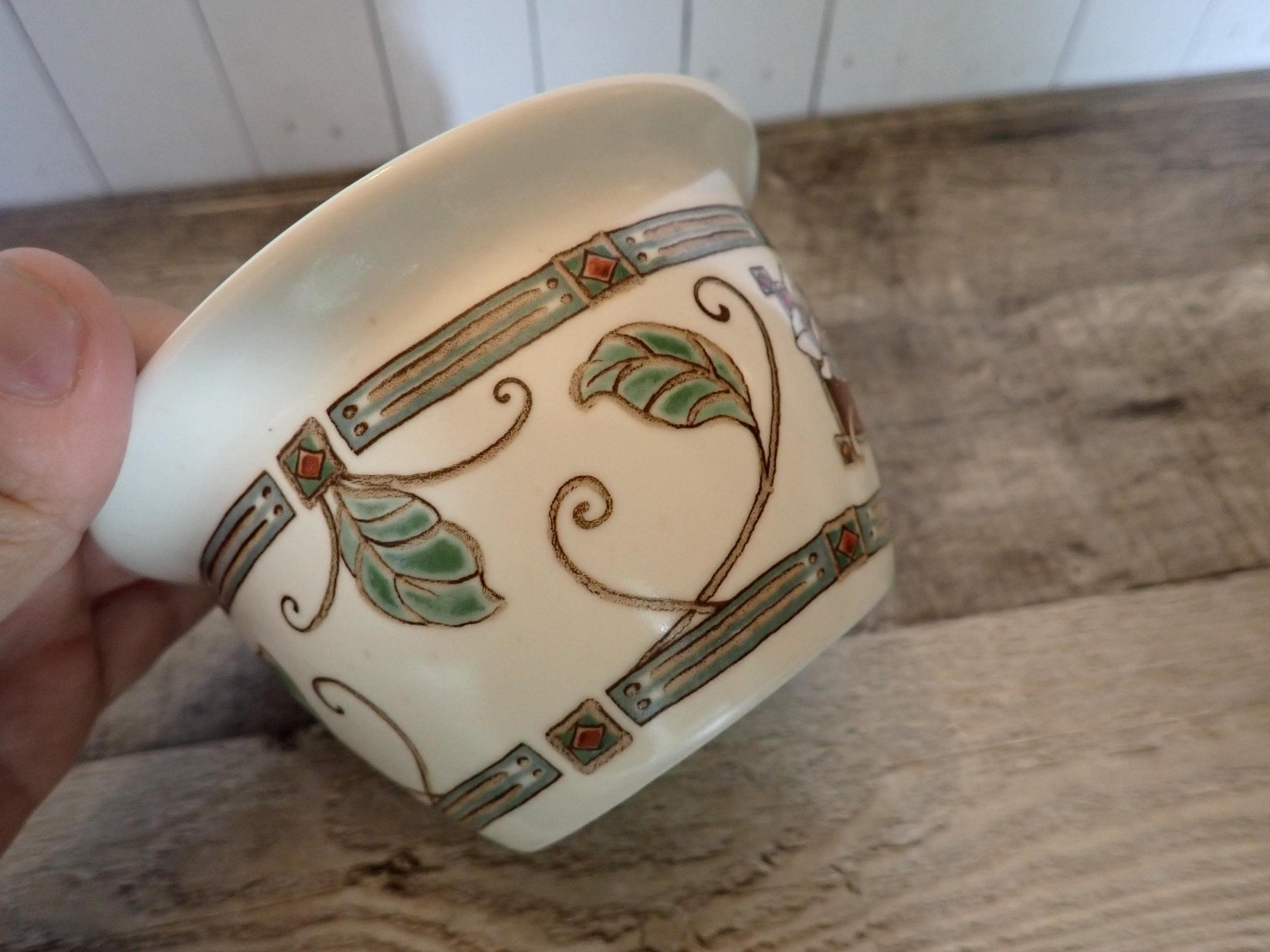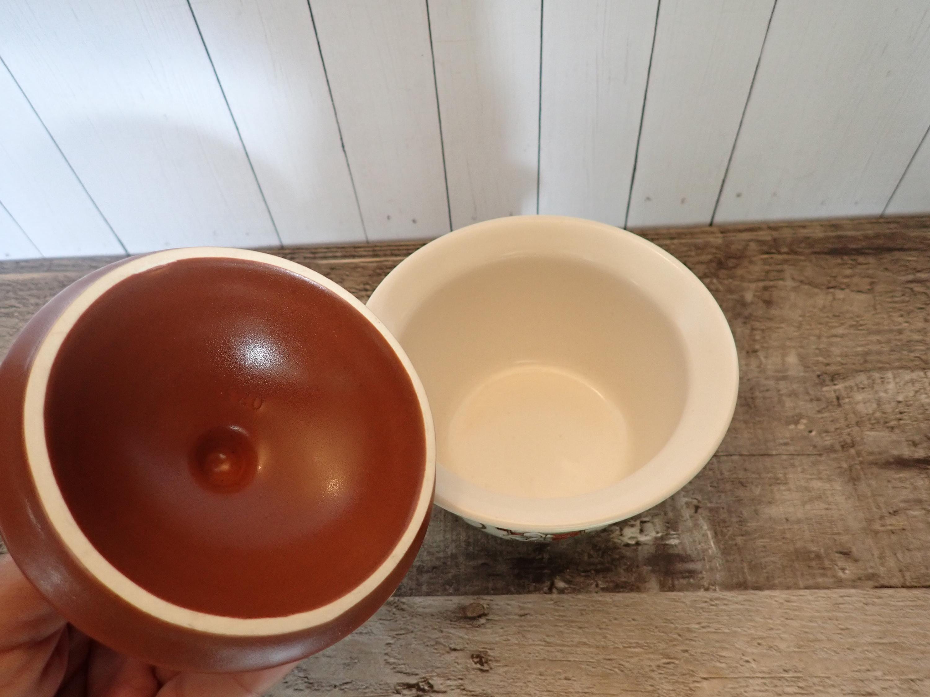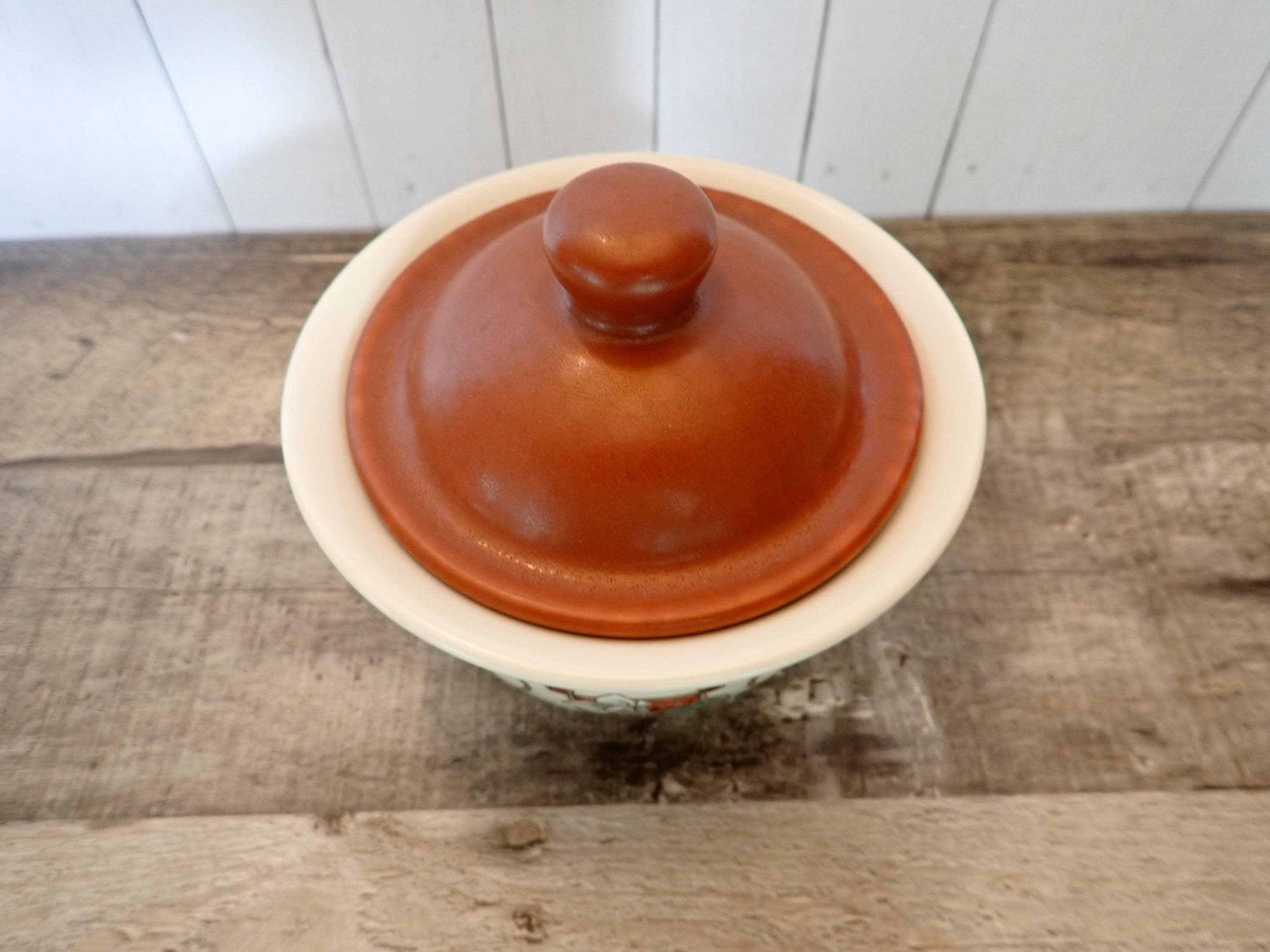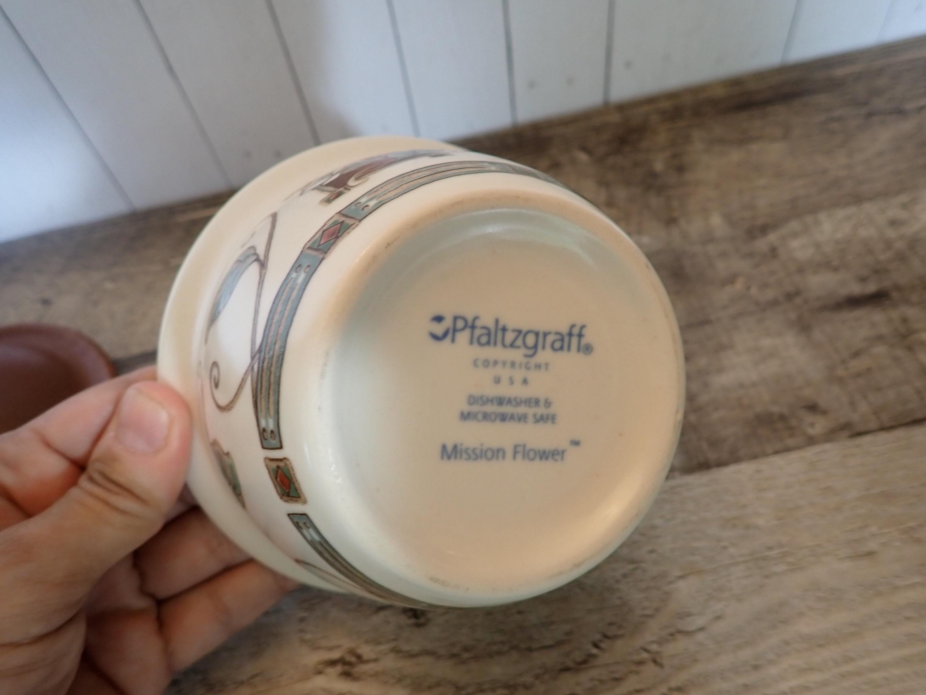 These sugar bowl by Pfaltzgraff is from the Mission Flower collection and is 4.75" in diameter and 4.5" high with the lid. It is a cream colored stoneware with a rusty red/brown flower and leaf design. The bottom is marked Pfaltzgraff. The bowl and lid are in very good condition with no chips or cracks.