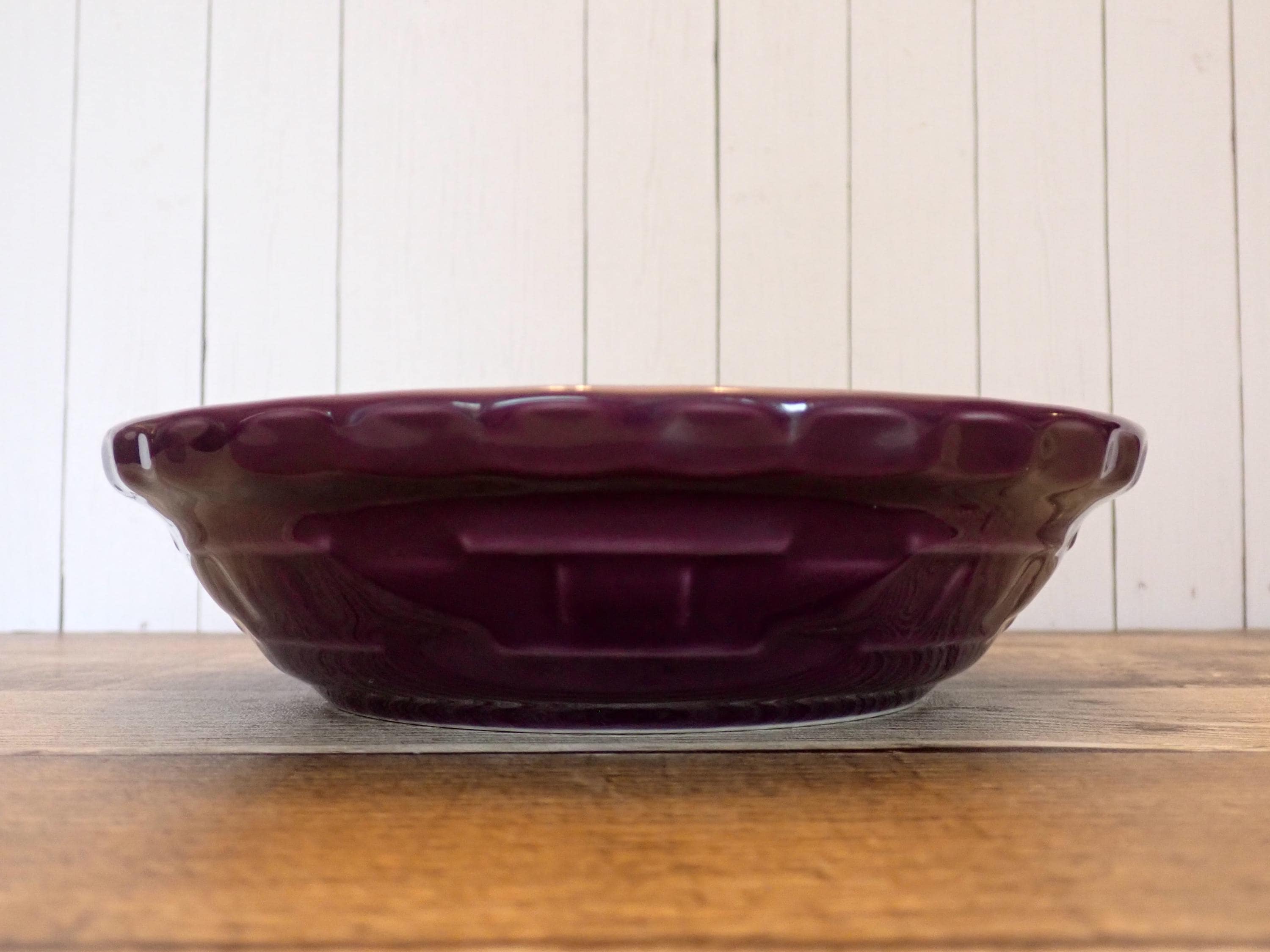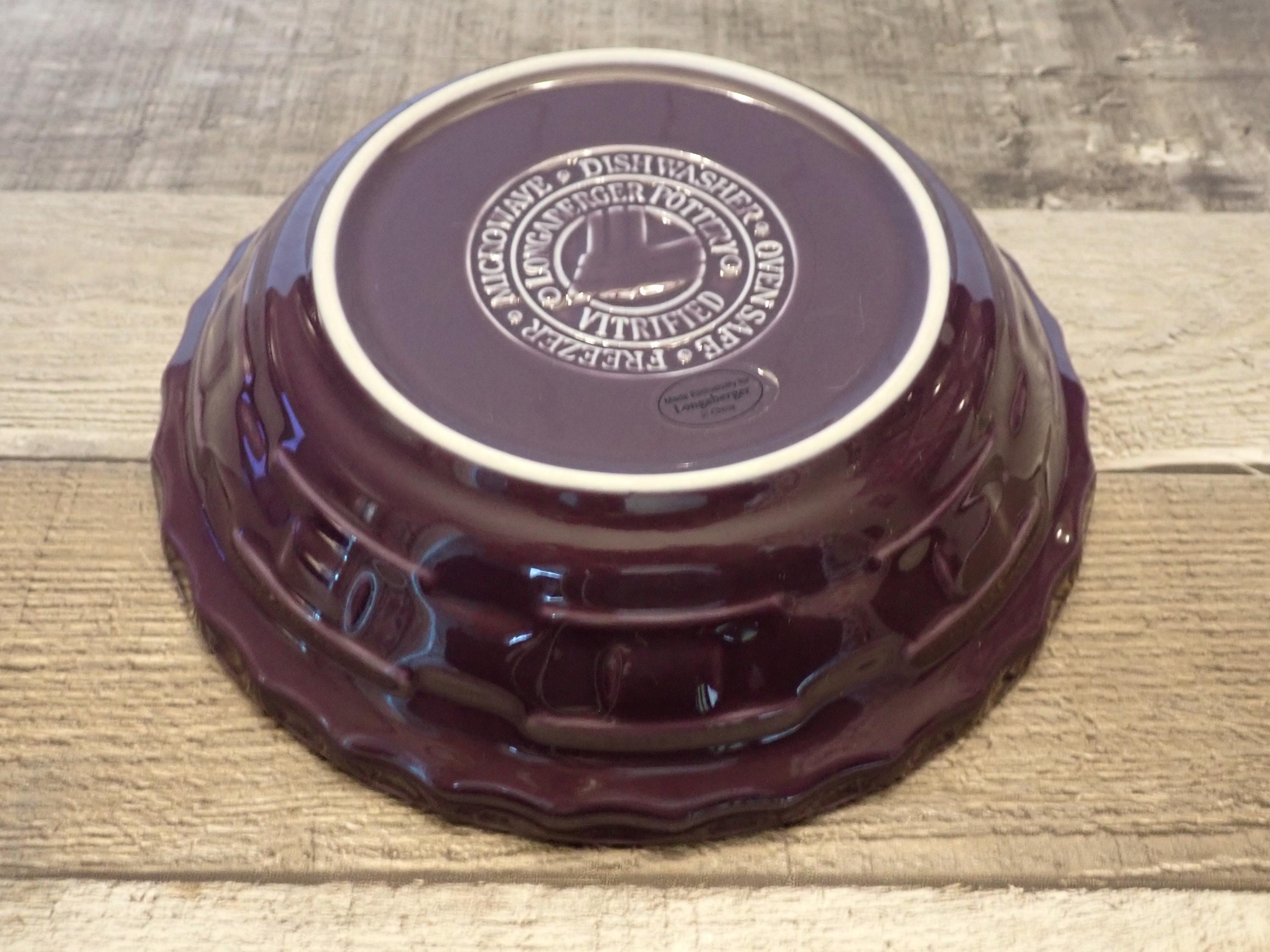 This Longaberger pie plate is in the Woven Traditions Eggplant pattern and is the 7" Round Pie Plate. This plate measures 7.25" in diameter and 2" high. The plate is a thick purple ceramic with a woven design around the outside of the pie plate. The bottom is stamped : LONGABERGER POTTERY / VITRIFIED / DISHWASHER OVEN SAFE FREEZER MICROWAVE. There is a sticker that says Made in China. This plate is in very good condition with no chips or cracks and very few scratches.