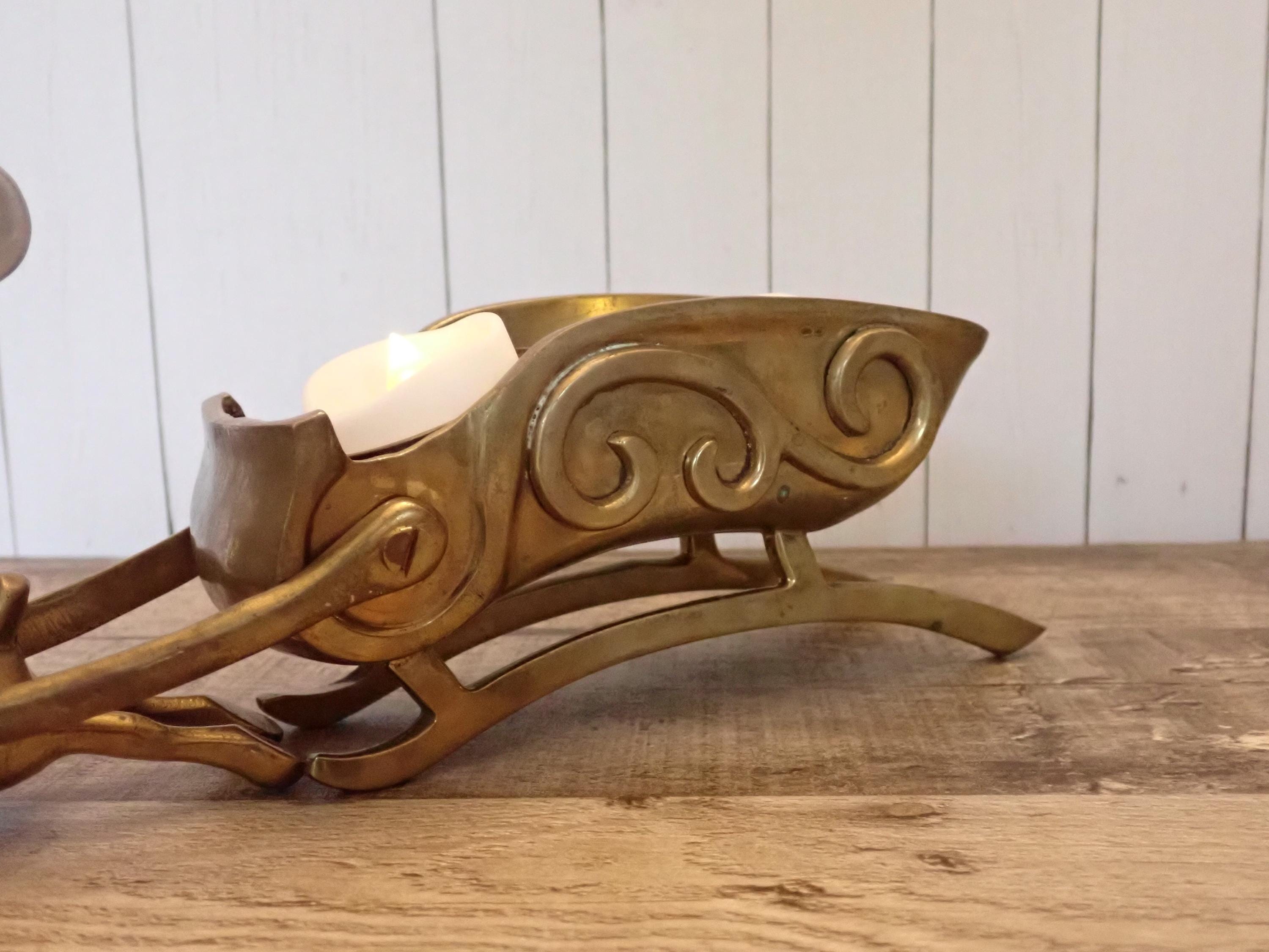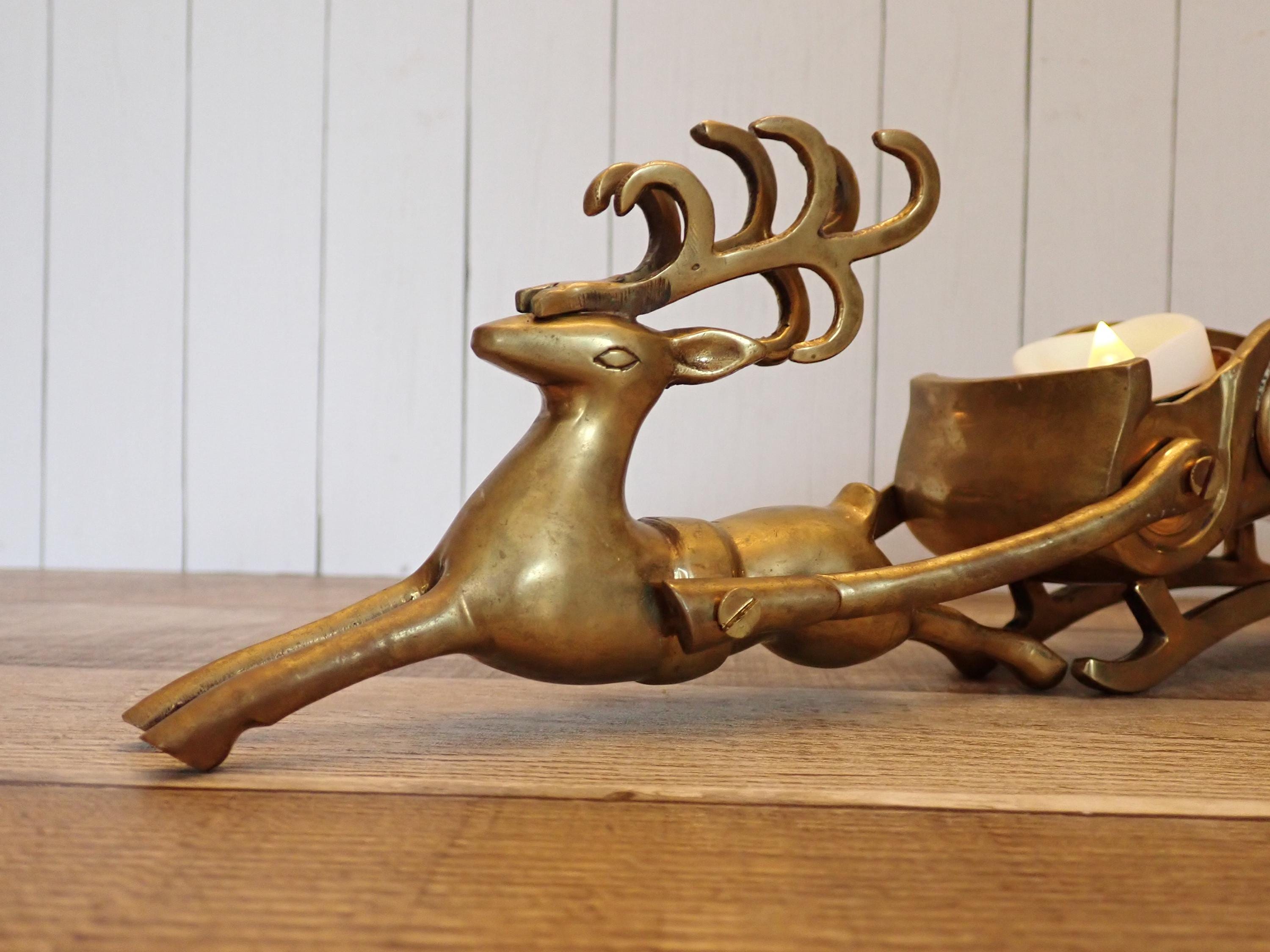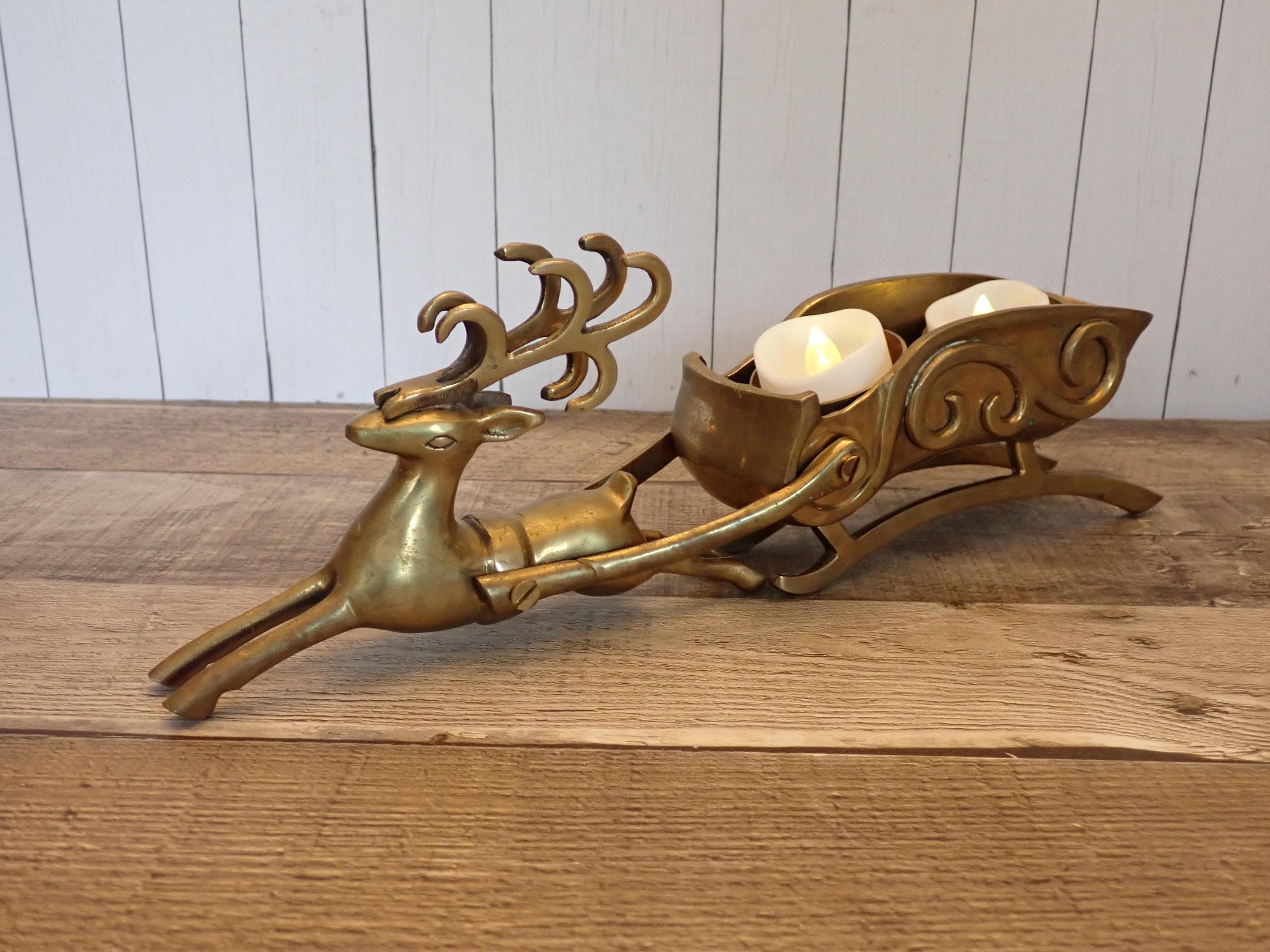 This brass deer and sleigh figurine is 12" long, 2" wide and stands 4" tall. The deer is in an outstretched position and has it's head is looking straight head. The sleigh has 2 small holders for a tealight (tealight candles are not included.) The candle holder is in very nice condition, however there is some light tarnish on the piece.