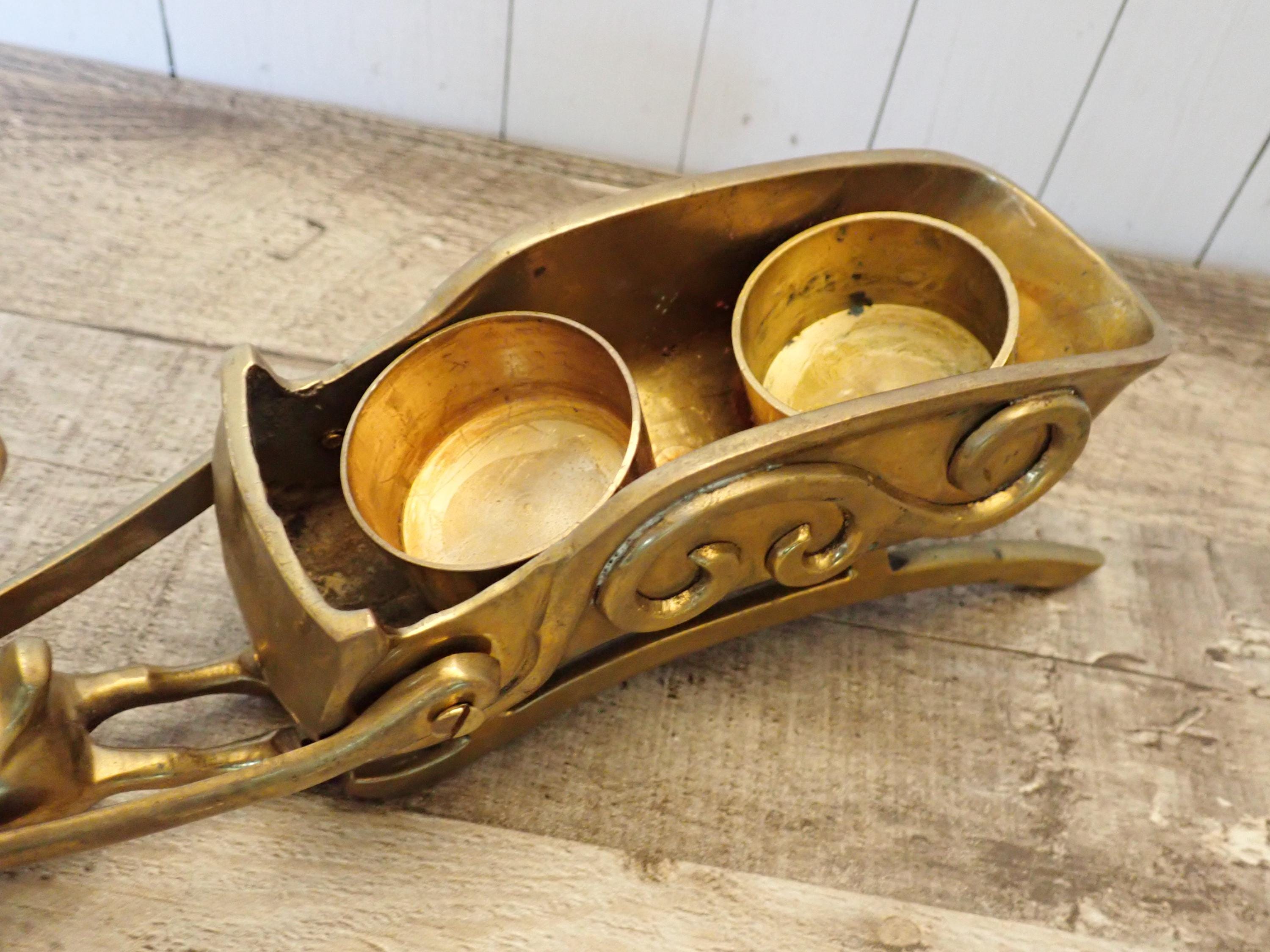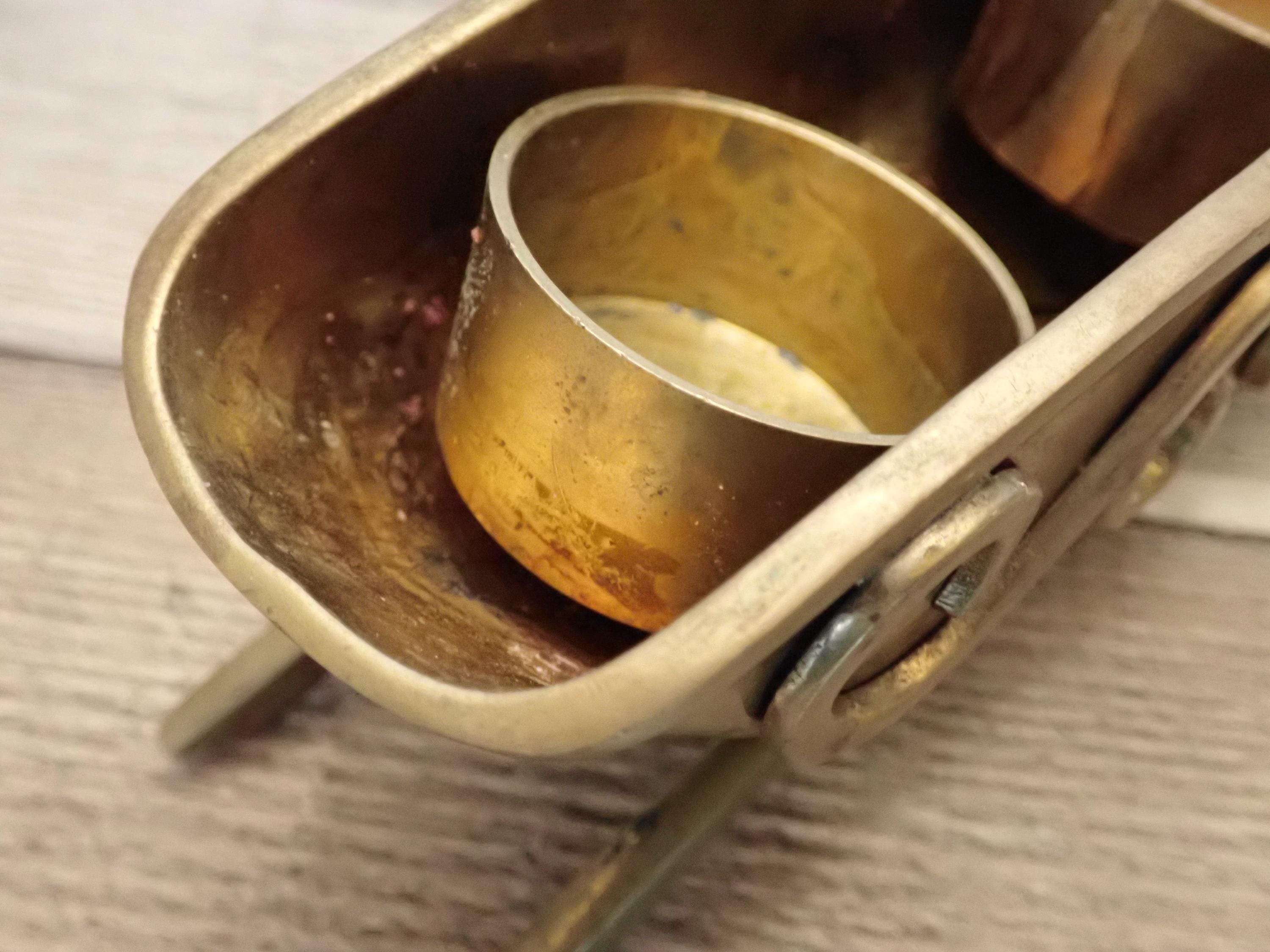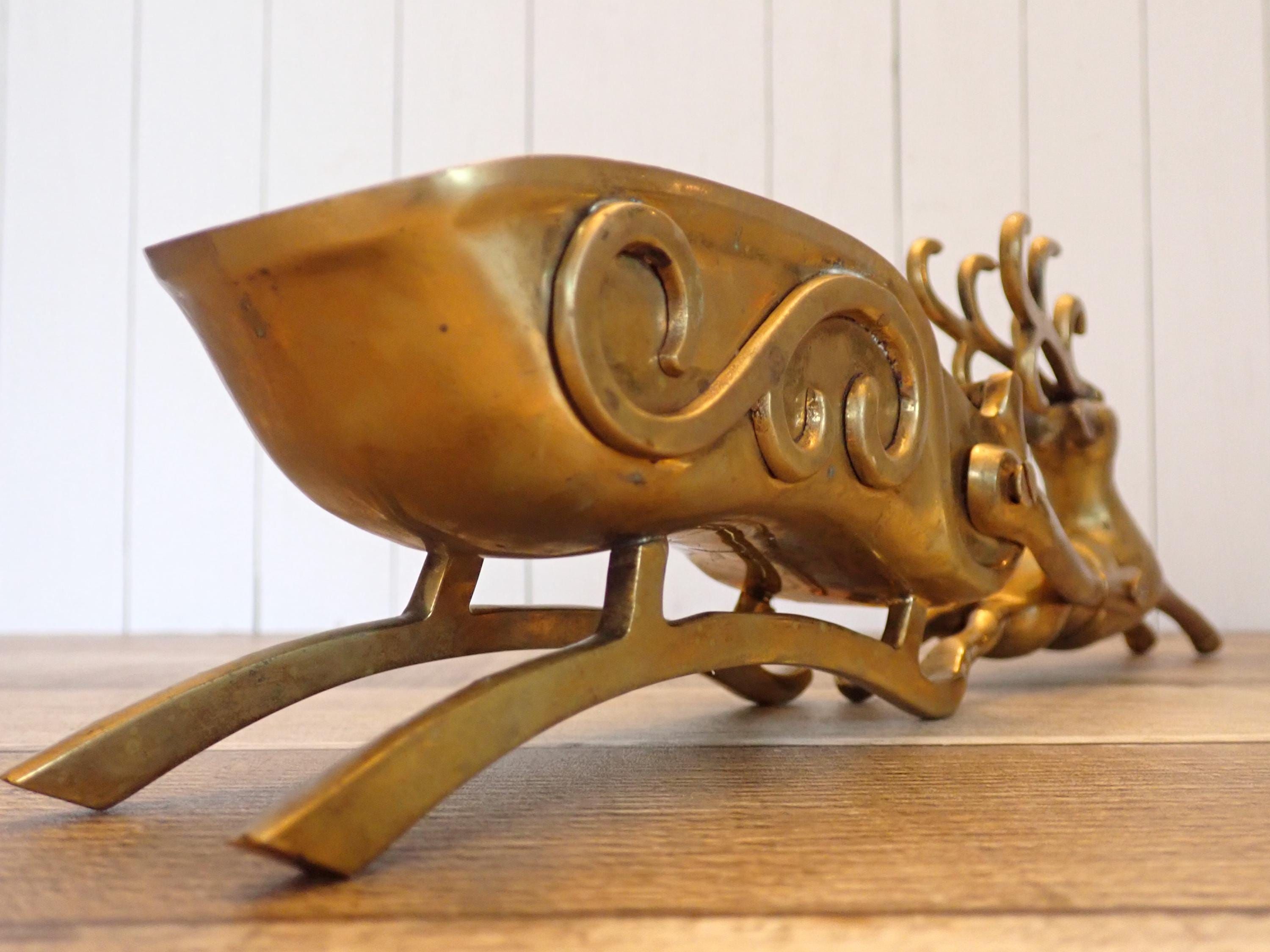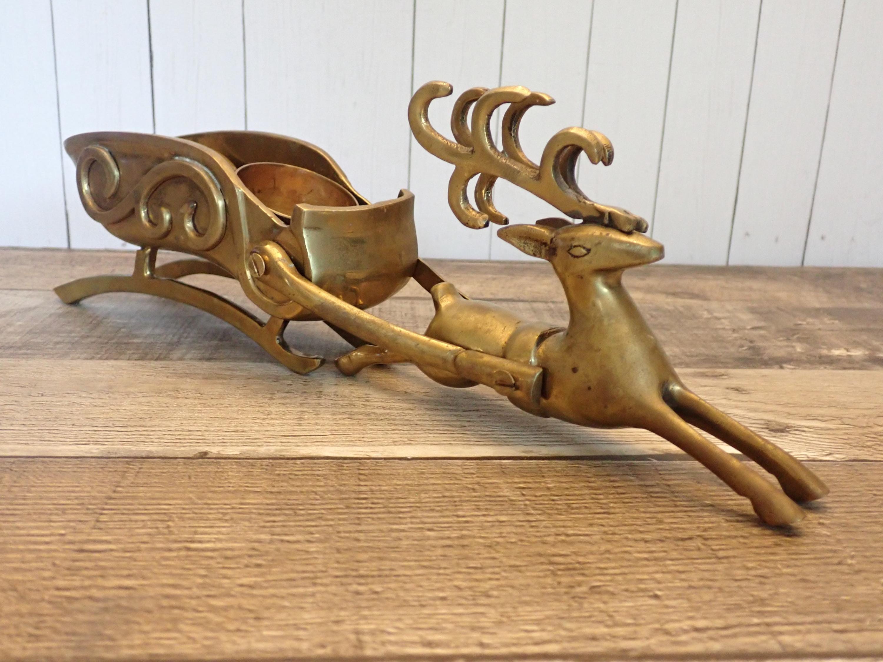This brass deer and sleigh figurine is 12" long, 2" wide and stands 4" tall. The deer is in an outstretched position and has it's head is looking straight head. The sleigh has 2 small holders for a tealight (tealight candles are not included.) The candle holder is in very nice condition, however there is some light tarnish on the piece.