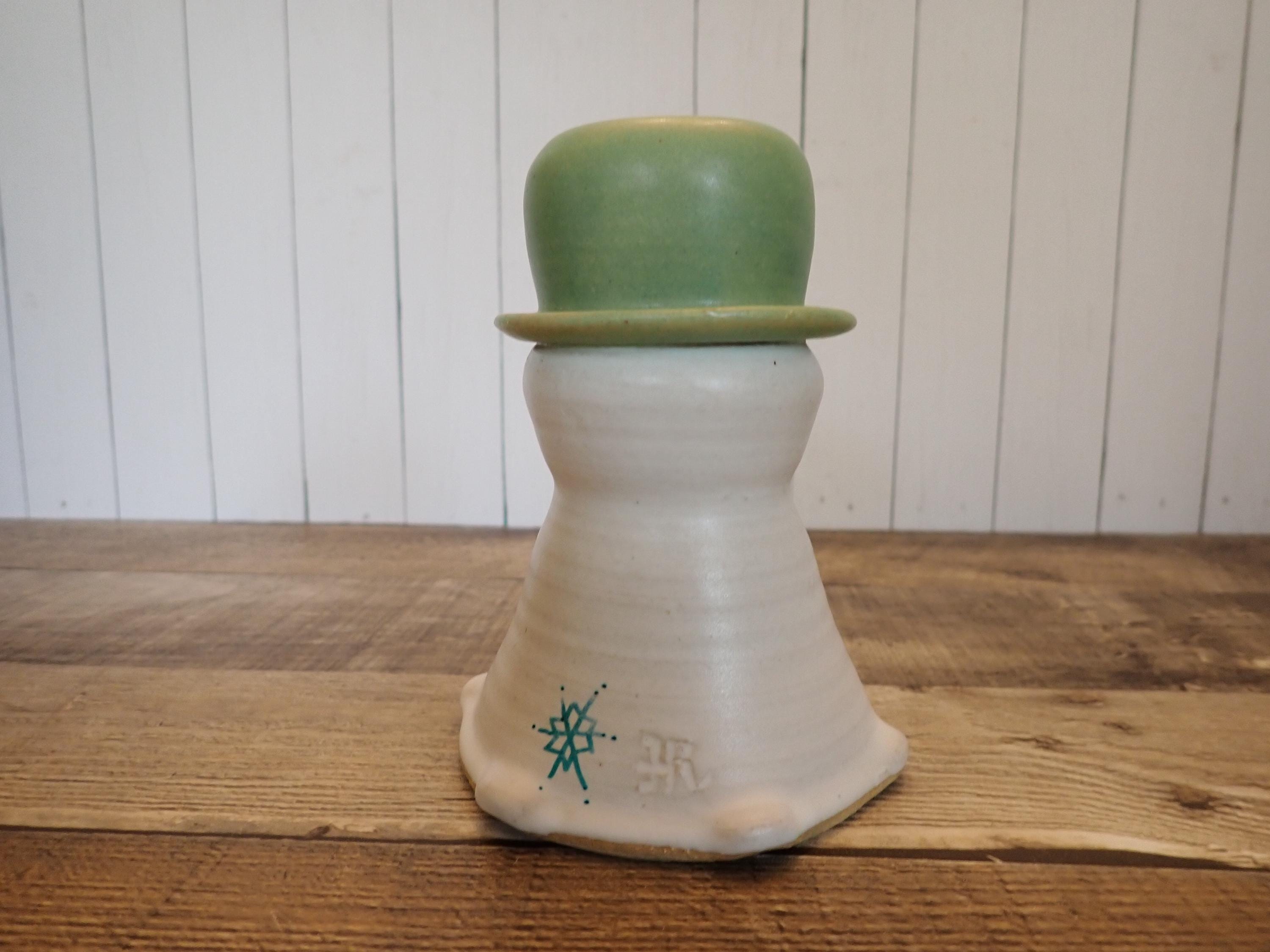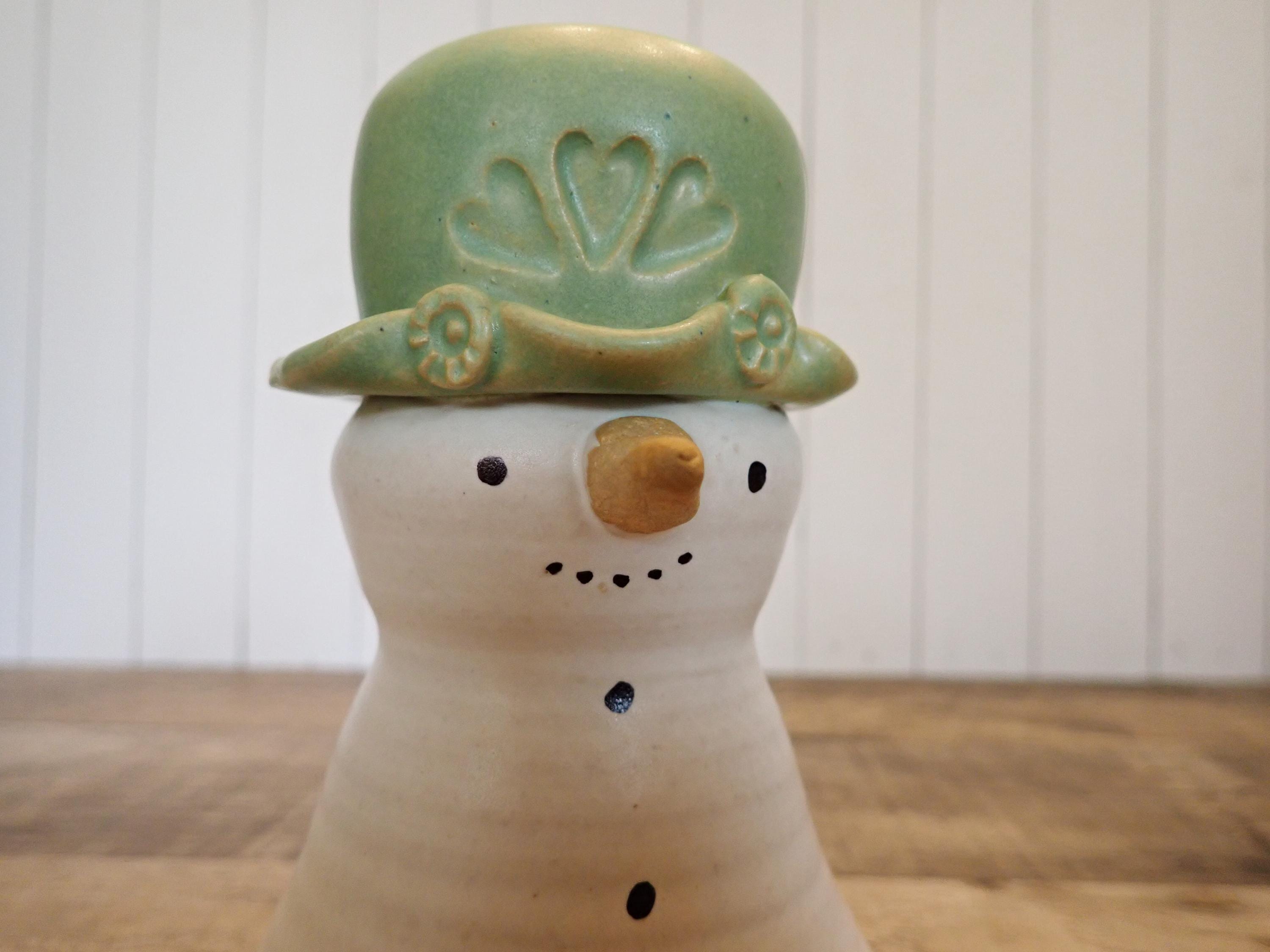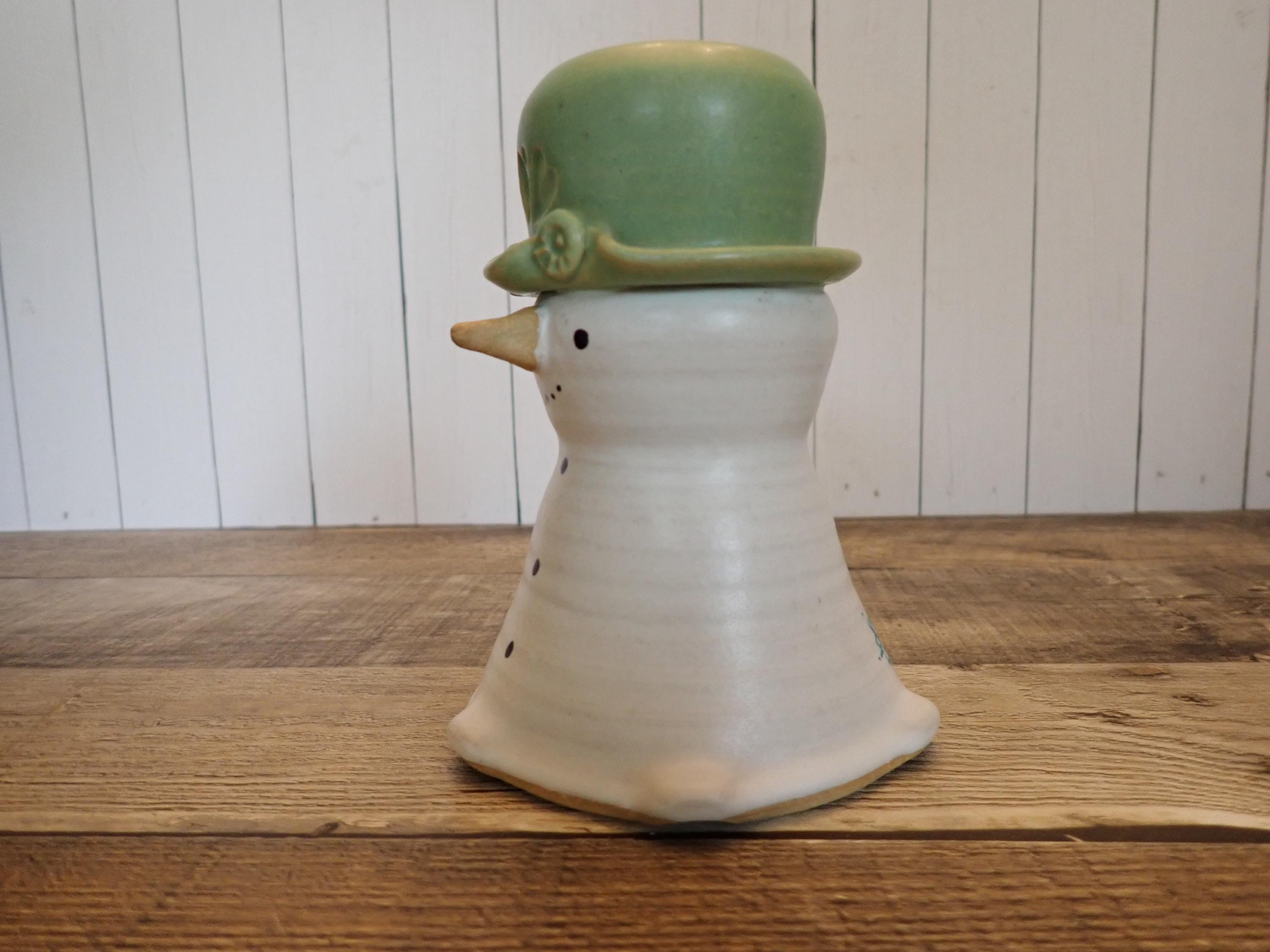 This great pottery snowman figurine is 5.25" tall and 3" wide at the base. It is a white snowman with a green hat and tan nose. The underside of the figurine is open and the back is stamp by the artist HR. This figurine is in very good condition with no chips or cracks.