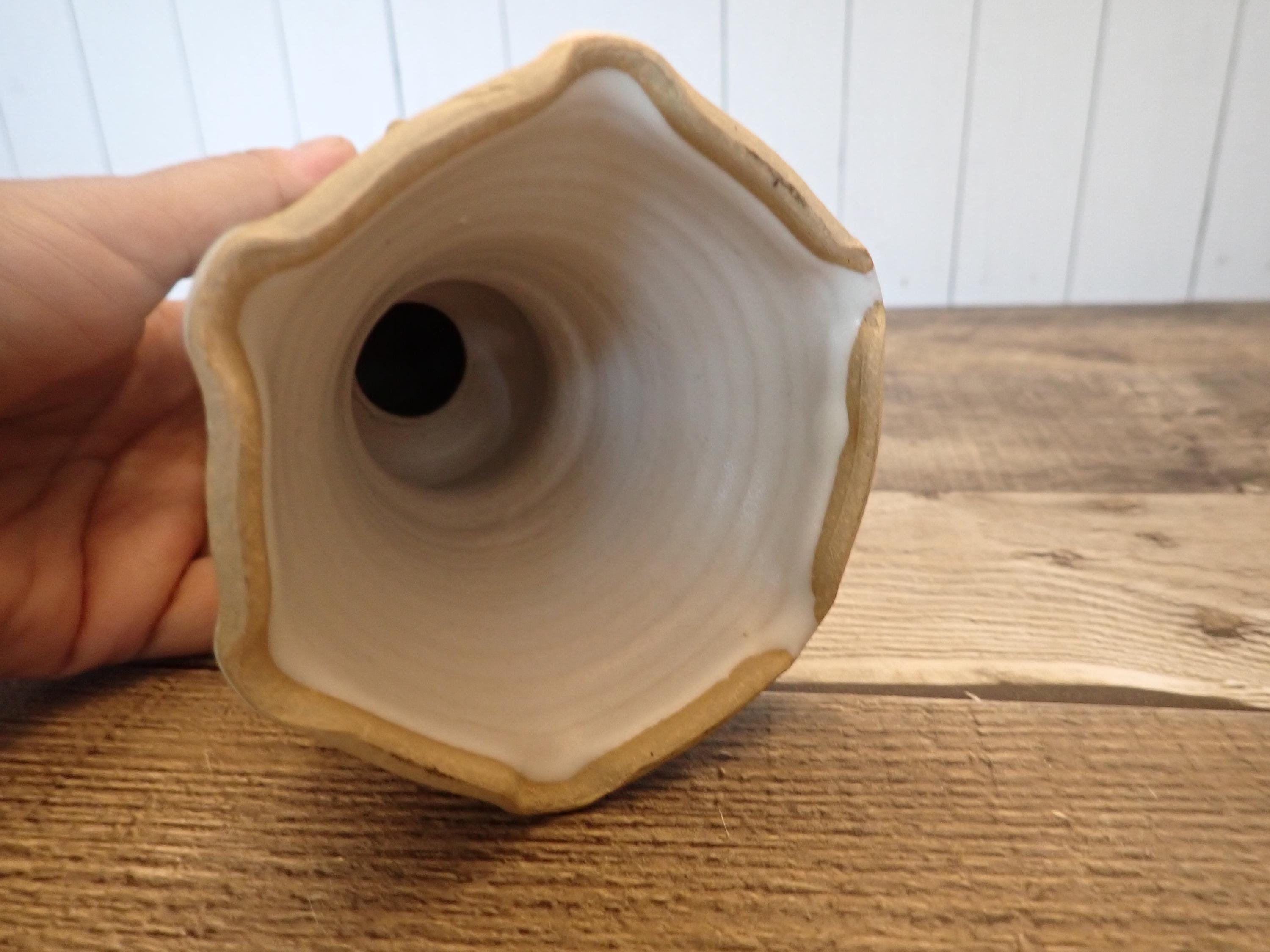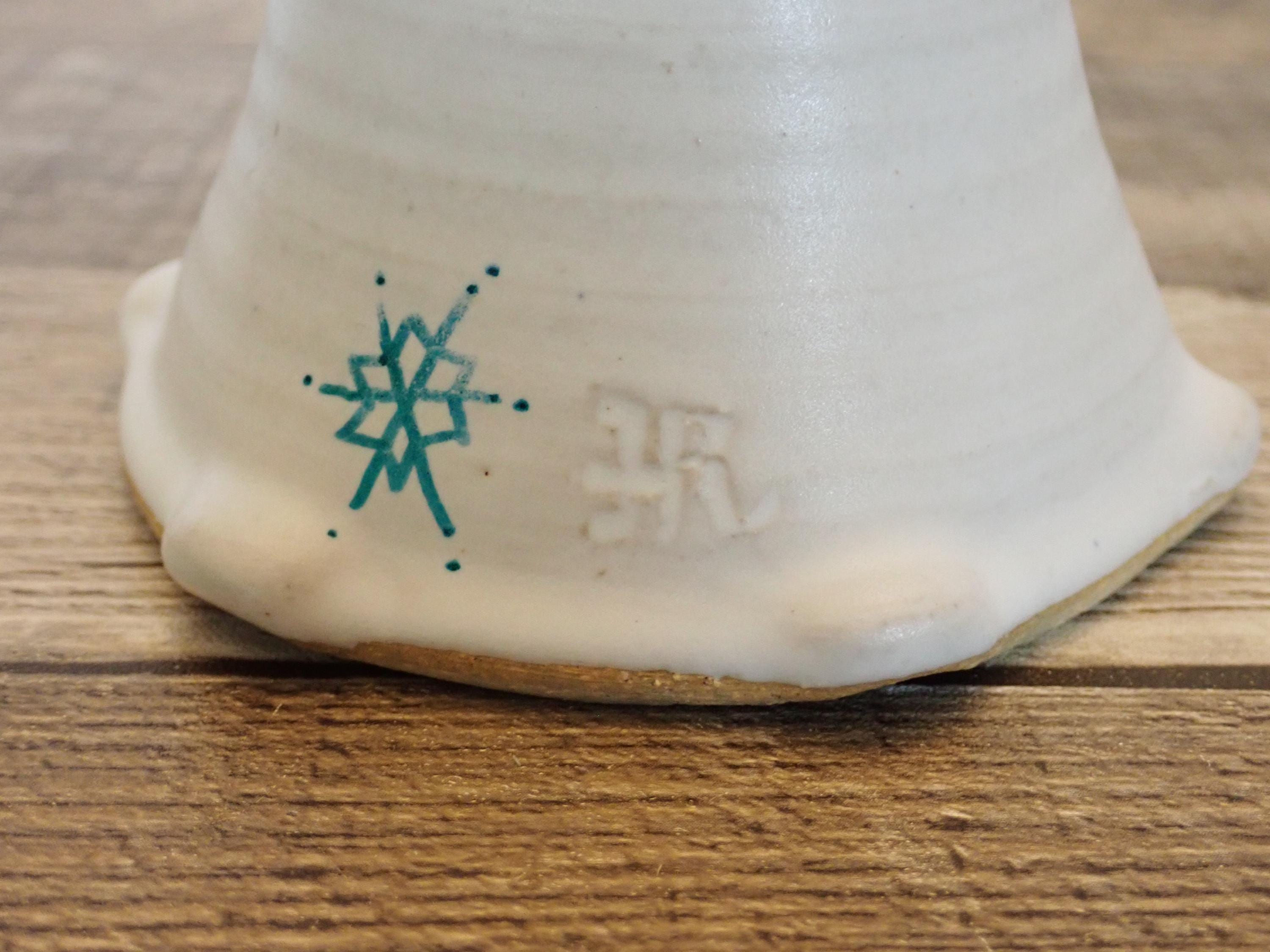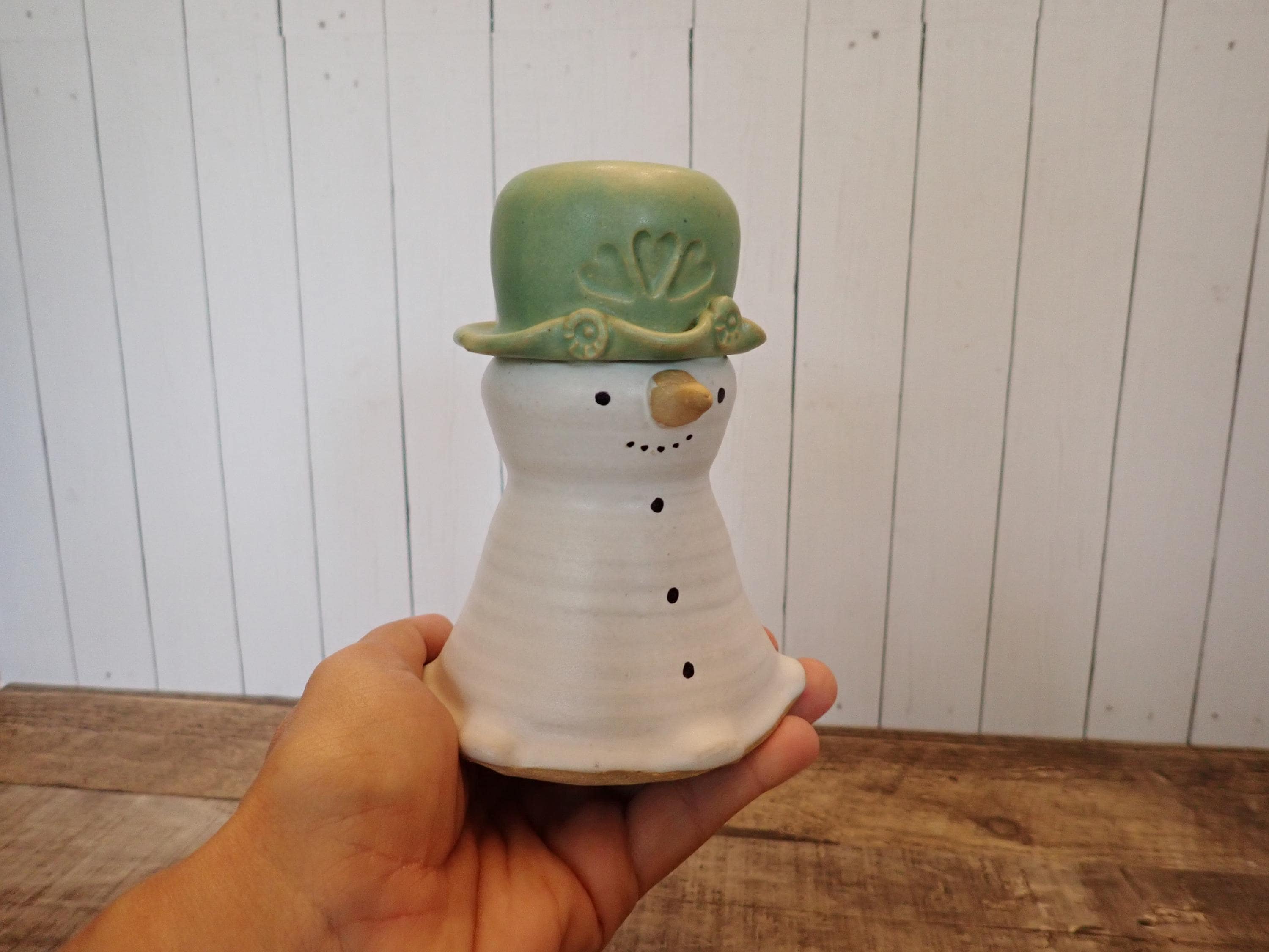 This great pottery snowman figurine is 5.25" tall and 3" wide at the base. It is a white snowman with a green hat and tan nose. The underside of the figurine is open and the back is stamp by the artist HR. This figurine is in very good condition with no chips or cracks.