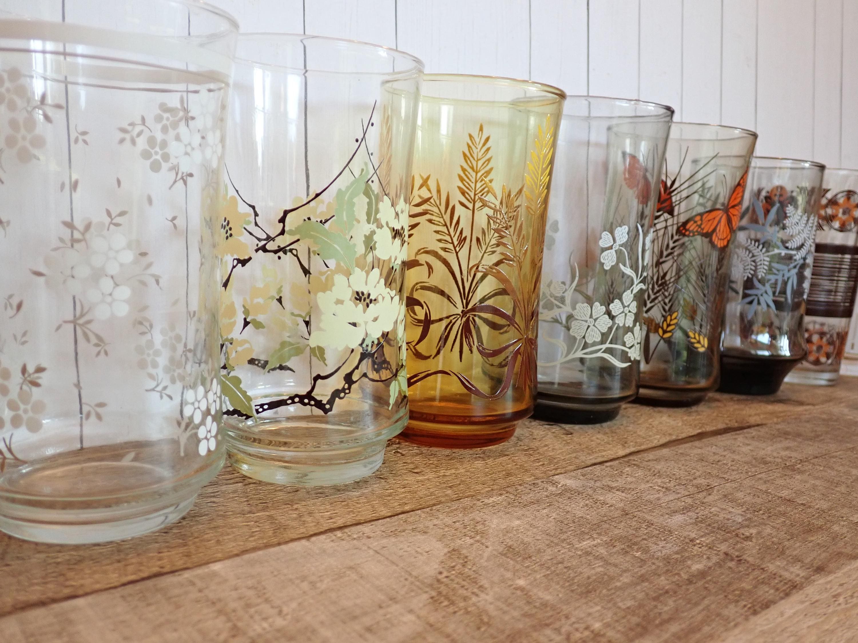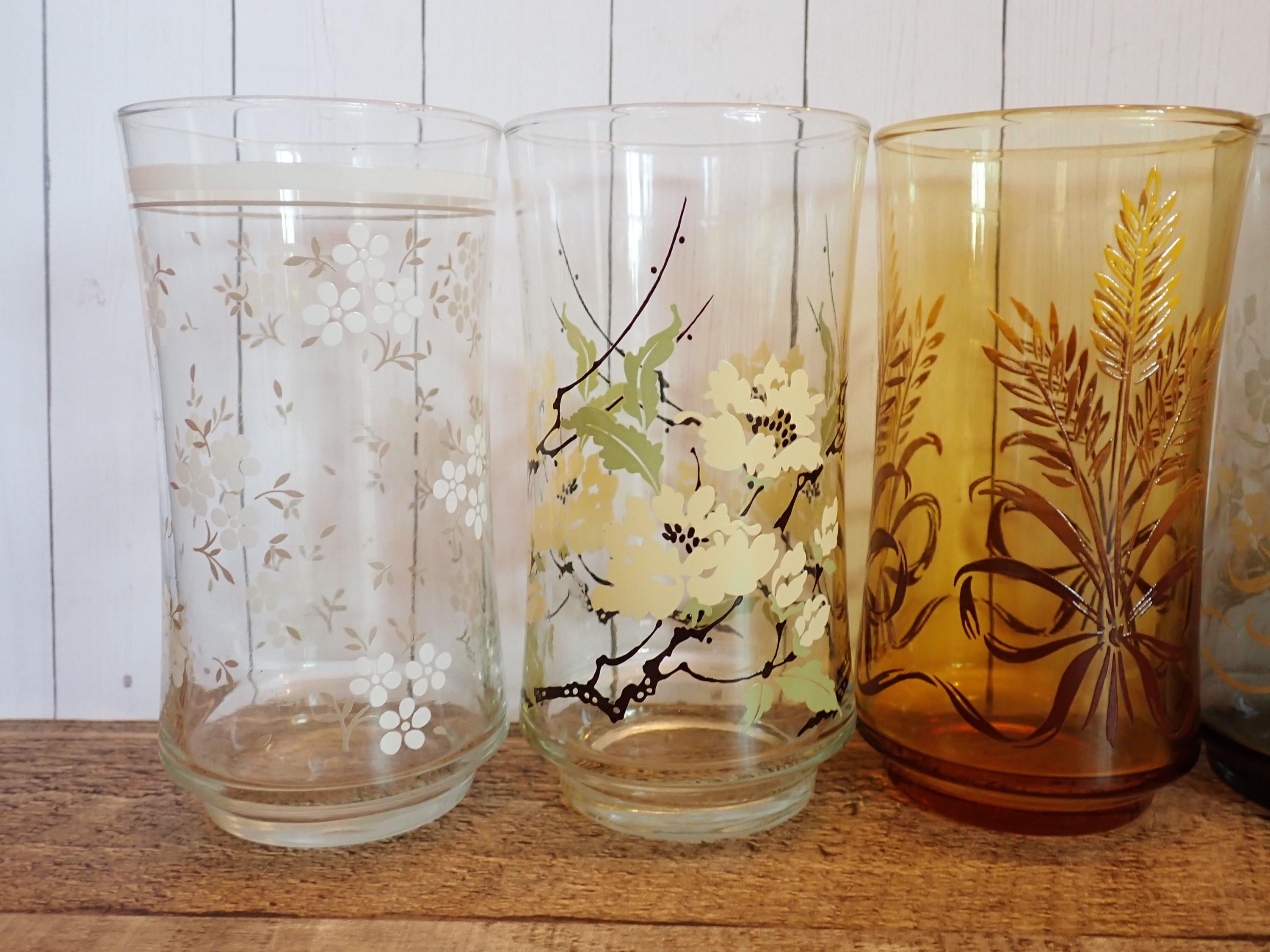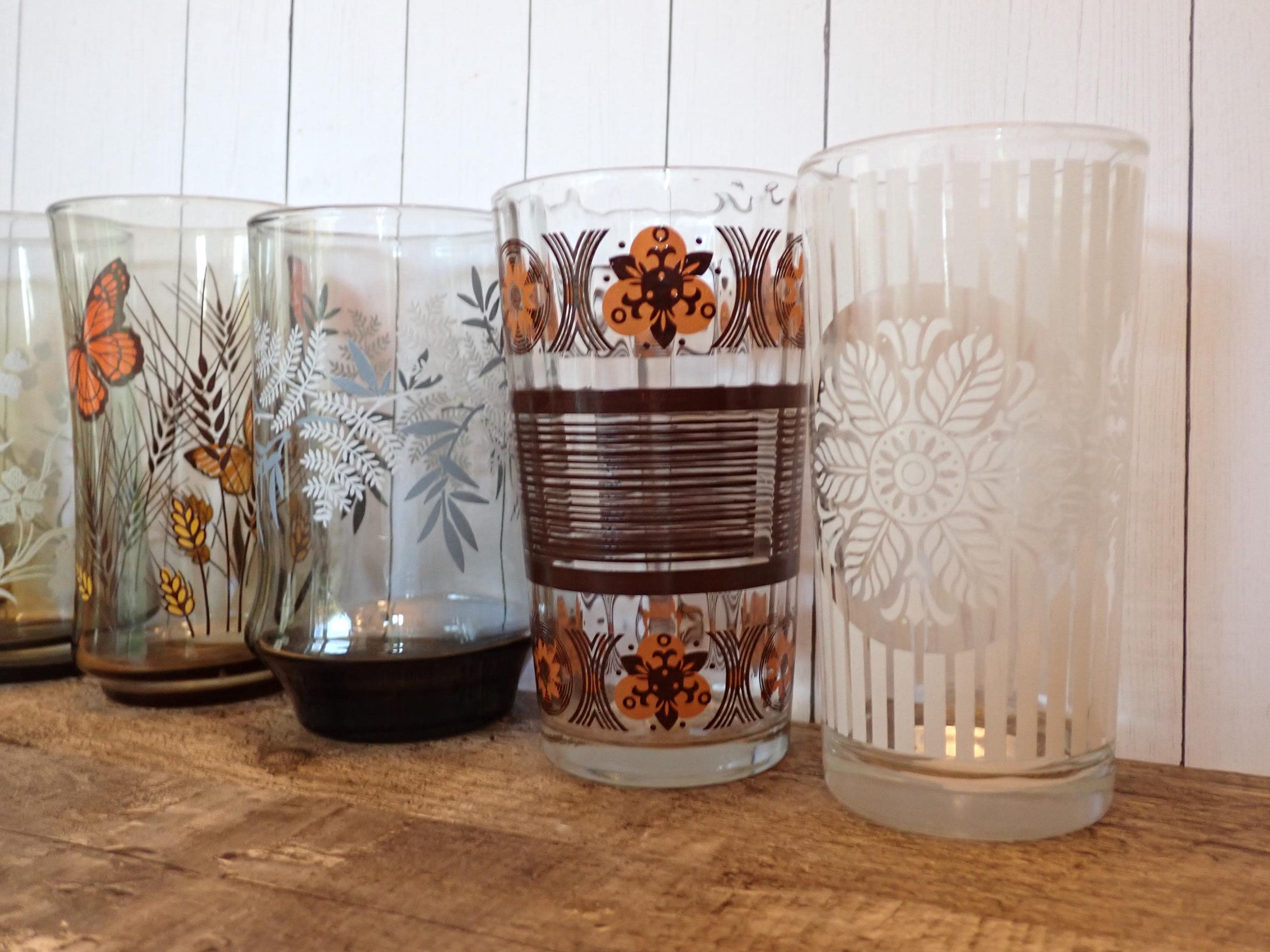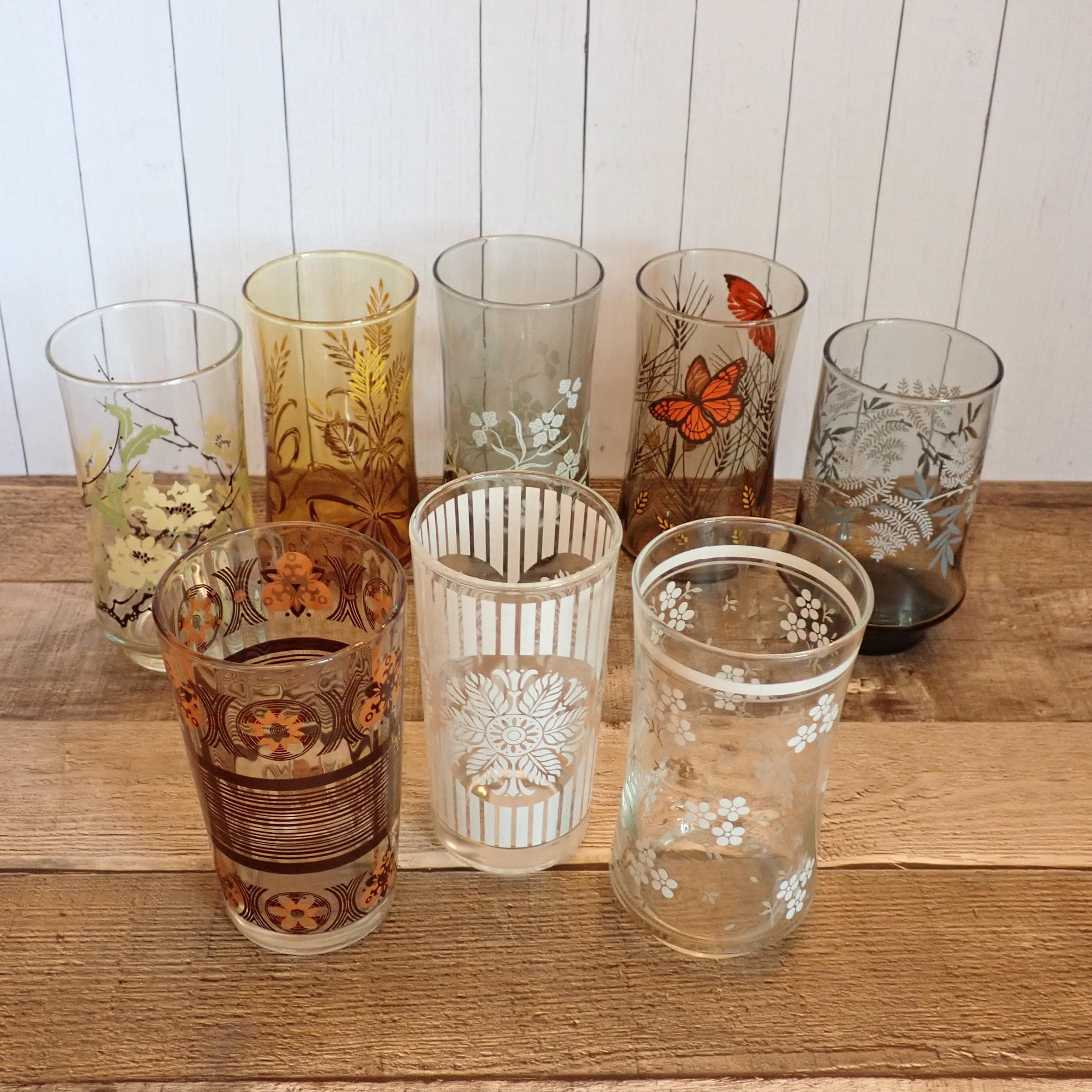 This set of glass tumblers includes 8 different mix and match tumblers in different designs and patterns. They are all 5" - 6.5" tall and about 2.75" in diameter. They include various flower and leaf designs from the 1970s and 1980s. They are all in very nice condition with no chips or cracks. Fun set of mix and match tumblers!