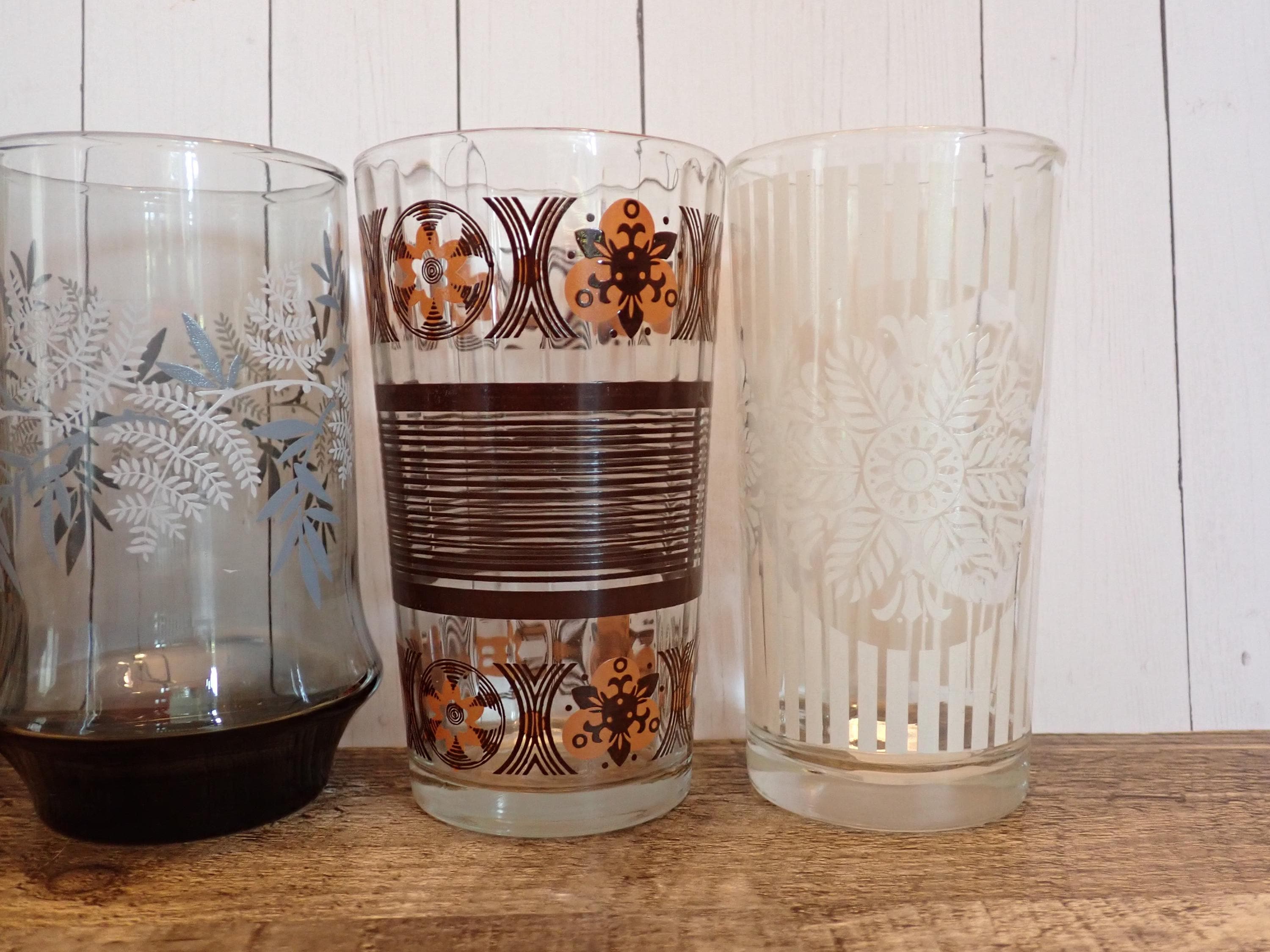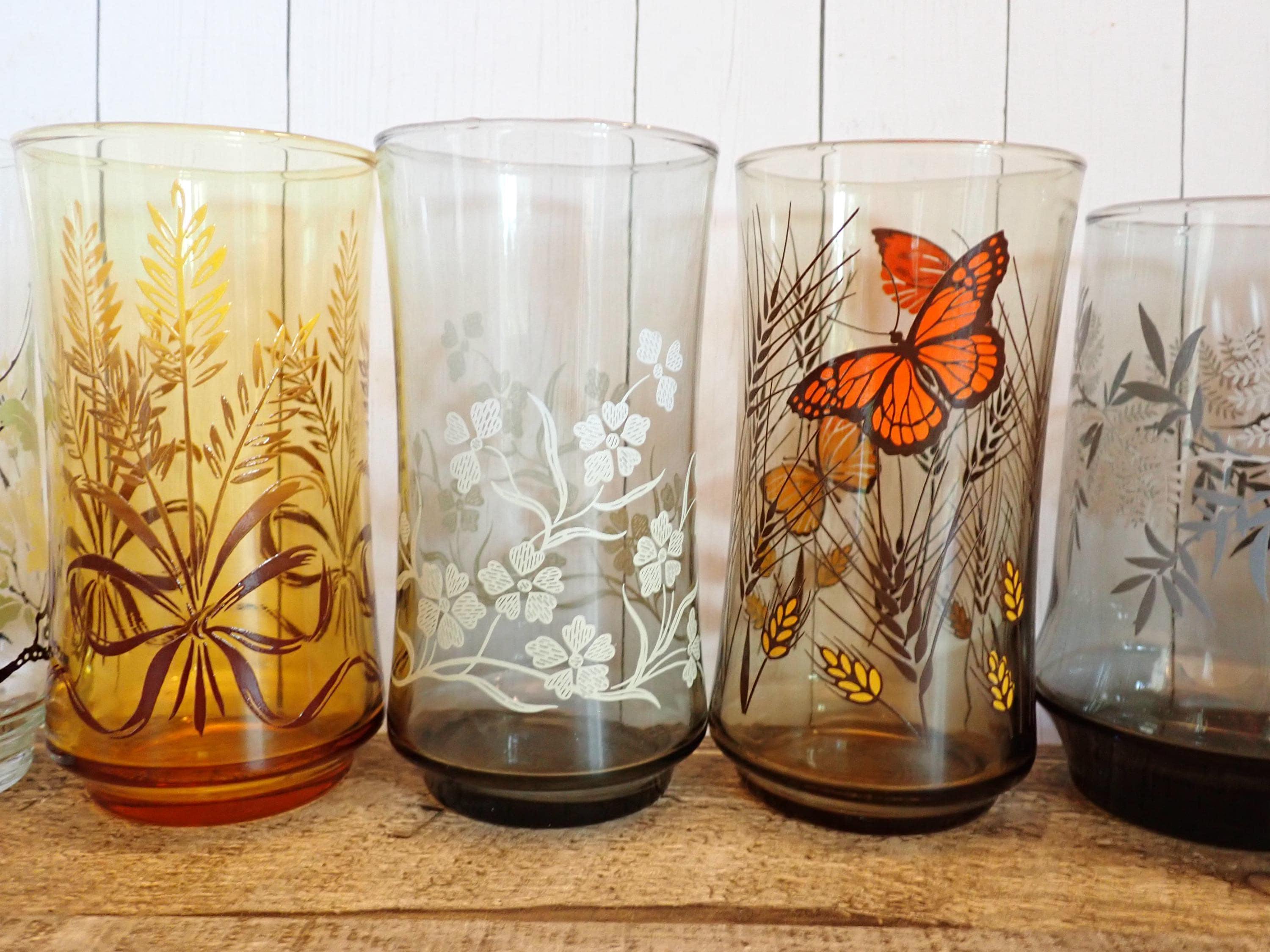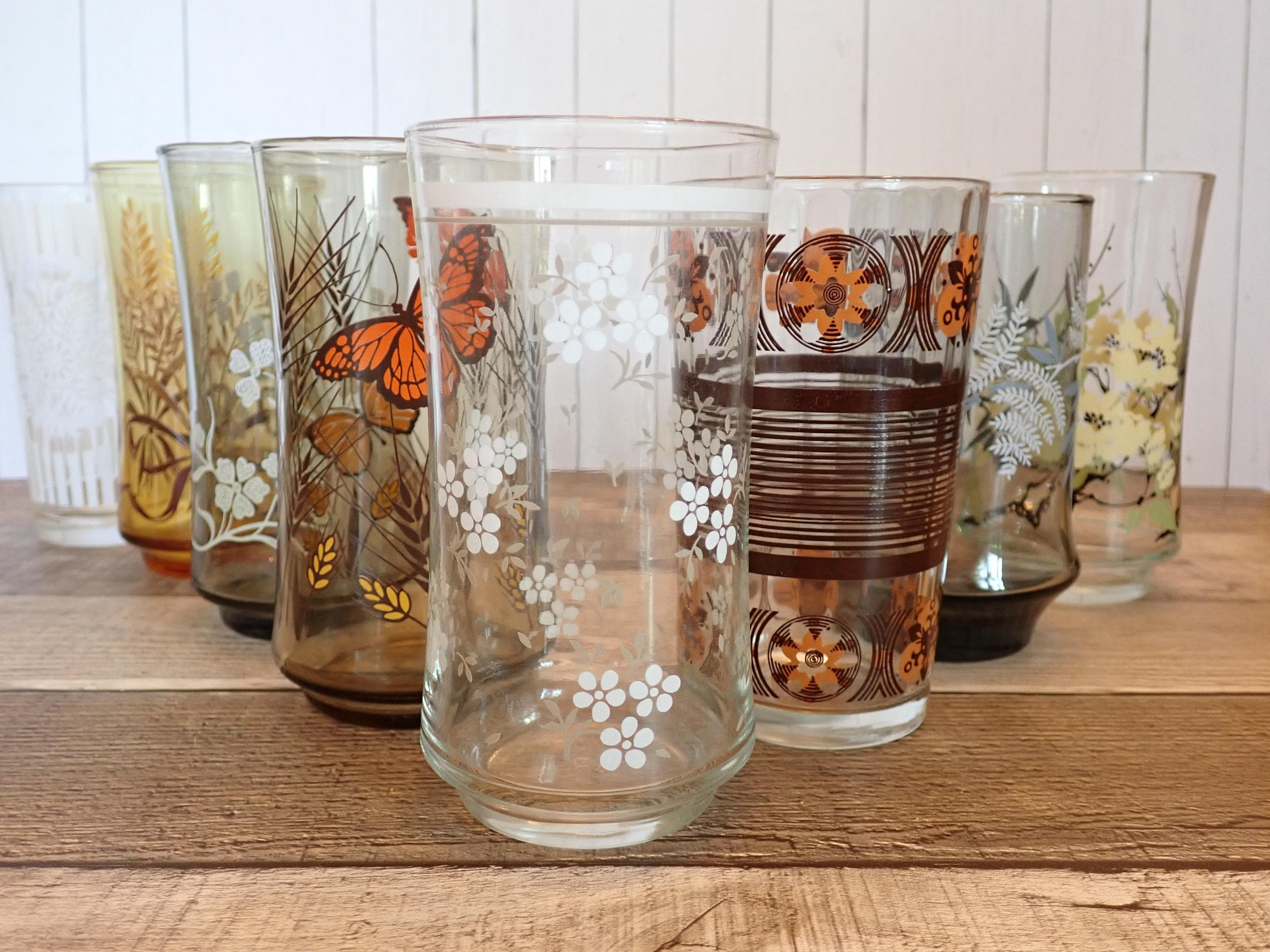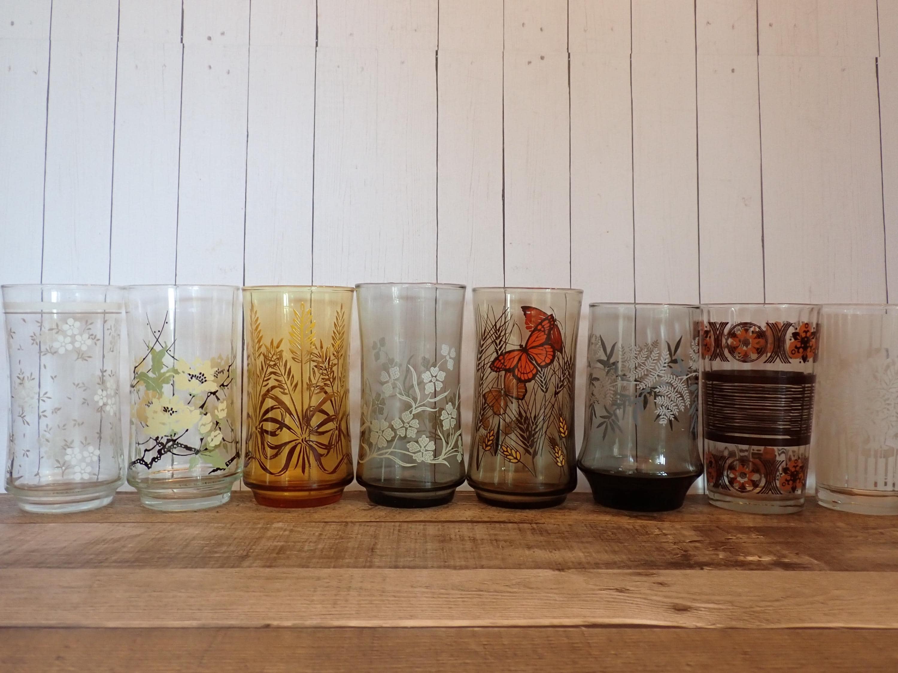 This set of glass tumblers includes 8 different mix and match tumblers in different designs and patterns. They are all 5" - 6.5" tall and about 2.75" in diameter. They include various flower and leaf designs from the 1970s and 1980s. They are all in very nice condition with no chips or cracks. Fun set of mix and match tumblers!
