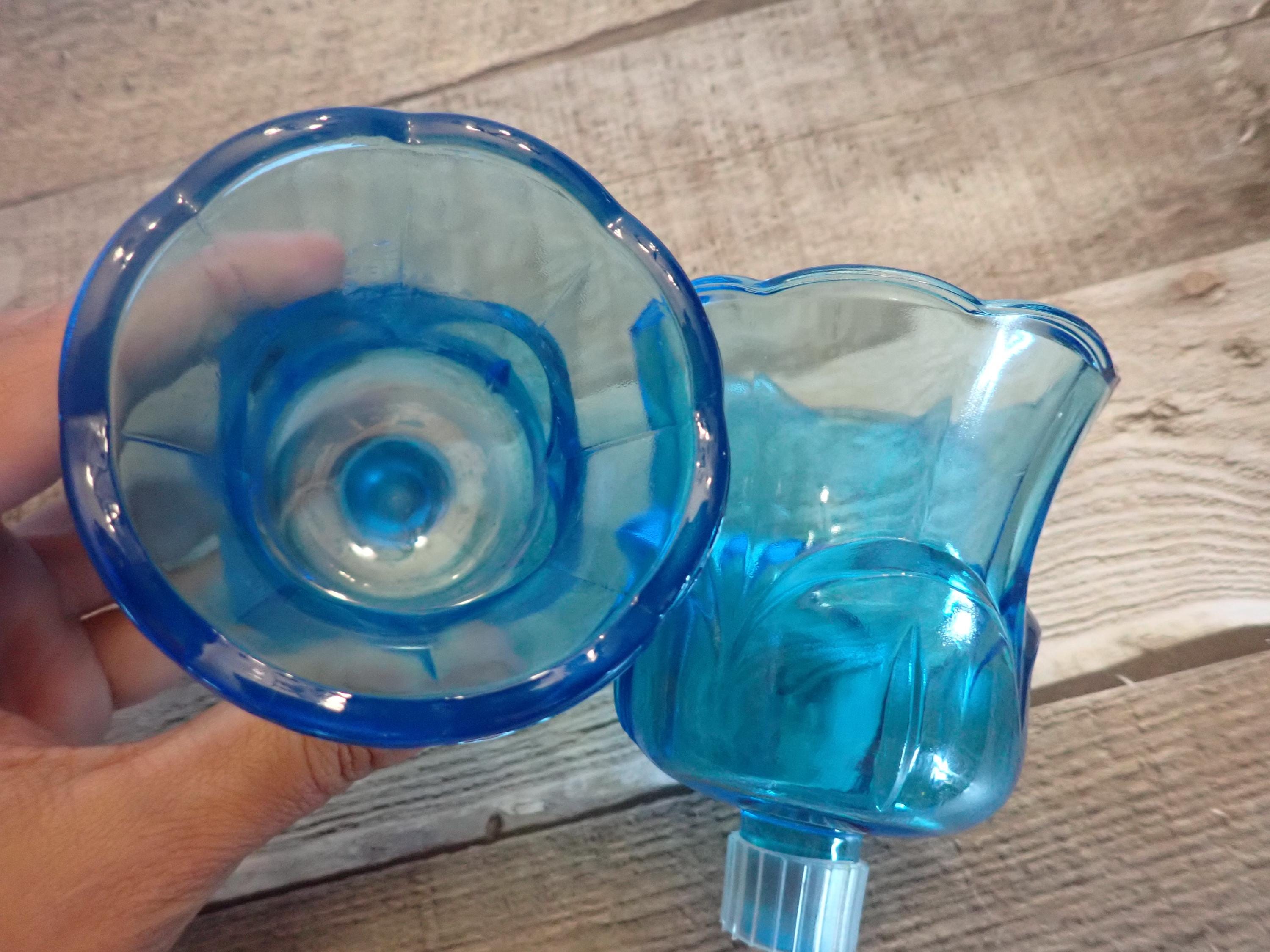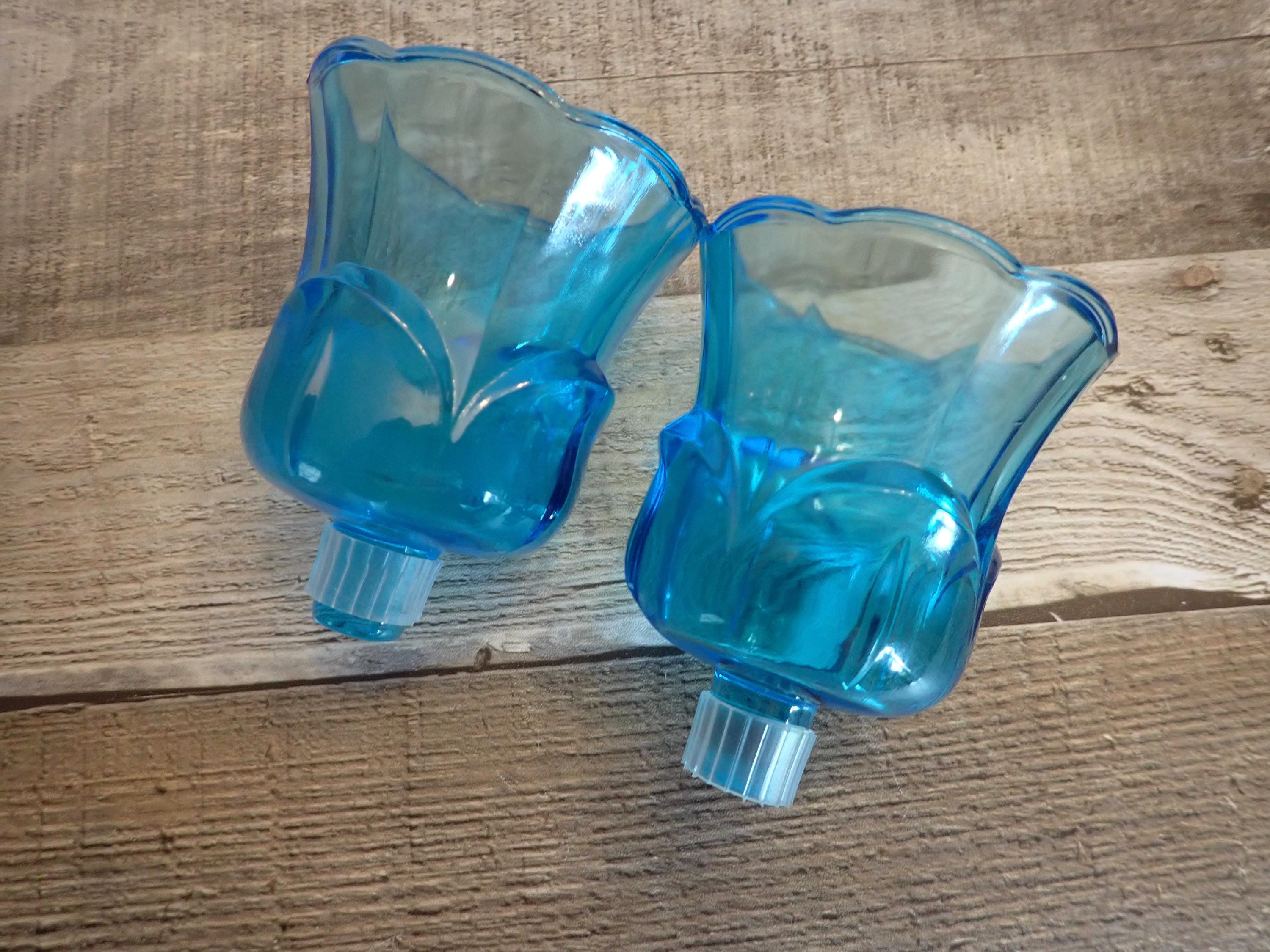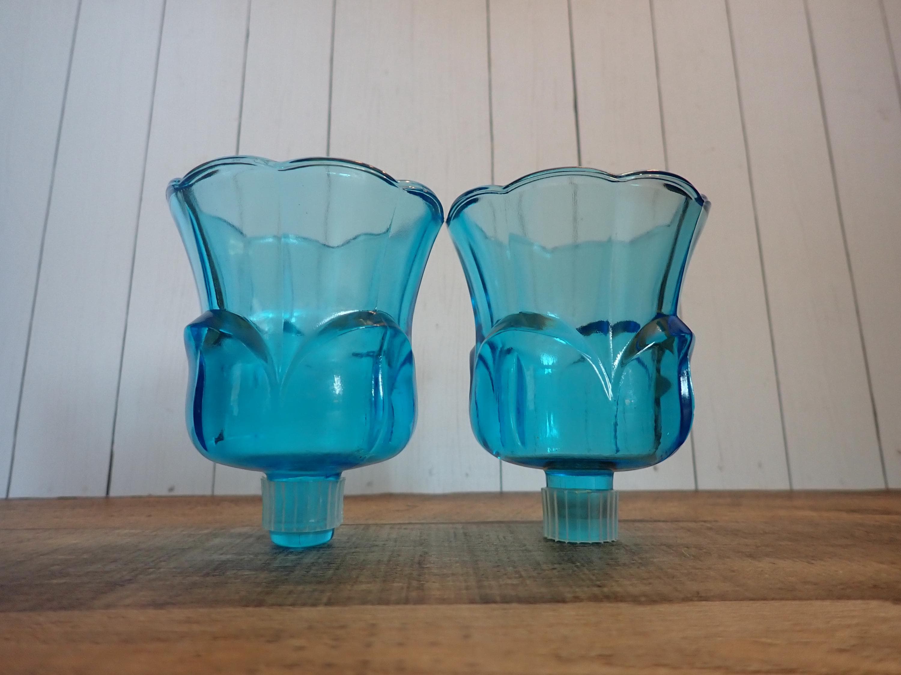 These blue glass votive cups are light blue colored glass and measure 3" tall (without the peg on the bottom) and 3" in diameter. They have a flower shape and the rim flares outward. They can hold a small tealight of votive candle. The inside diameter is 1.75 inches. They include the plastic grommets to secure into a candlestick. The holders are in very good condition with no chips or cracks.