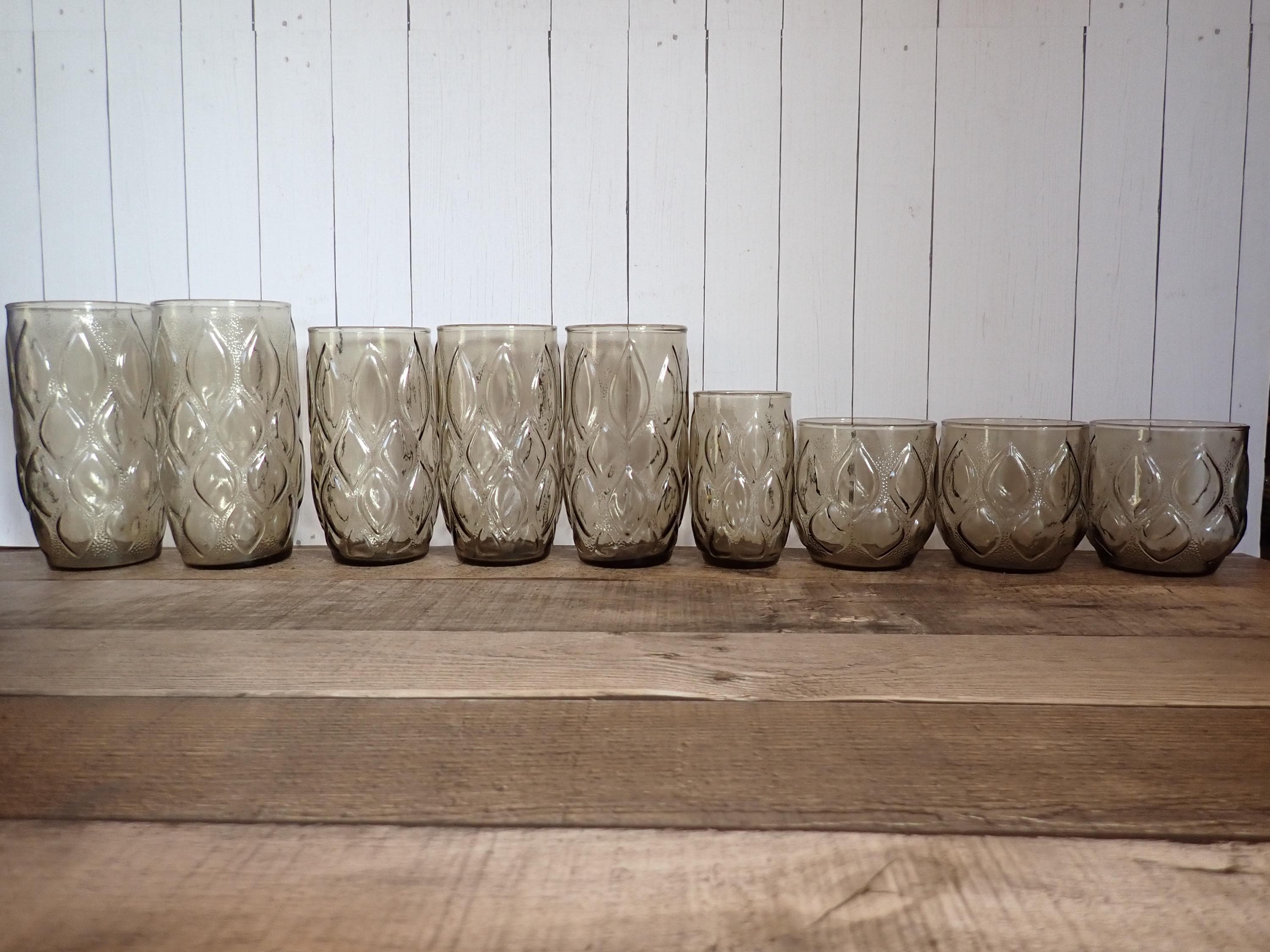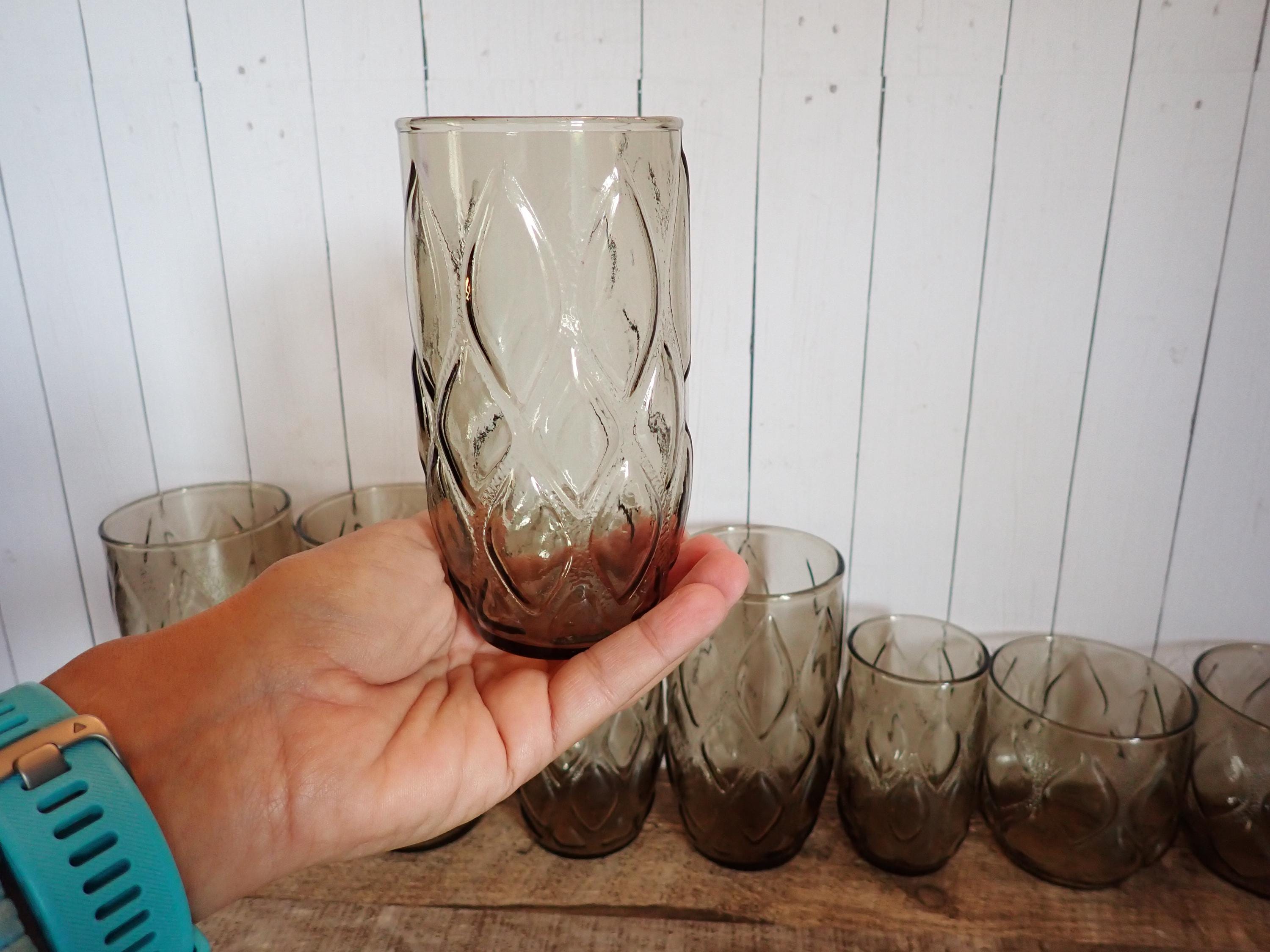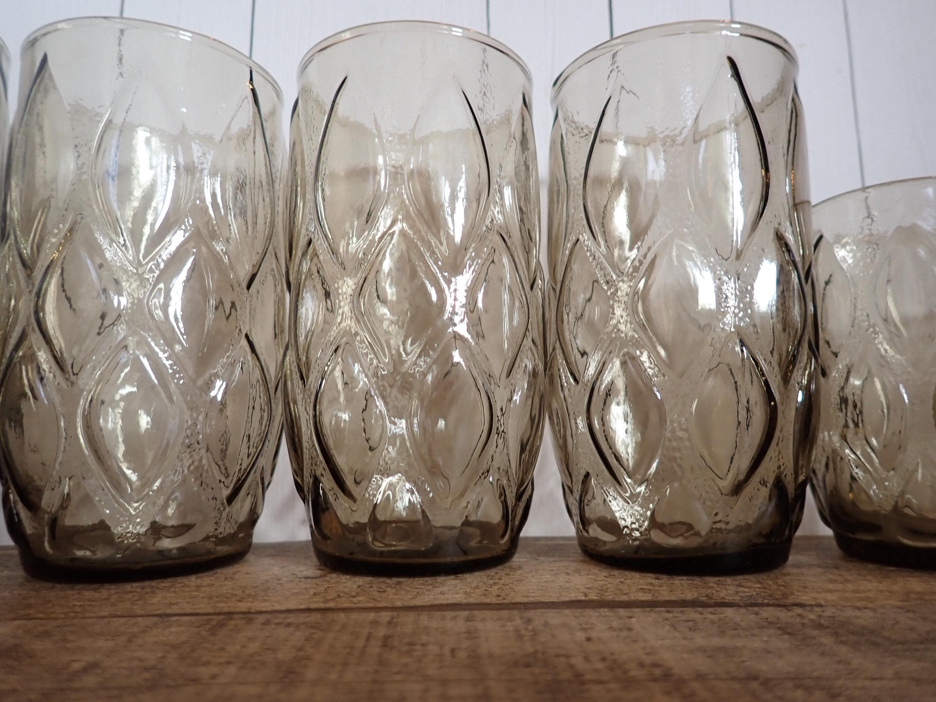 This set of 9 Anchor Hocking glasses are in the Madrid Brown pattern. They are a smoky brown color, and have a smooth textured finish with raised diamond shapes running vertically down the glass to create a subtle geometric pattern. This mix and match set includes 9 glasses in various sizes - included are: