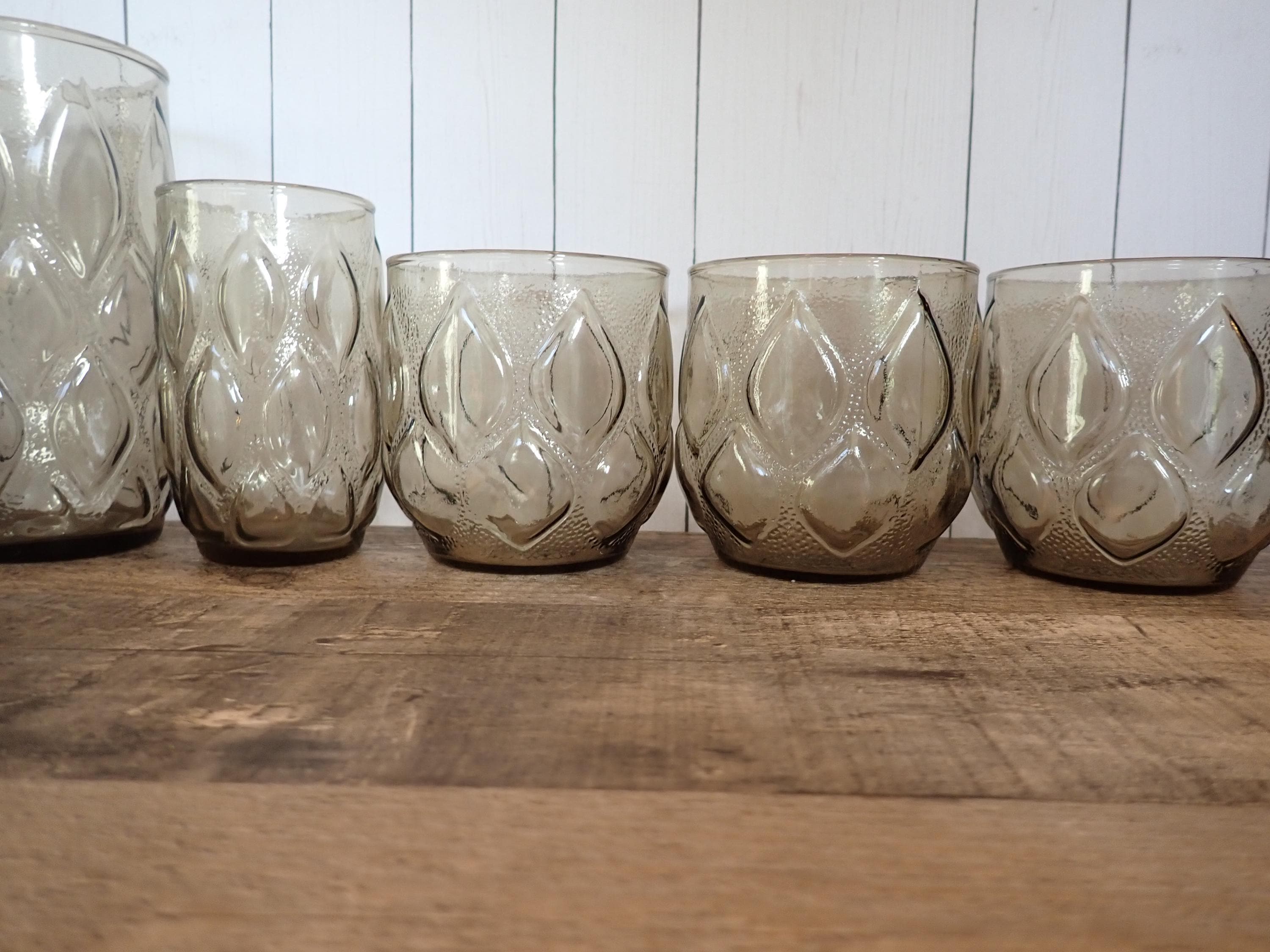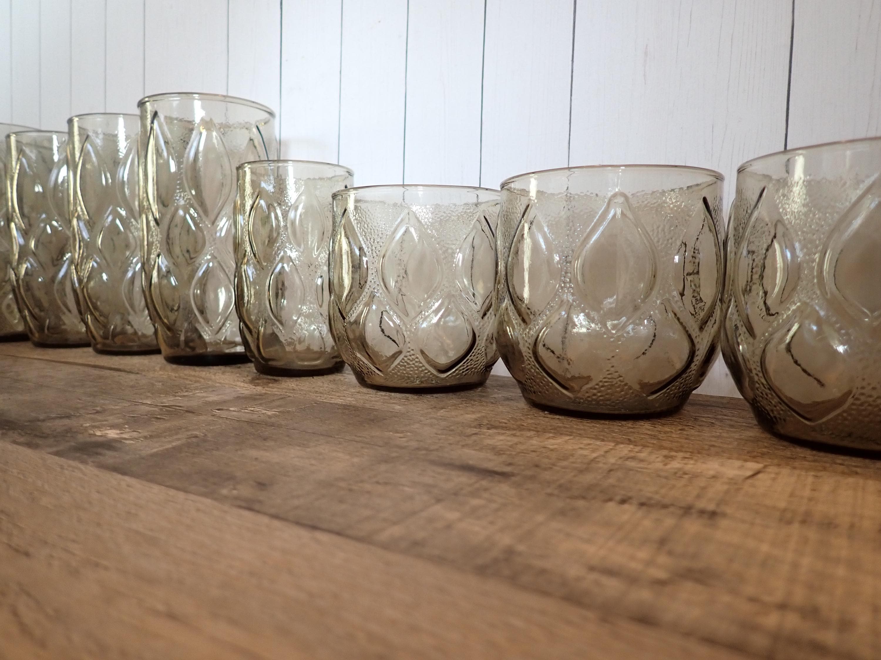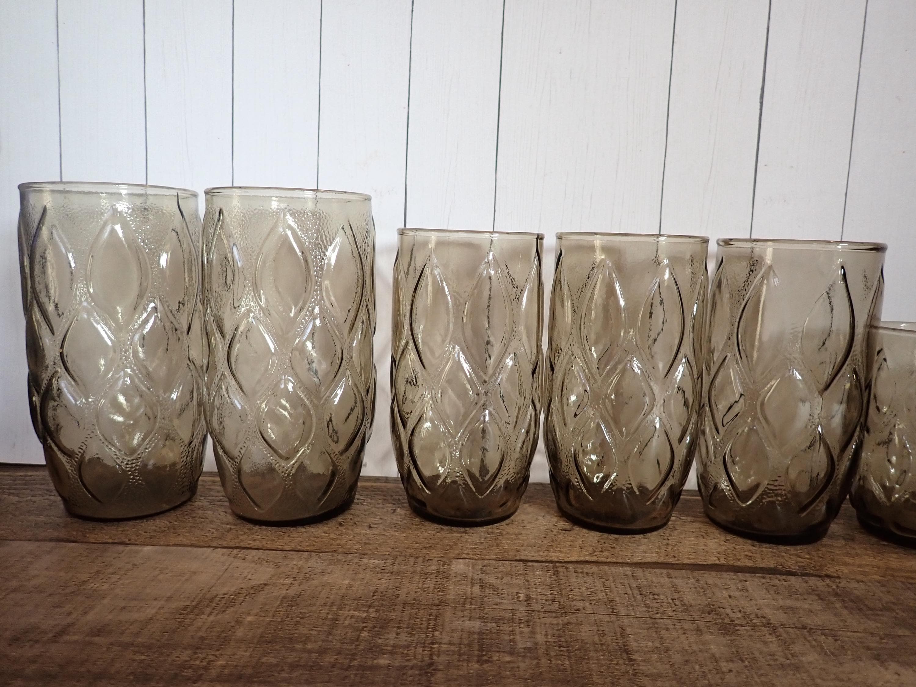 This set of 9 Anchor Hocking glasses are in the Madrid Brown pattern. They are a smoky brown color, and have a smooth textured finish with raised diamond shapes running vertically down the glass to create a subtle geometric pattern. This mix and match set includes 9 glasses in various sizes - included are: