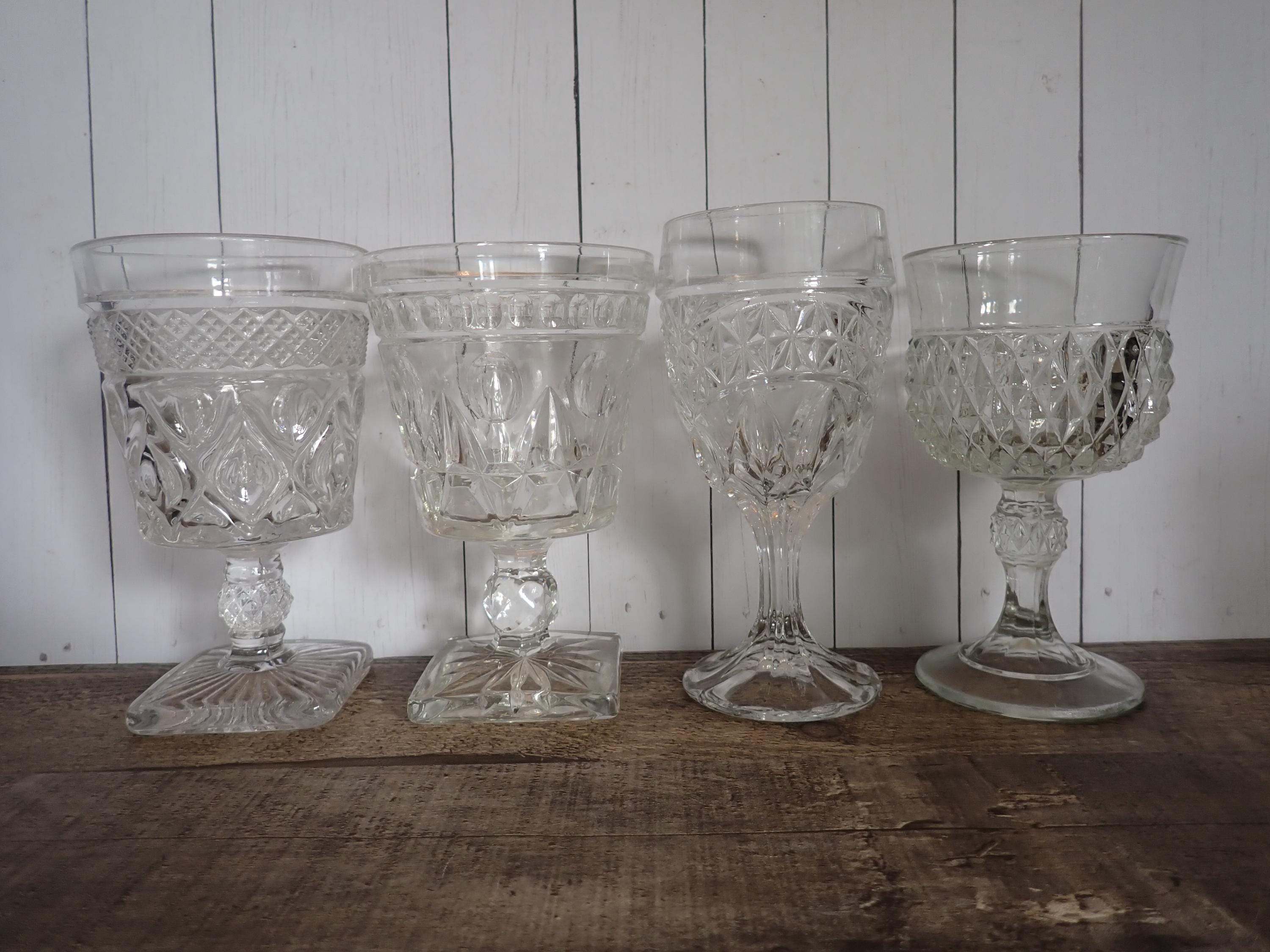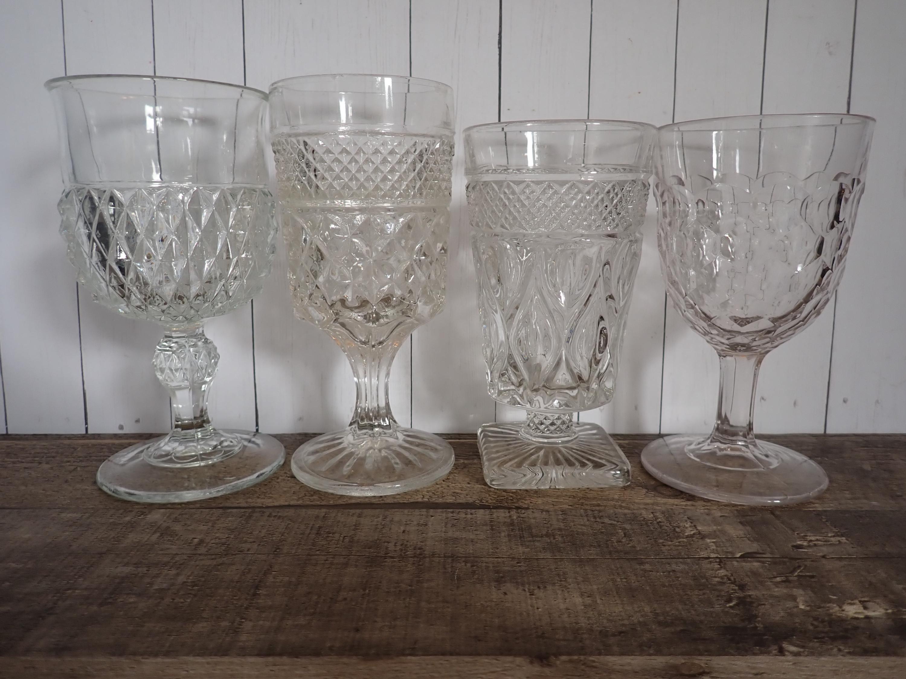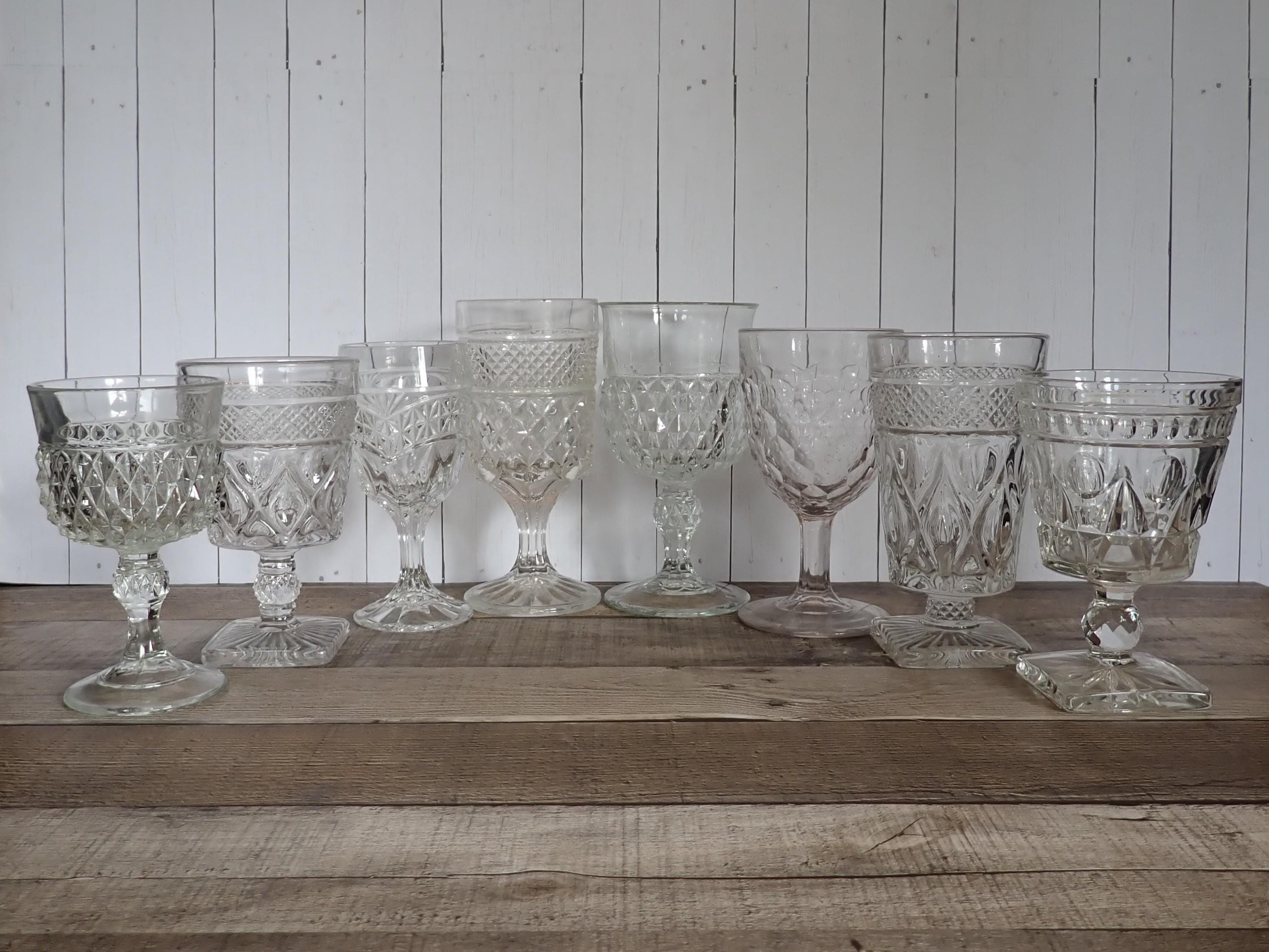 This set of 8 clear glass goblets and glasses includes 8 glasses in different styles and patterns. The glasses range from 5.5" to 7.25" tall. All 8 glasses are in very good condition with no chips or cracks, however there are some light scratches here and there from use.