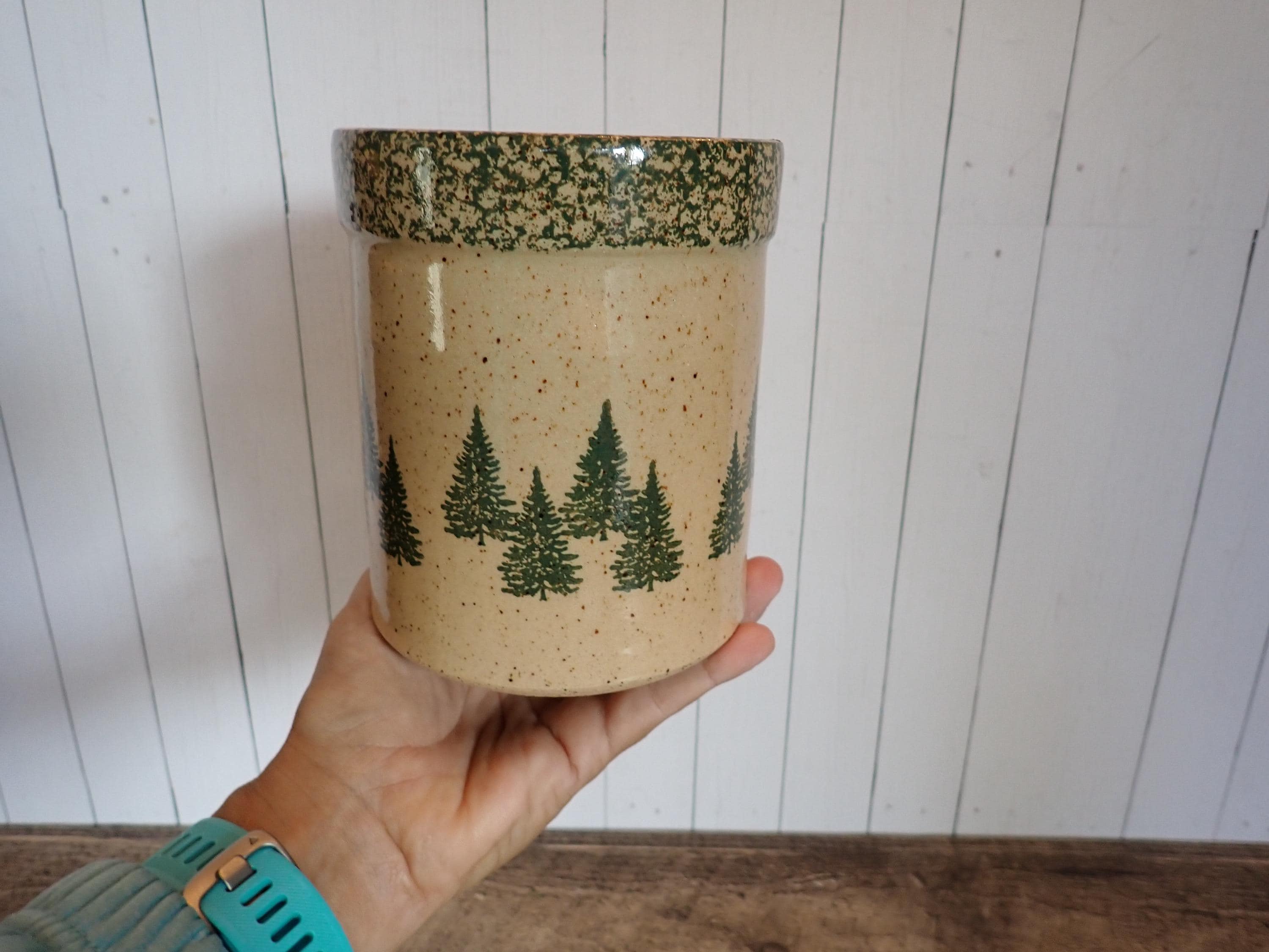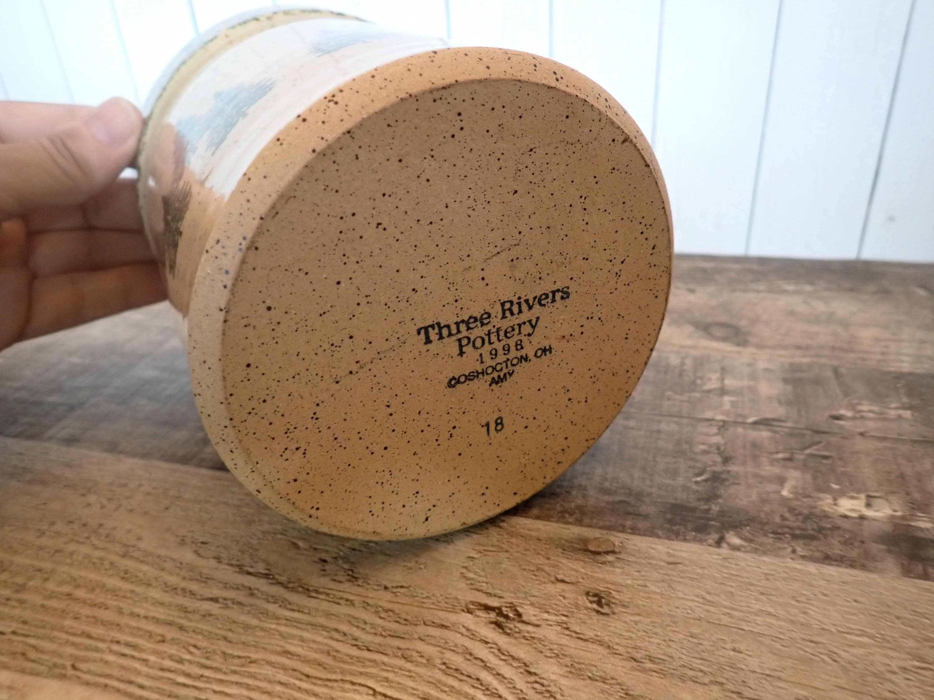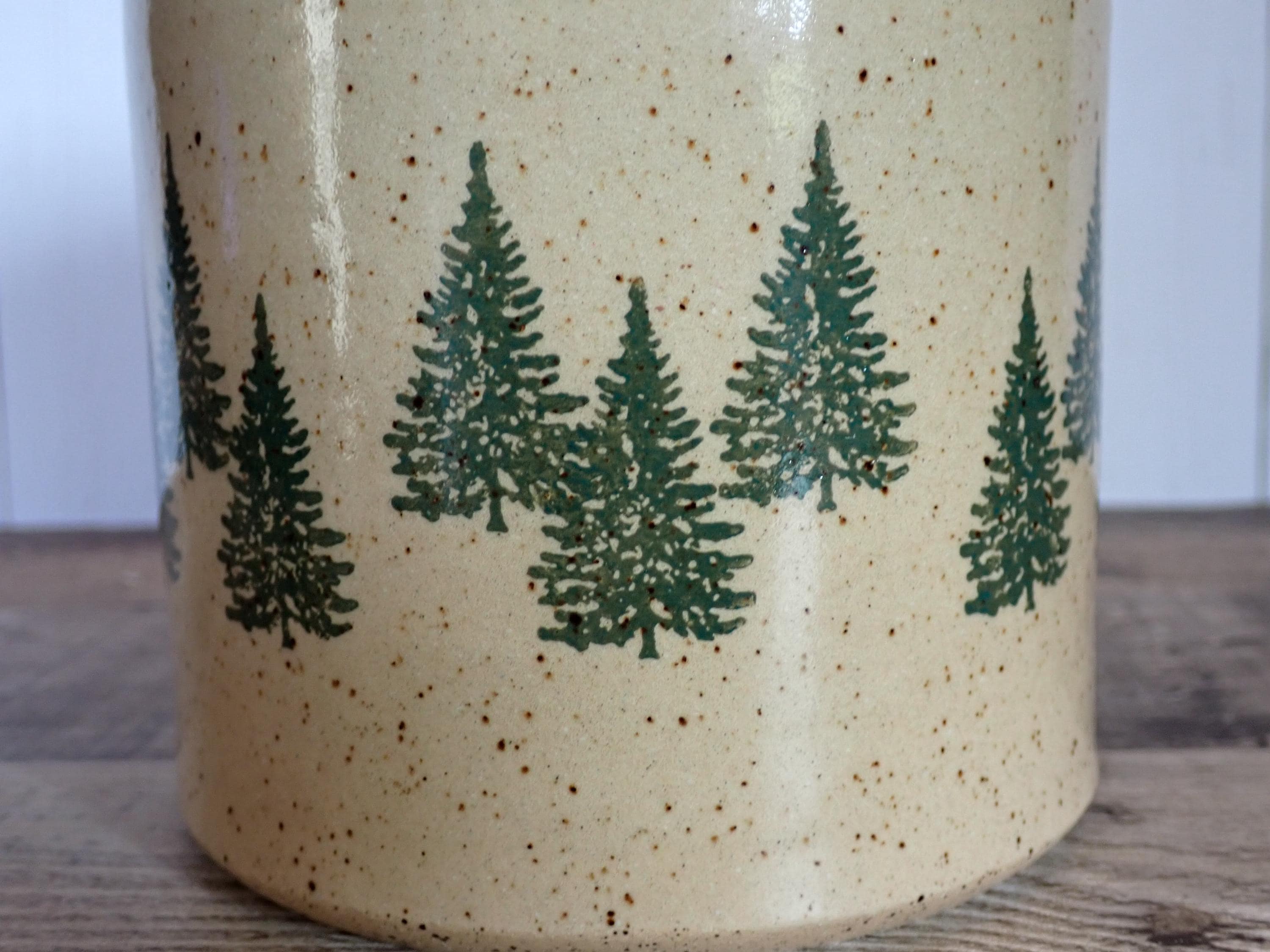 This stoneware crock or vase from Three Rivers Pottery is 5.5" tall and 4.5" in diameter. It is a tan stoneware and is decorated with green pine trees and a green band around the rim. The bottom is stamped THREE RIVERS POTTERY / 19918/ COSHOCTON, OH / AMY. The crock is in very good condition with no chips or cracks.