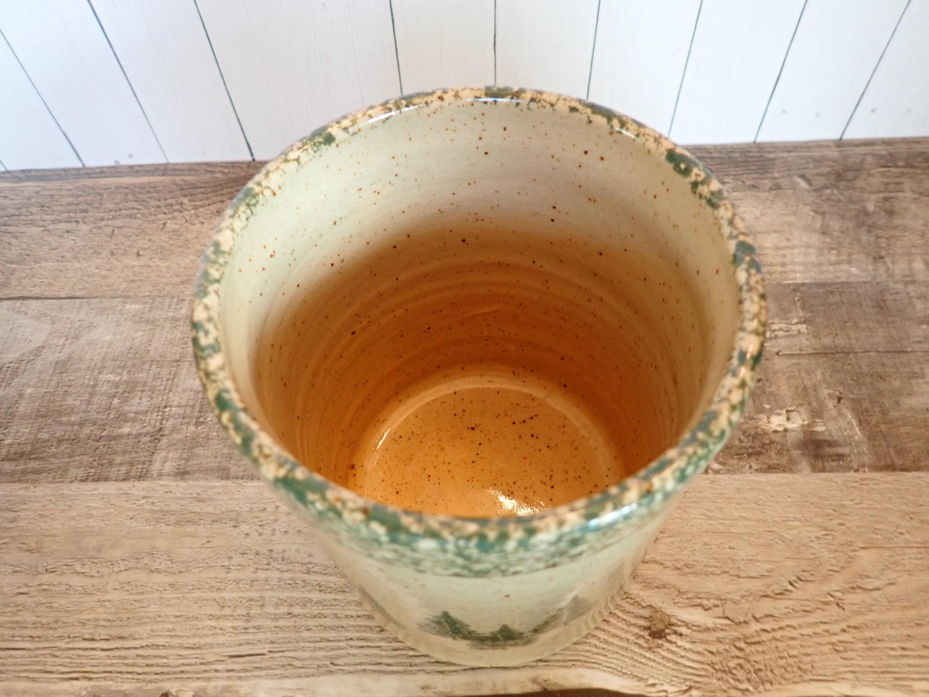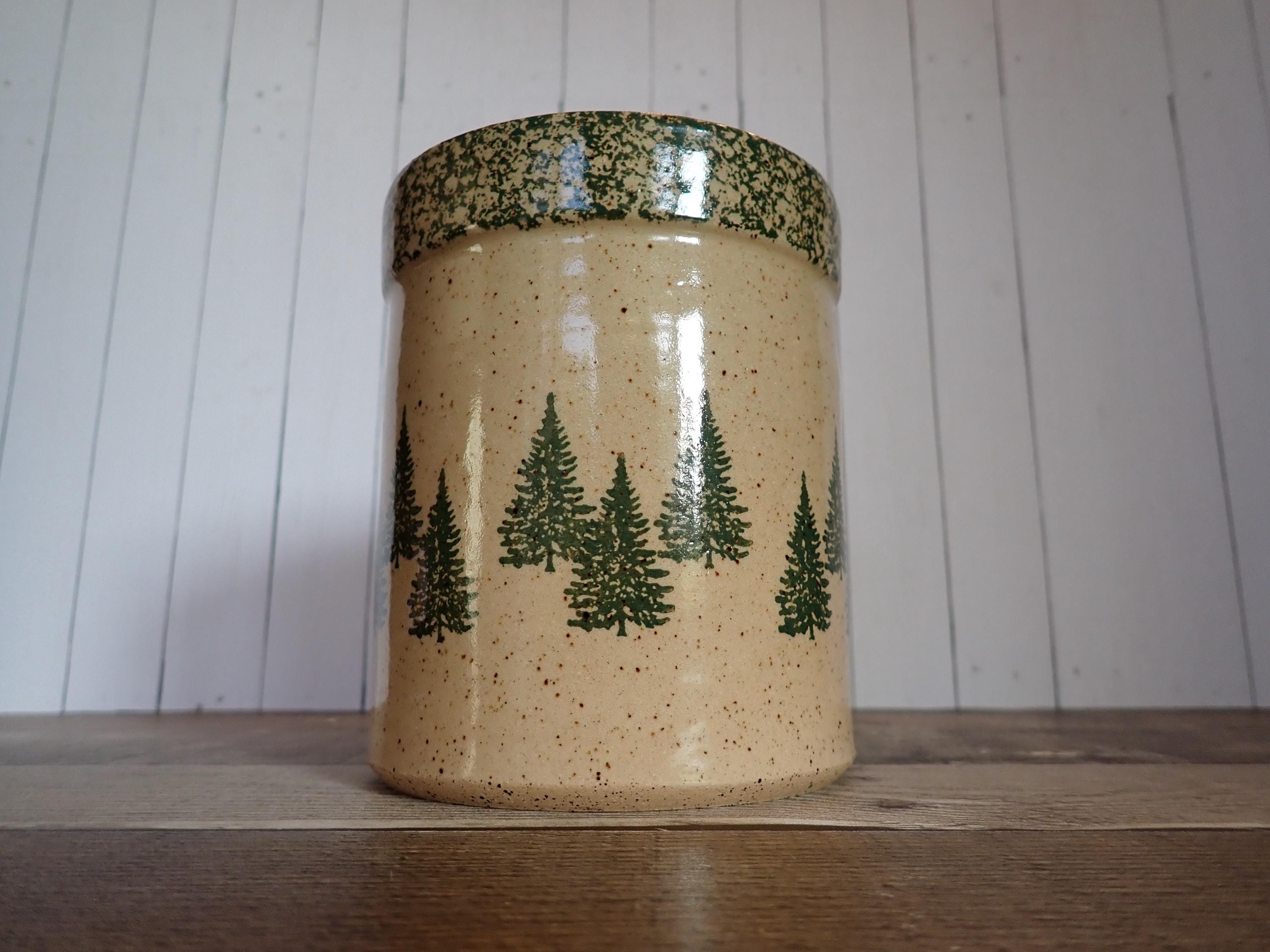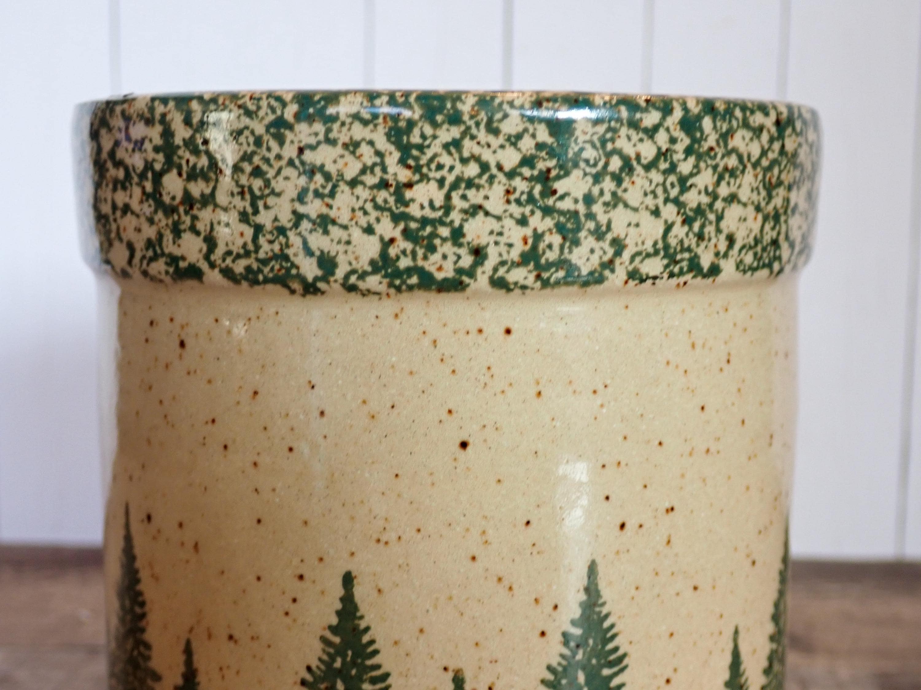 This stoneware crock or vase from Three Rivers Pottery is 5.5" tall and 4.5" in diameter. It is a tan stoneware and is decorated with green pine trees and a green band around the rim. The bottom is stamped THREE RIVERS POTTERY / 19918/ COSHOCTON, OH / AMY. The crock is in very good condition with no chips or cracks.