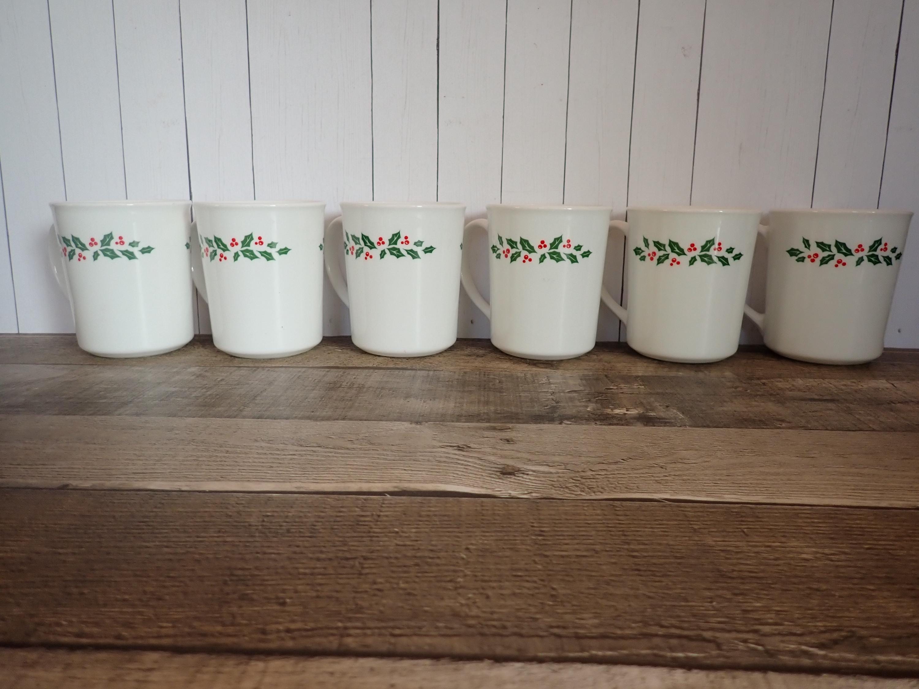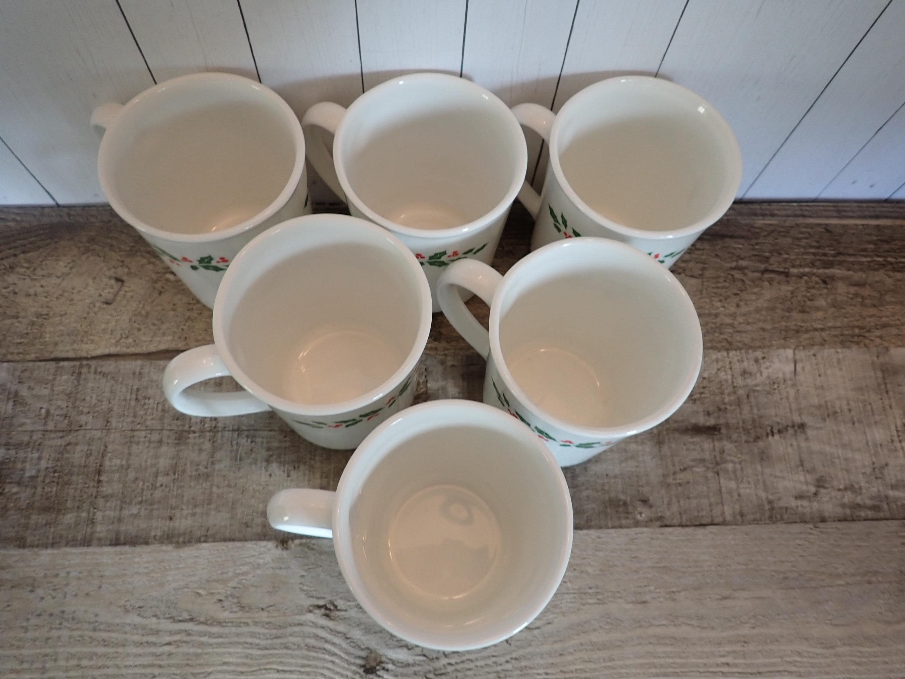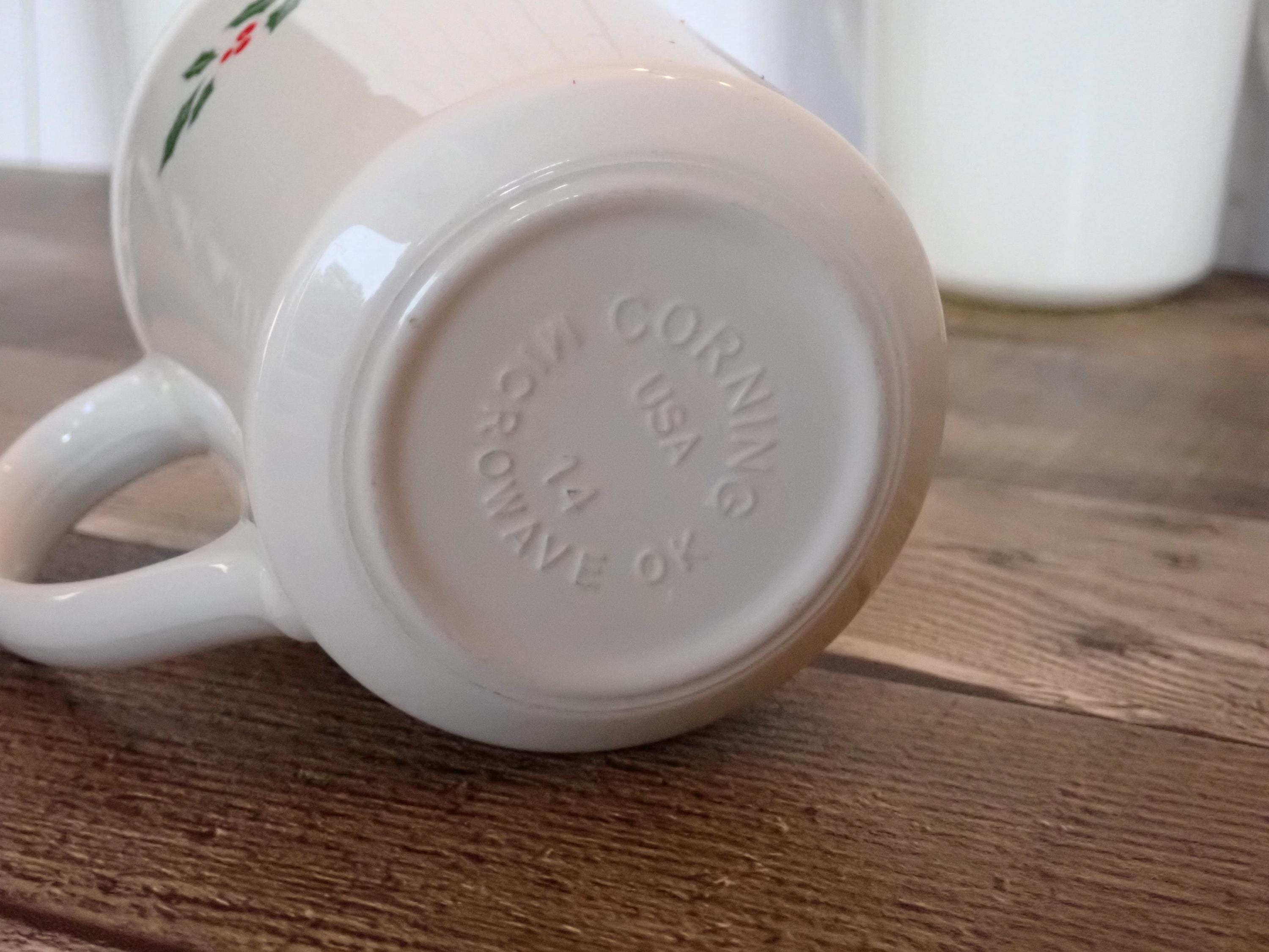 This set of 6 mugs by Corning are in the Corelle Winter Holly pattern. The mugs are each 3.75" tall and 3" in diameter. They are a white glass with green holly leaves and red berries around the mug. The bottoms are marked: CORNING USA / MICROWAVE OK. All 6 mugs are in very good condition with no chips or cracks. The graphics are bright and clear. One mug has some light coffee staining on the bottom as shown in the last photo.