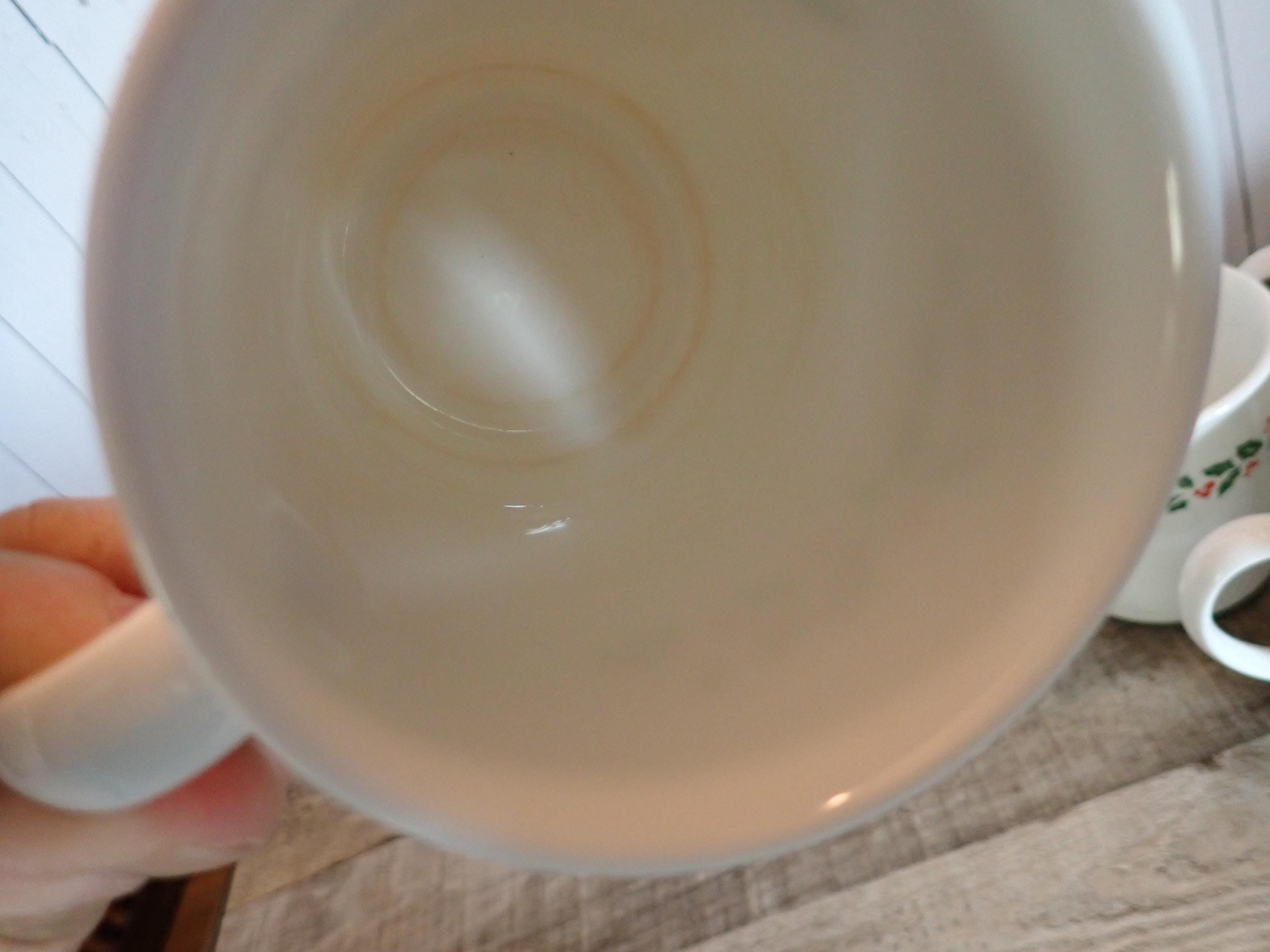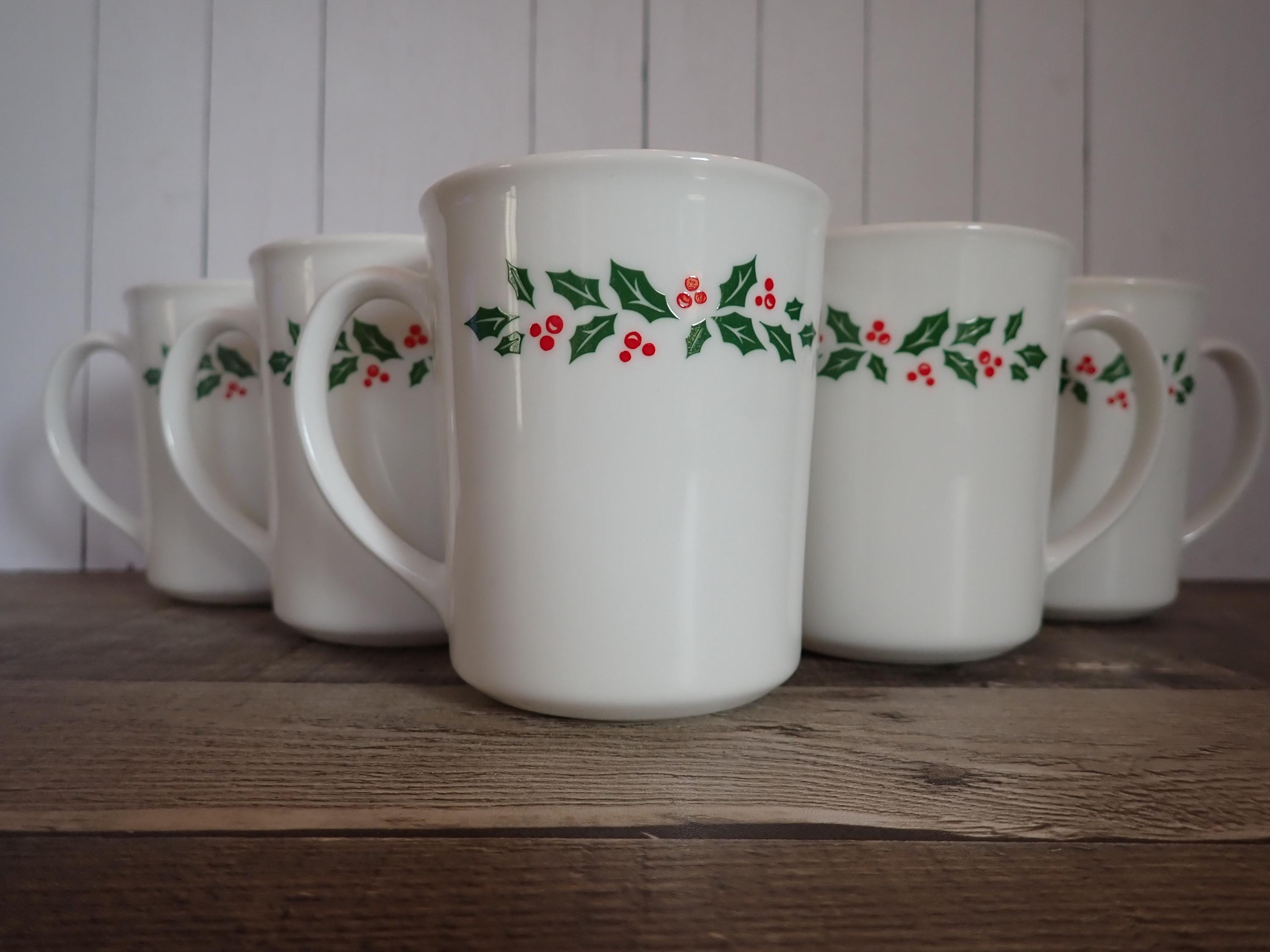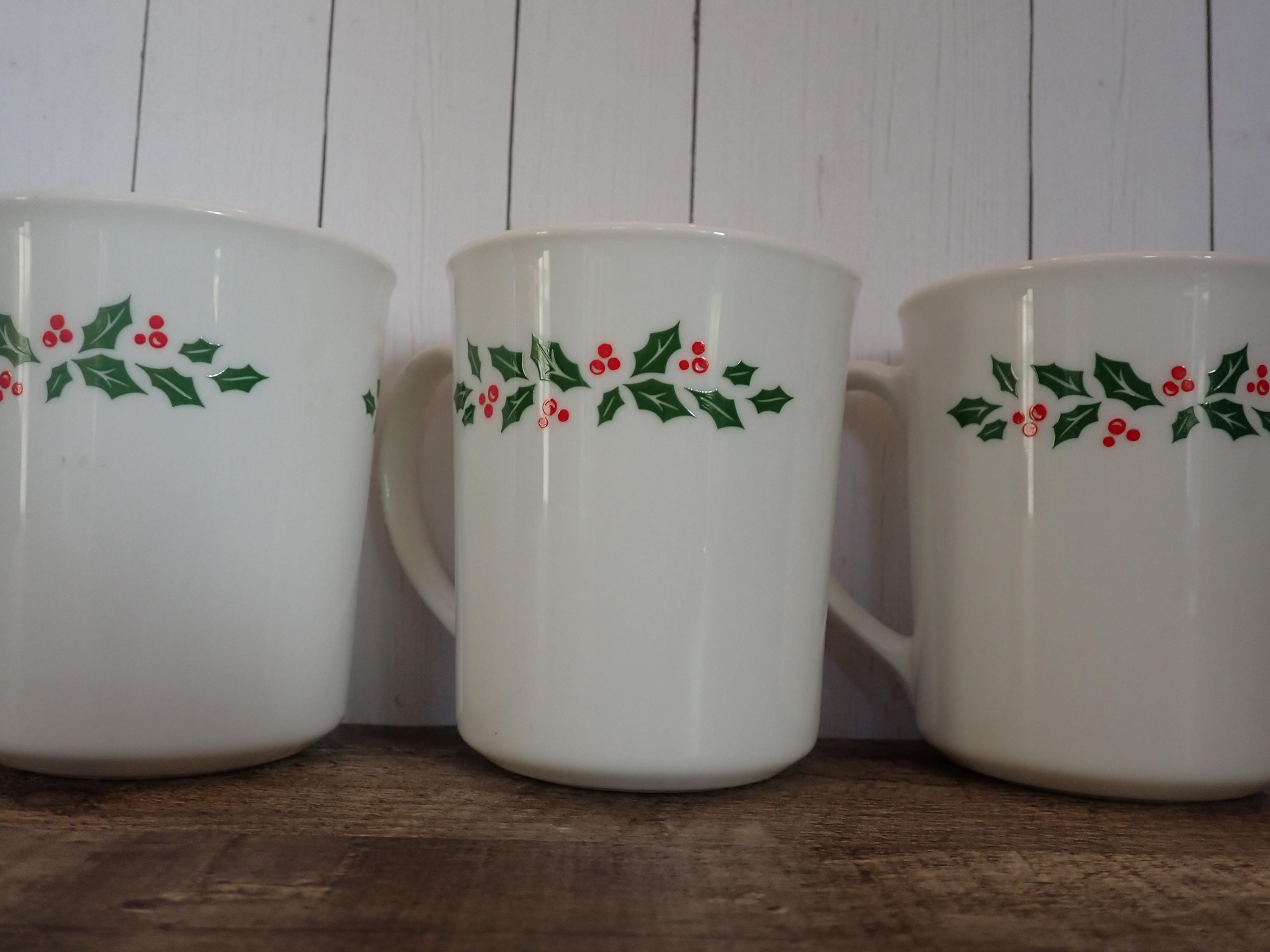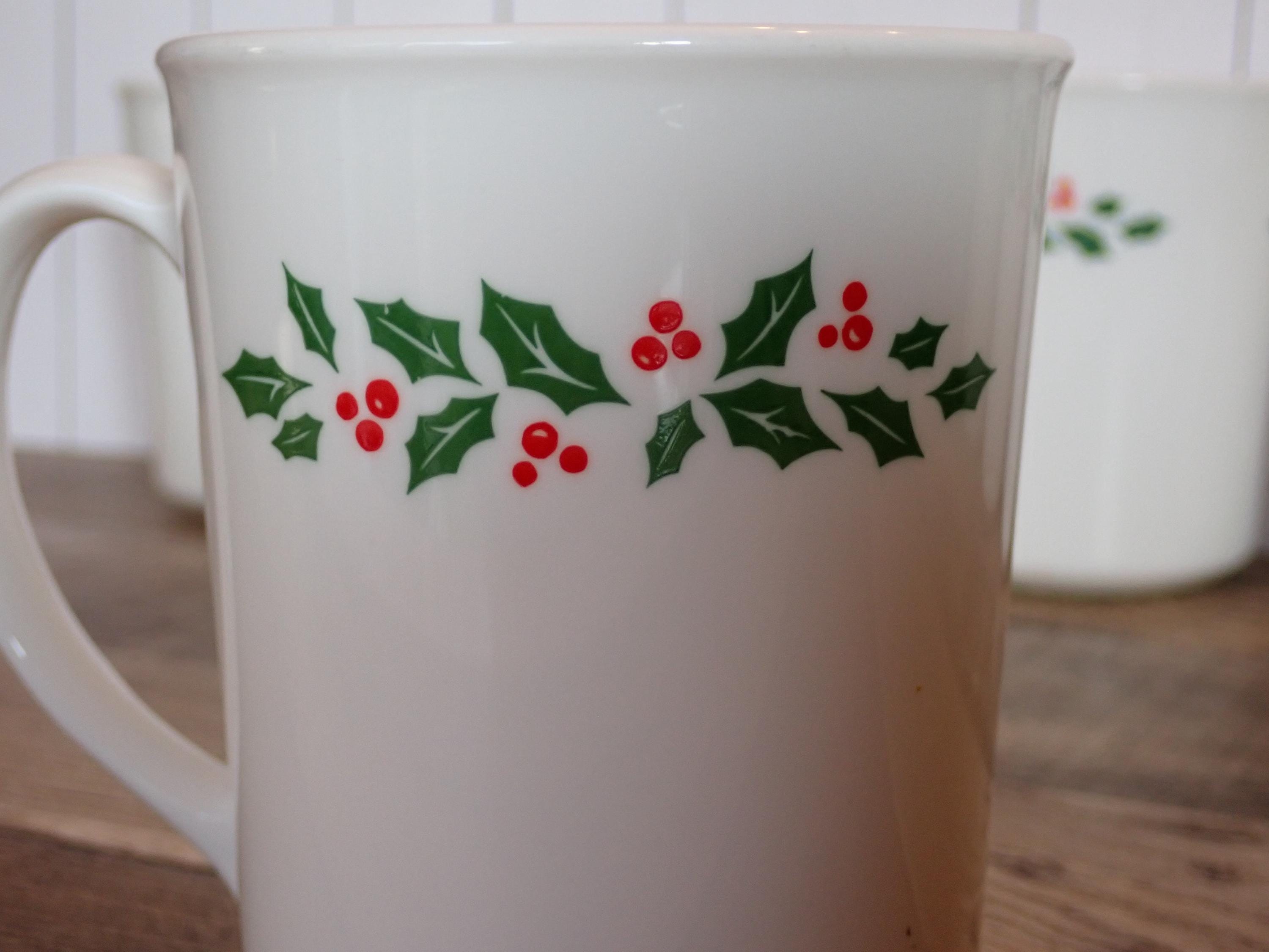 This set of 6 mugs by Corning are in the Corelle Winter Holly pattern. The mugs are each 3.75" tall and 3" in diameter. They are a white glass with green holly leaves and red berries around the mug. The bottoms are marked: CORNING USA / MICROWAVE OK. All 6 mugs are in very good condition with no chips or cracks. The graphics are bright and clear. One mug has some light coffee staining on the bottom as shown in the last photo.
