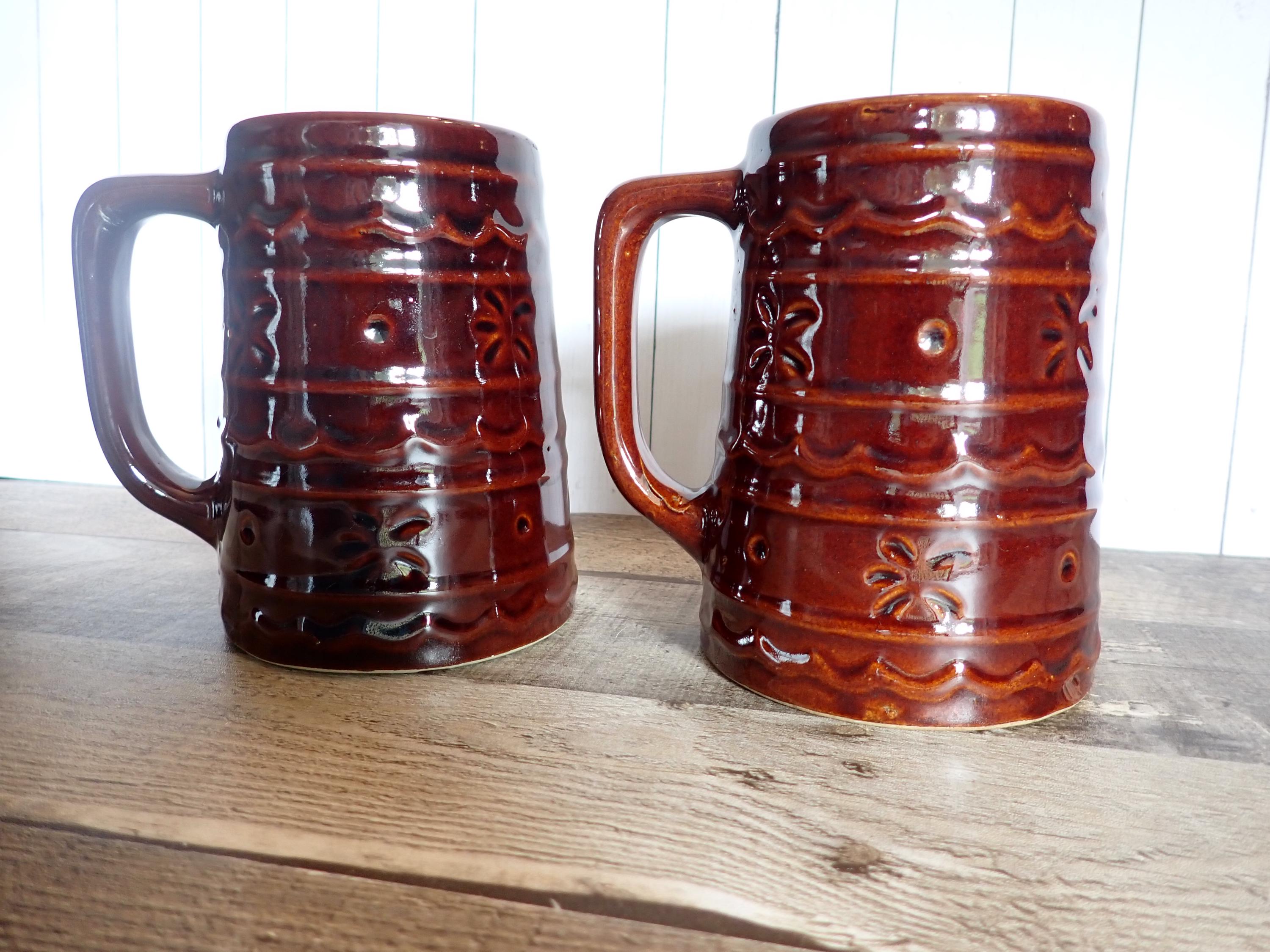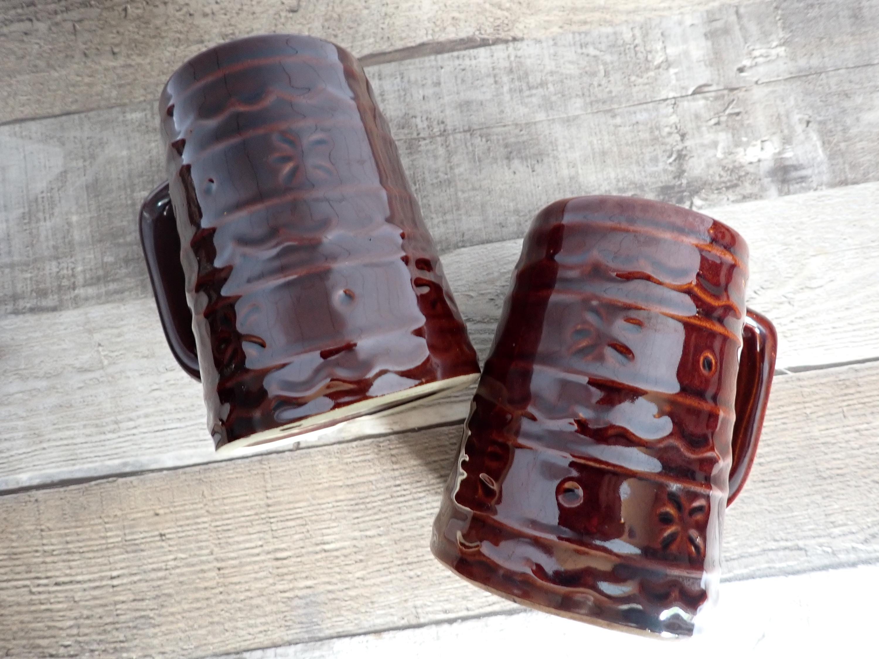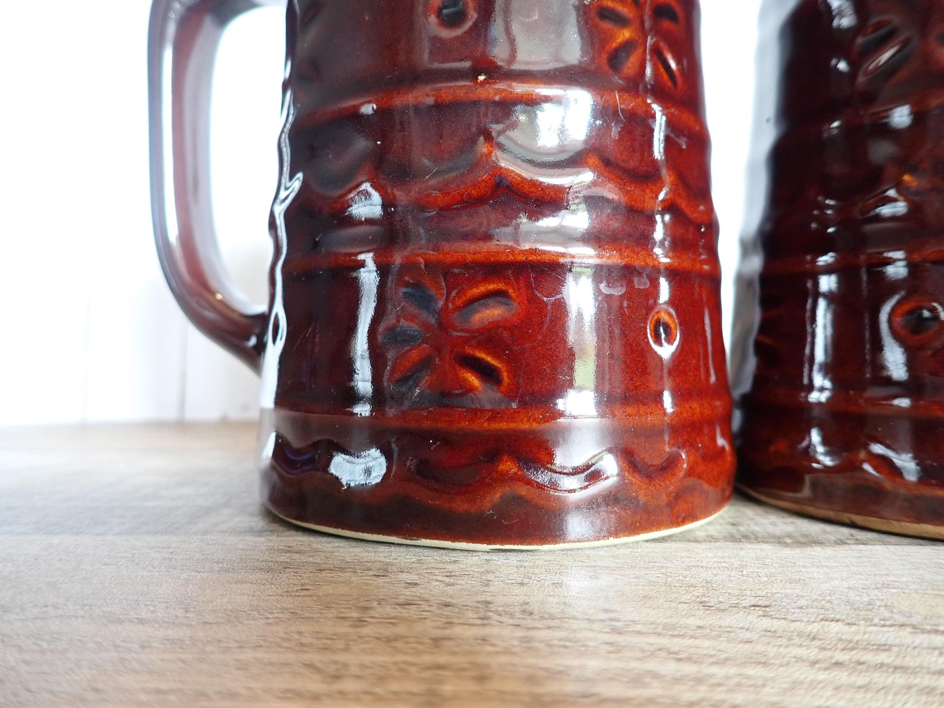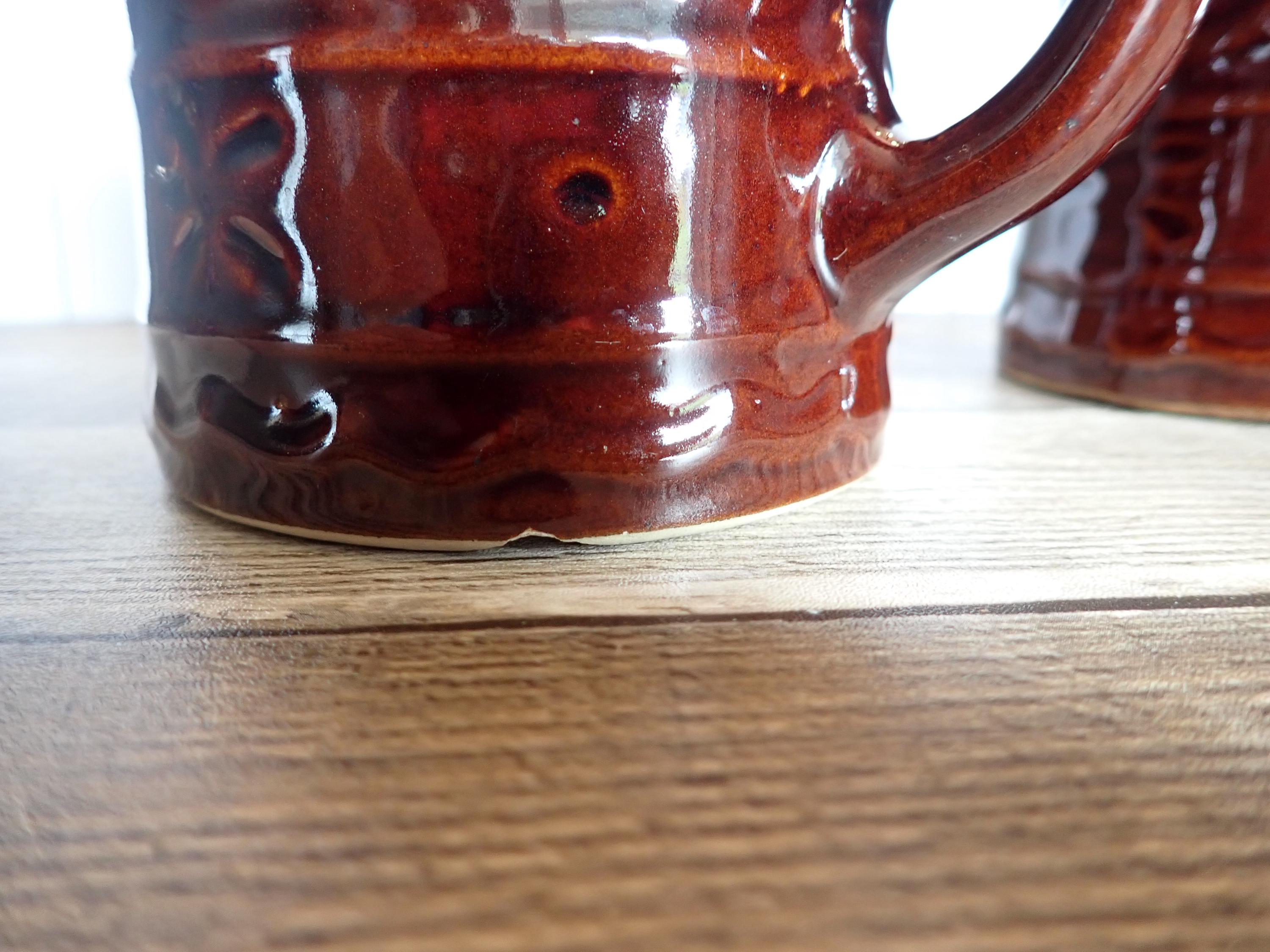 This set of mug by Marcrest includes 2 large mugs in the Daisy Dot pattern. The mugs are 5.25" tall, 3.75" in diameter at the base, and 3" in diameter at the top. They are marked USA on the bottom. The have a subtle flower and dot design around the mug. These are thick, heavy stoneware pieces and each mug weights nearly a pound and a half. Both mugs are in very good condition - there is one mug that has a chip on the base, as shown in the last photo.