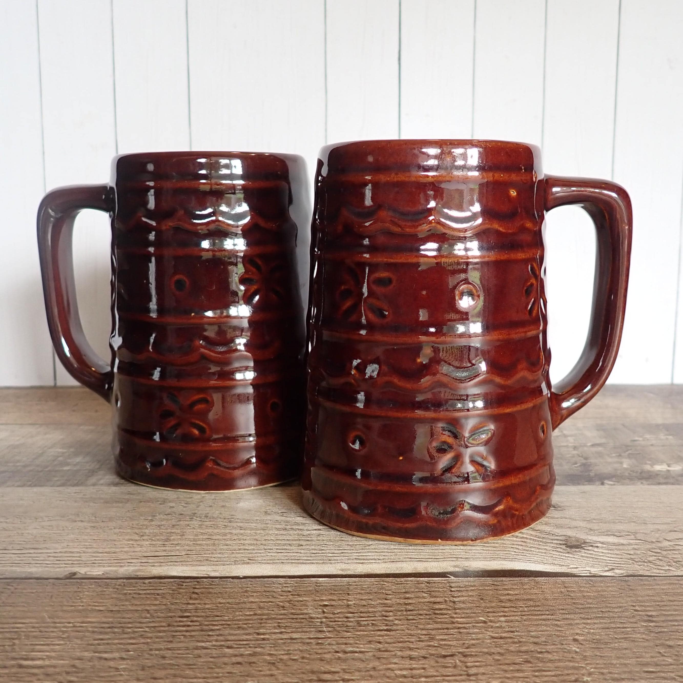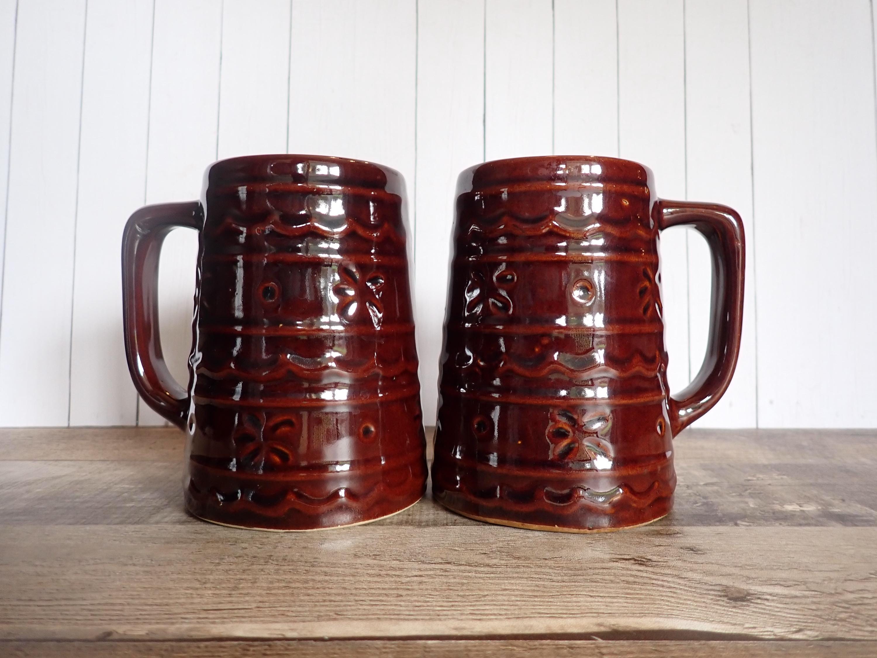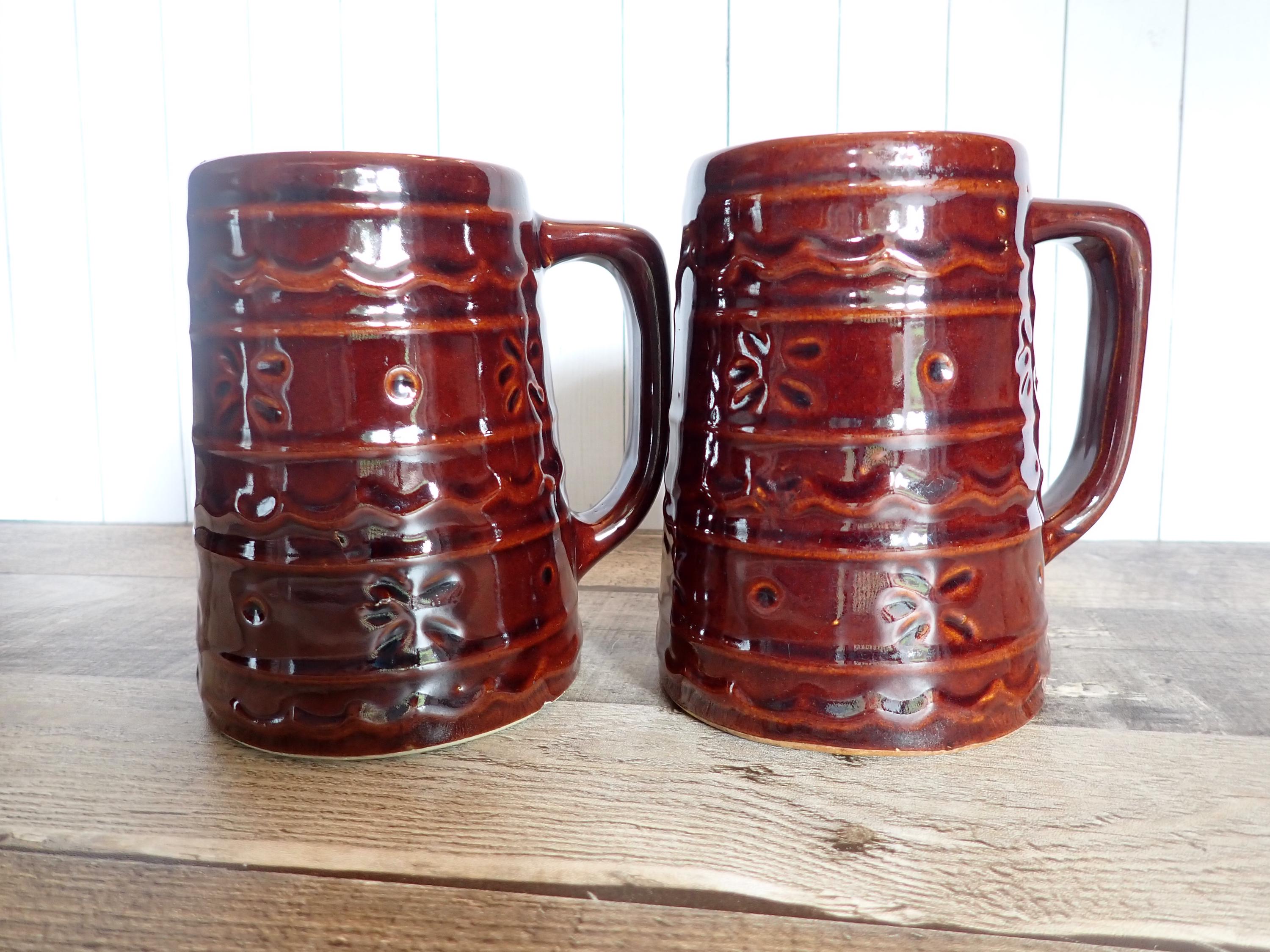 This set of mug by Marcrest includes 2 large mugs in the Daisy Dot pattern. The mugs are 5.25" tall, 3.75" in diameter at the base, and 3" in diameter at the top. They are marked USA on the bottom. The have a subtle flower and dot design around the mug. These are thick, heavy stoneware pieces and each mug weights nearly a pound and a half. Both mugs are in very good condition - there is one mug that has a chip on the base, as shown in the last photo.