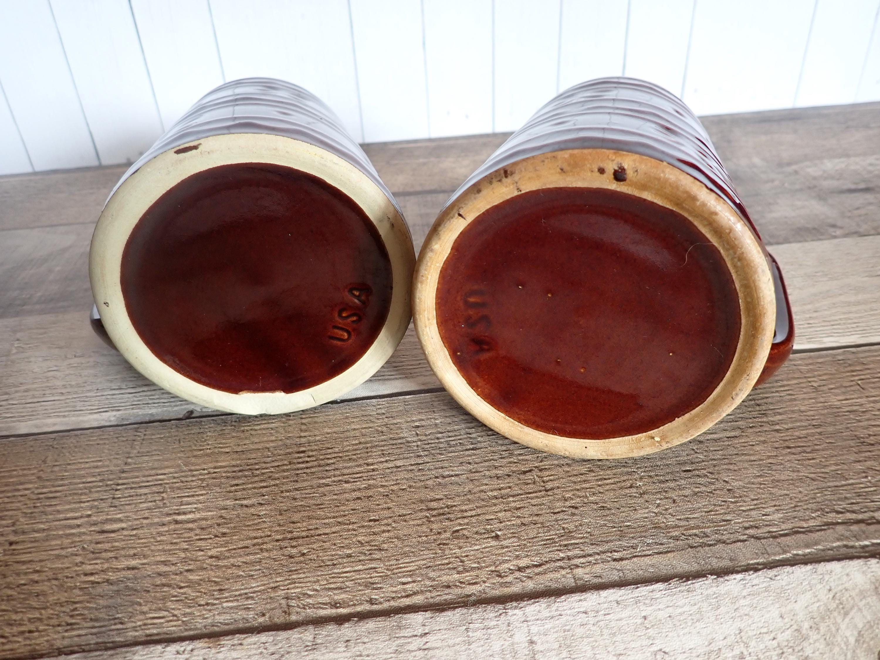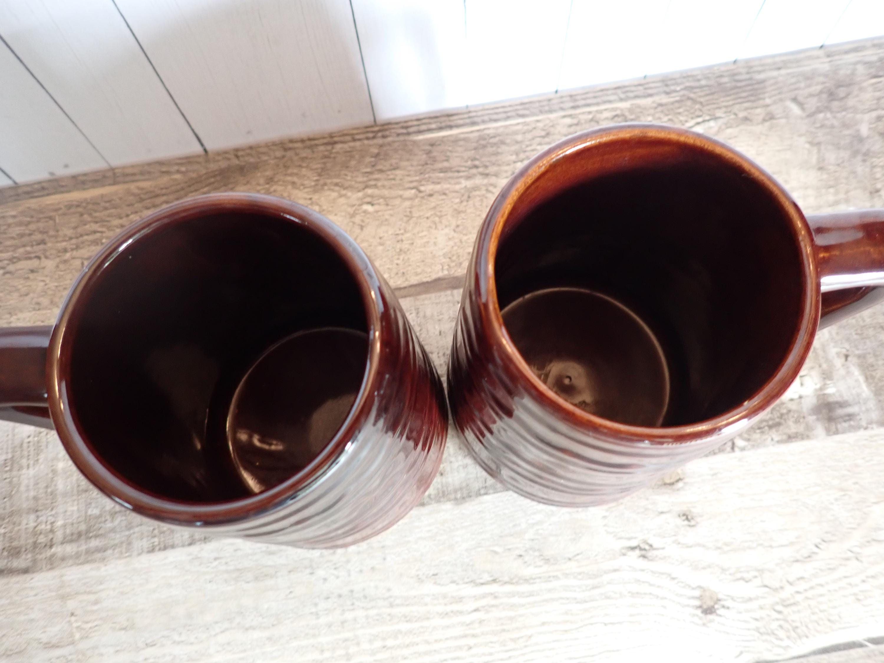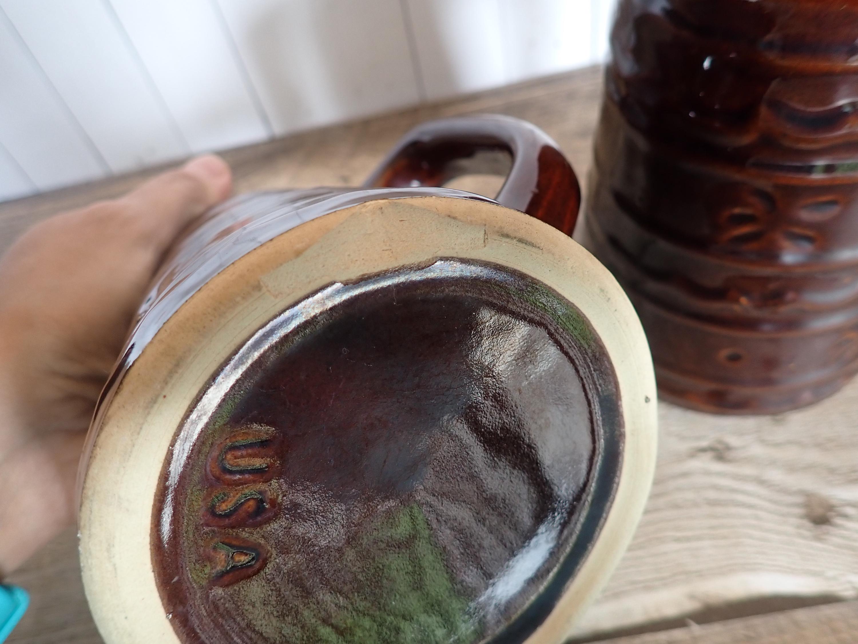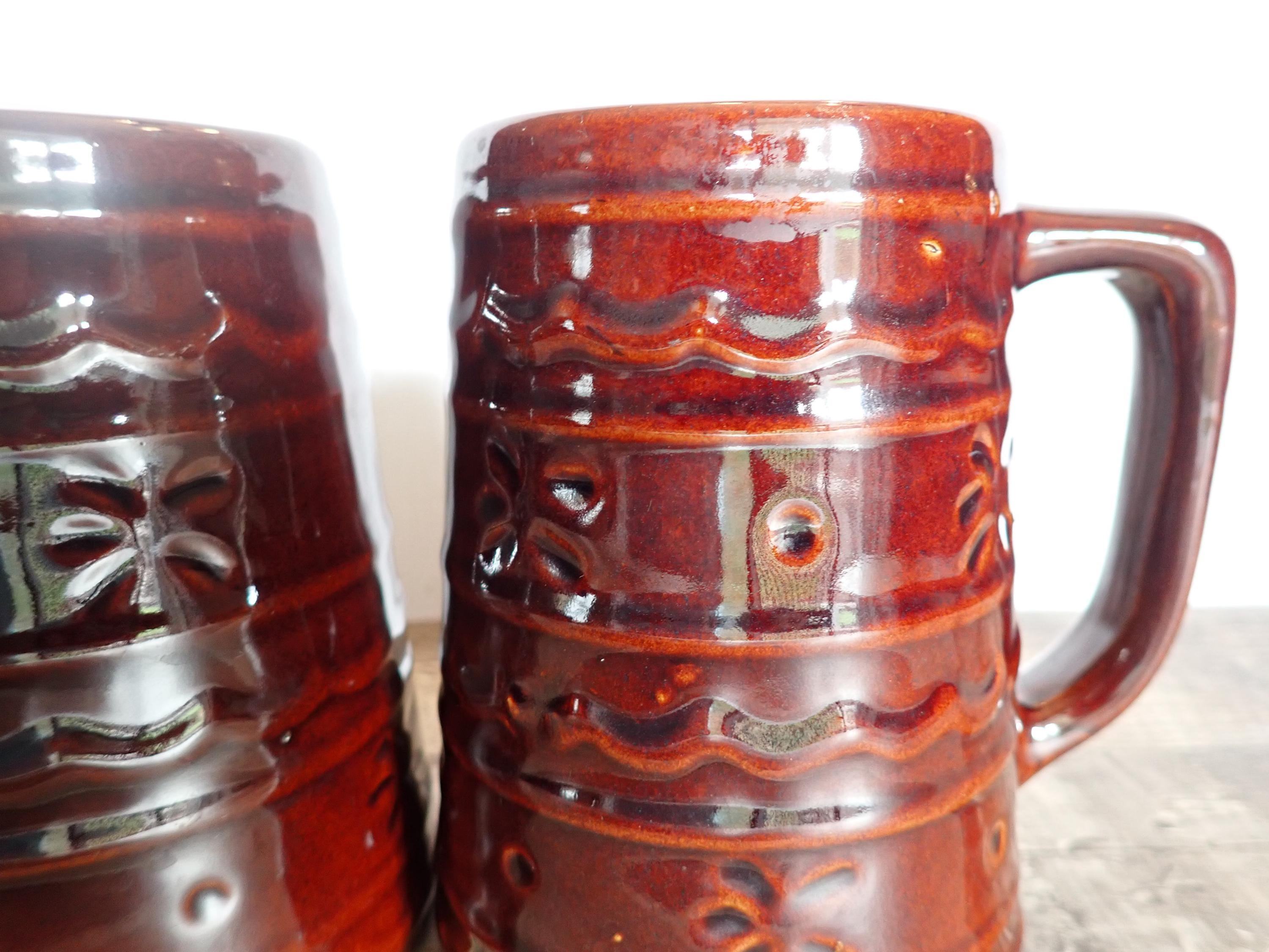 This set of mug by Marcrest includes 2 large mugs in the Daisy Dot pattern. The mugs are 5.25" tall, 3.75" in diameter at the base, and 3" in diameter at the top. They are marked USA on the bottom. The have a subtle flower and dot design around the mug. These are thick, heavy stoneware pieces and each mug weights nearly a pound and a half. Both mugs are in very good condition - there is one mug that has a chip on the base, as shown in the last photo.
