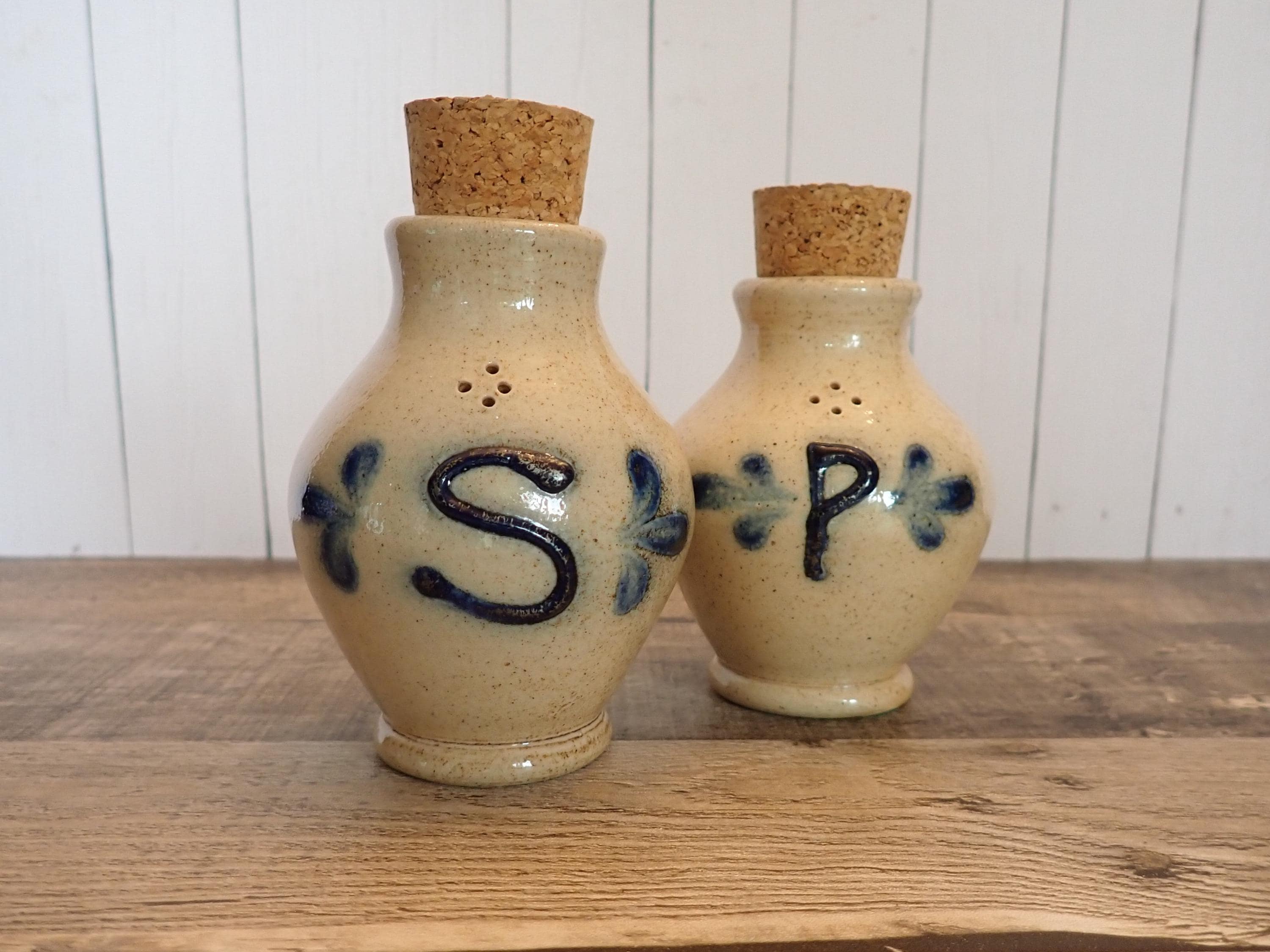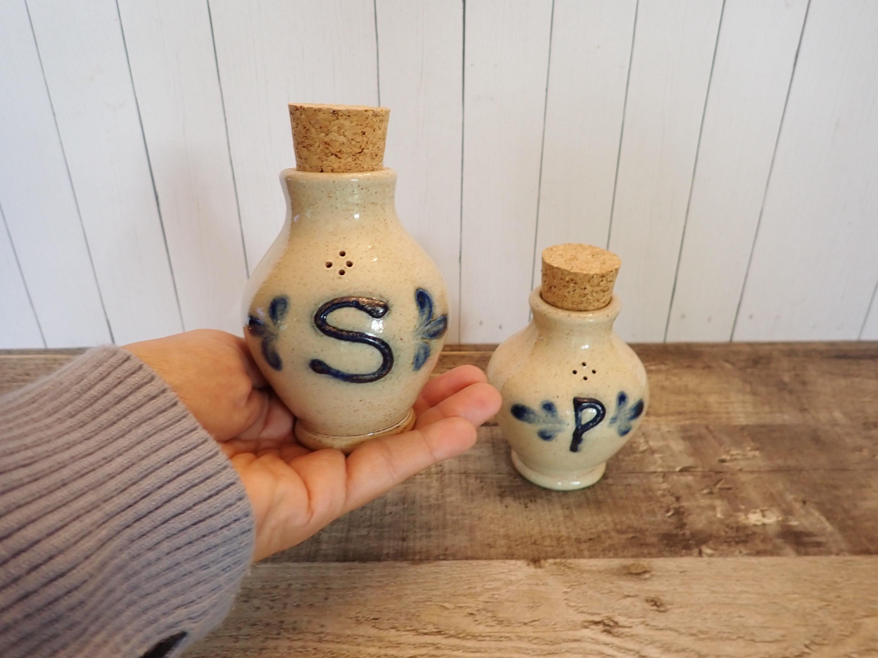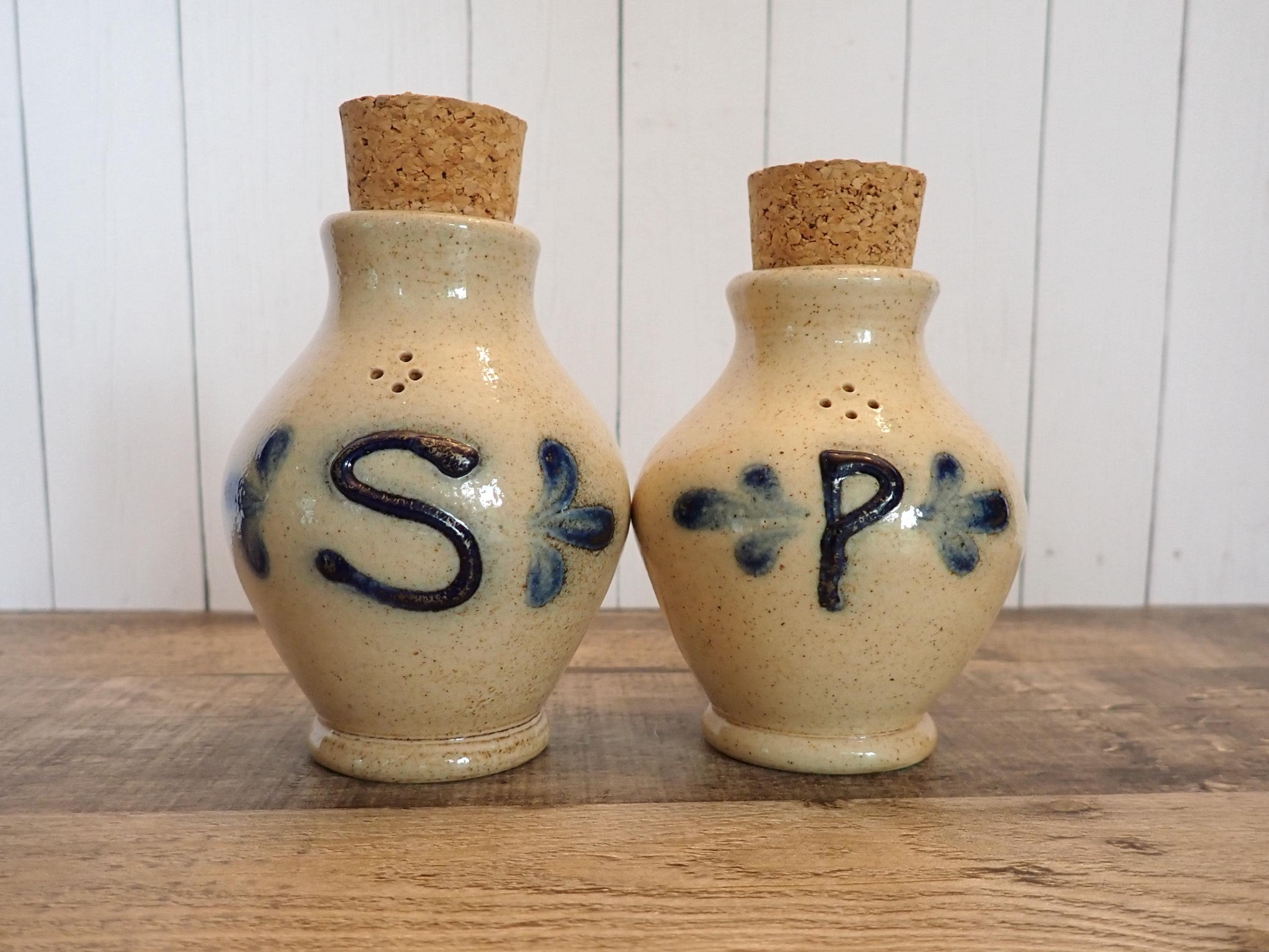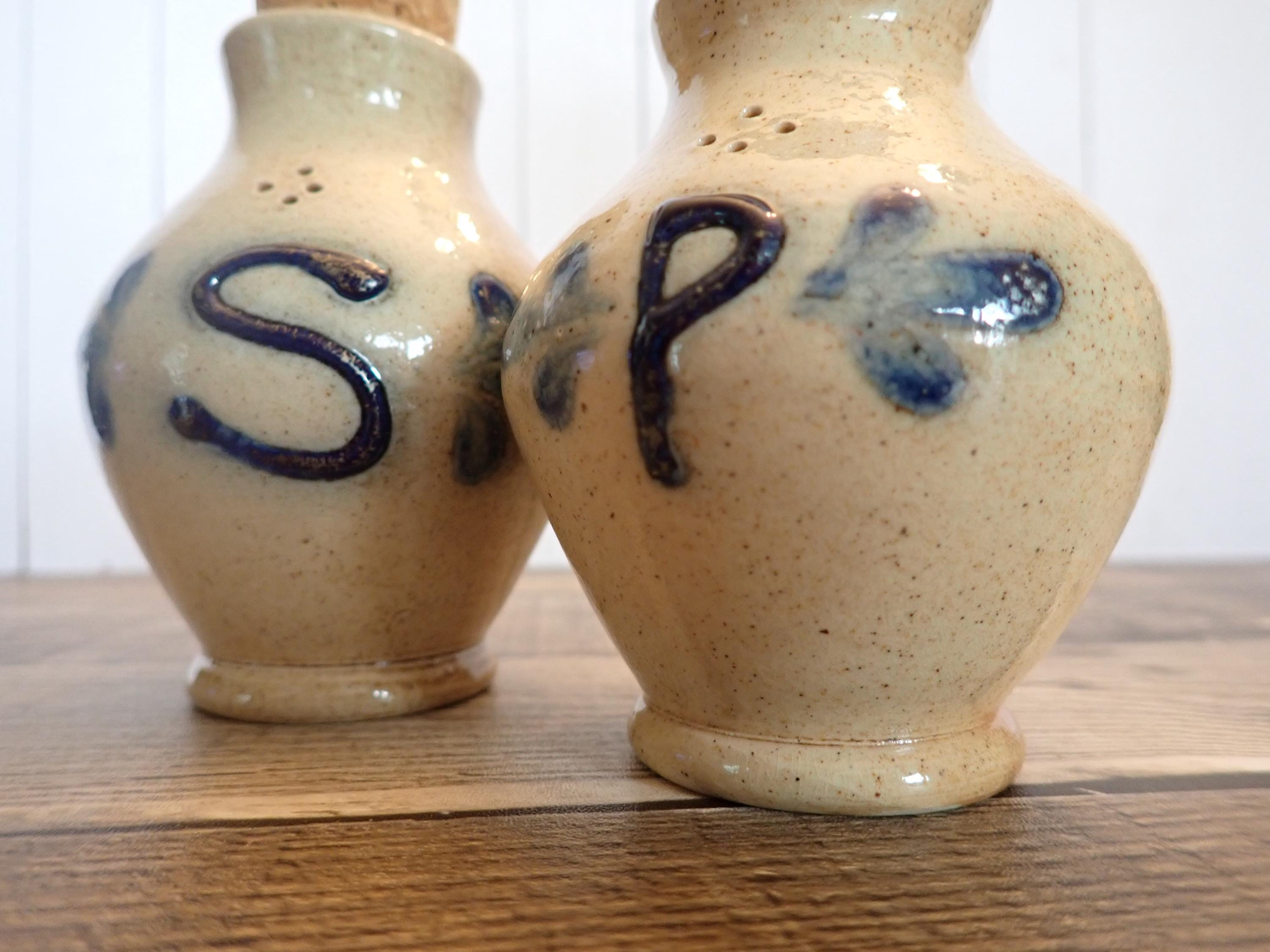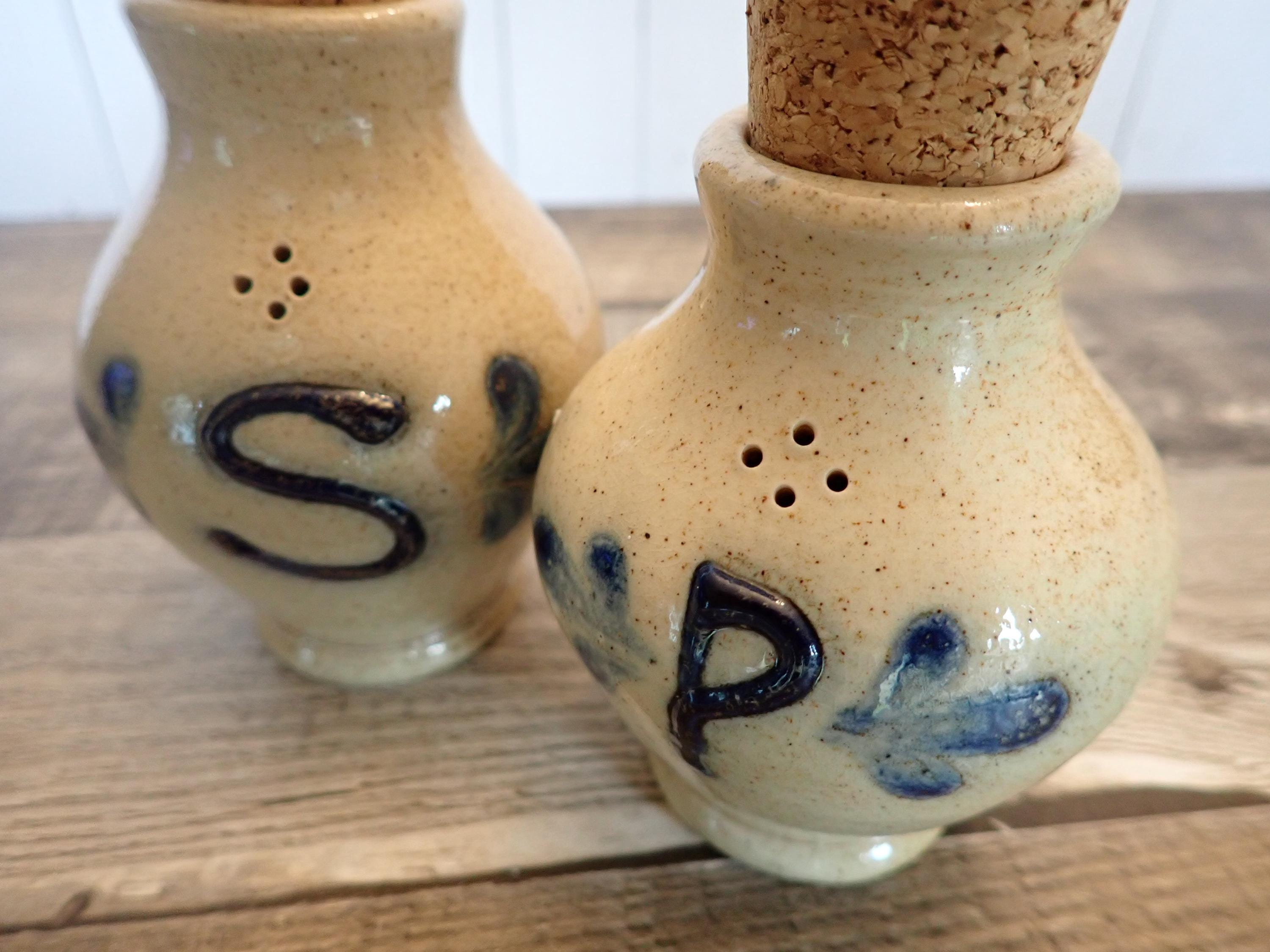 This salt and pepper shaker set by Shadowlawn Pottery includes 2 matching shakers that are 3.75" tall and 3" in diameter. They are a light gray/cream-colored stoneware and are decorated with an S and P on the front of the pieces. There are small cut-out holes on the tops for shaking out the salt or pepper. The side is stamped with the Shadowlawn logo. Both shakers have new replacement cork stoppers. The salt and pepper set is in very good condition with no chips or cracks.