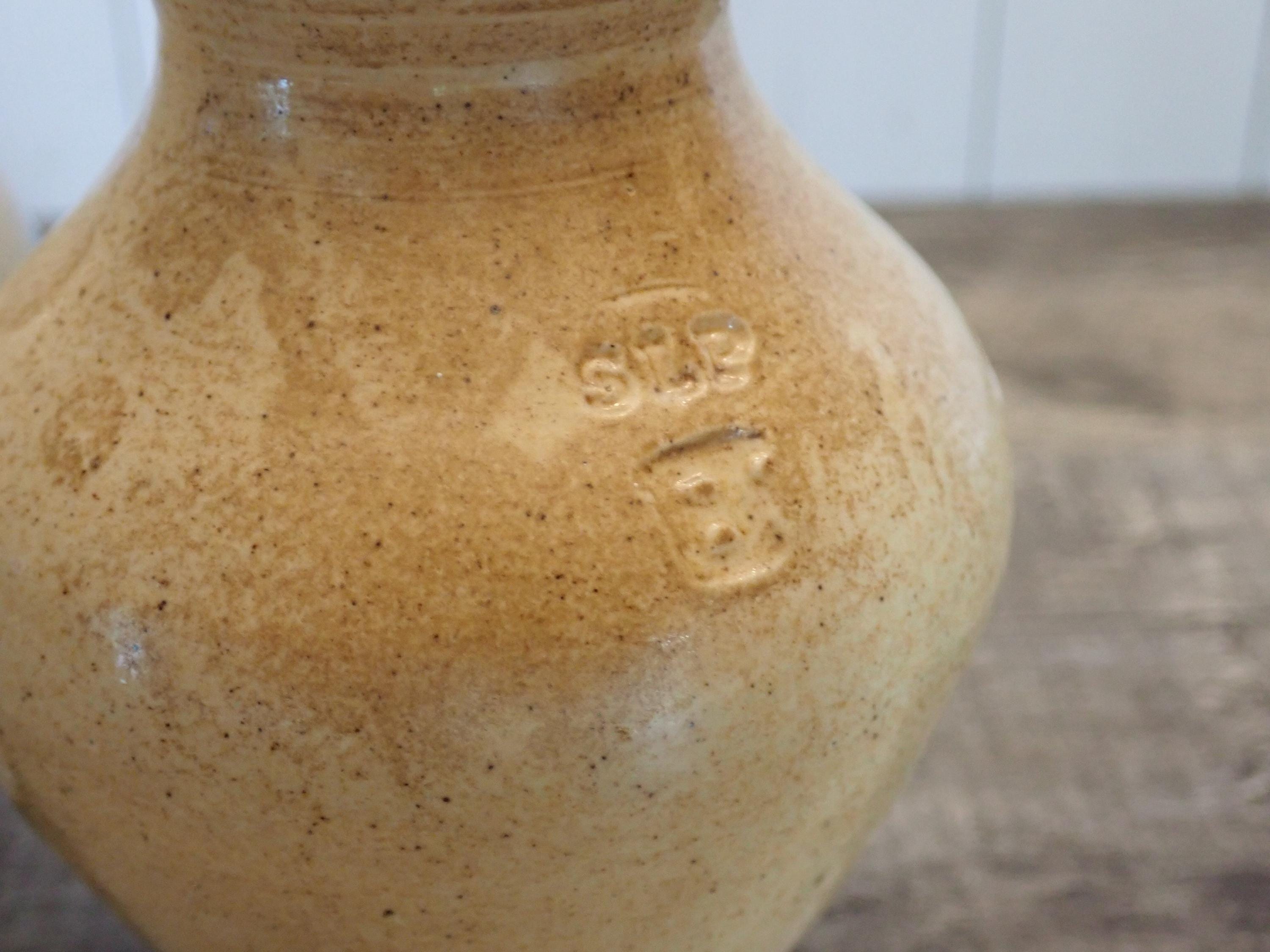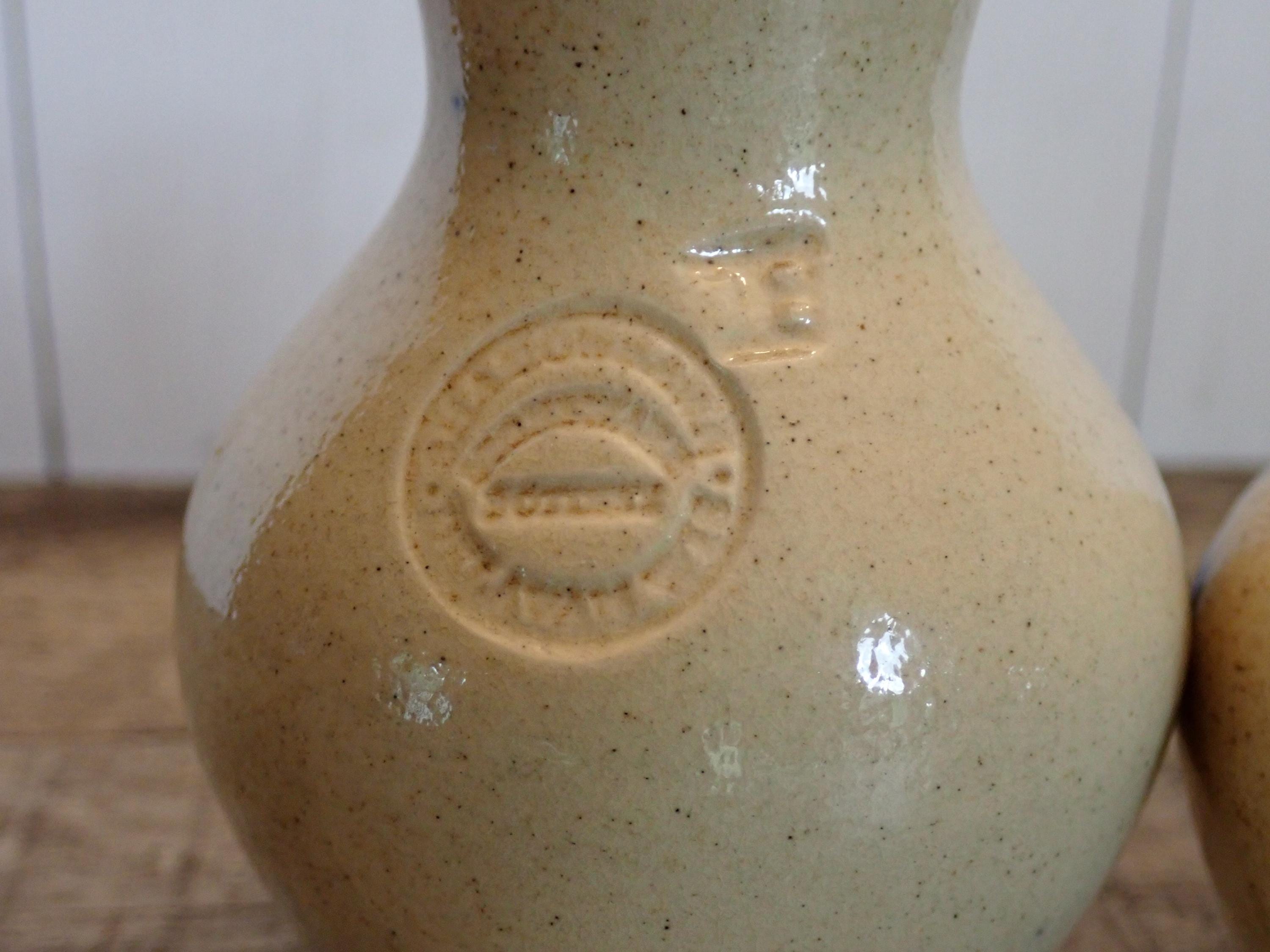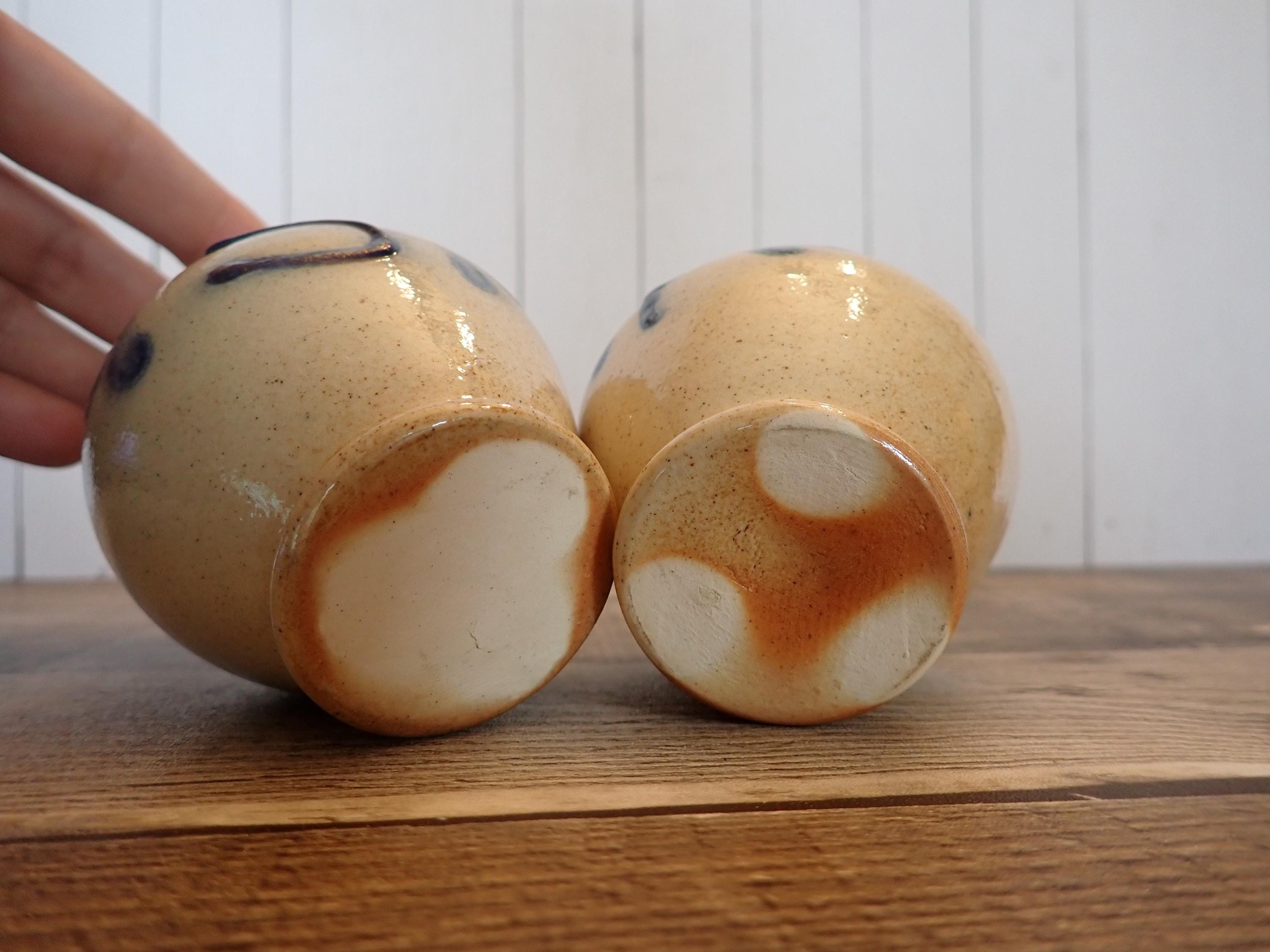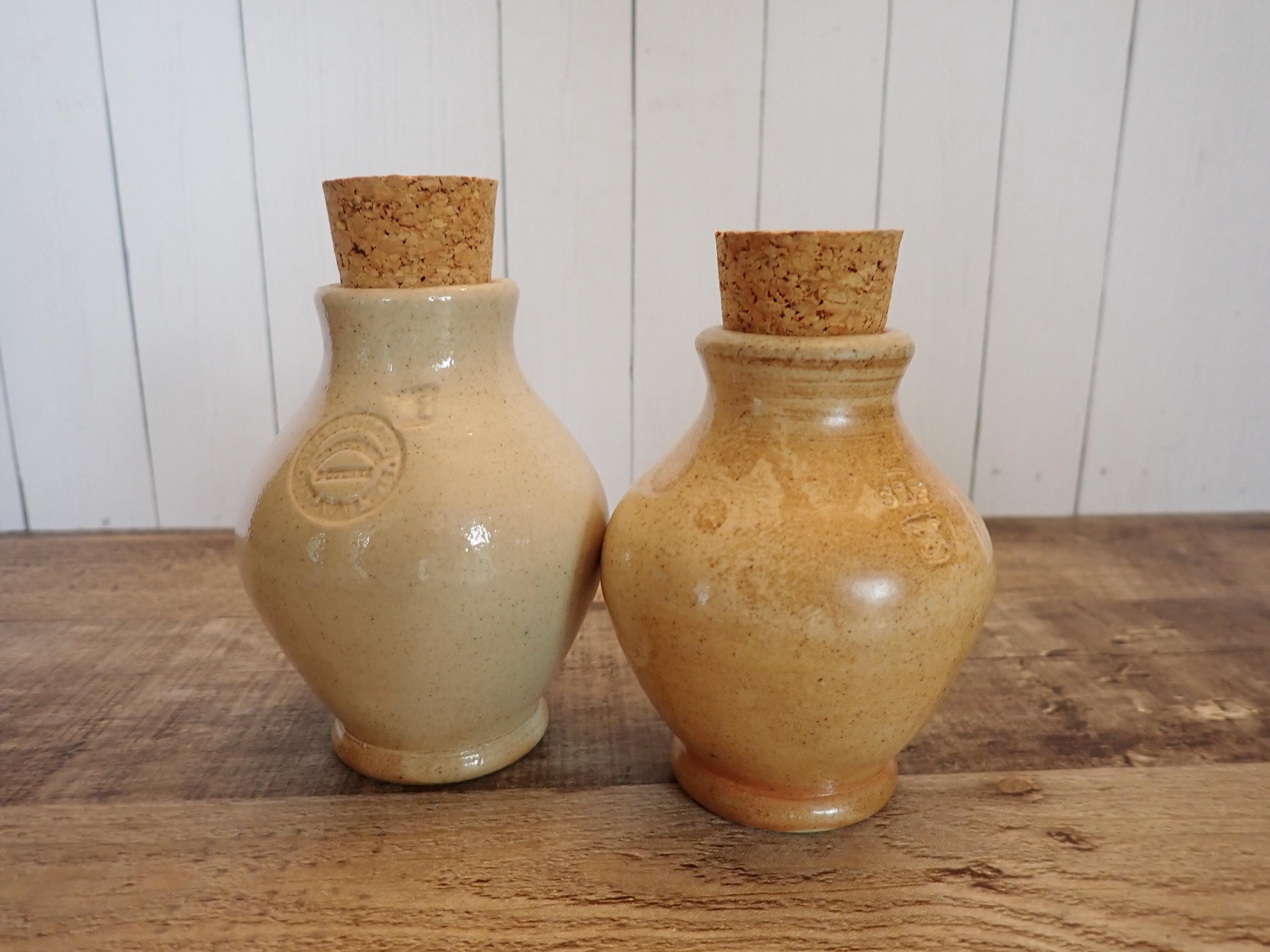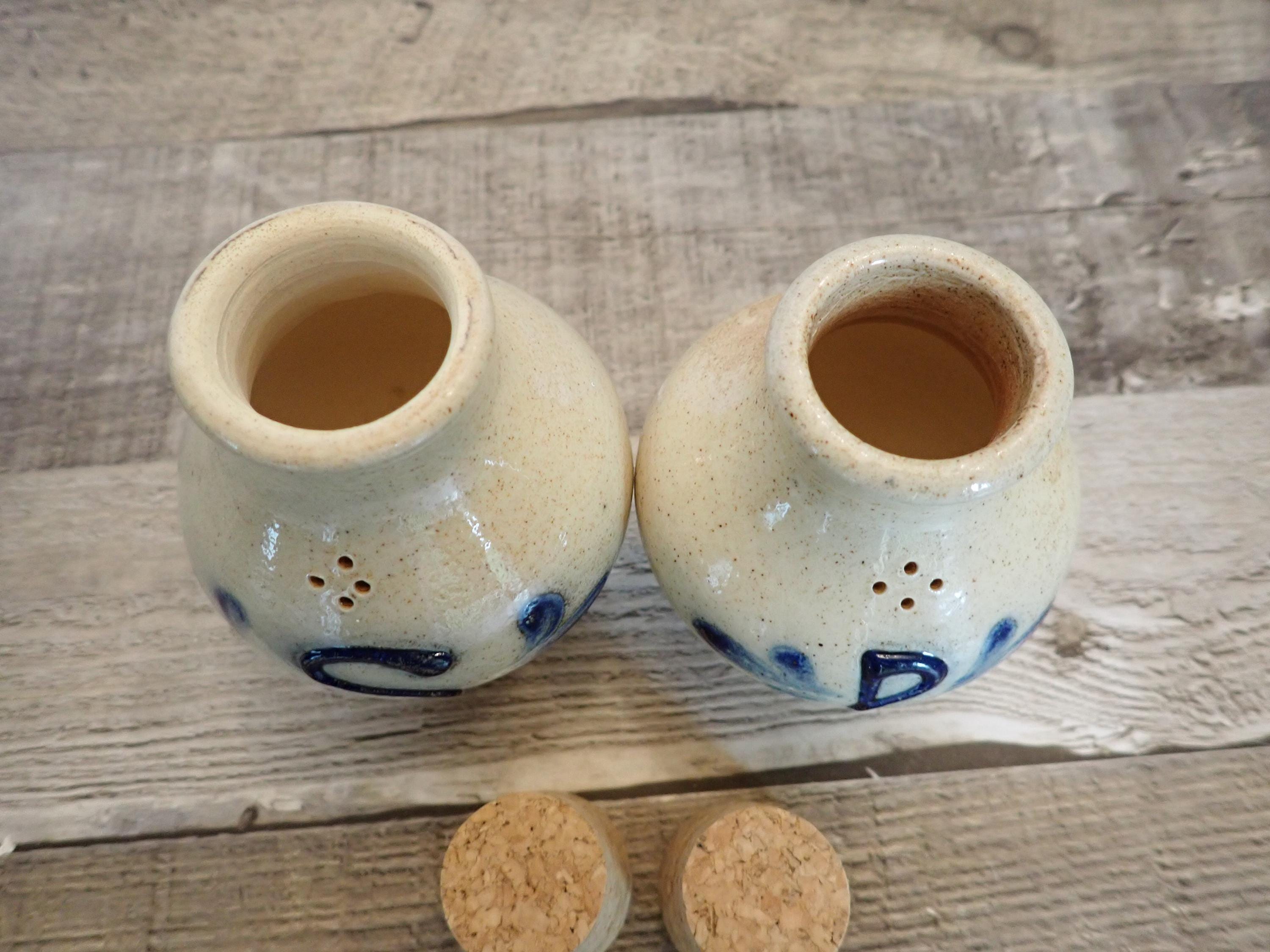 This salt and pepper shaker set by Shadowlawn Pottery includes 2 matching shakers that are 3.75" tall and 3" in diameter. They are a light gray/cream-colored stoneware and are decorated with an S and P on the front of the pieces. There are small cut-out holes on the tops for shaking out the salt or pepper. The side is stamped with the Shadowlawn logo. Both shakers have new replacement cork stoppers. The salt and pepper set is in very good condition with no chips or cracks.