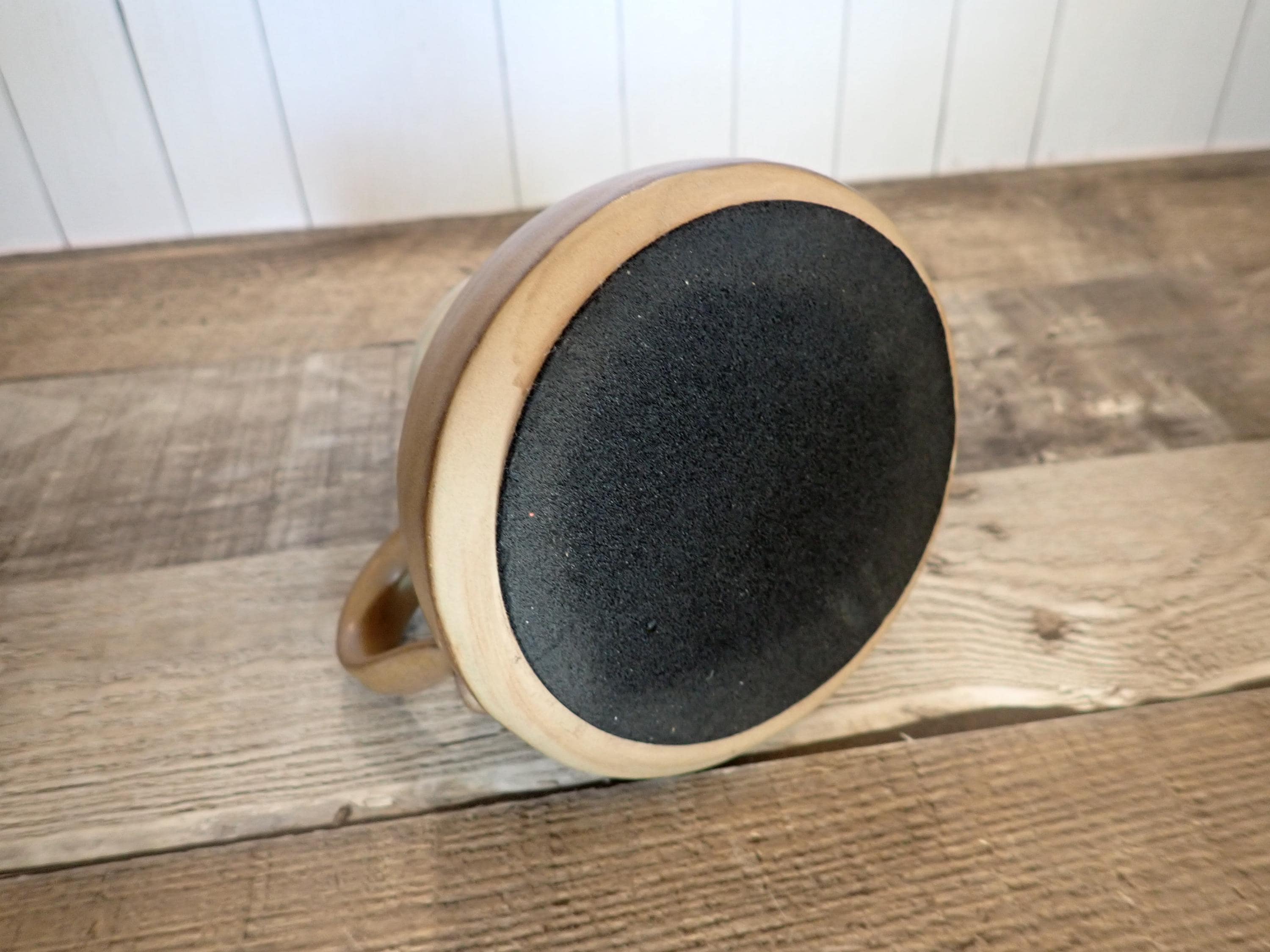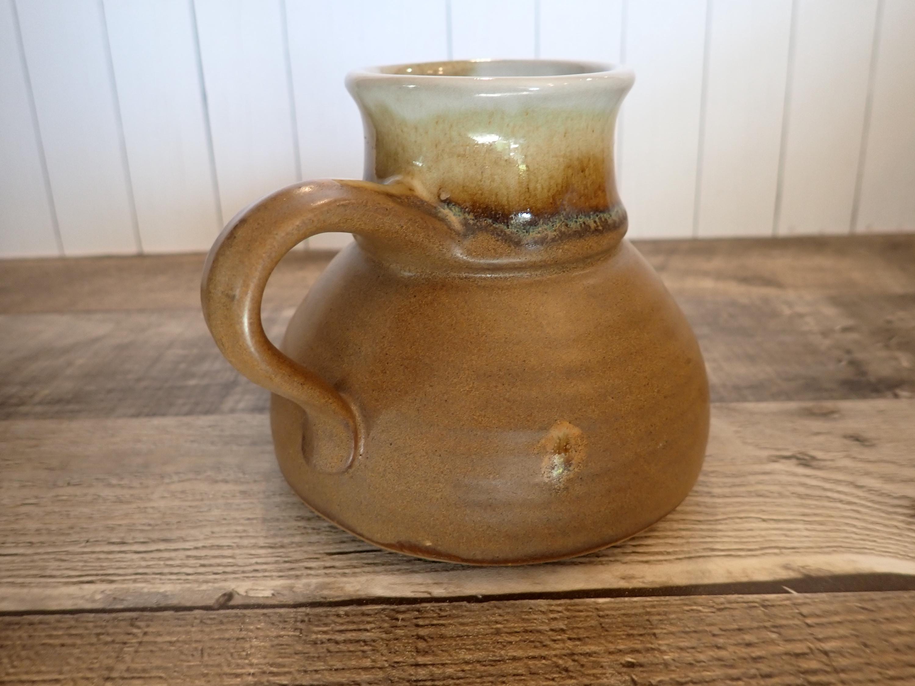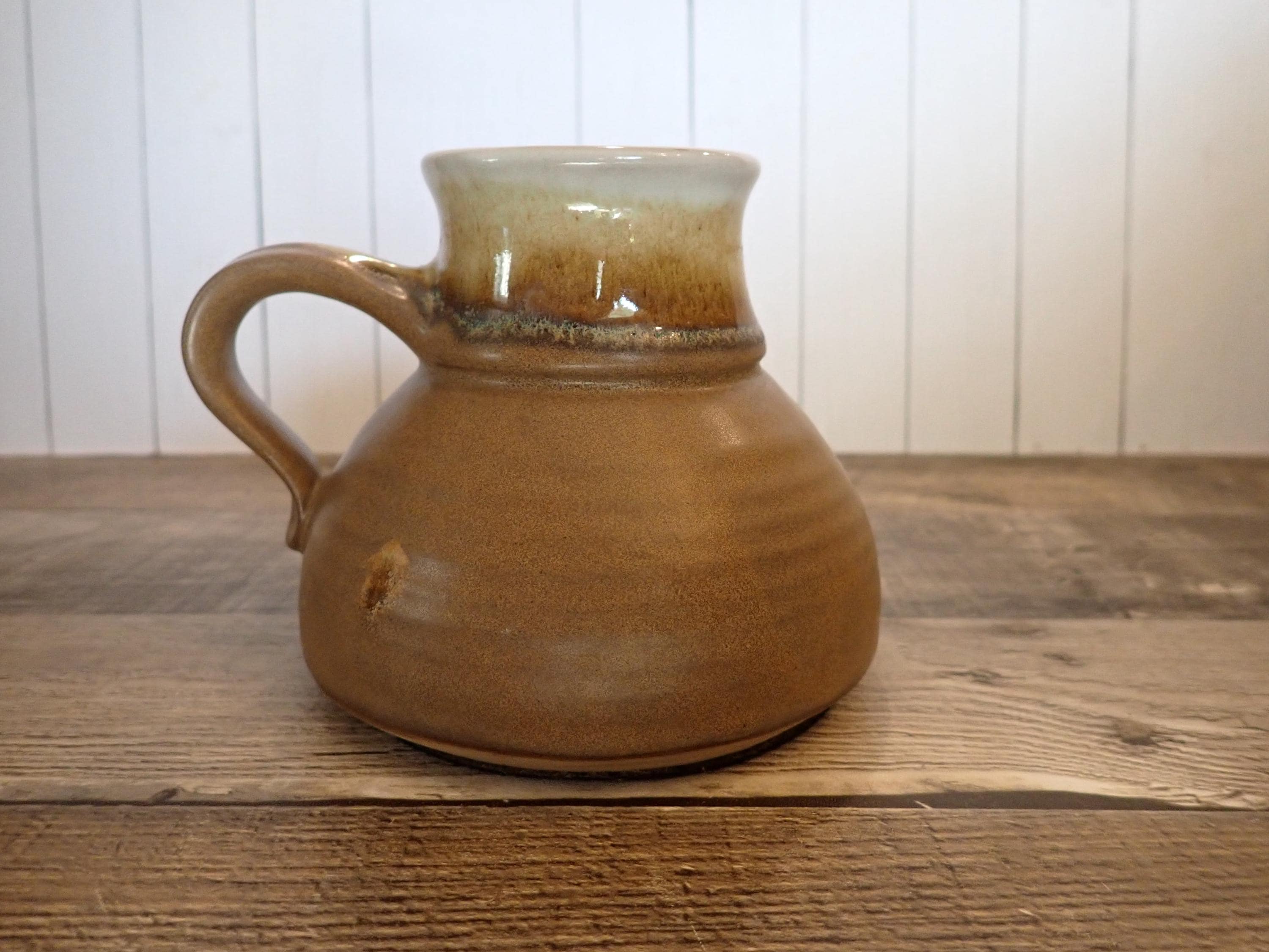 This vintage ceramic travel mug is a stoneware piece with white and tan glazes. It is 4" tall and the base measure 4.5" in diameter. The top opening is 2" in diameter. It is a tan ceramic with a white drip glaze. There is a lightly ribbed or banded texture around the middle. The mug can comfortably hold 12 oz. - filled to the rim it holds 14 oz. The mug is in very good condition with no chips or cracks. There is a rubberized grippy piece on the bottom of the mug.
