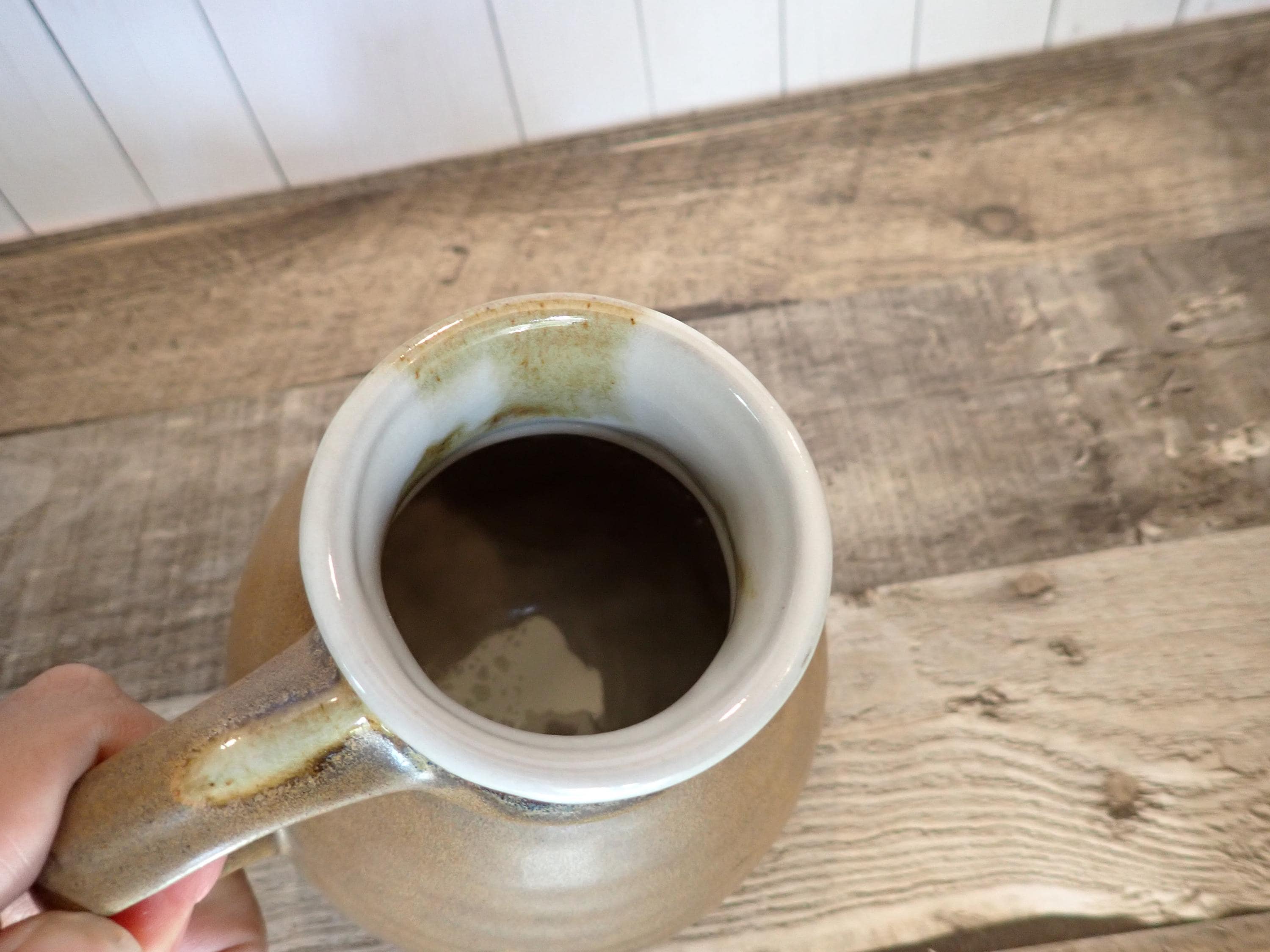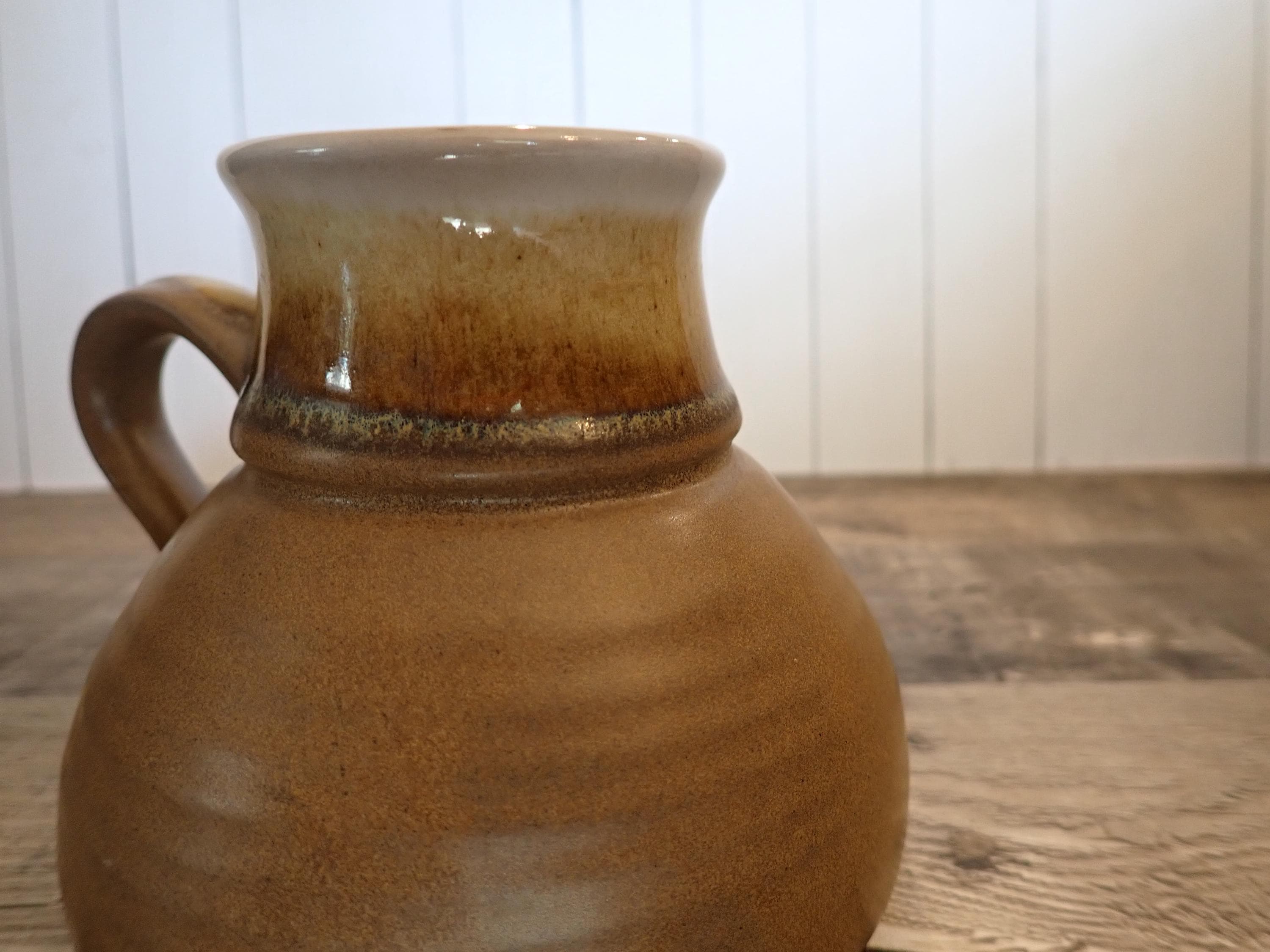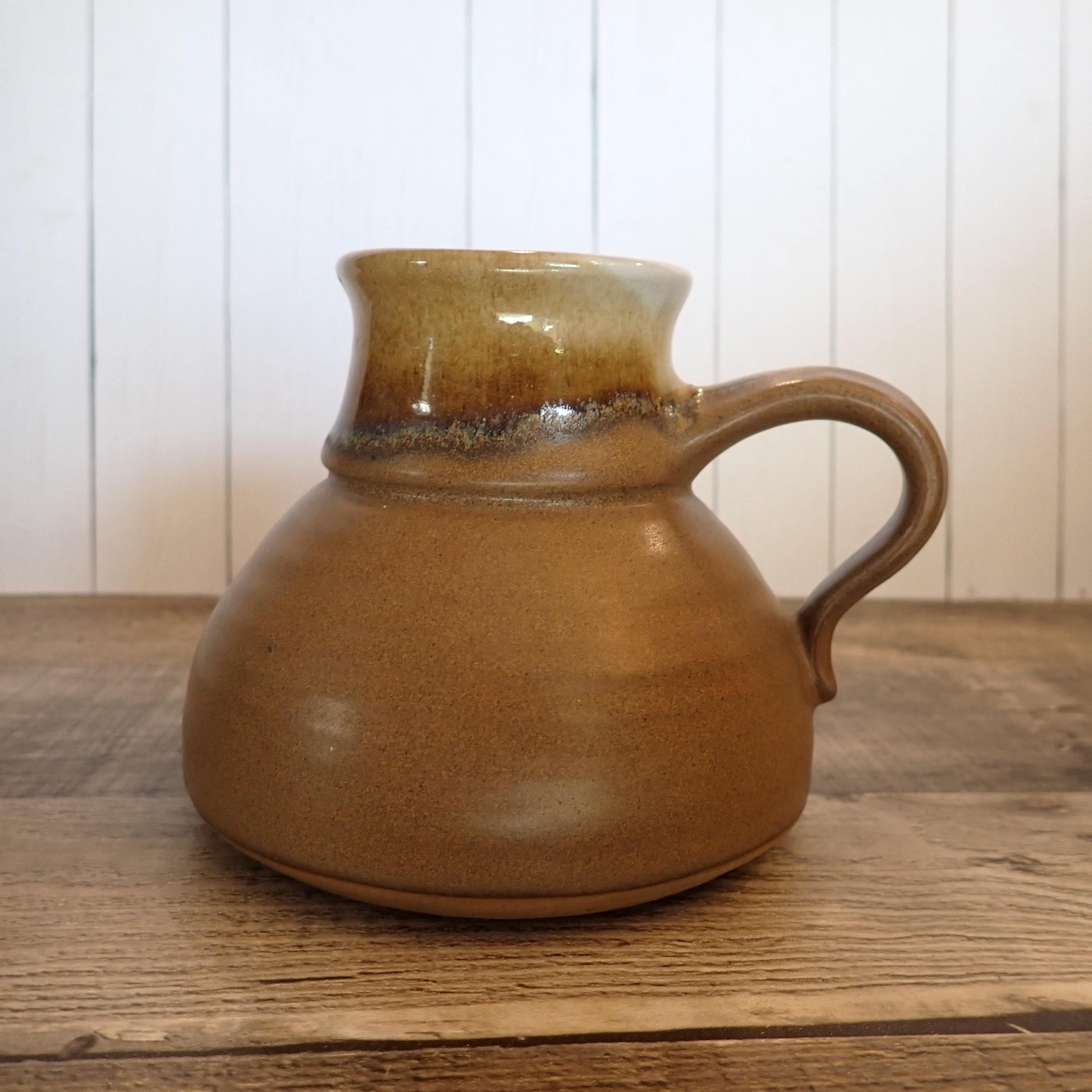 This vintage ceramic travel mug is a stoneware piece with white and tan glazes. It is 4" tall and the base measure 4.5" in diameter. The top opening is 2" in diameter. It is a tan ceramic with a white drip glaze. There is a lightly ribbed or banded texture around the middle. The mug can comfortably hold 12 oz. - filled to the rim it holds 14 oz. The mug is in very good condition with no chips or cracks. There is a rubberized grippy piece on the bottom of the mug.