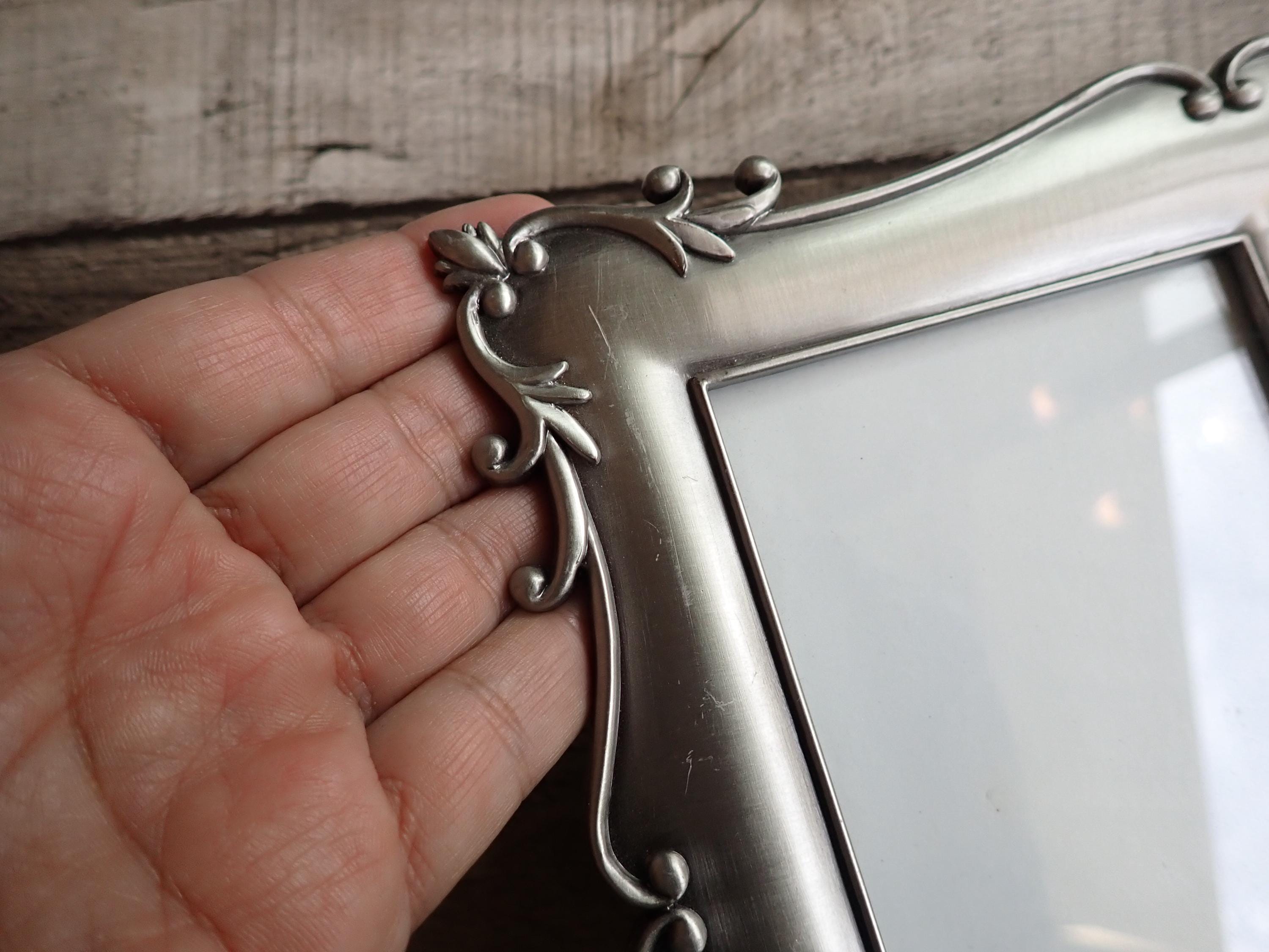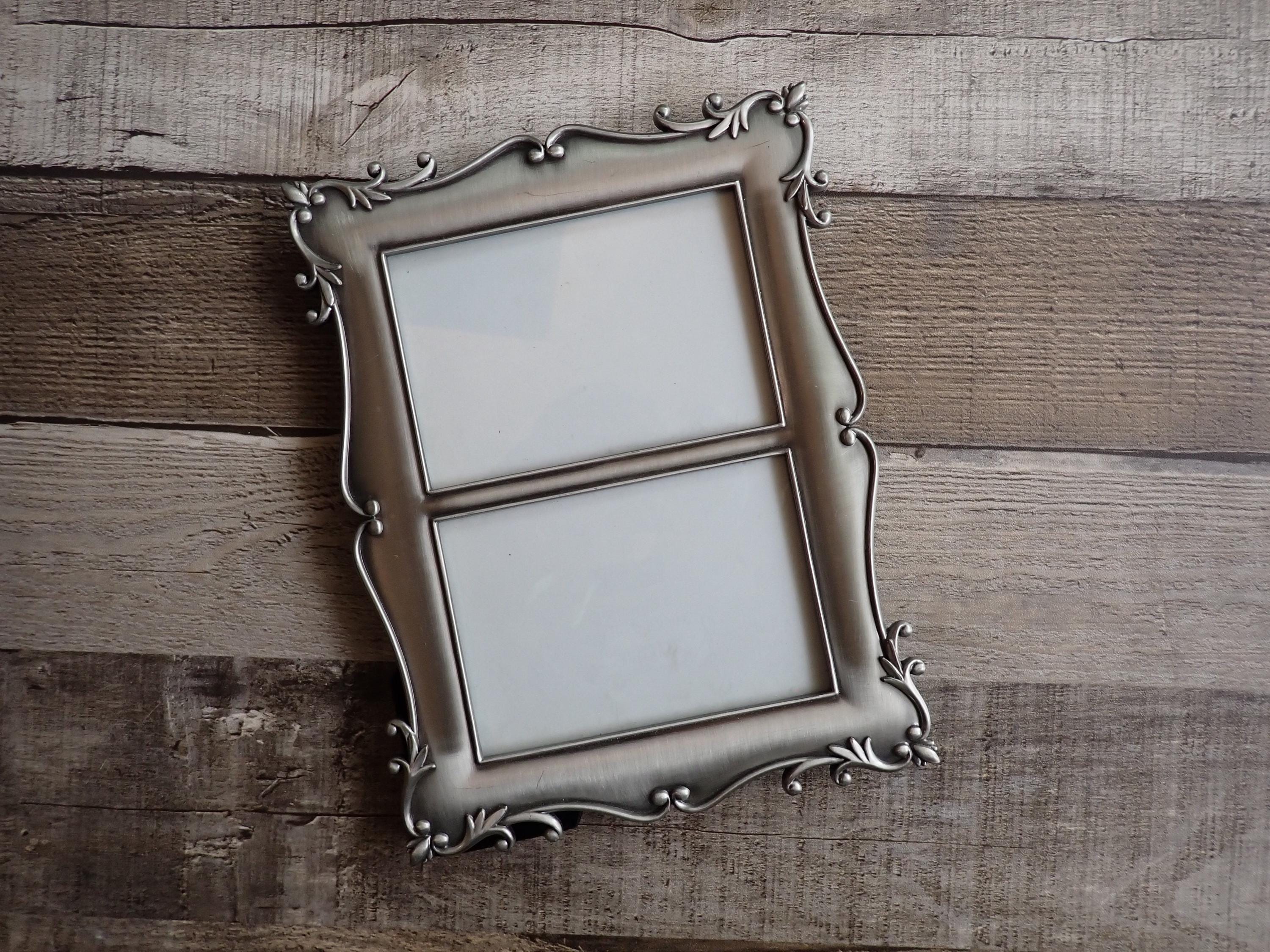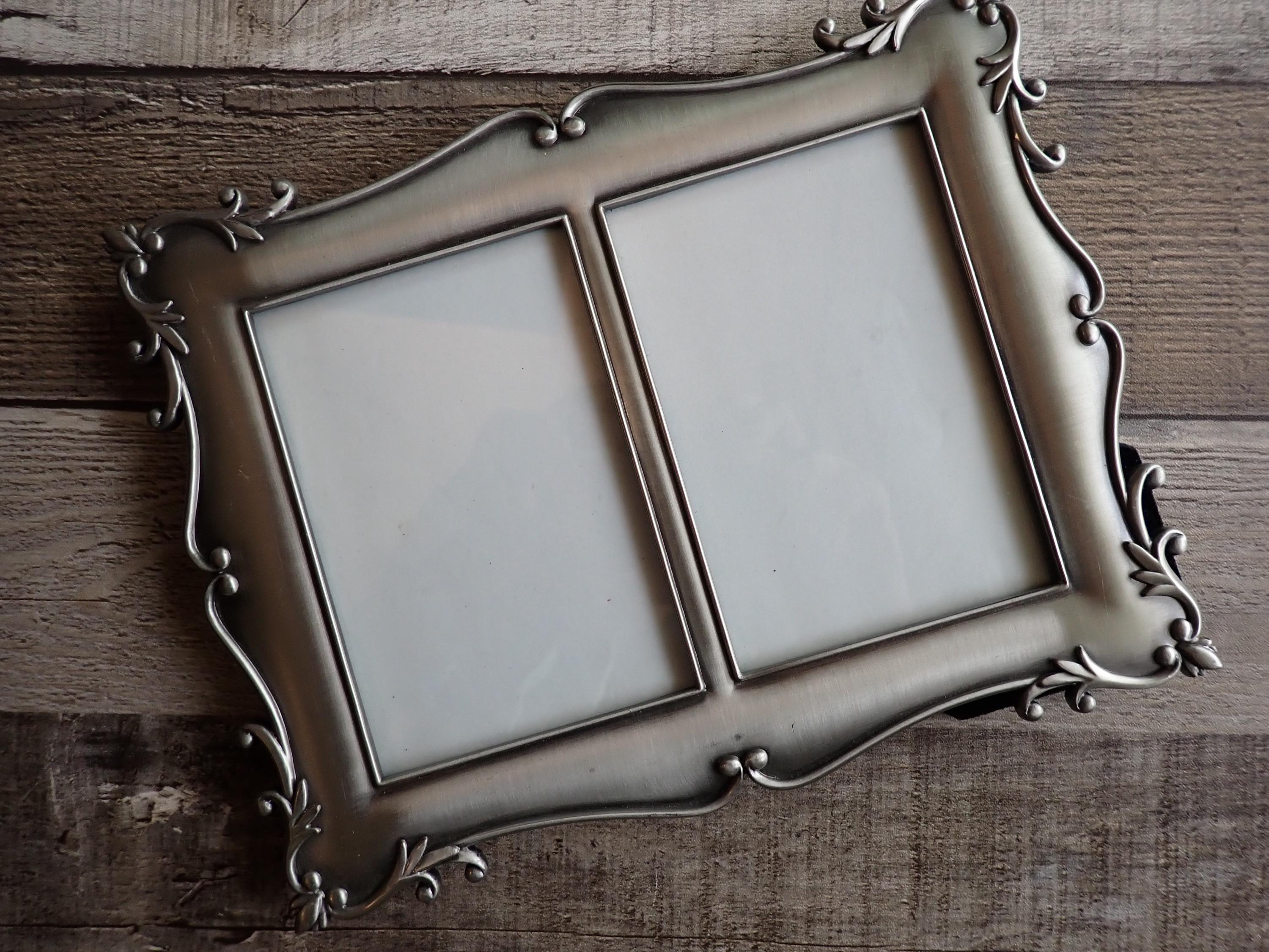 This silver metal photo frame is 7" tall by 9" wide and can hold two 3x5 photos vertically or horizontally. The frame is a silver metal and has a scroll design with small leaf accents on the corners. The frame has a clear glass insert over the photo opening, and a cardboard backing piece with a photo stand. The frame is in very good condition, however there are some light scratches here and there.
