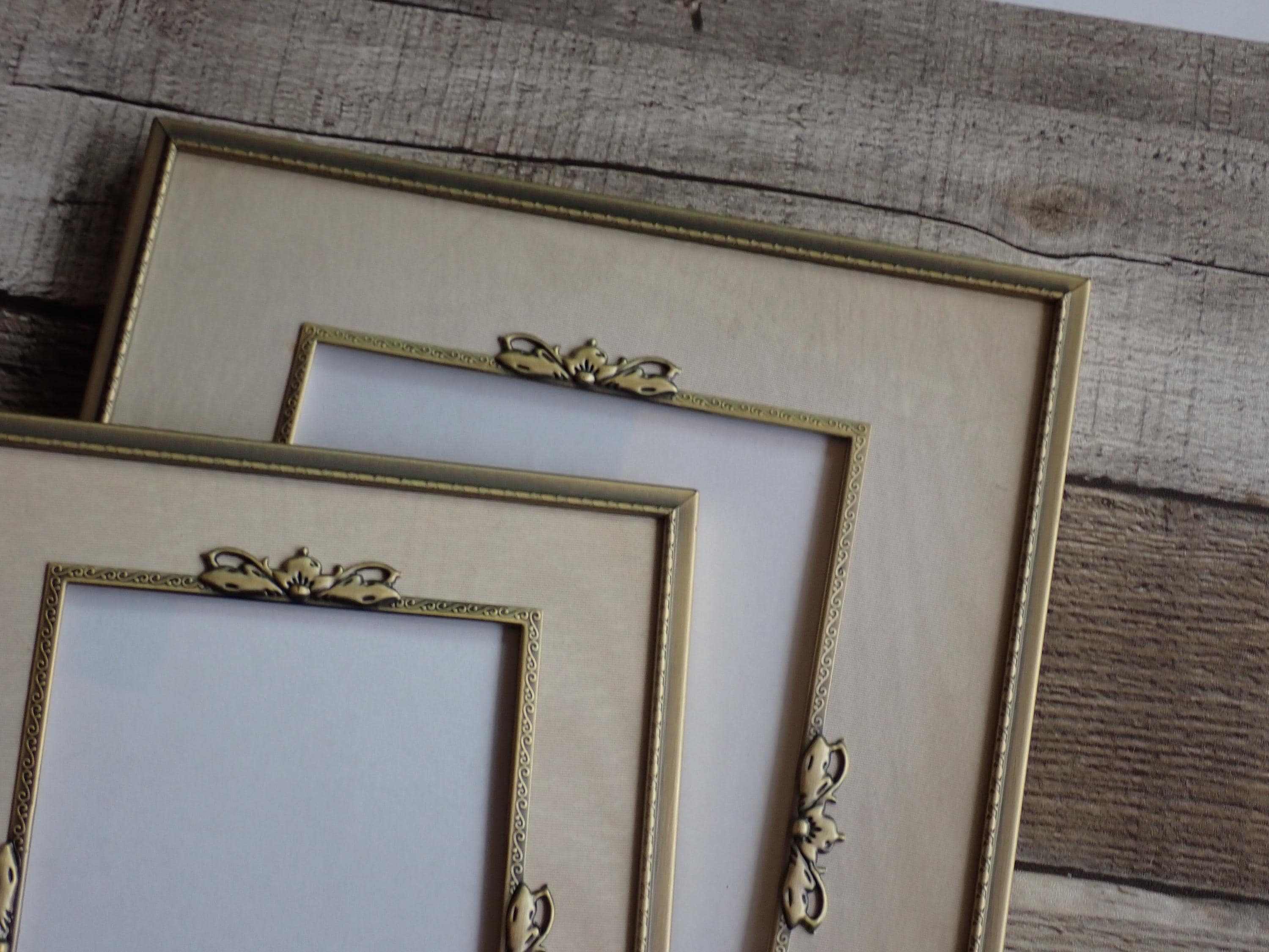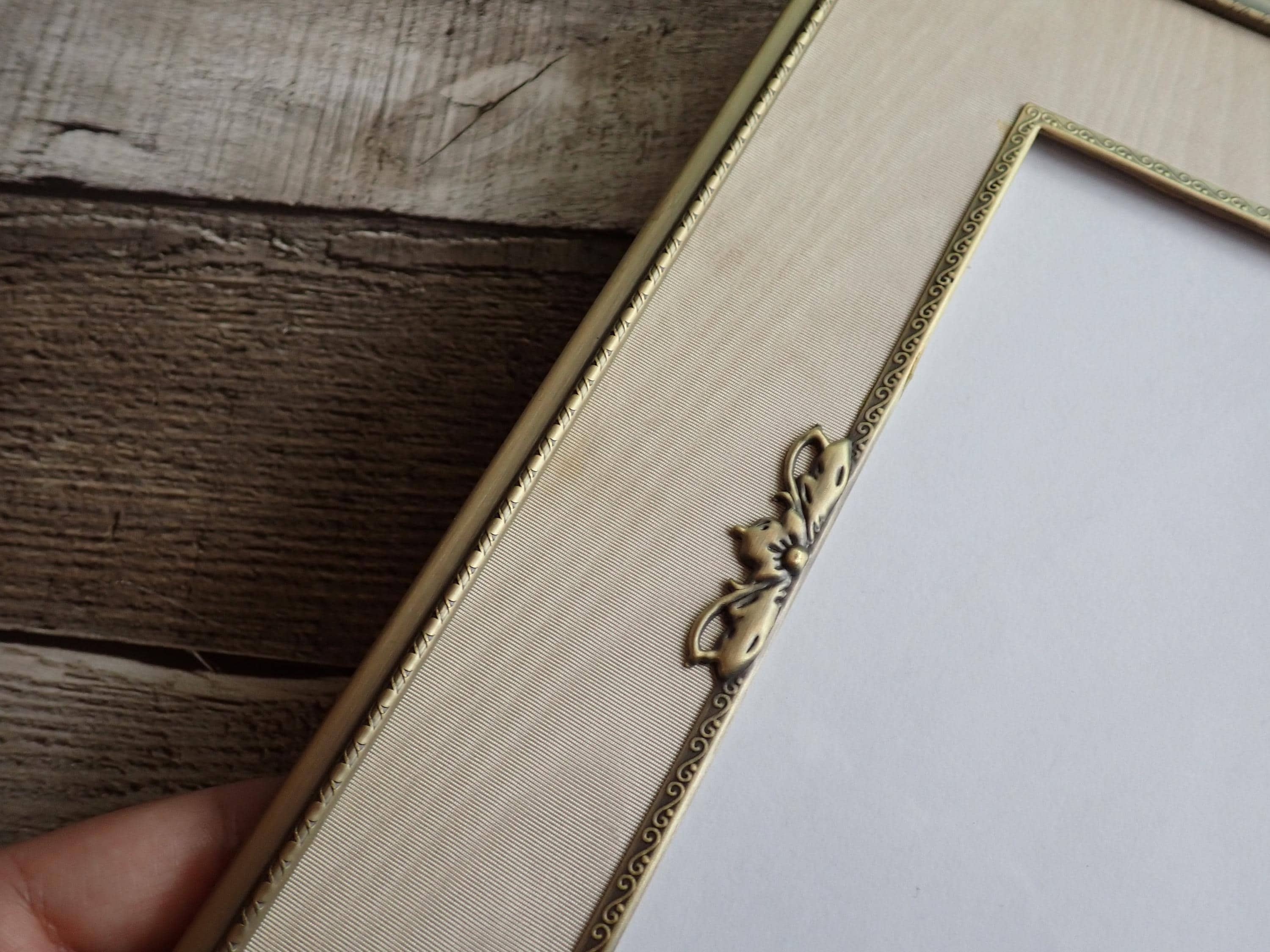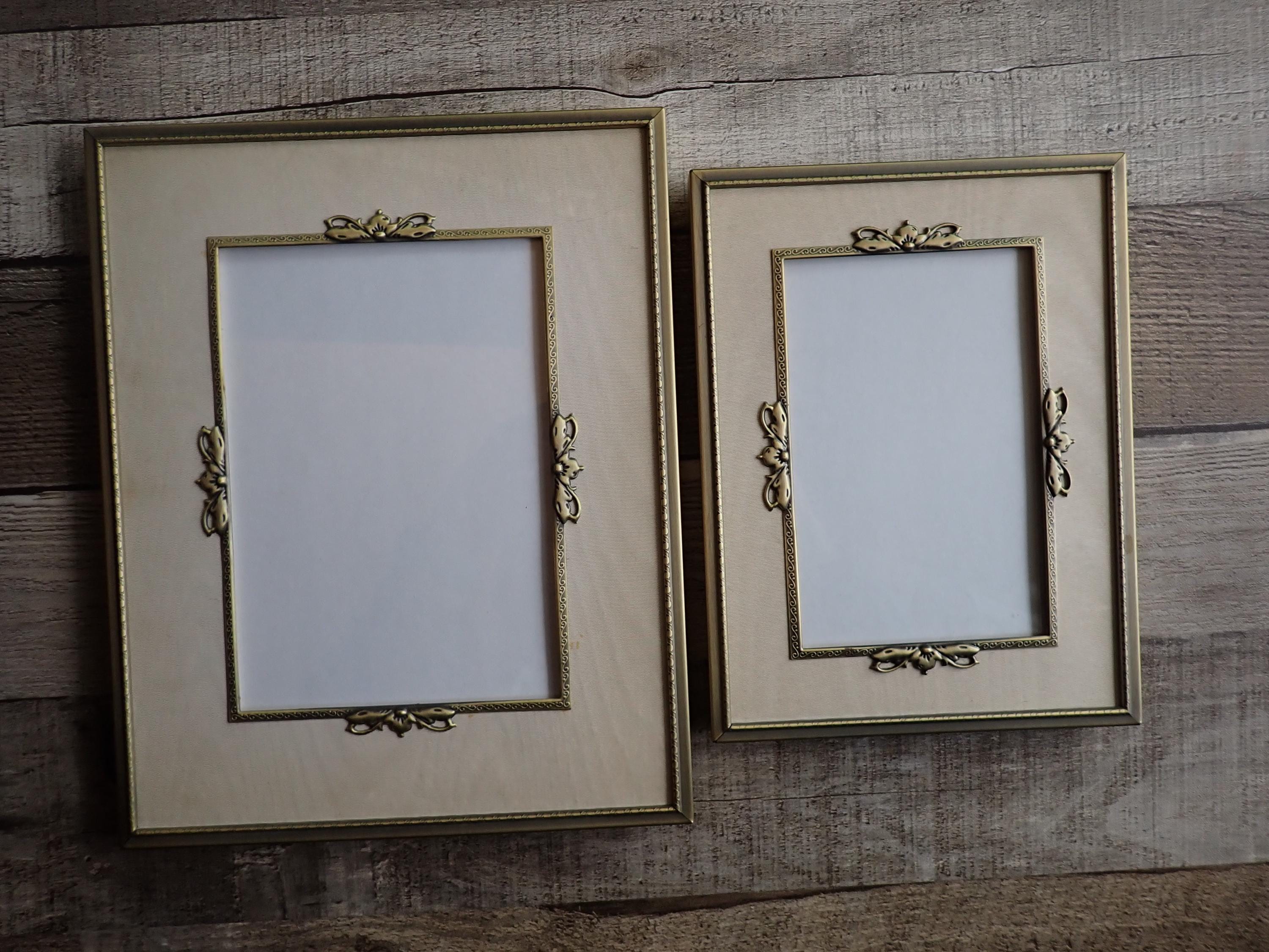 This set of 2 frames includes one 5x7 and one 8x10 frame in similar designs. The frames are a gold-colored metal a cream-colored cloth mat with gold flower accents. The photo openings are 4x6 and 5x7 due to the cloth mat. Both frames are in very nice condition and have a piece of clear glass to cover the photo opening and a cardboard backing piece with photo stand. These frames can only stand horizontally due to the photo stand on the backs. There is one small area of light discoloration on the larger frame - this is shown in detail in the last photo.