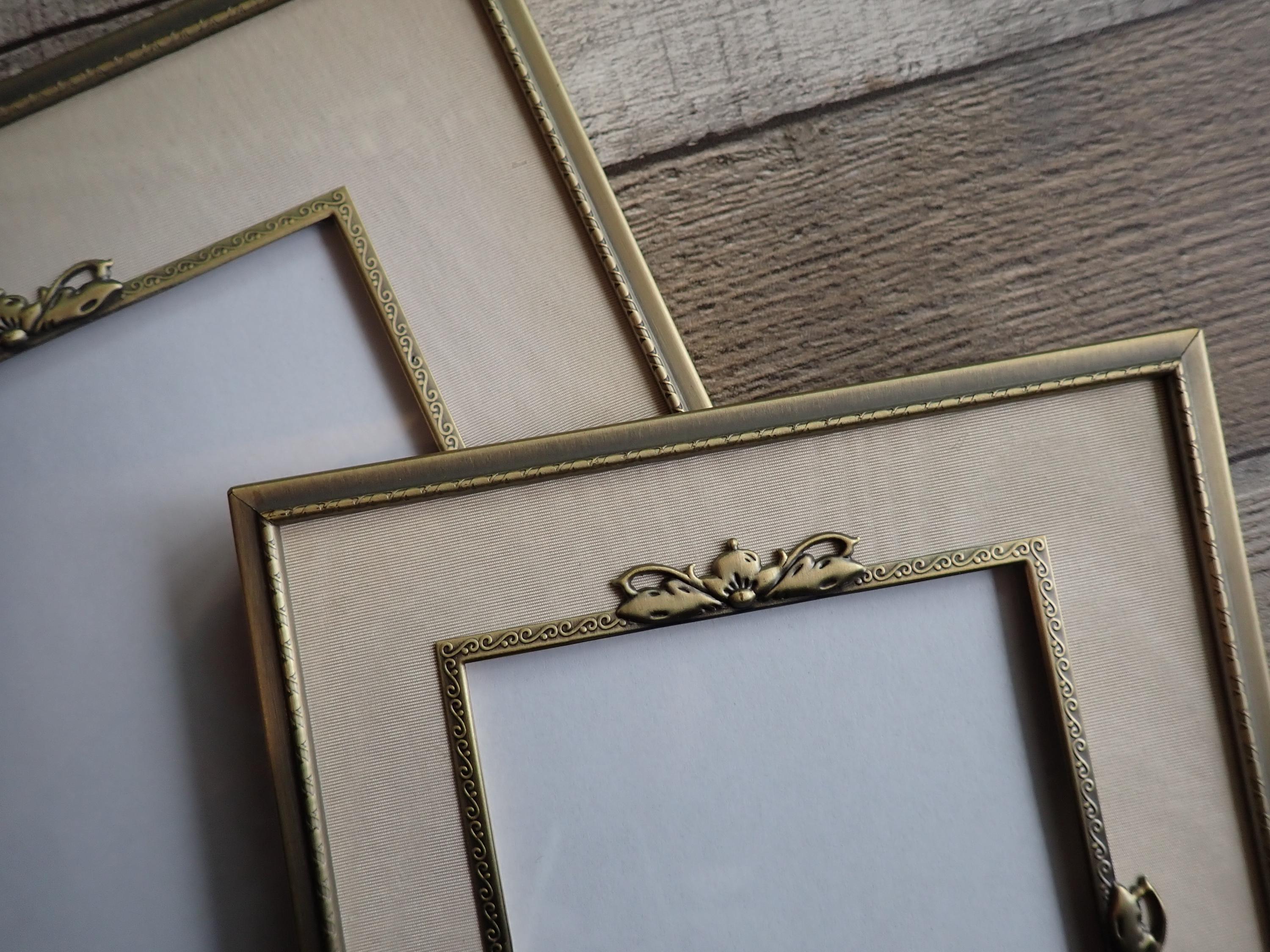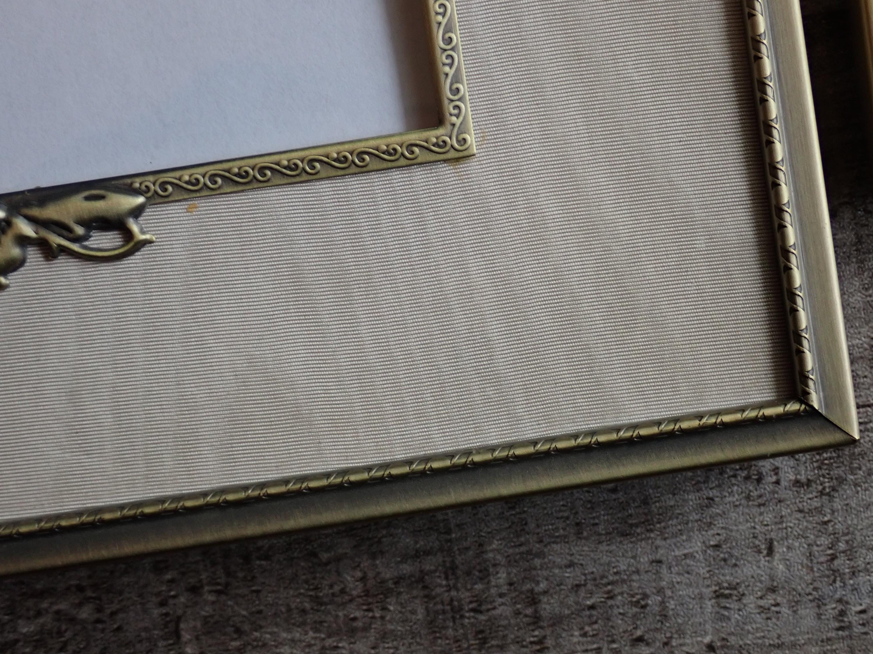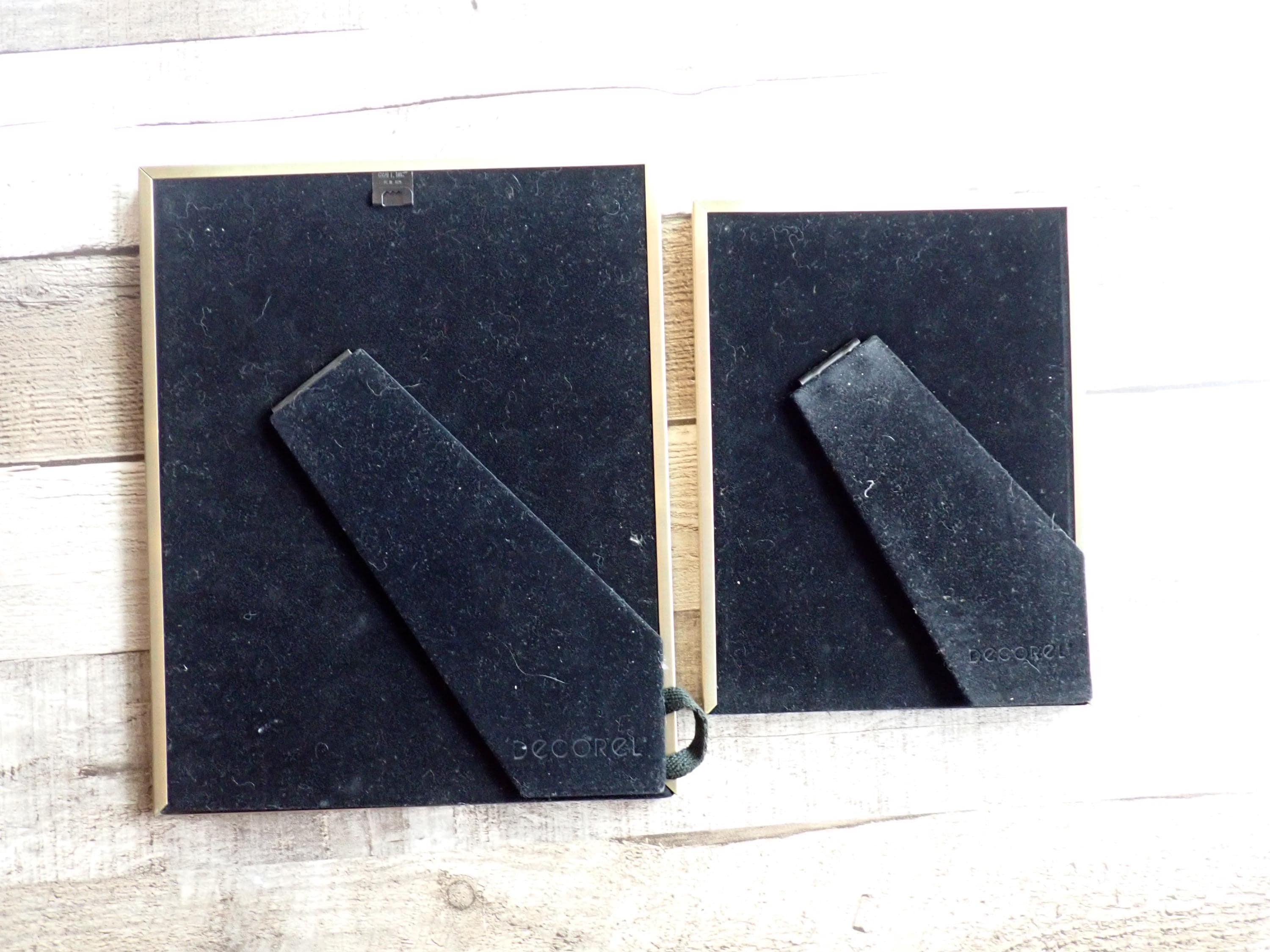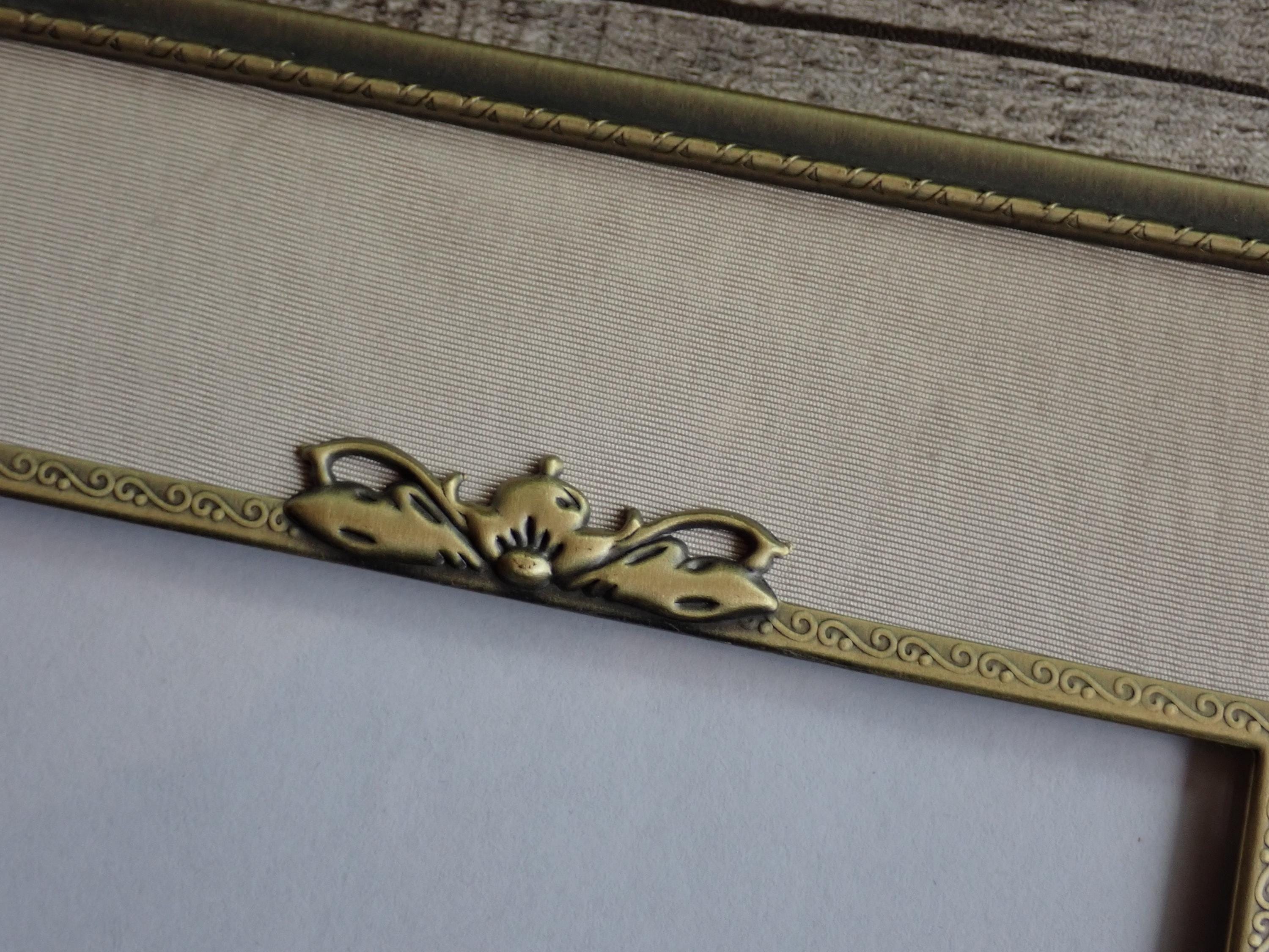 This set of 2 frames includes one 5x7 and one 8x10 frame in similar designs. The frames are a gold-colored metal a cream-colored cloth mat with gold flower accents. The photo openings are 4x6 and 5x7 due to the cloth mat. Both frames are in very nice condition and have a piece of clear glass to cover the photo opening and a cardboard backing piece with photo stand. These frames can only stand horizontally due to the photo stand on the backs. There is one small area of light discoloration on the larger frame - this is shown in detail in the last photo.
