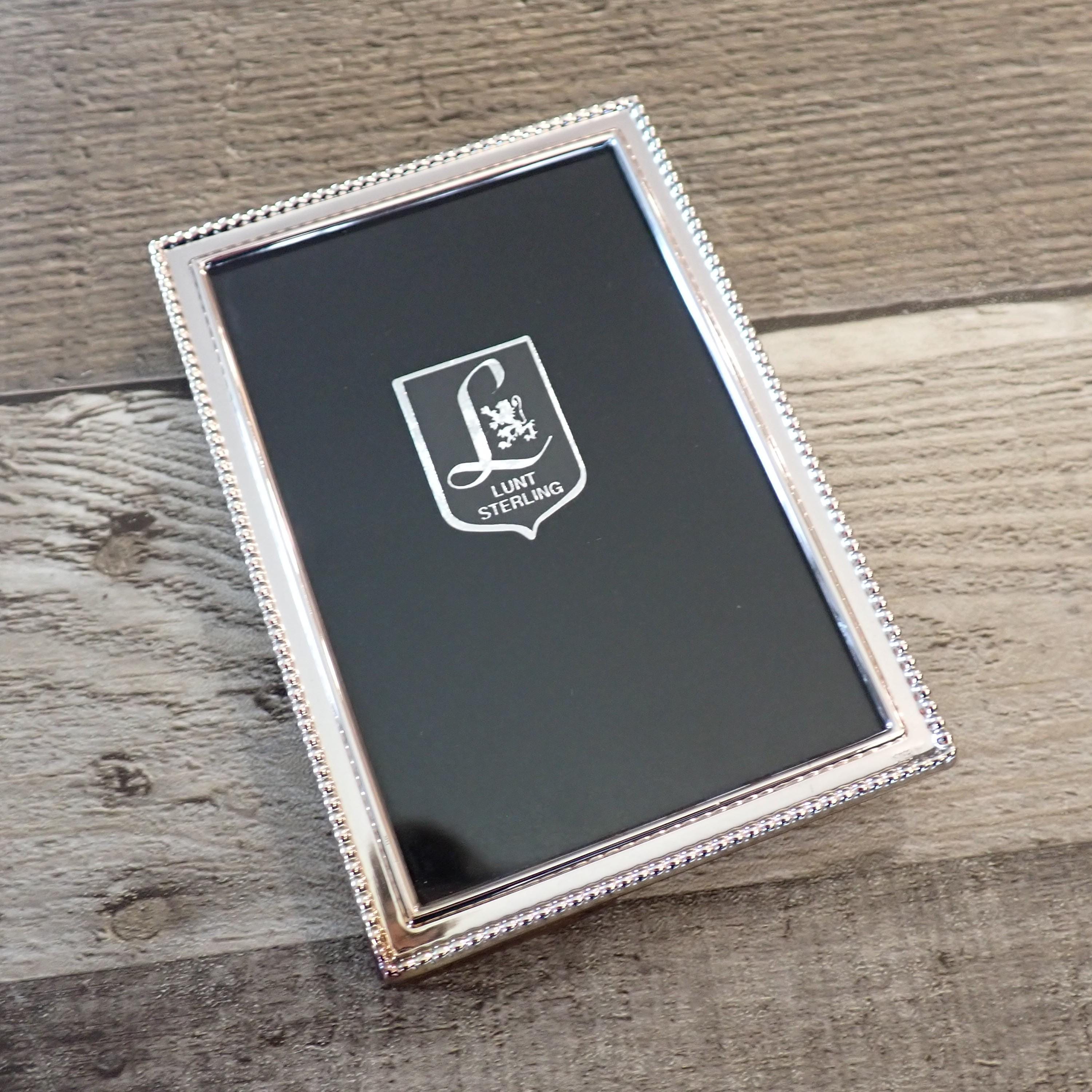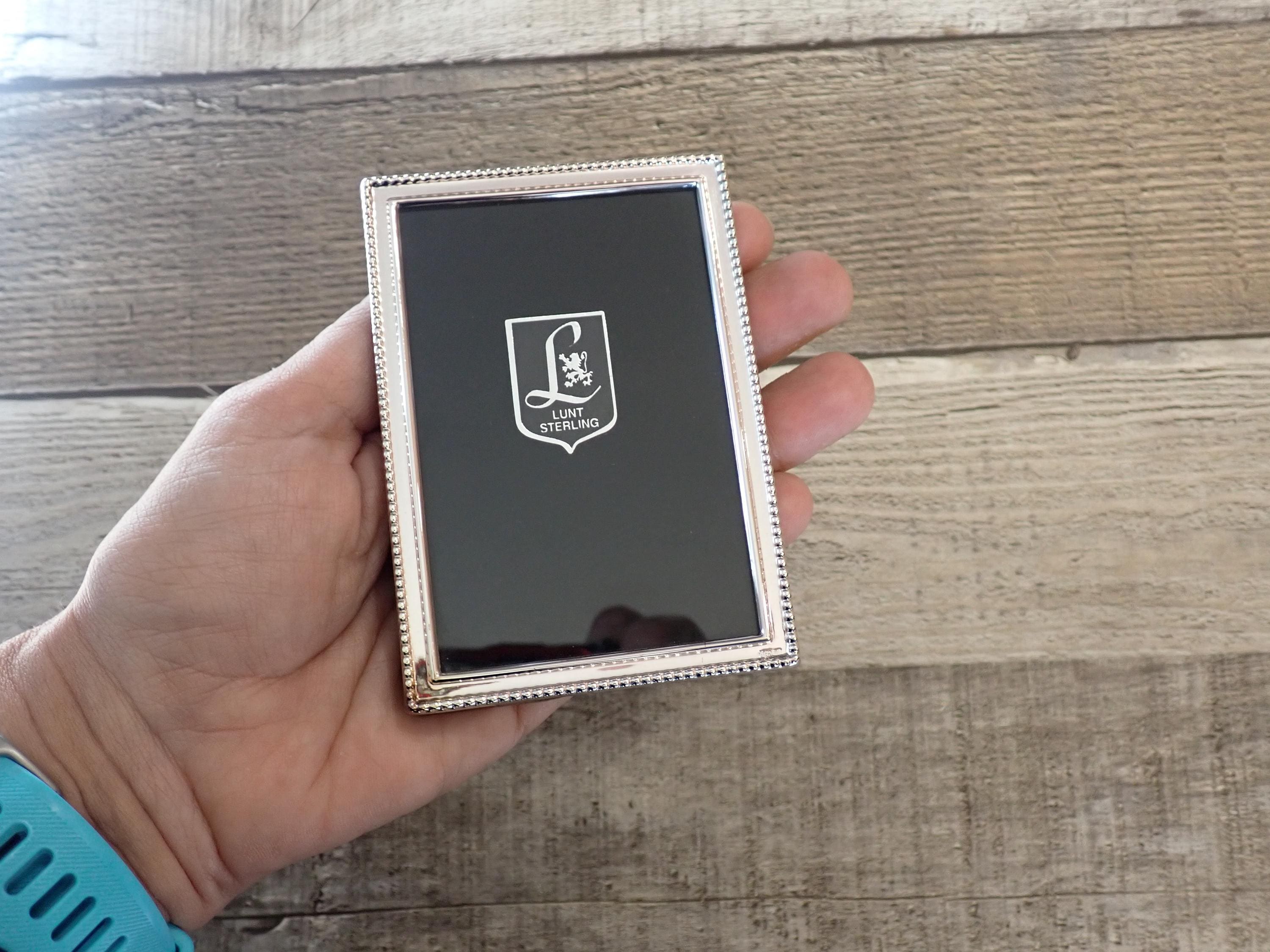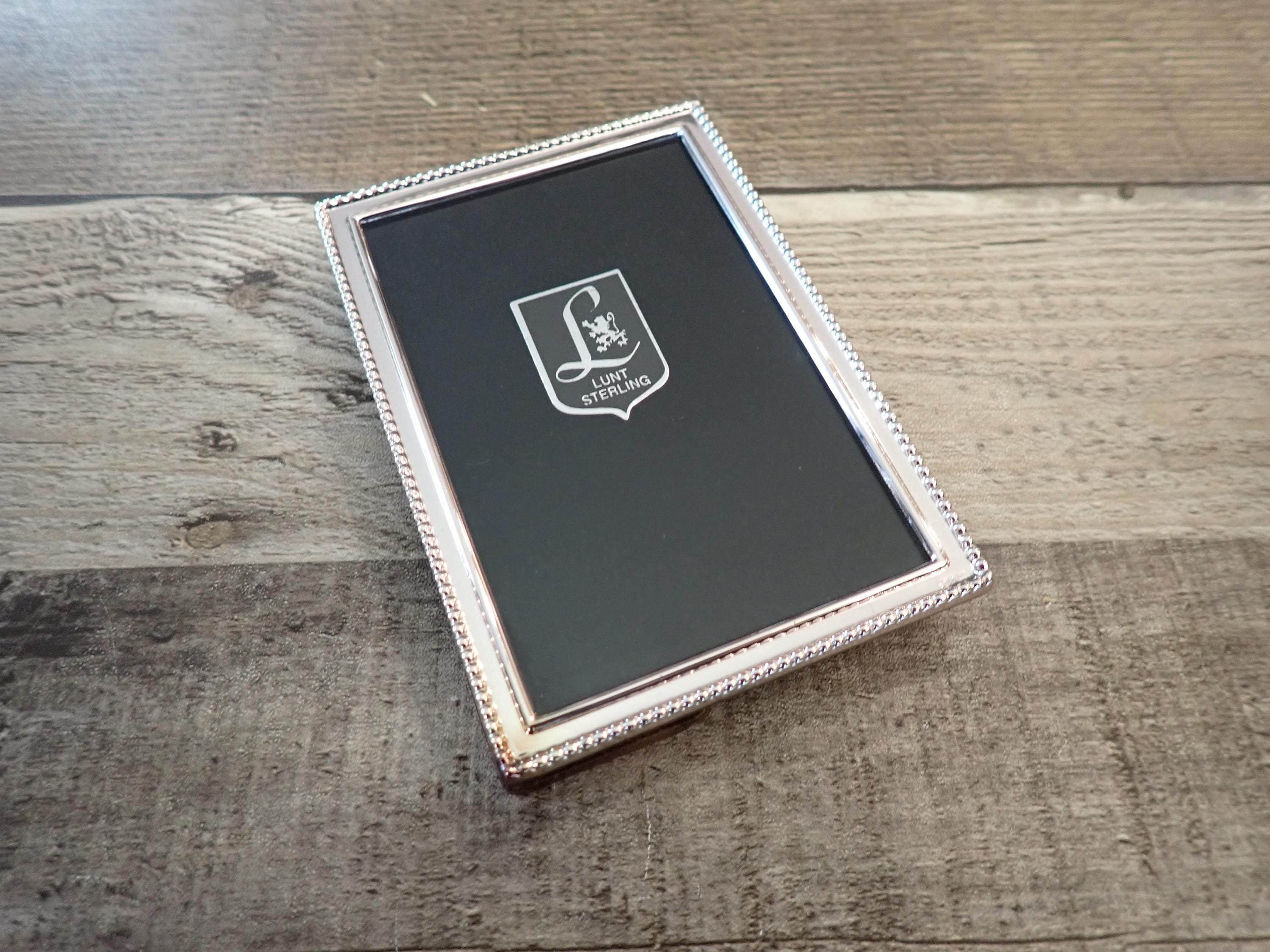 This small Lunt frame is 2.75" wide and 4" tall and can hold one 2.5" x 3.5" photo. The frame has a simple and elegant design with a beaded edge. The frame includes a piece of glass over the photo opening and a wooden backing piece with photo stand. The frame can stand horizontally or vertically. The frame is in very good condition with no damage or tarnish.