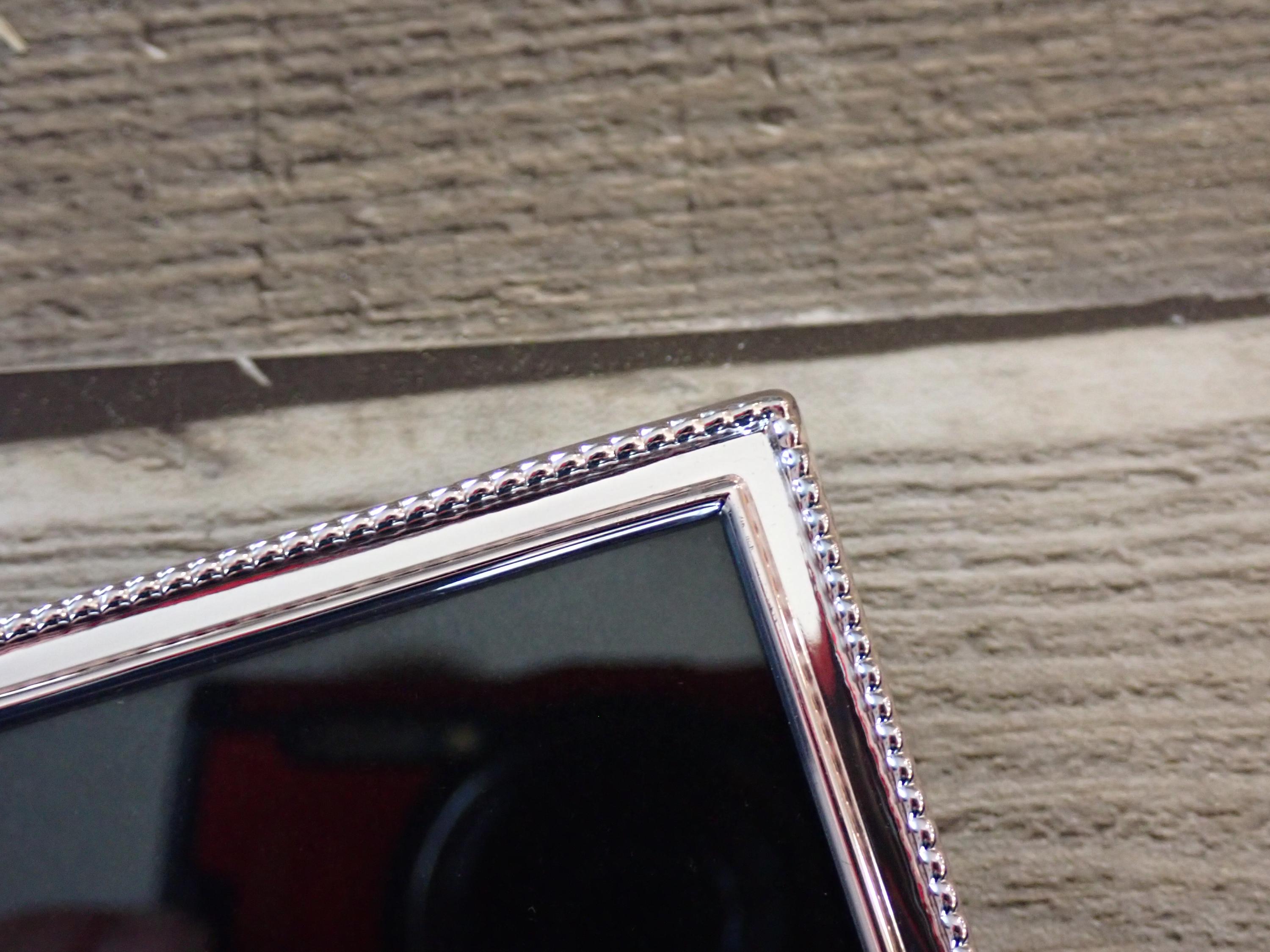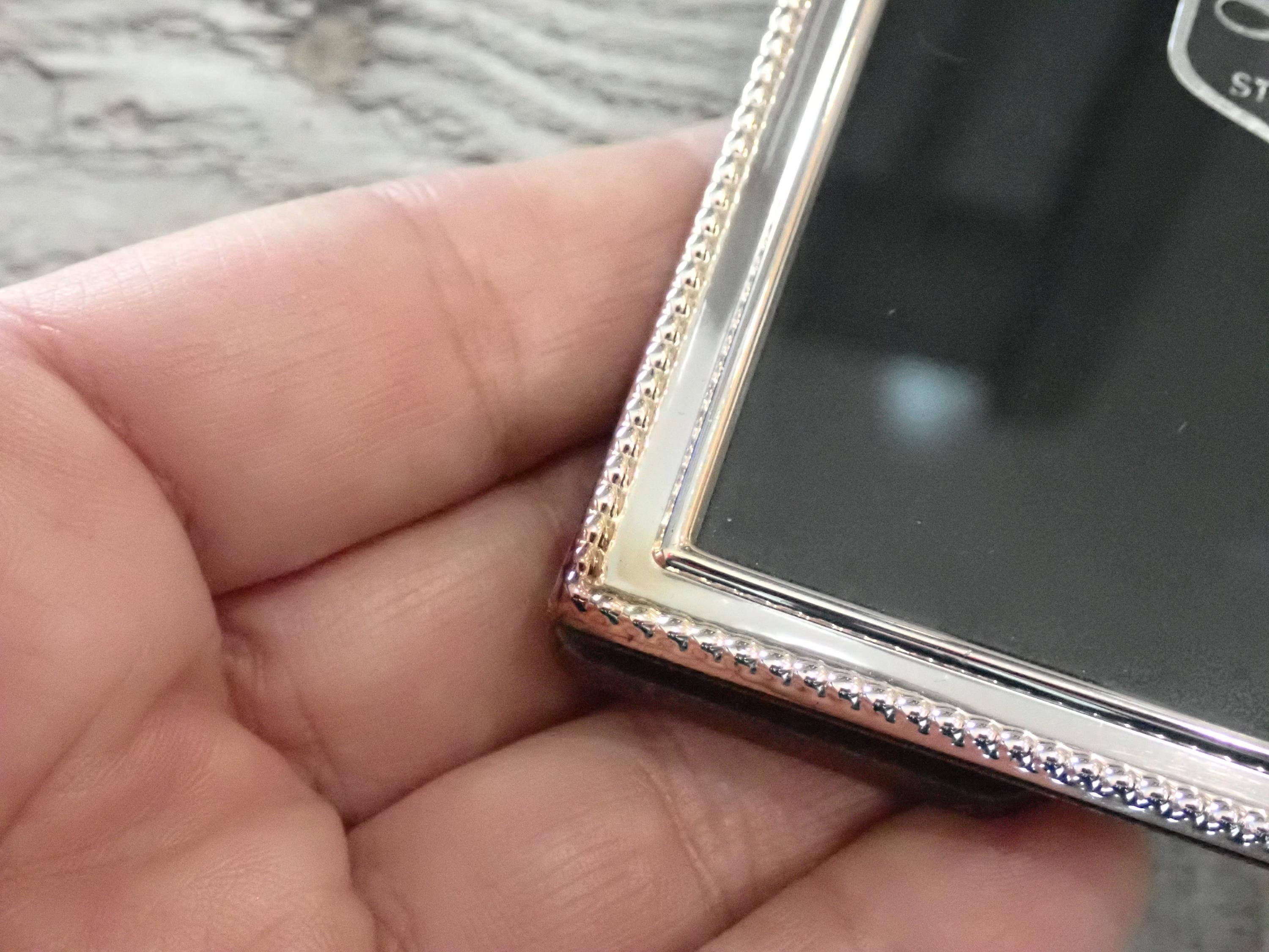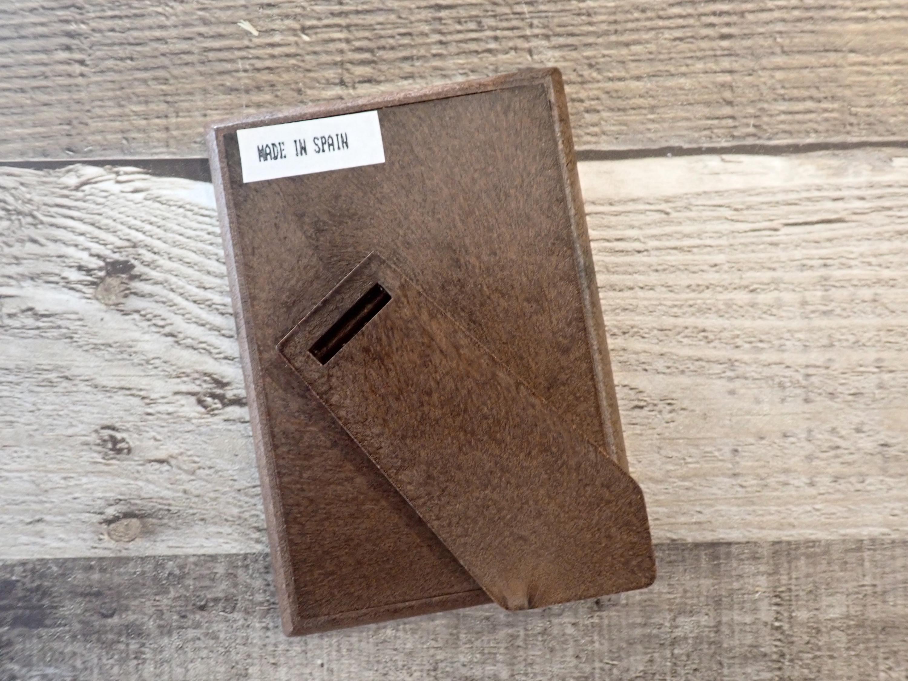 This small Lunt frame is 2.75" wide and 4" tall and can hold one 2.5" x 3.5" photo. The frame has a simple and elegant design with a beaded edge. The frame includes a piece of glass over the photo opening and a wooden backing piece with photo stand. The frame can stand horizontally or vertically. The frame is in very good condition with no damage or tarnish.