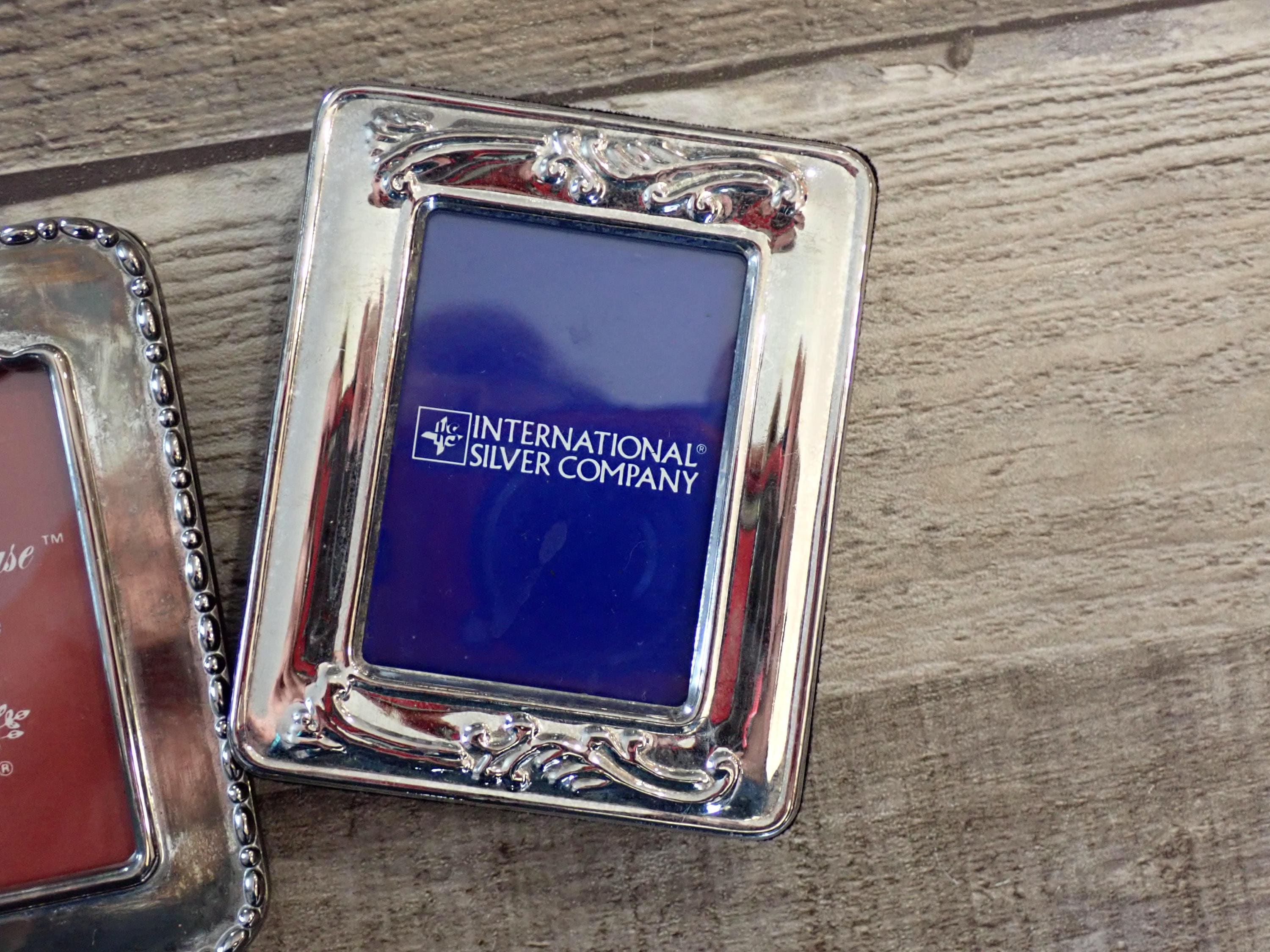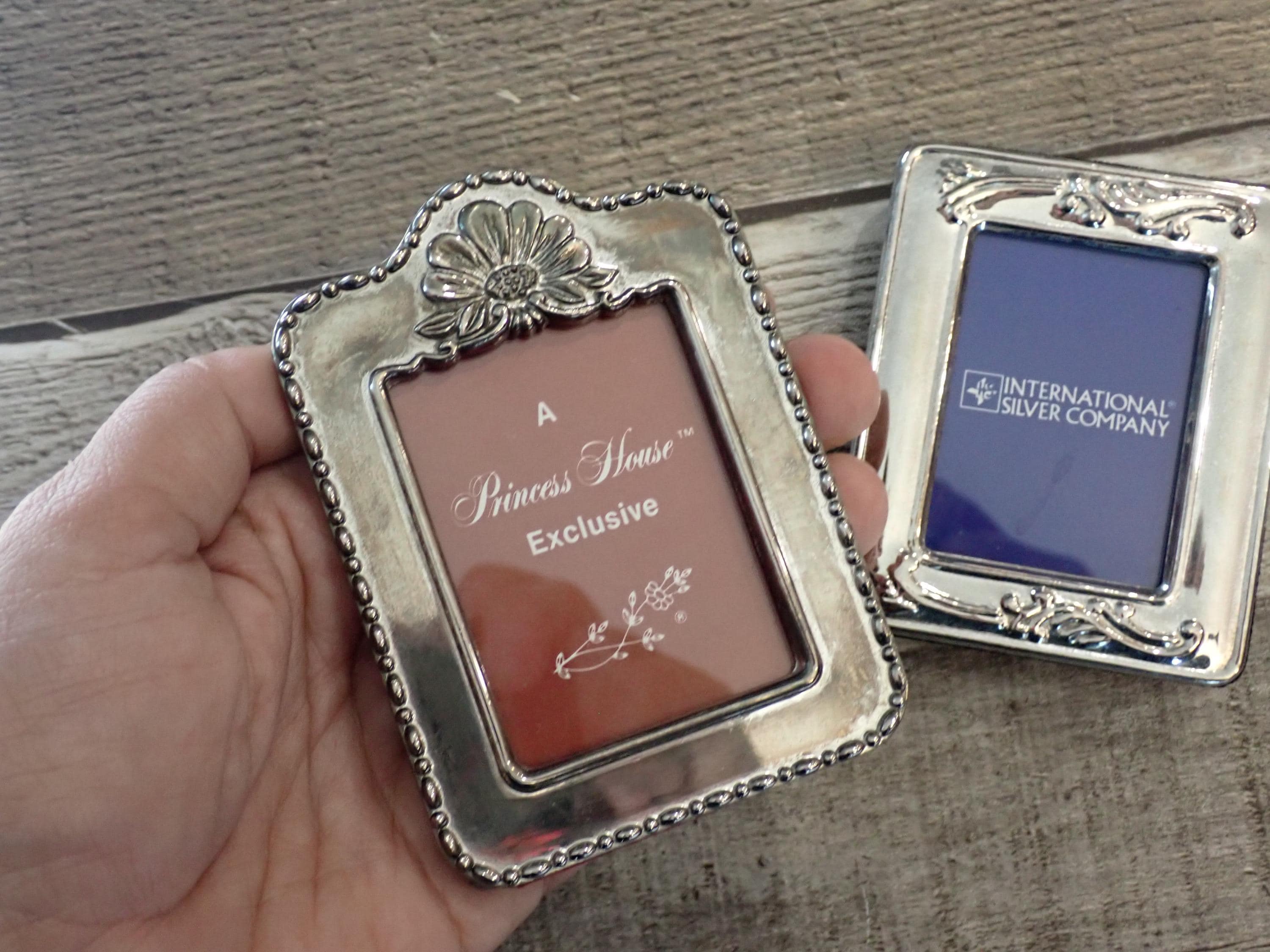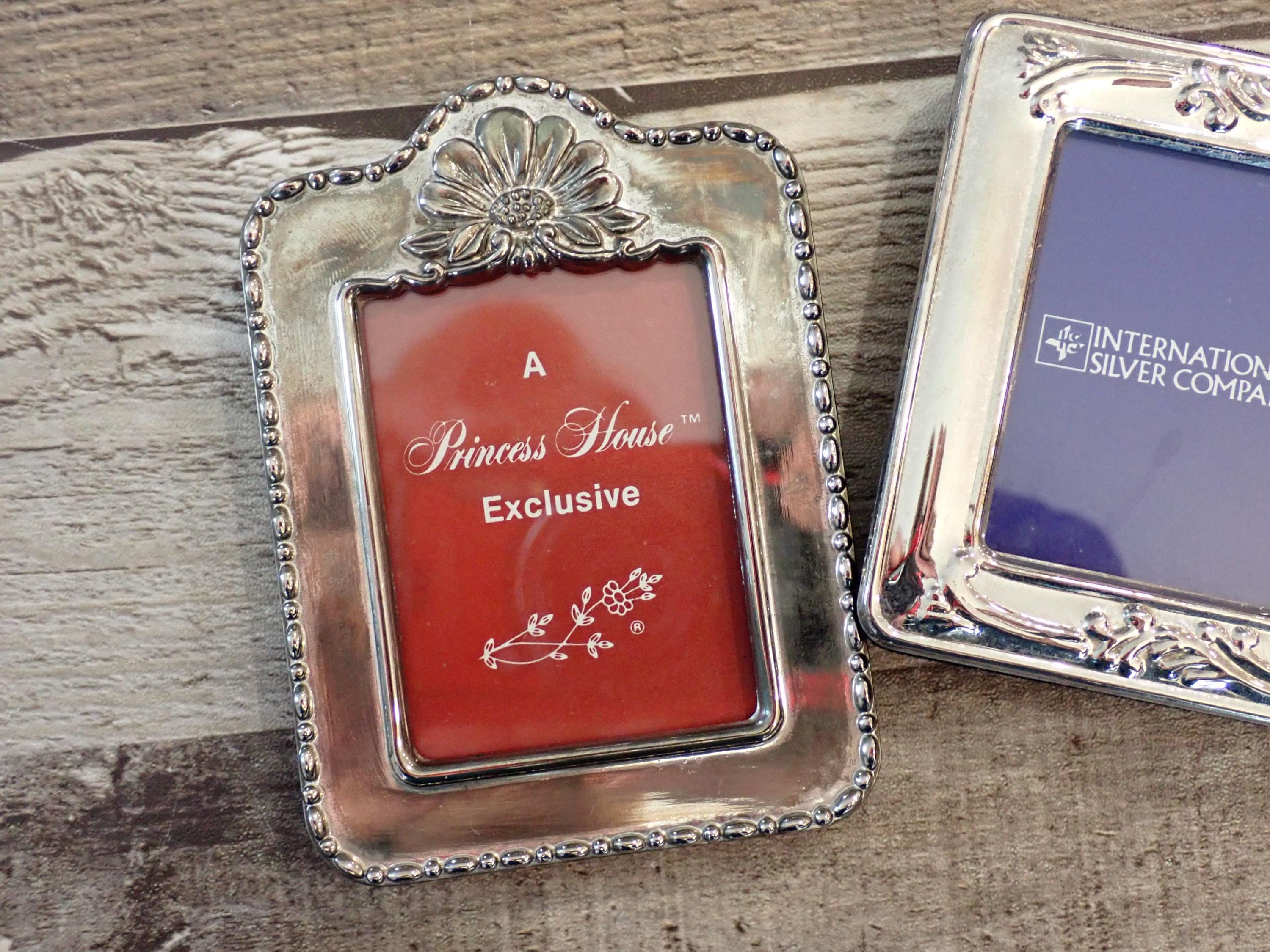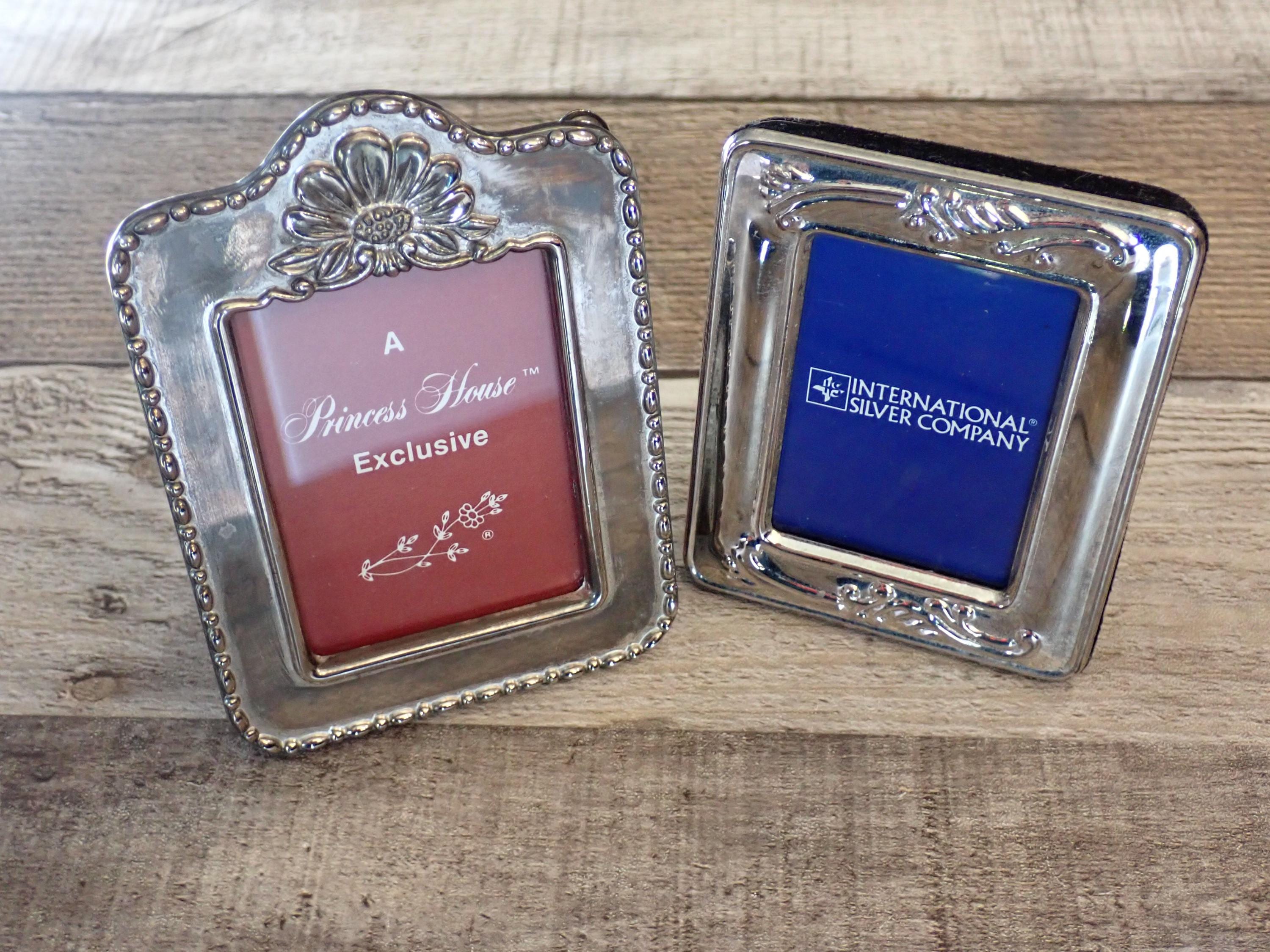 This set of frames includes 2 small coordinating silver metal photo frames. These silver frames have a simple and elegant lightly etched and raised designs. One frame is by Princess House and the other is International Silver company. The photo openings are 2"x3" and 2" x 1.75". They all include the glass and a cardboard backing piece with photo stand. The frames can stand only vertically. Both frames are in very good condition - there is some light tarnish on the Princess House frame. Very pretty set of vintage silver 2x3 photo frames!