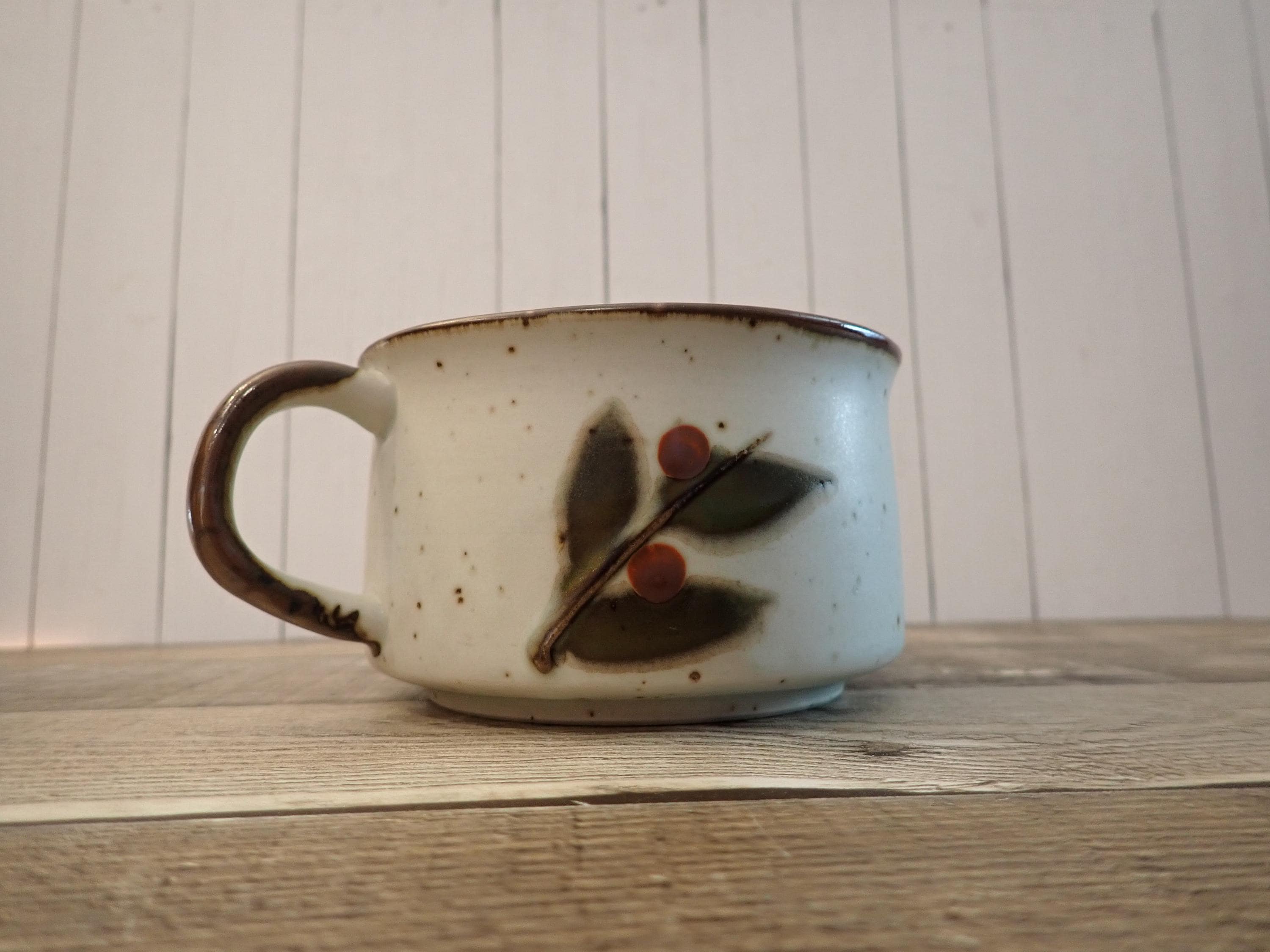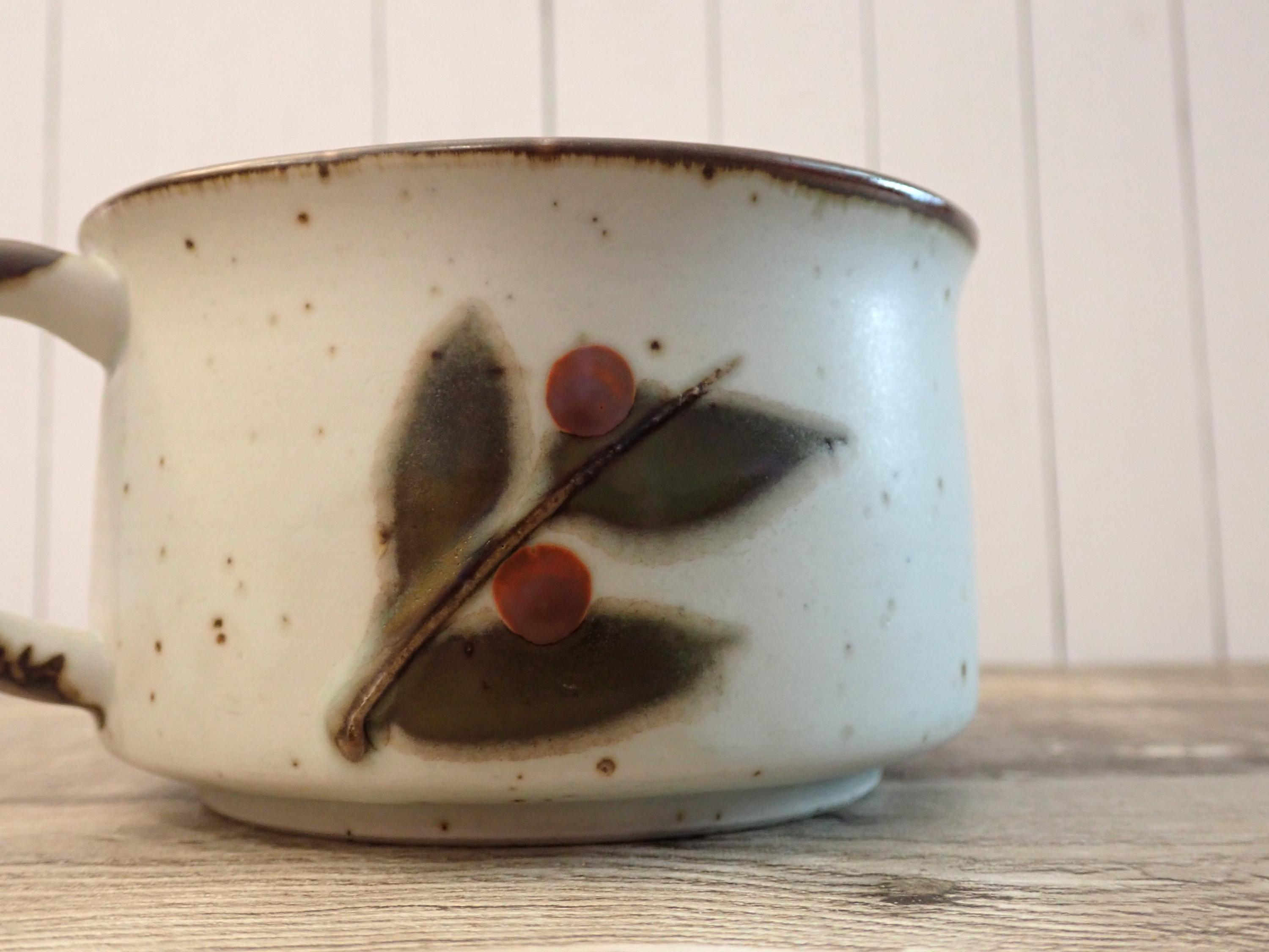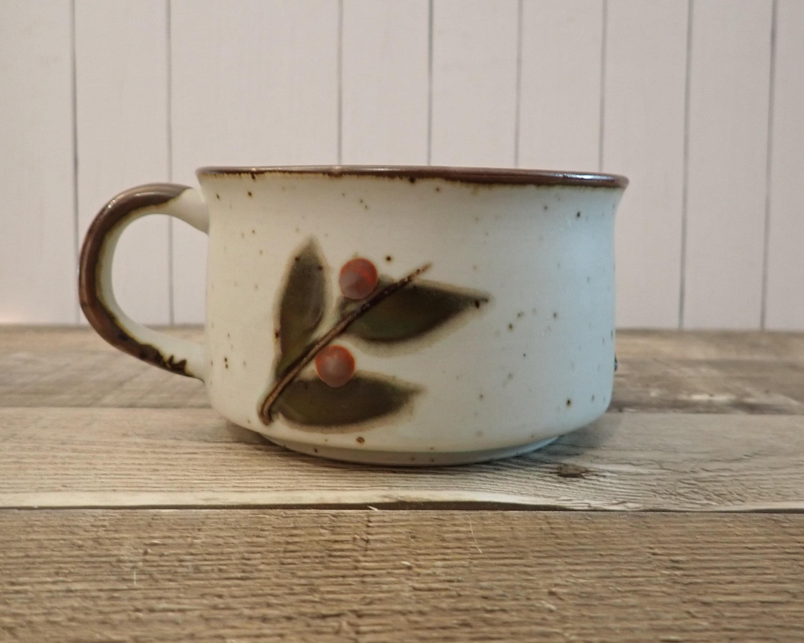 This Otagiri soup bowl or soup mug is from the Bittersweet collection. The bowl is2 3/4" tall and 4 1/2" in diameter. With the handle, it is 5 3/4" wide. The bowl is a white stoneware with brown flecks, and are decorated with green leaves and red berries on the bowl in 3 places. The bowl is in very nice condition with no chips or cracks.