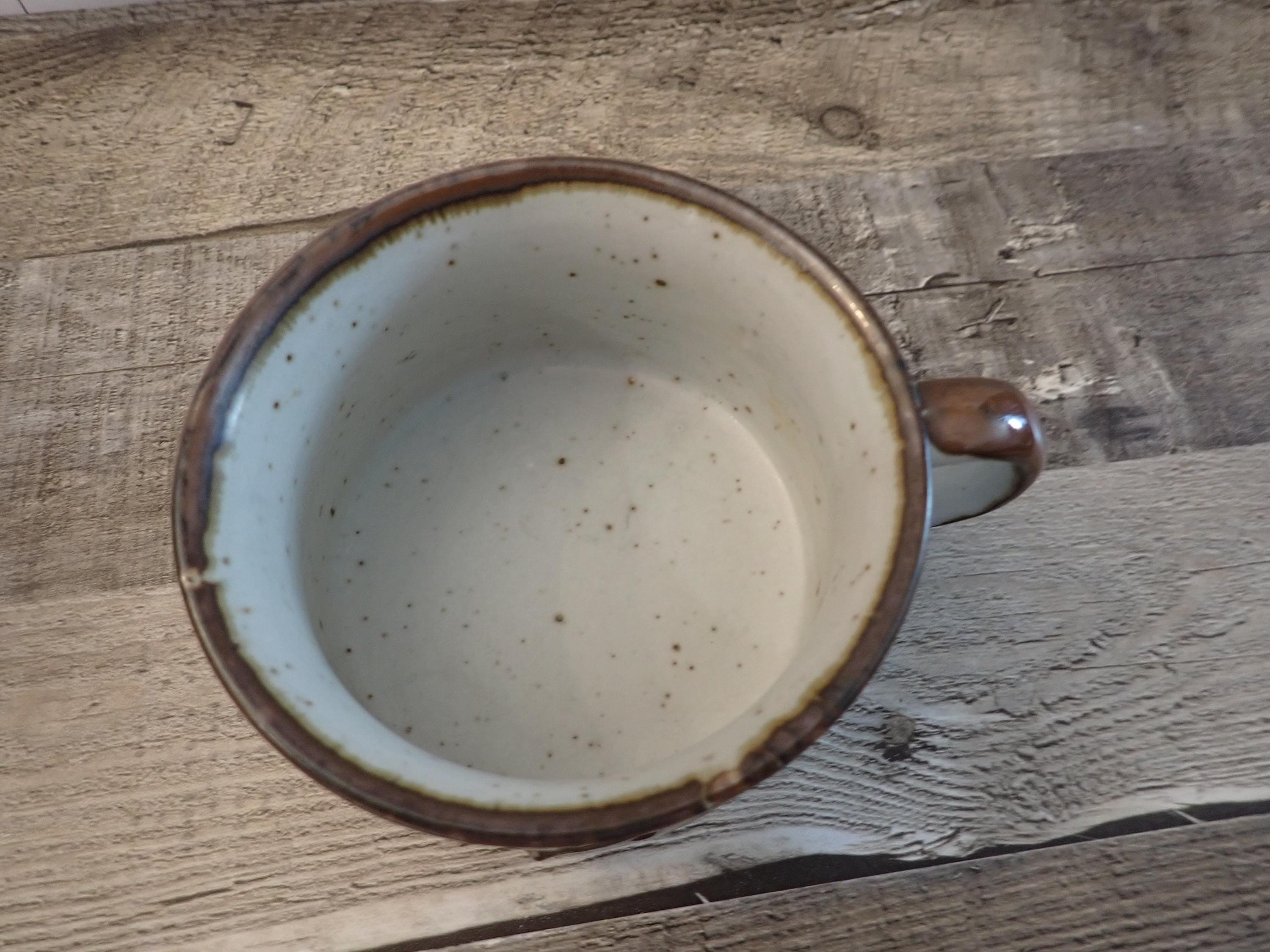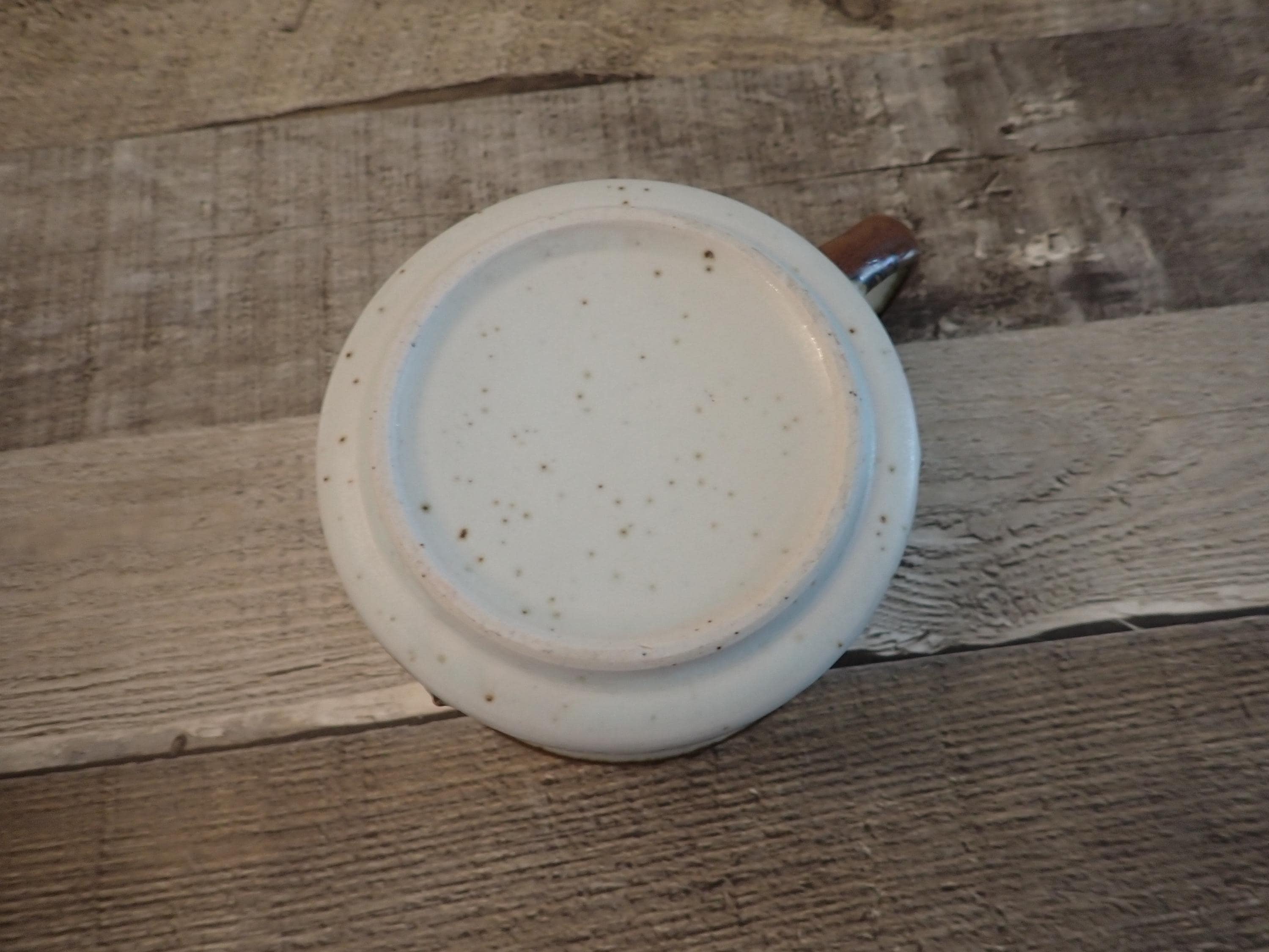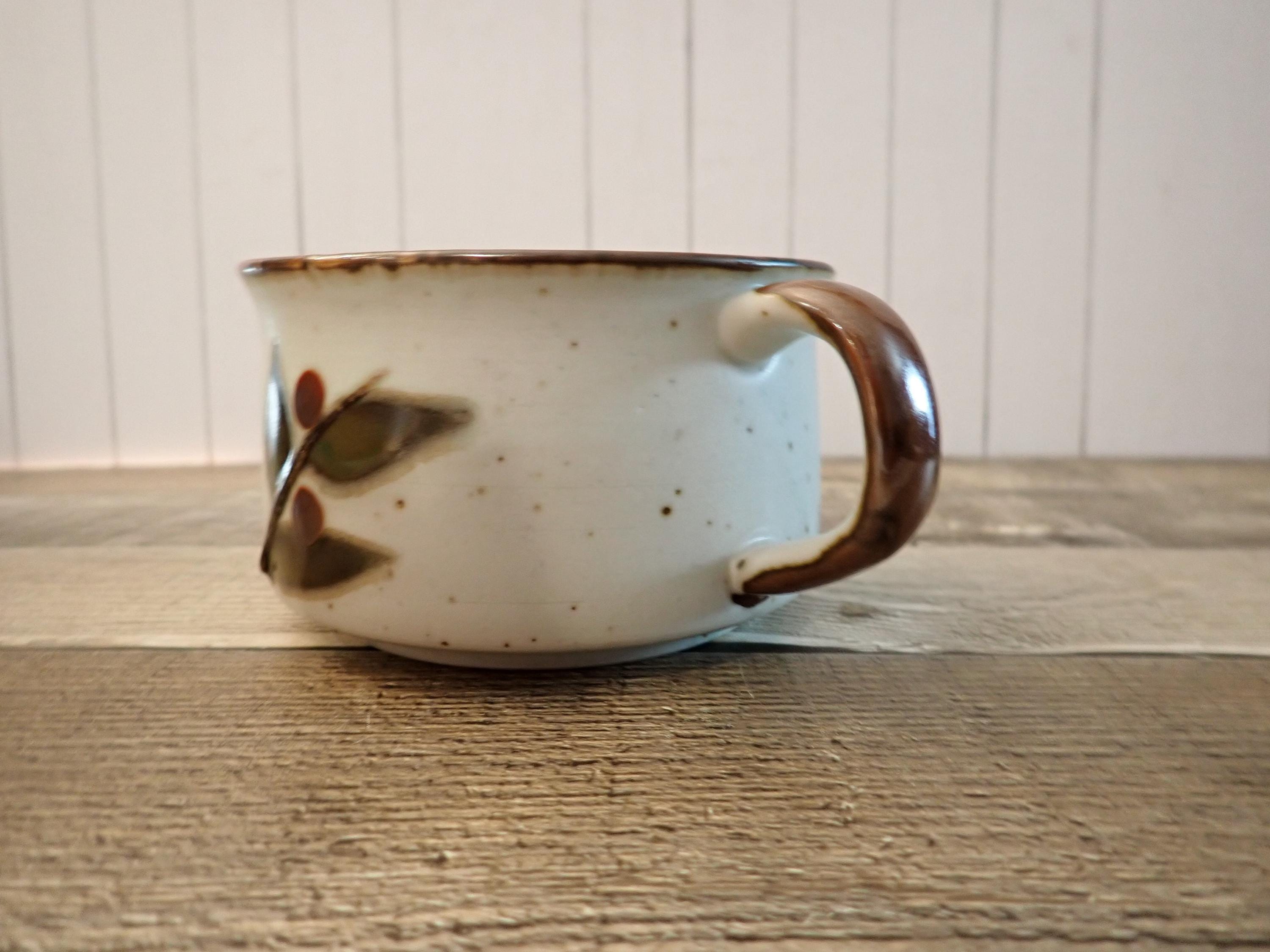 This Otagiri soup bowl or soup mug is from the Bittersweet collection. The bowl is2 3/4" tall and 4 1/2" in diameter. With the handle, it is 5 3/4" wide. The bowl is a white stoneware with brown flecks, and are decorated with green leaves and red berries on the bowl in 3 places. The bowl is in very nice condition with no chips or cracks.