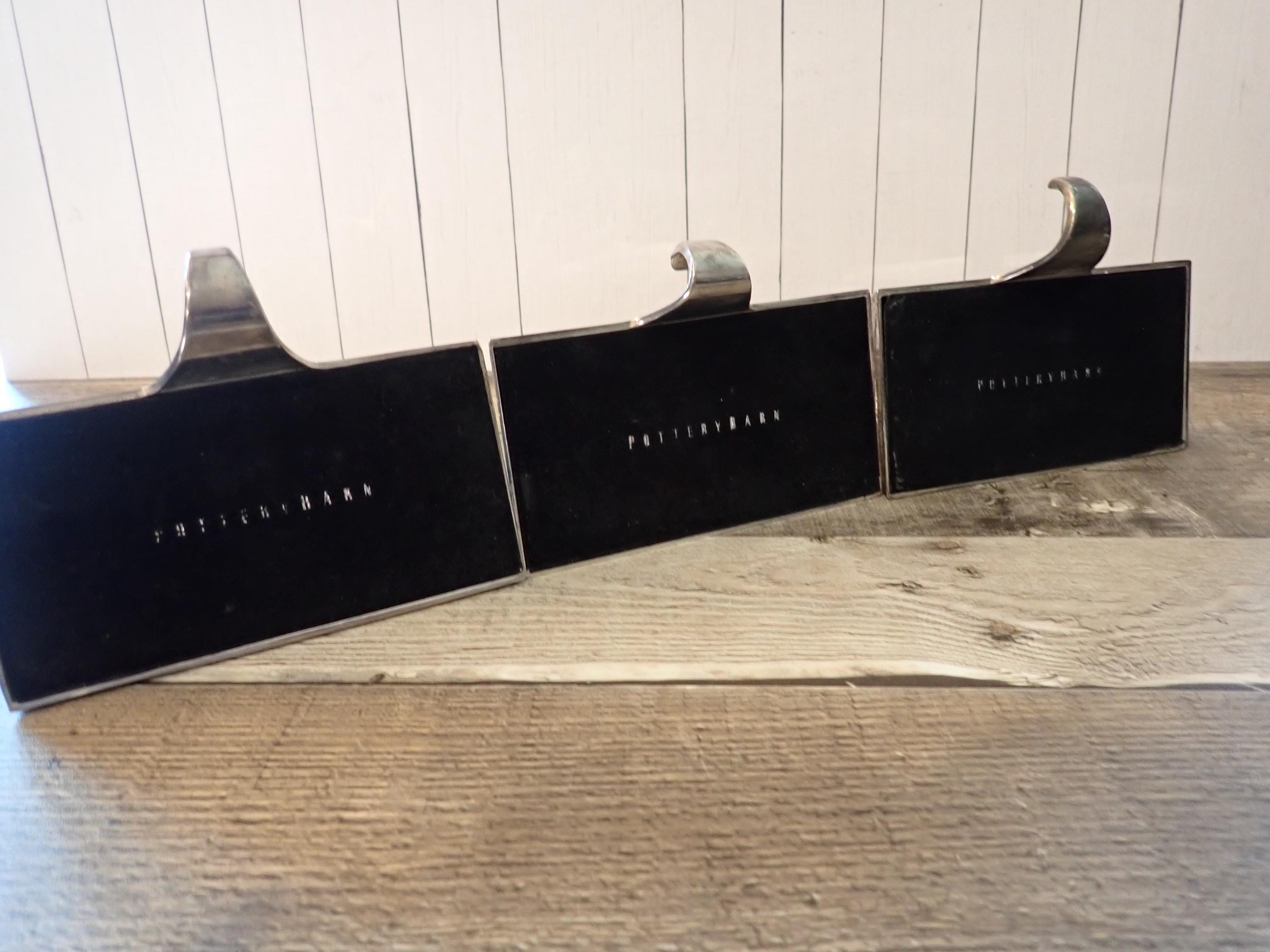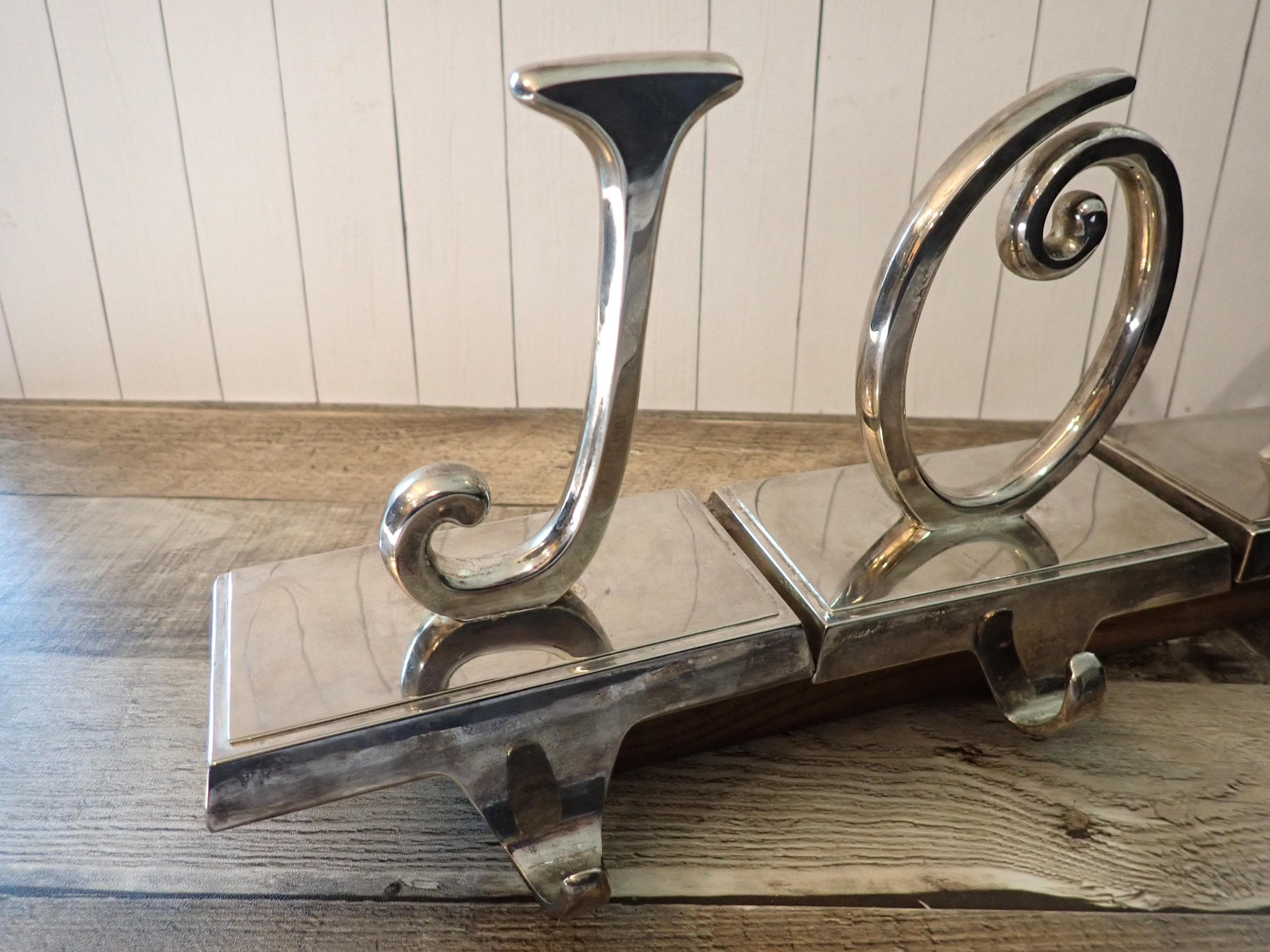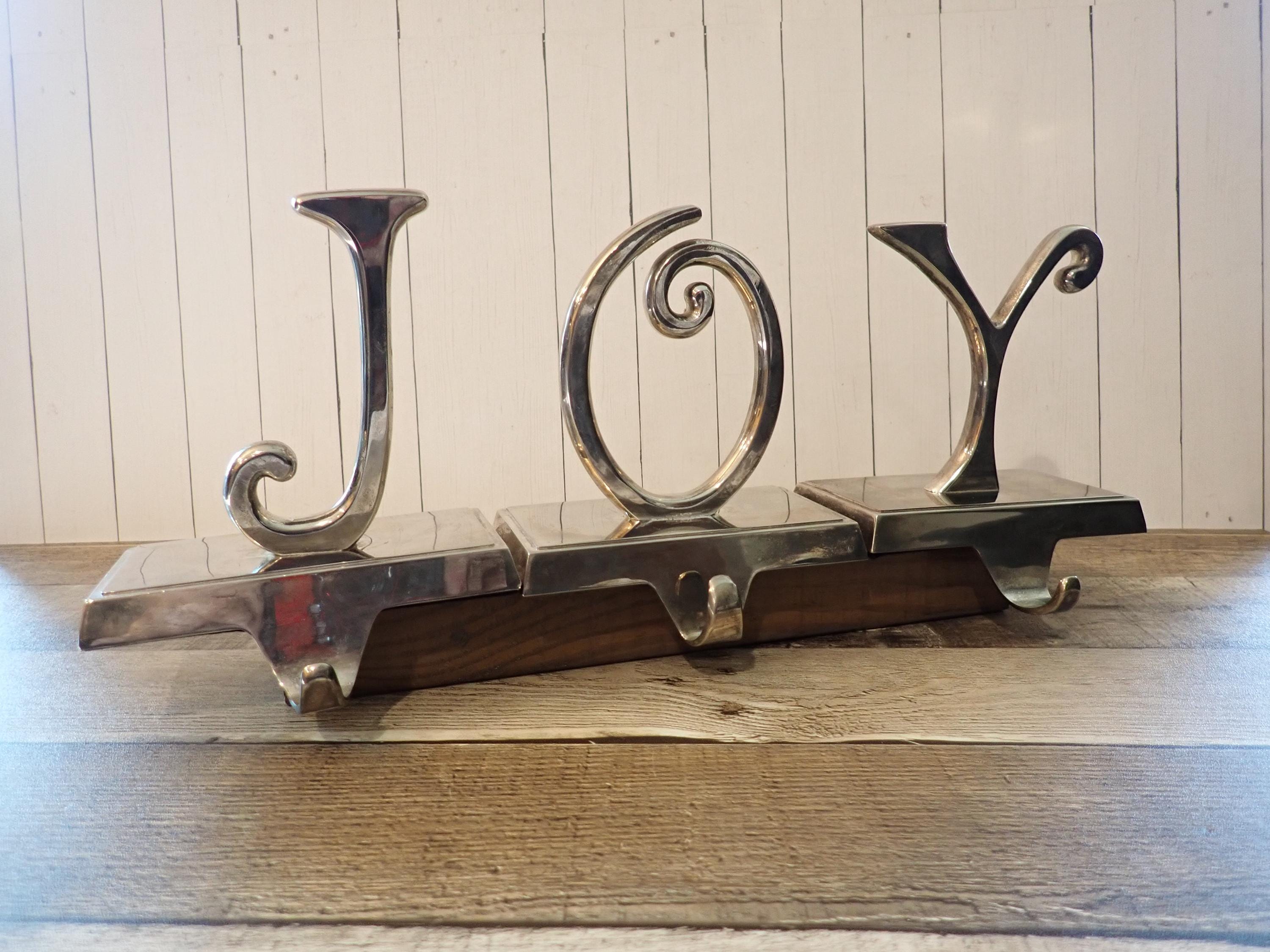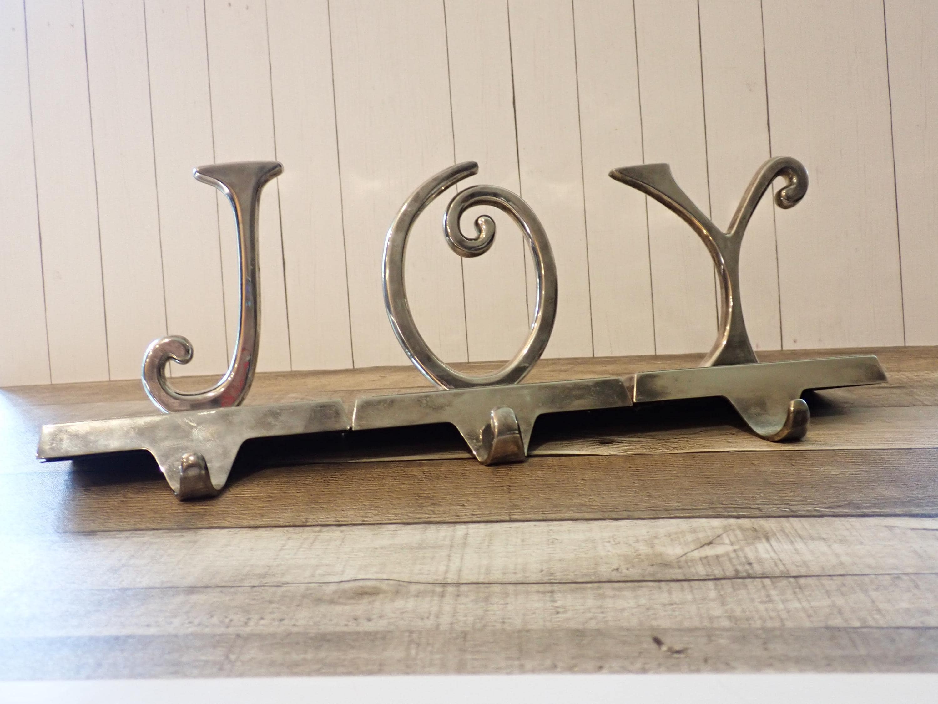 This set of 3 metal stocking hangers by Pottery Barn are silver metal holders that spell out JOY. The are 5.5" tall and 5.25" wide. They are silver plated and have a 1" hanger. The bottom is covered with a black felt material and marked POTTERY BARN. The hangers are in nice condition but they do have some light taarnish on the silverplate - they have been cleaned but they have not been polished.