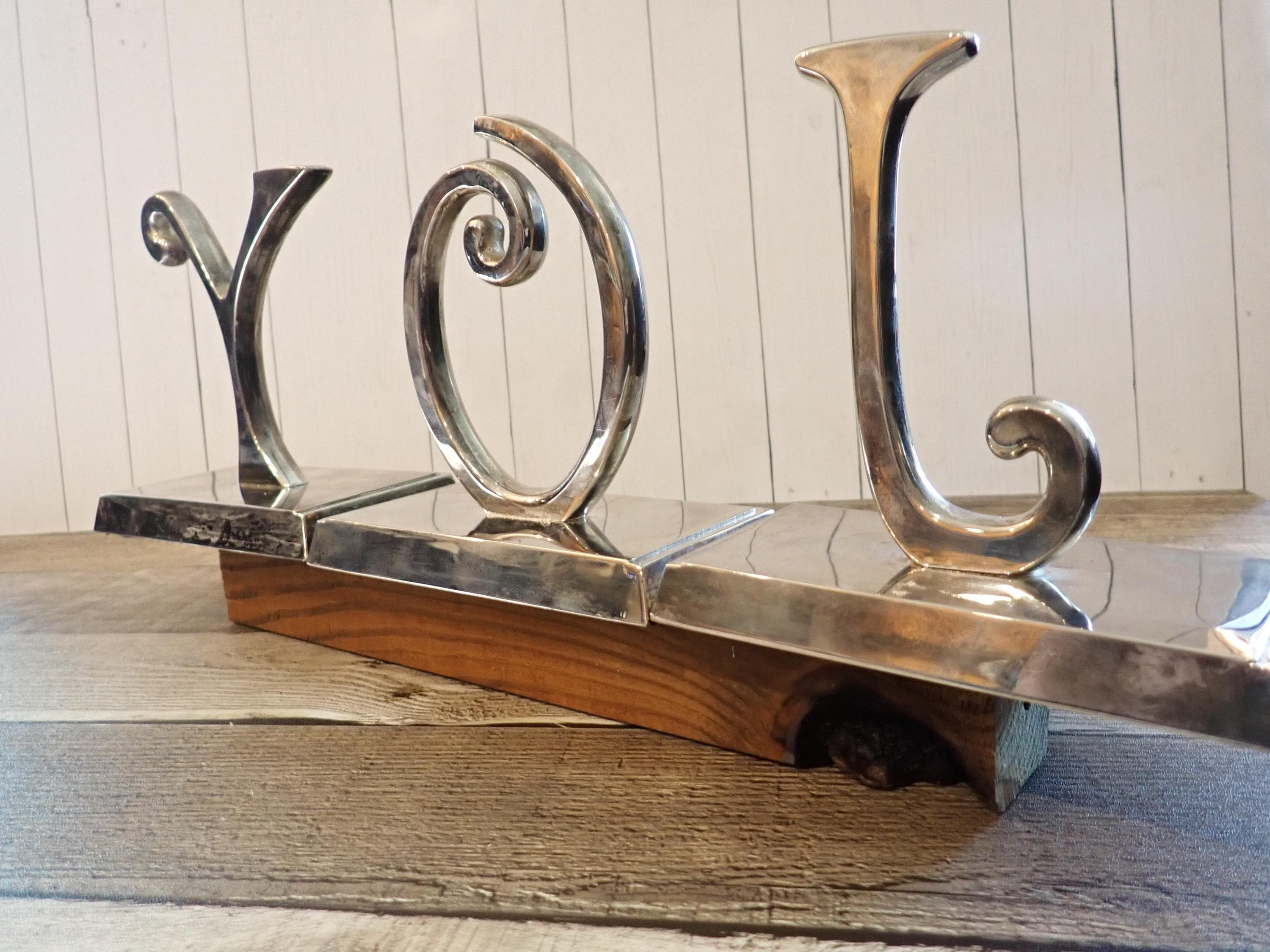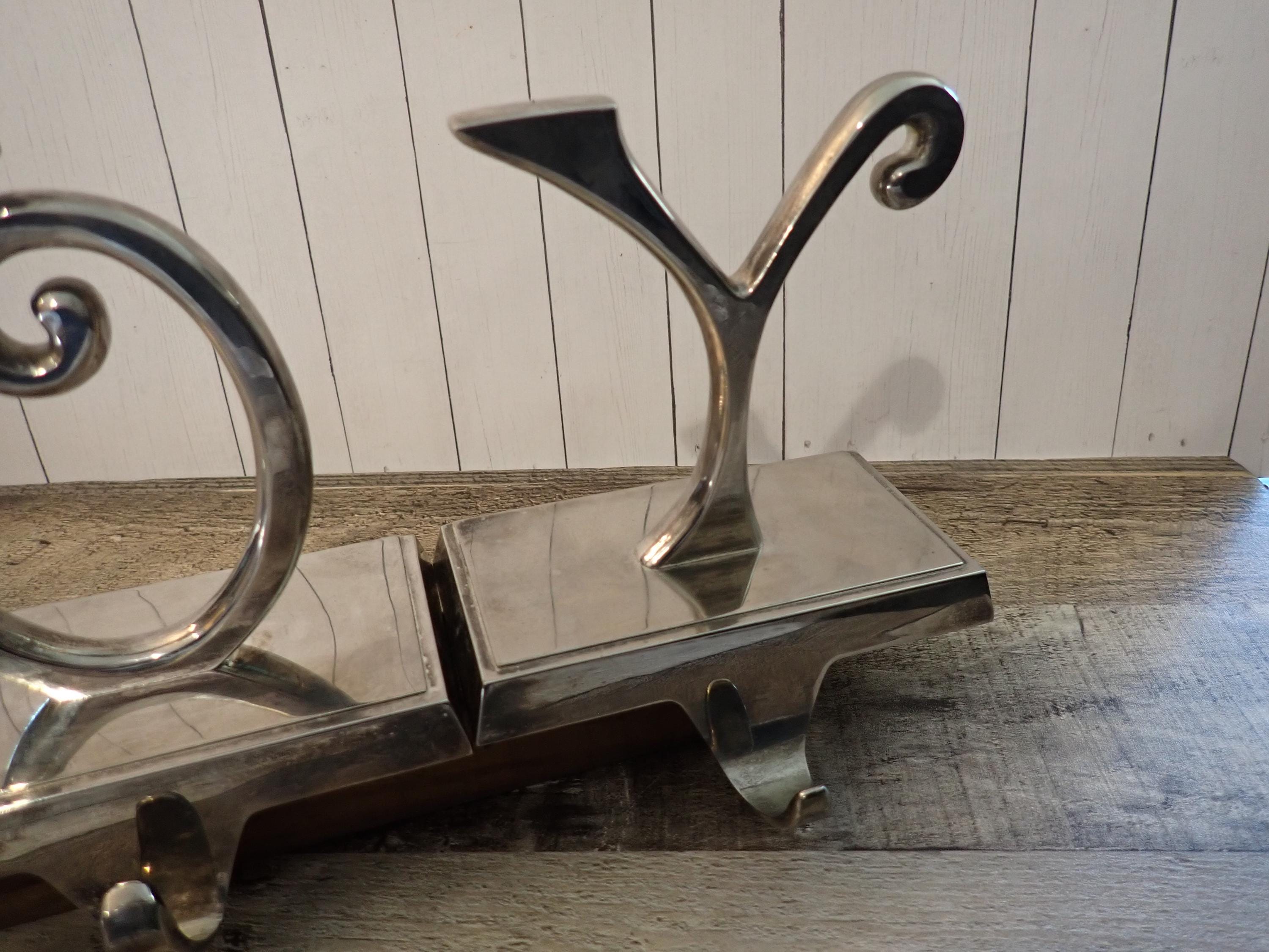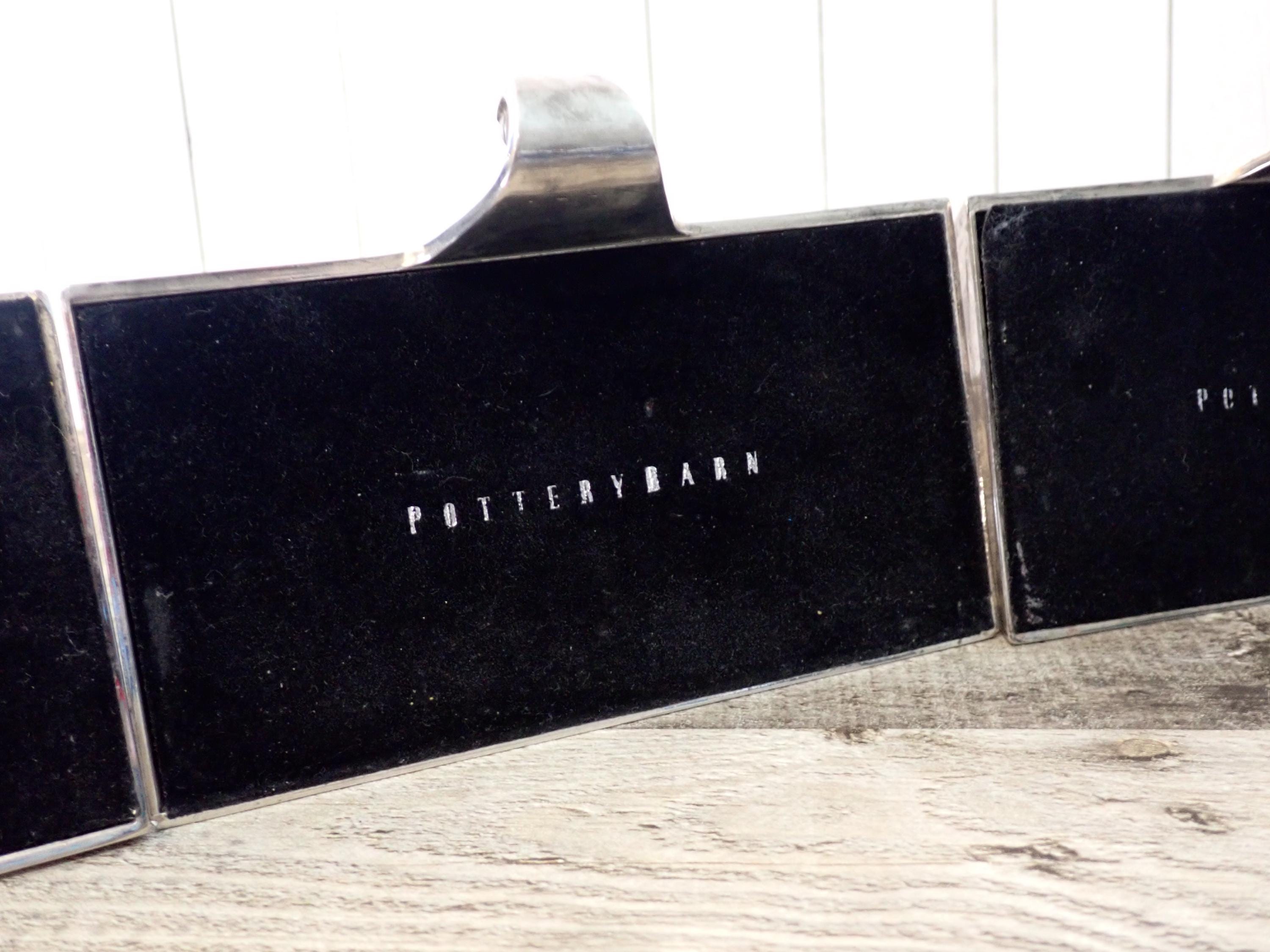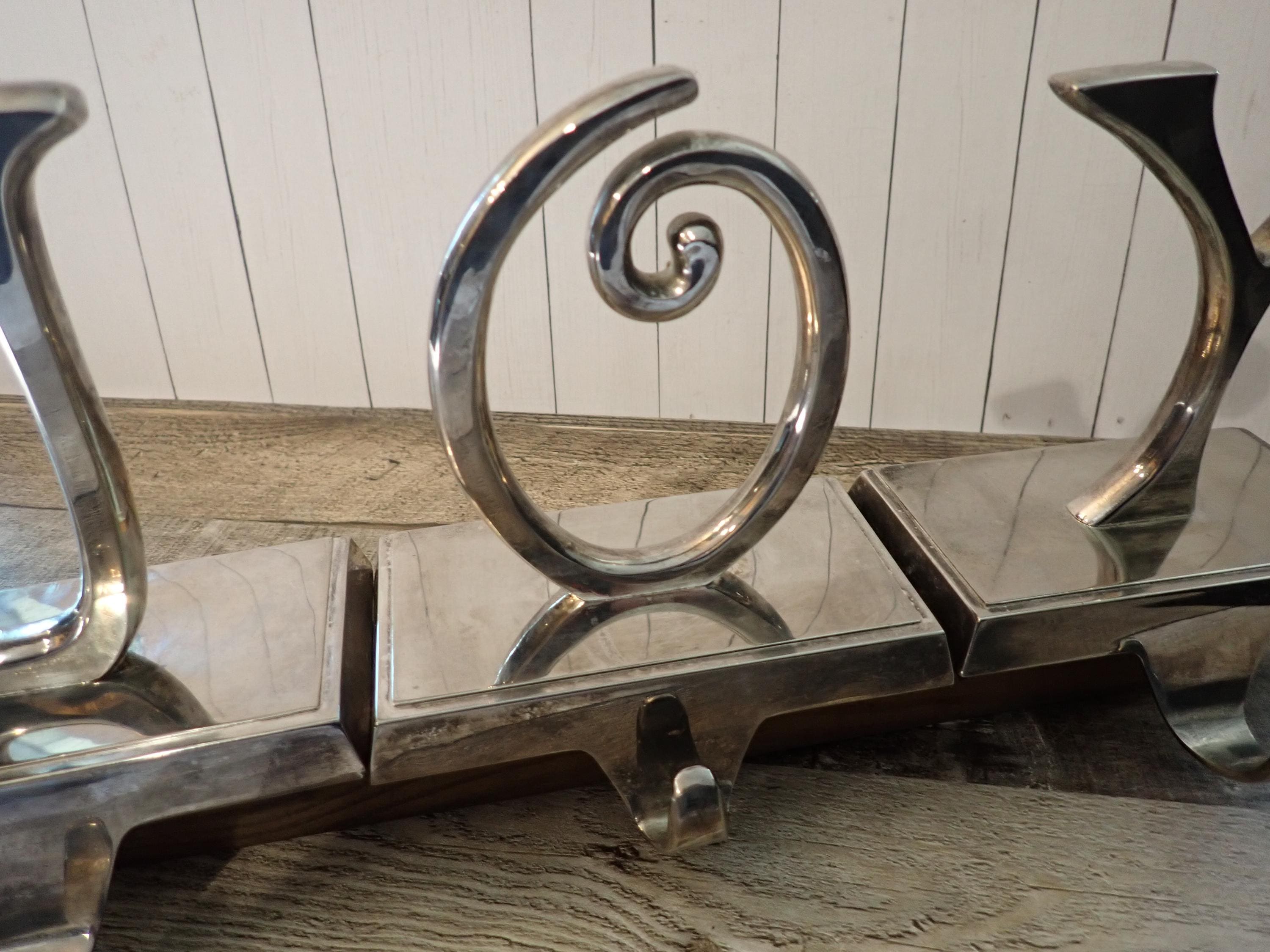 This set of 3 metal stocking hangers by Pottery Barn are silver metal holders that spell out JOY. The are 5.5" tall and 5.25" wide. They are silver plated and have a 1" hanger. The bottom is covered with a black felt material and marked POTTERY BARN. The hangers are in nice condition but they do have some light taarnish on the silverplate - they have been cleaned but they have not been polished.