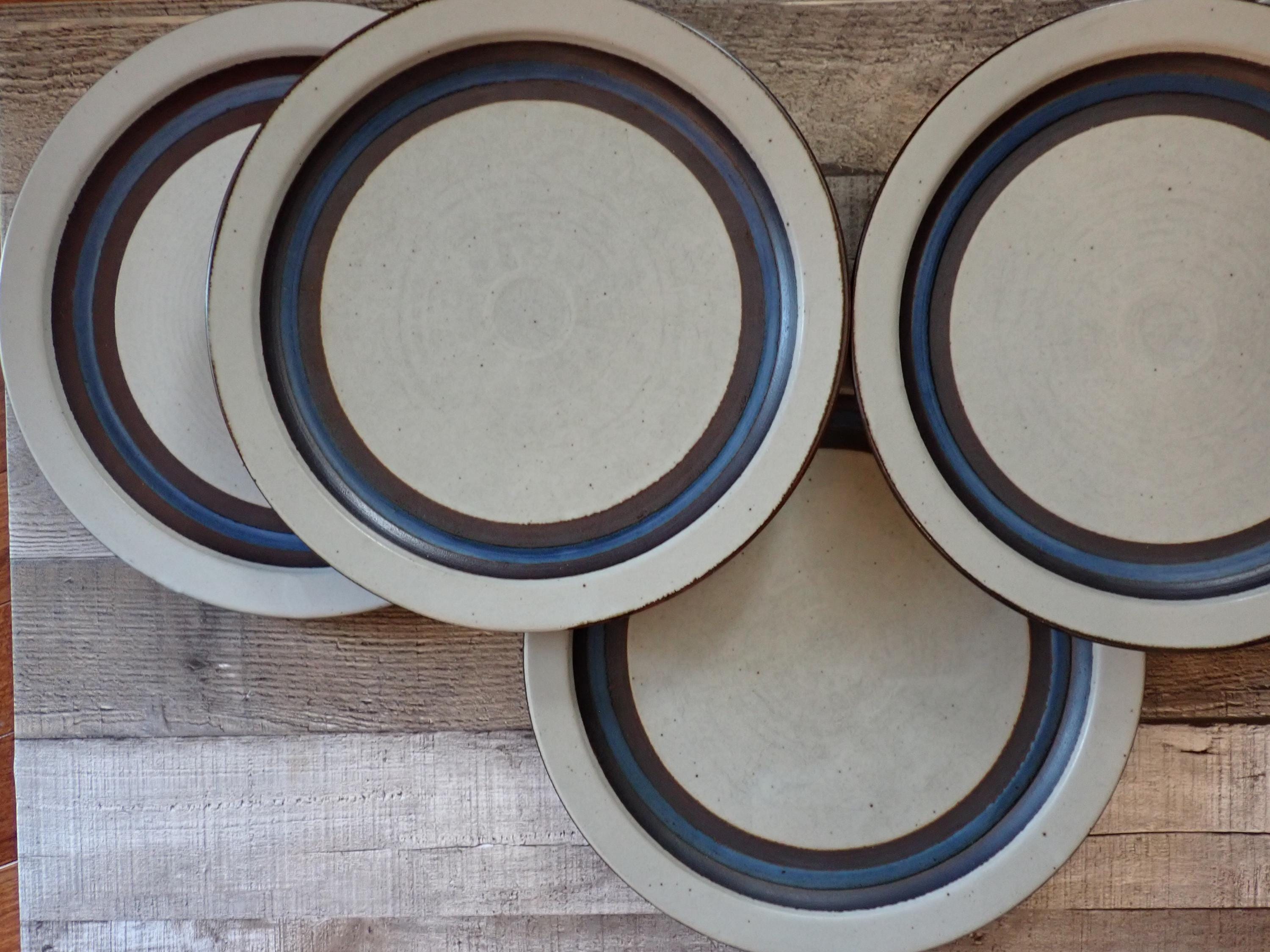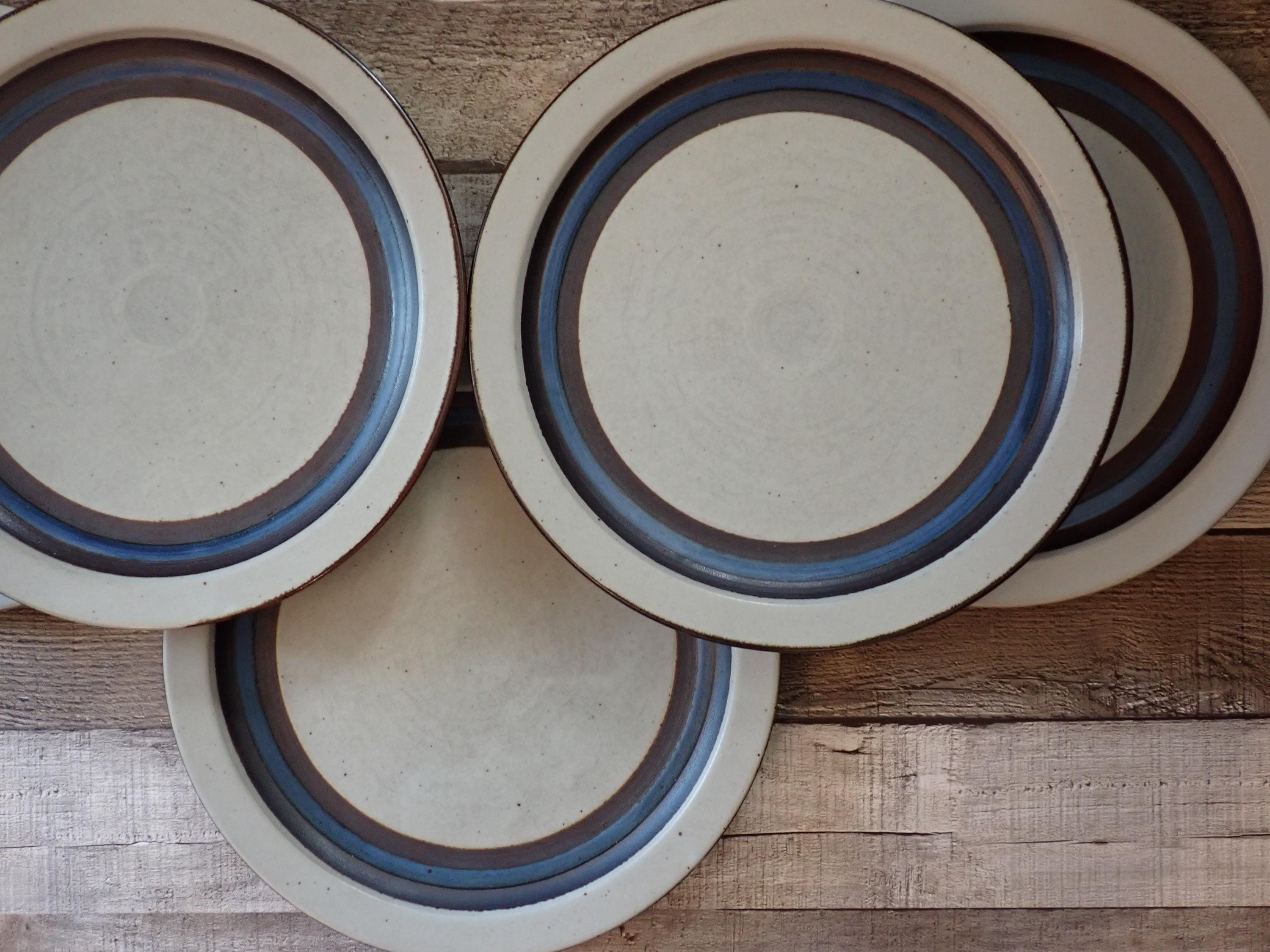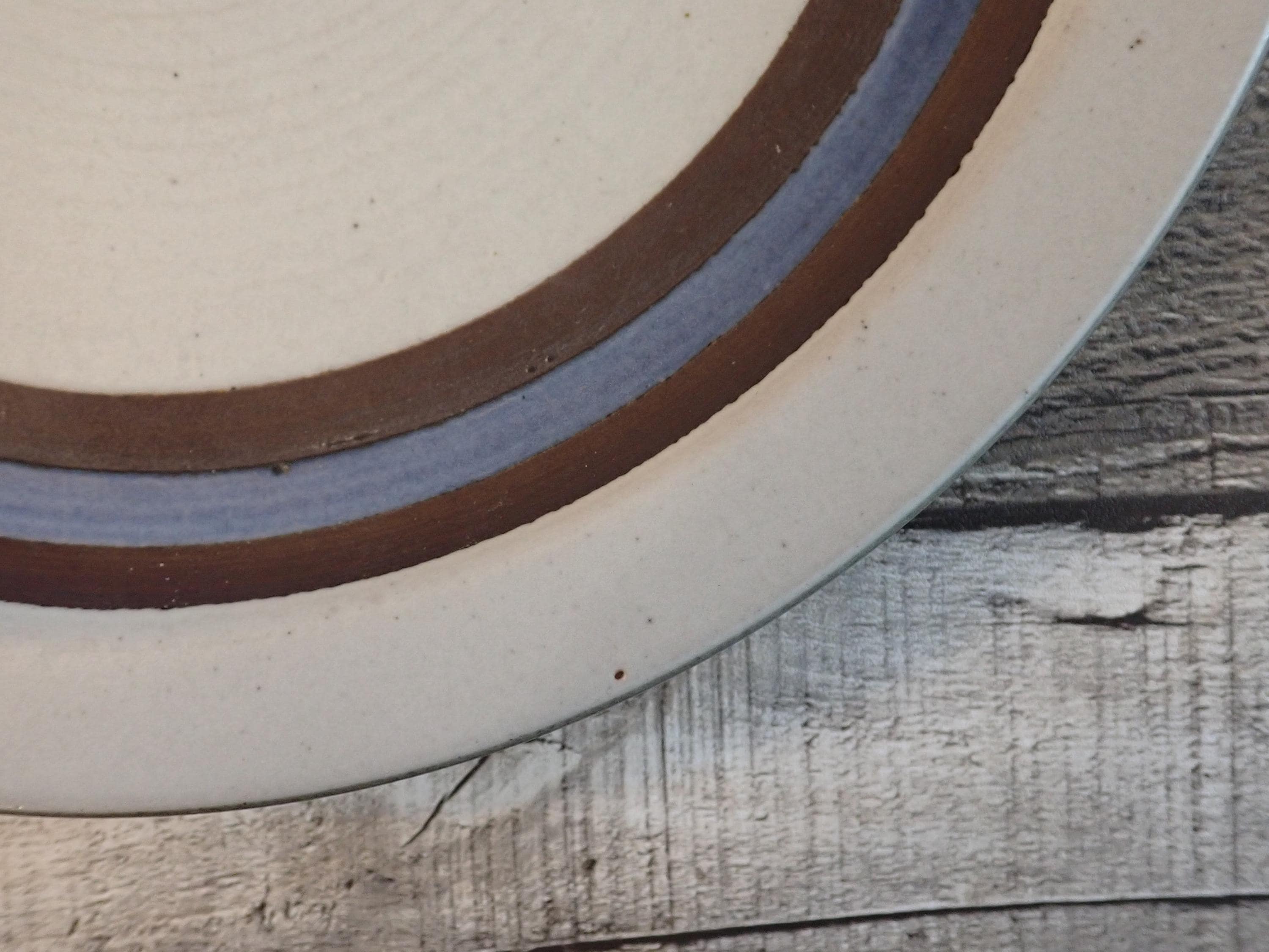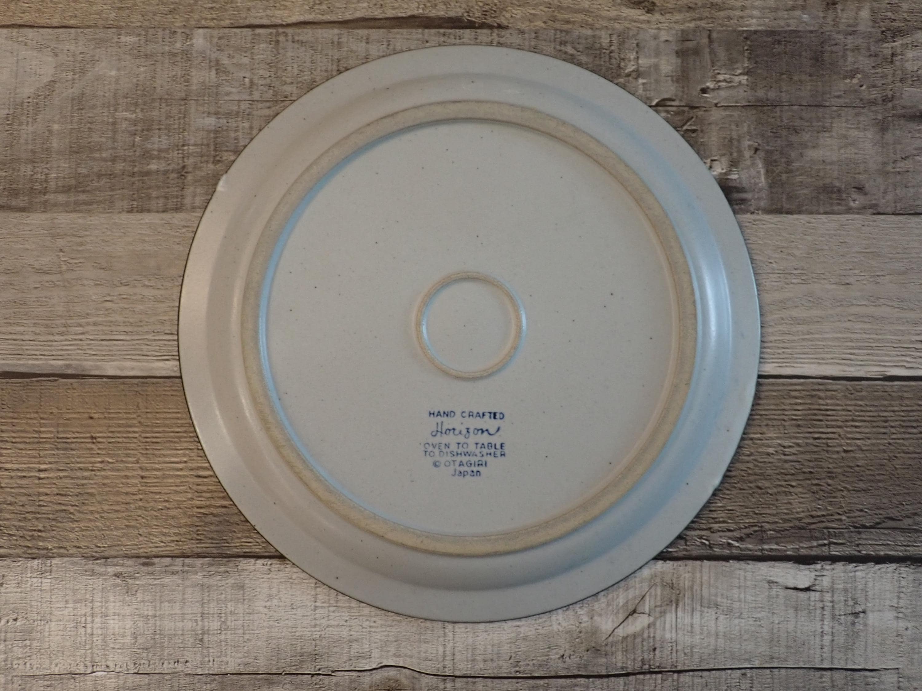 These stoneware plates by Otagiri are in the Horizon pattern and are the 10.5" Dinner Plates. The plates are a gray stoneware with brown flecking, and have one blue and two brown bands around the rim. The bottom of one plate is marked: HAND CRAFTED / HORIZON / OVEN TO TABLE TO DSHWASHER / OTAGIRI / JAPAN. All 5 plates are in very good condition with no chips or cracks, however there are some light scratches on 2 of the plates as shown in the last photo.