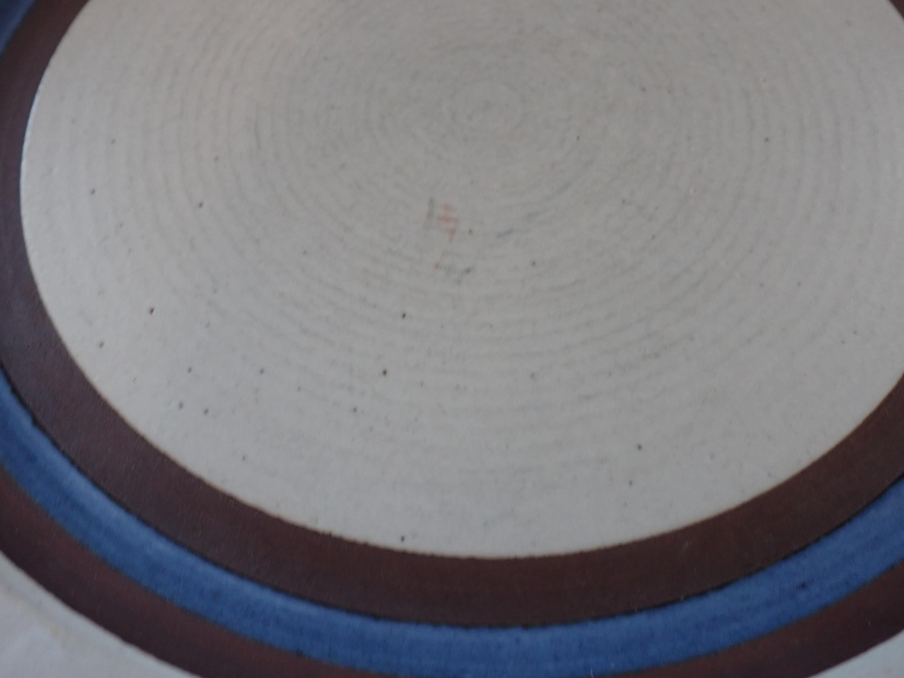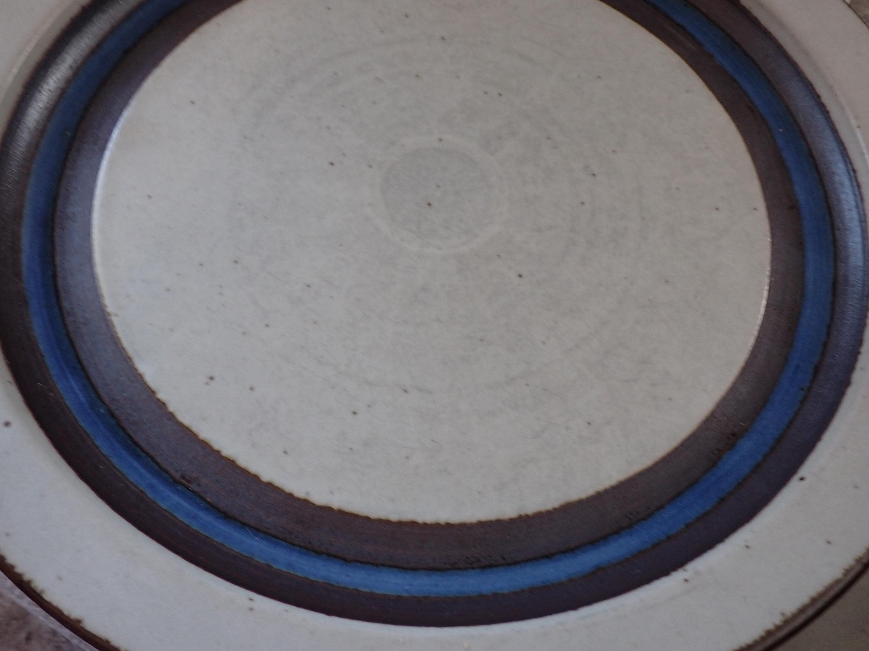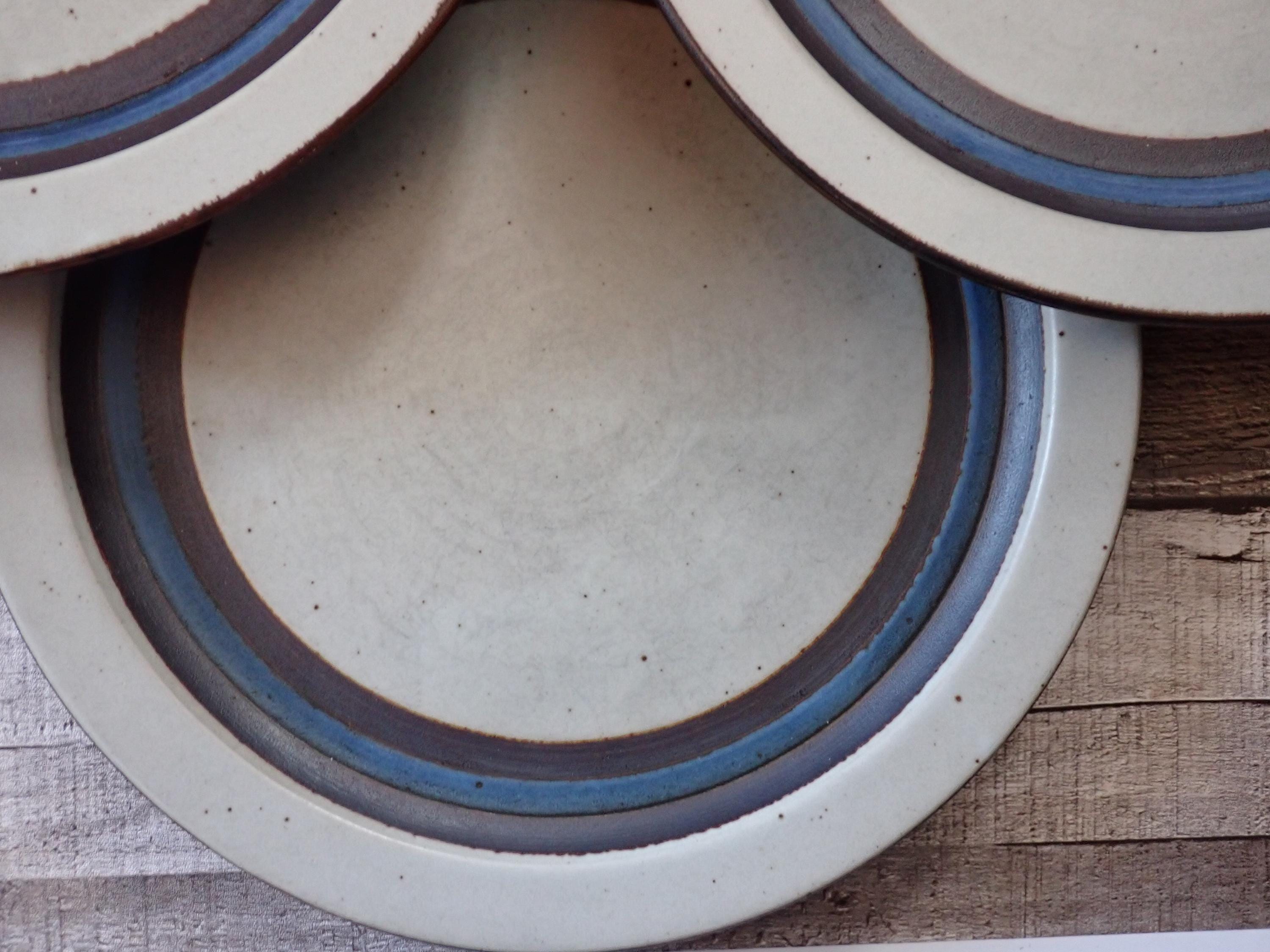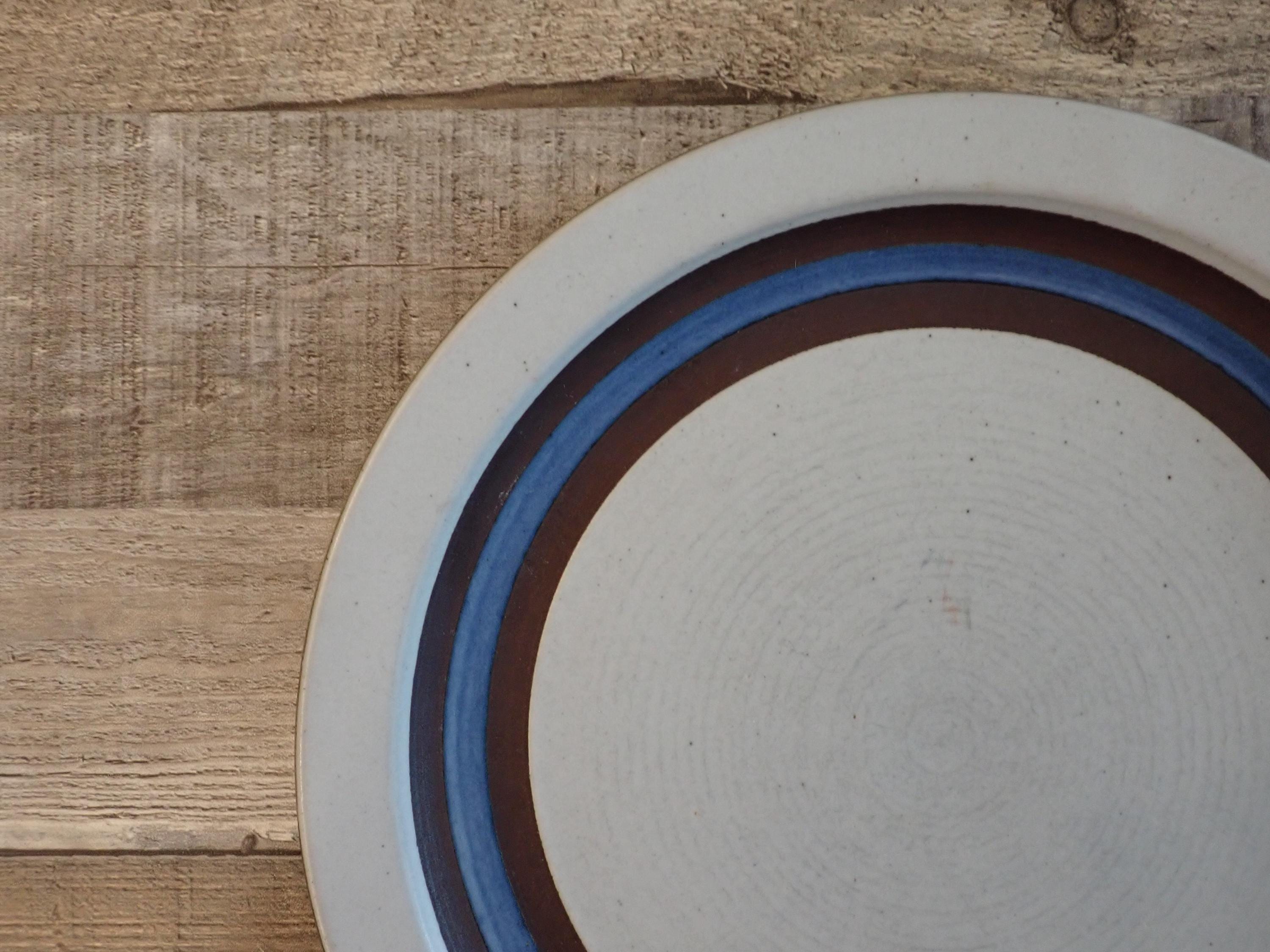 These stoneware plates by Otagiri are in the Horizon pattern and are the 10.5" Dinner Plates. The plates are a gray stoneware with brown flecking, and have one blue and two brown bands around the rim. The bottom of one plate is marked: HAND CRAFTED / HORIZON / OVEN TO TABLE TO DSHWASHER / OTAGIRI / JAPAN. All 5 plates are in very good condition with no chips or cracks, however there are some light scratches on 2 of the plates as shown in the last photo.