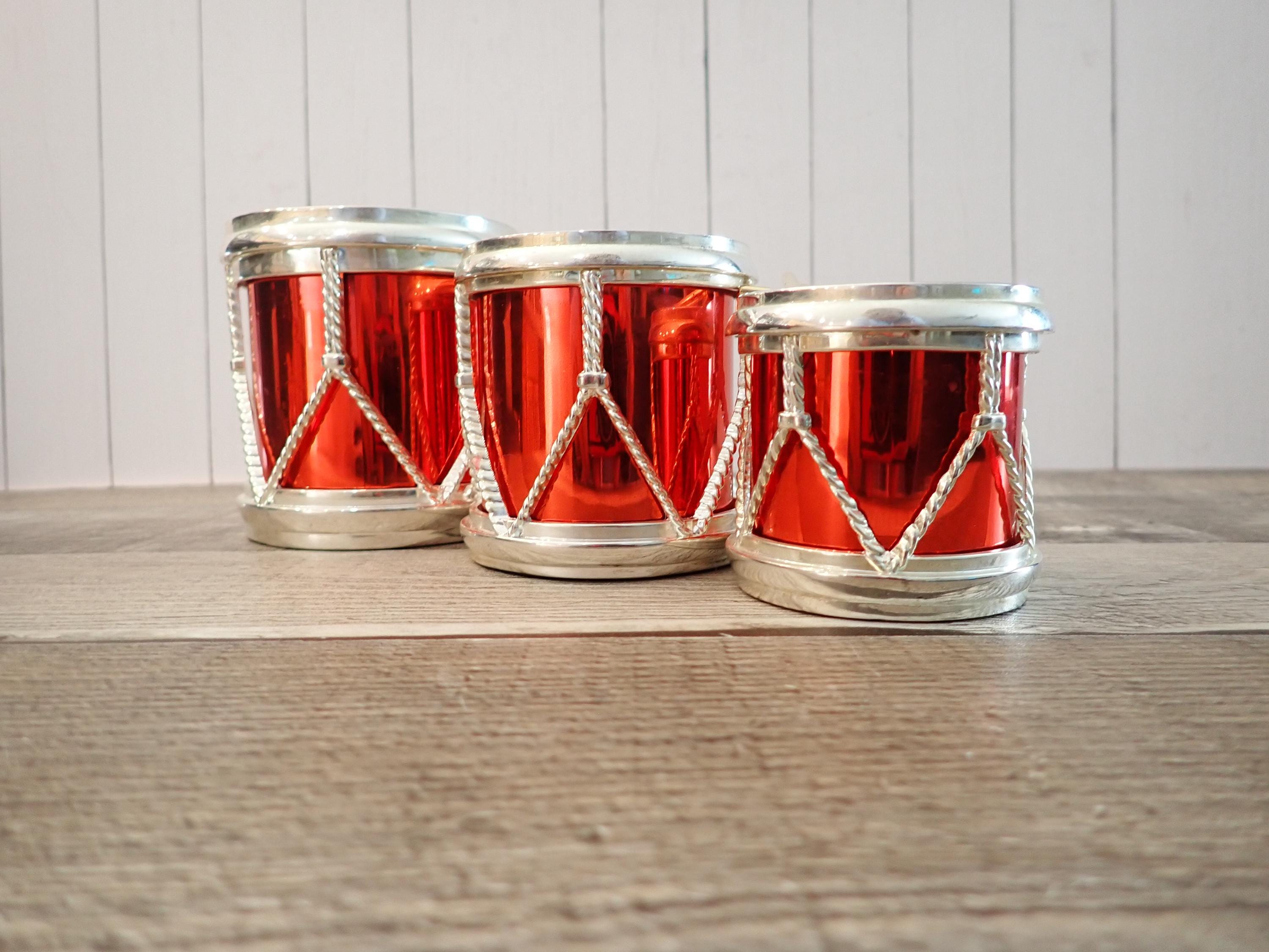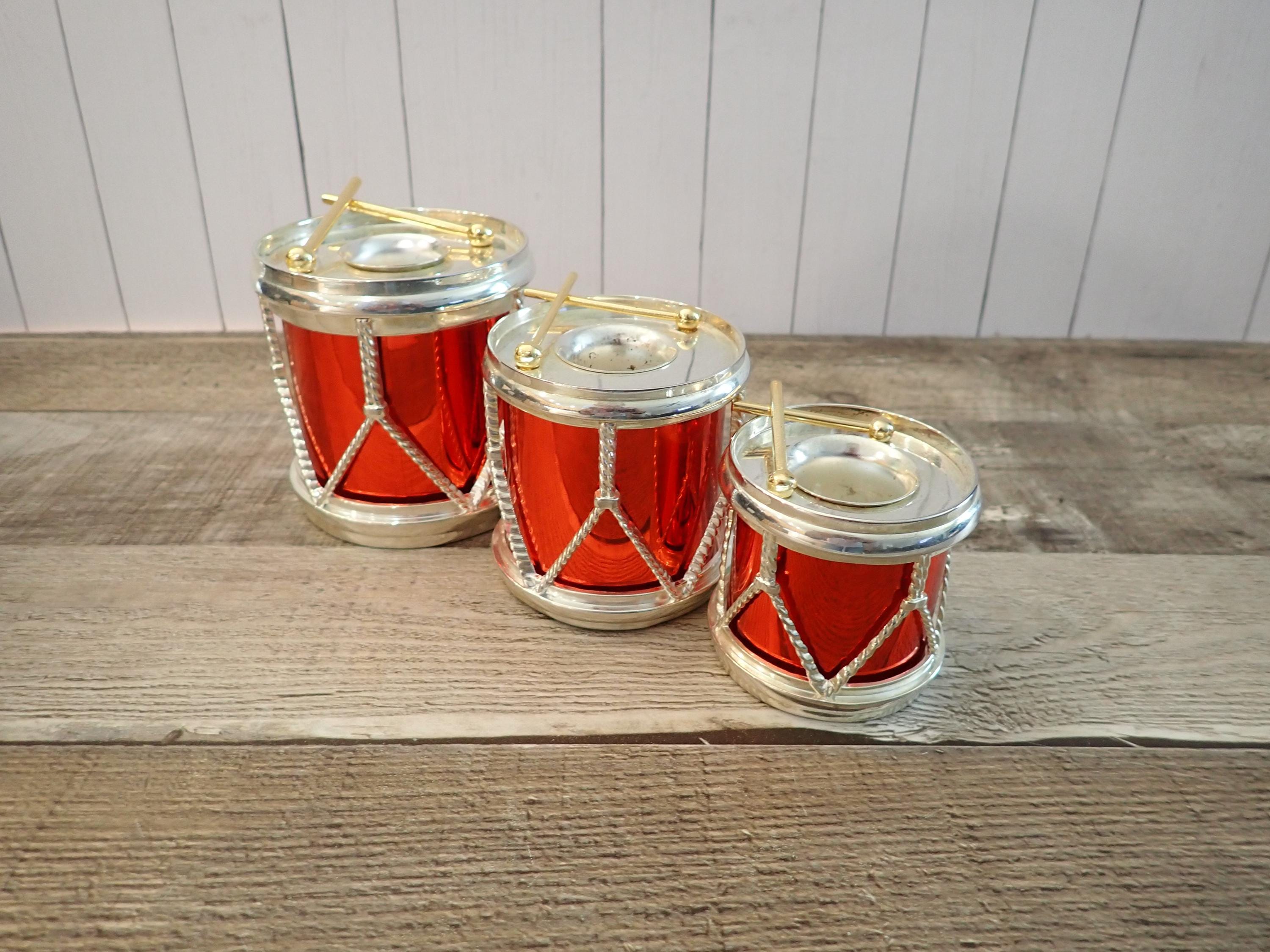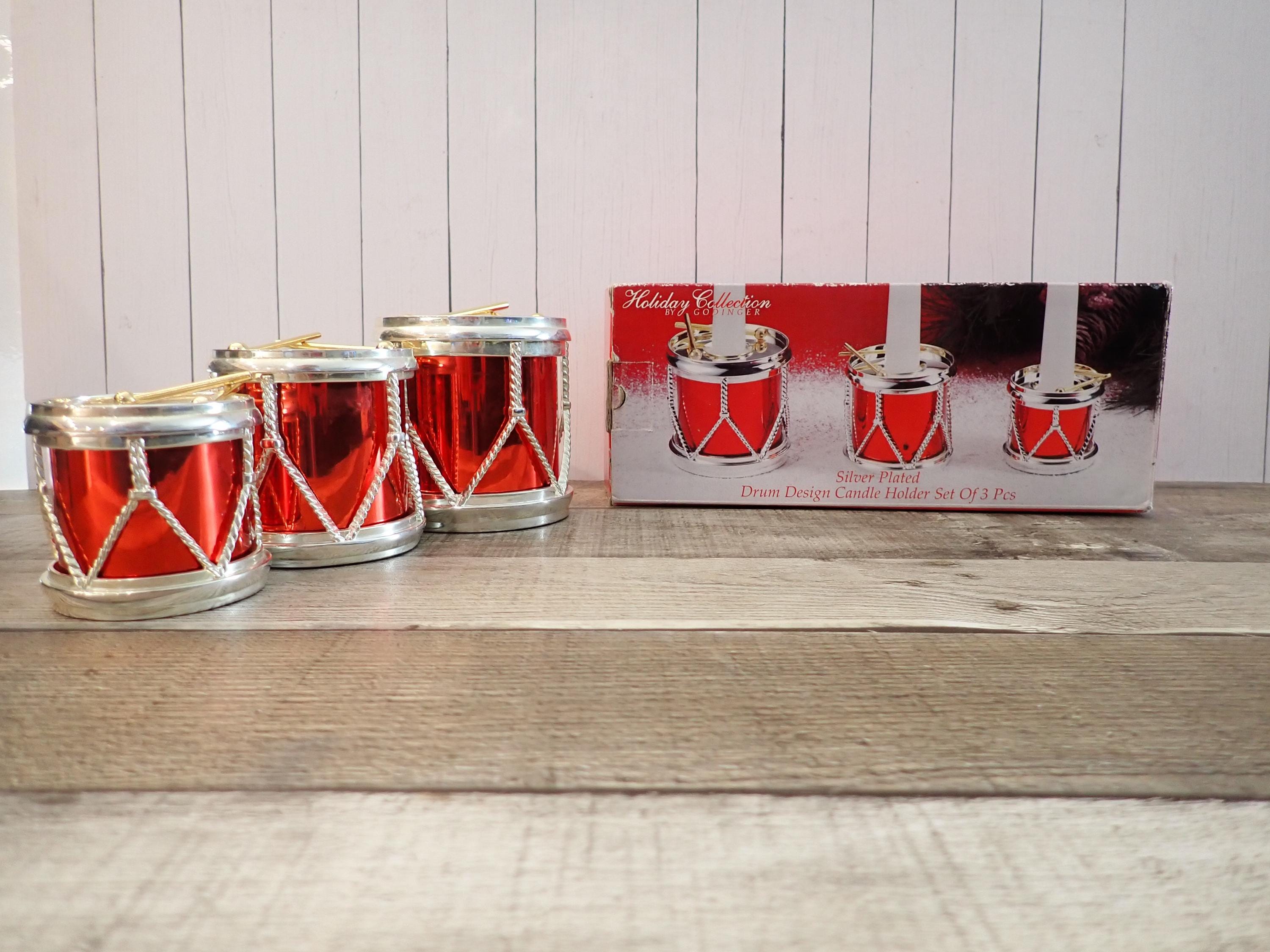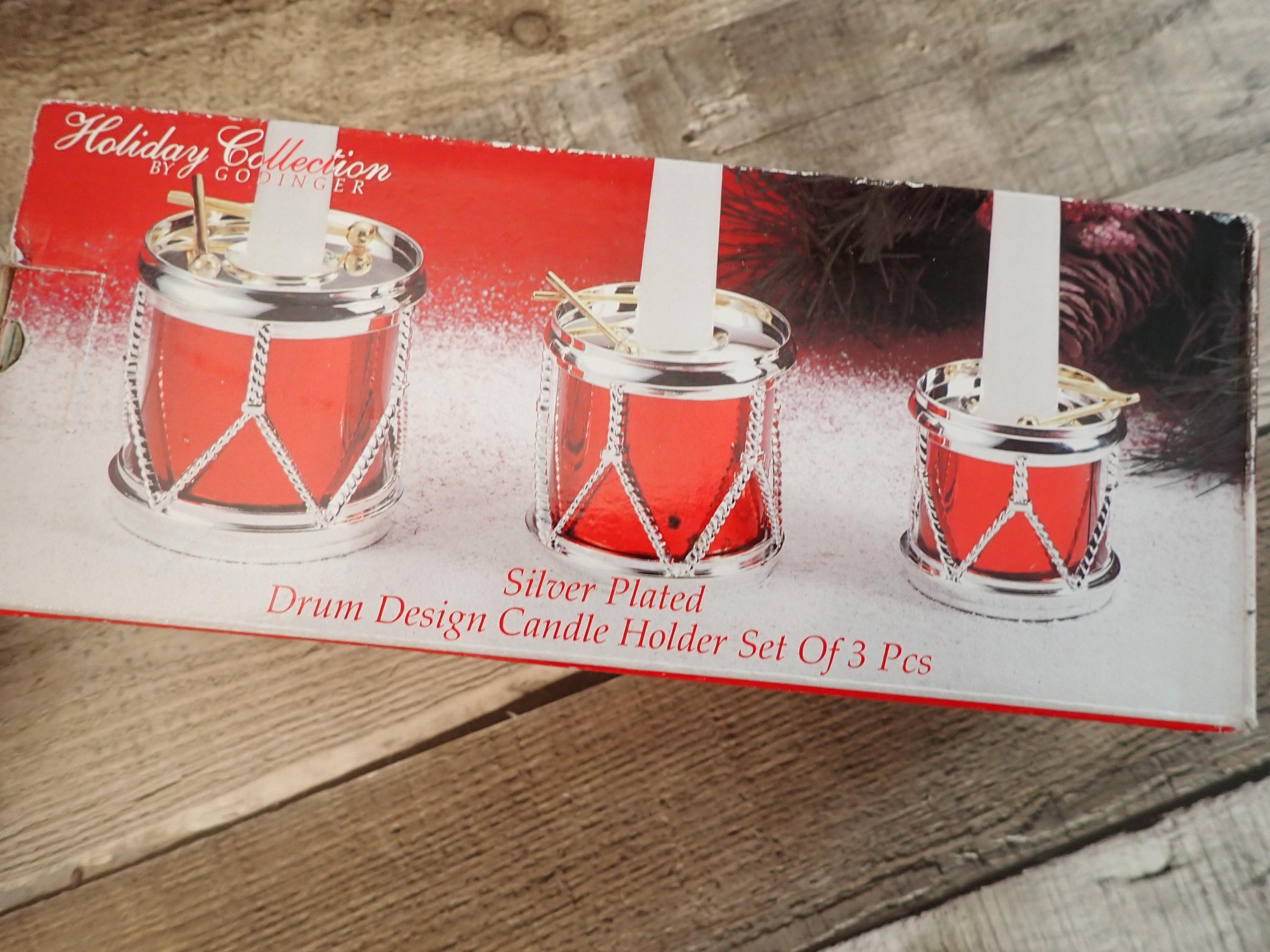 This set of 3 drum style candle holders by Godinger Silver Art Company includes 3 holders in graduated sizes. They are 2.25", 2.75, and 3.25" tall and 2.5"-3" in diameter. They have a red drum with silver accents and silver rope accents around the drum. Each holder can hold one taper style candle. They are marked Godinger on the bottoms. All 3 candle holders are in very good condition with no chip or cracks and no damage to the silver work. There is some wax residue on the inside of the candle holder portion. The original box is included.
