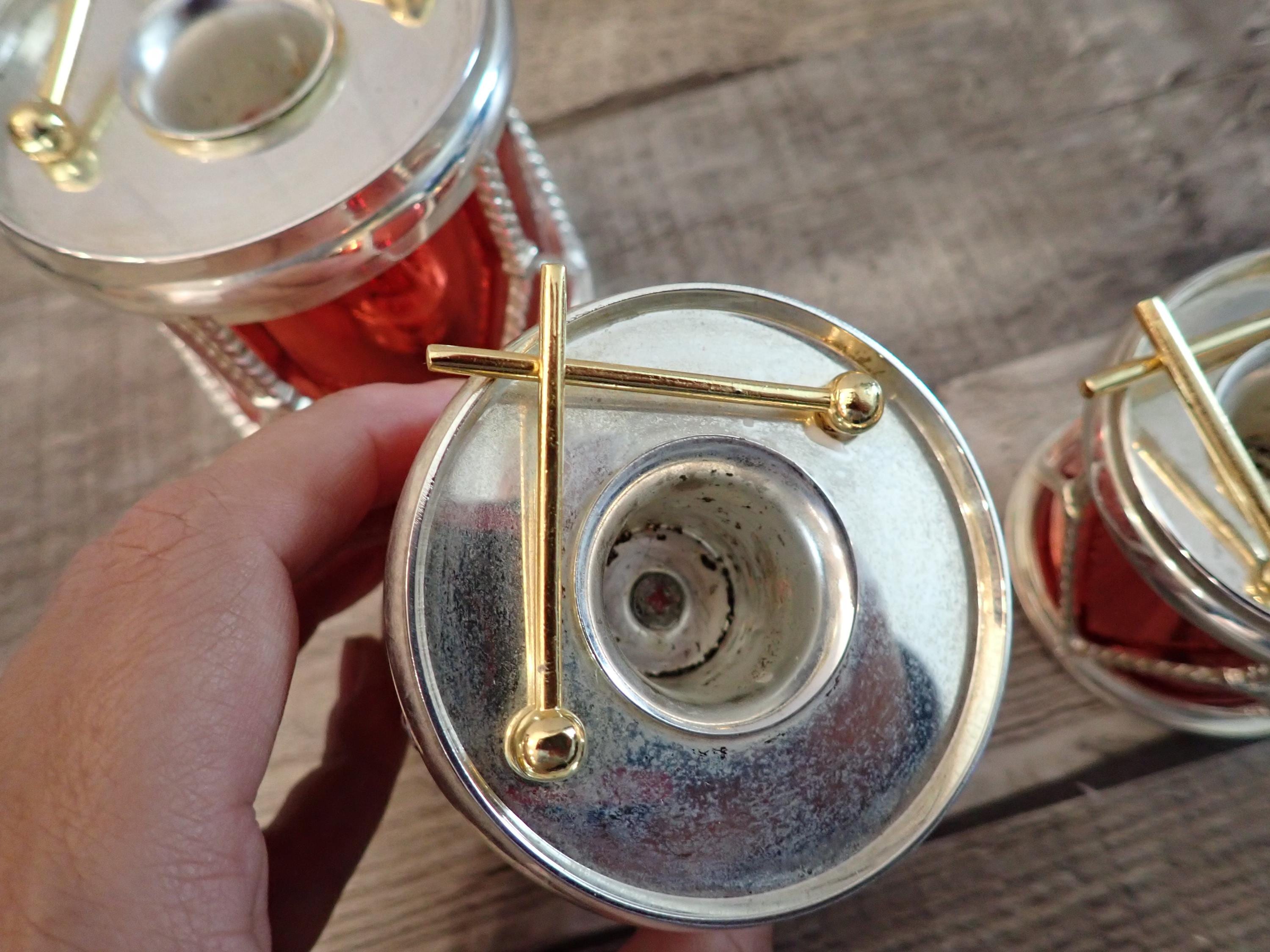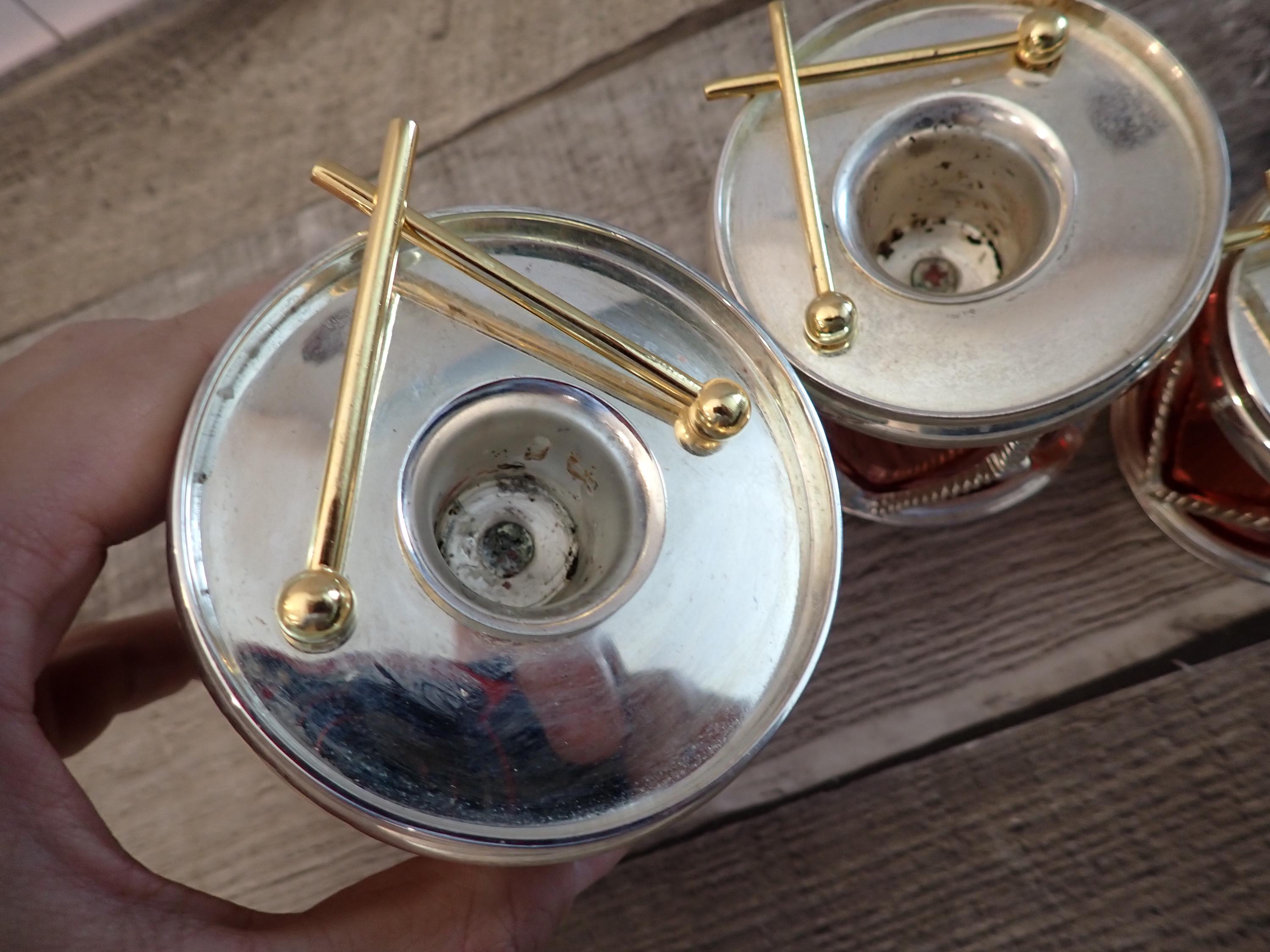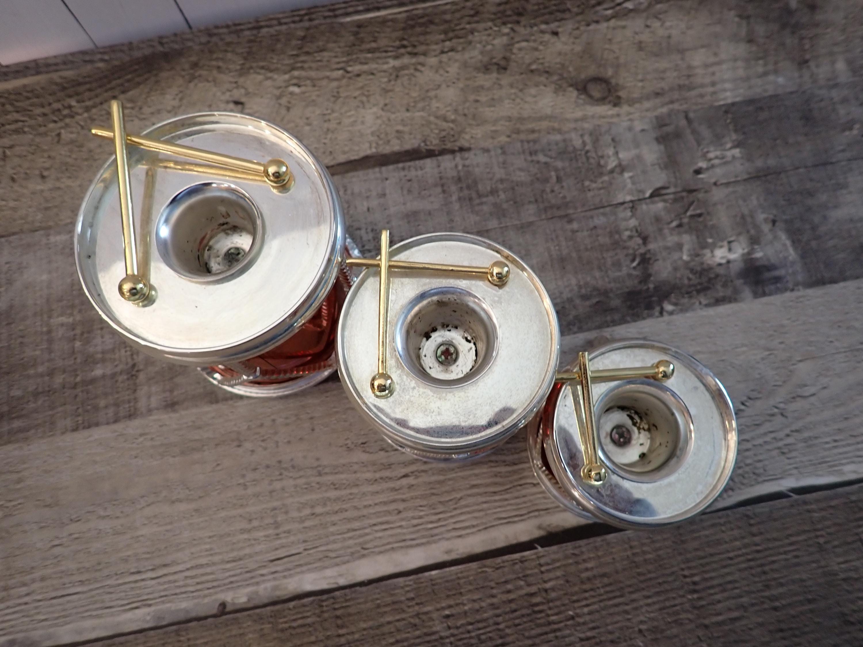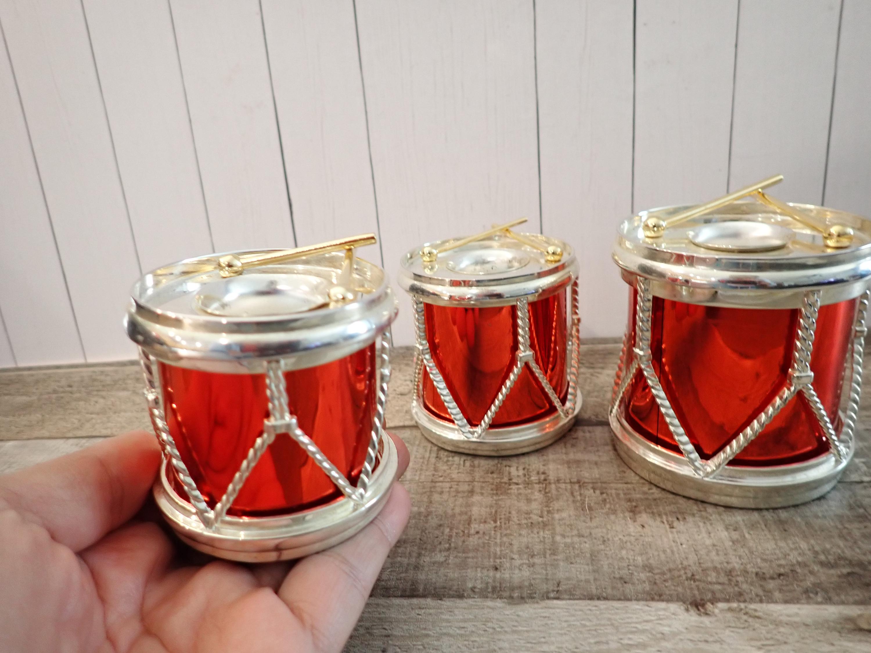 This set of 3 drum style candle holders by Godinger Silver Art Company includes 3 holders in graduated sizes. They are 2.25", 2.75, and 3.25" tall and 2.5"-3" in diameter. They have a red drum with silver accents and silver rope accents around the drum. Each holder can hold one taper style candle. They are marked Godinger on the bottoms. All 3 candle holders are in very good condition with no chip or cracks and no damage to the silver work. There is some wax residue on the inside of the candle holder portion. The original box is included.