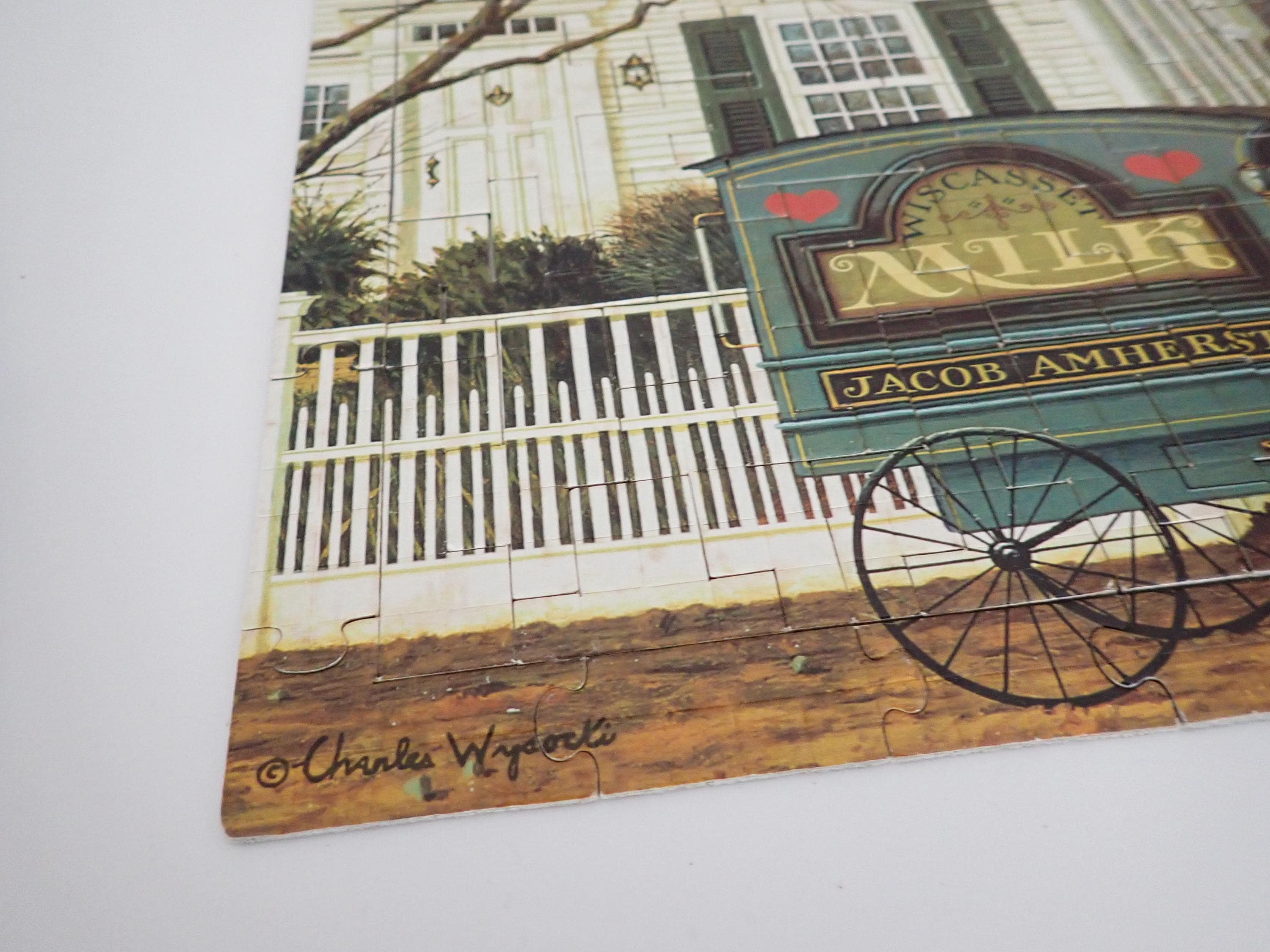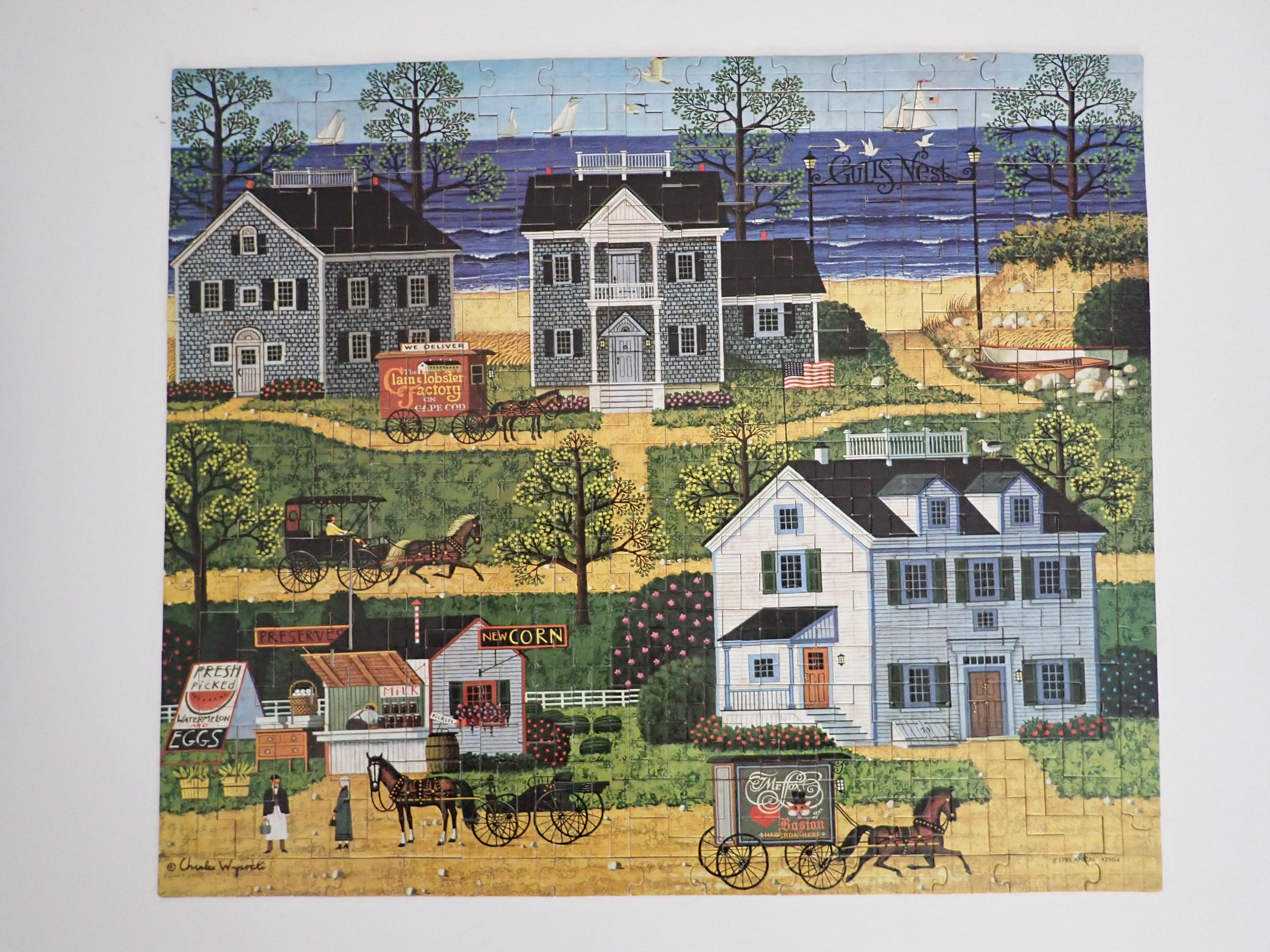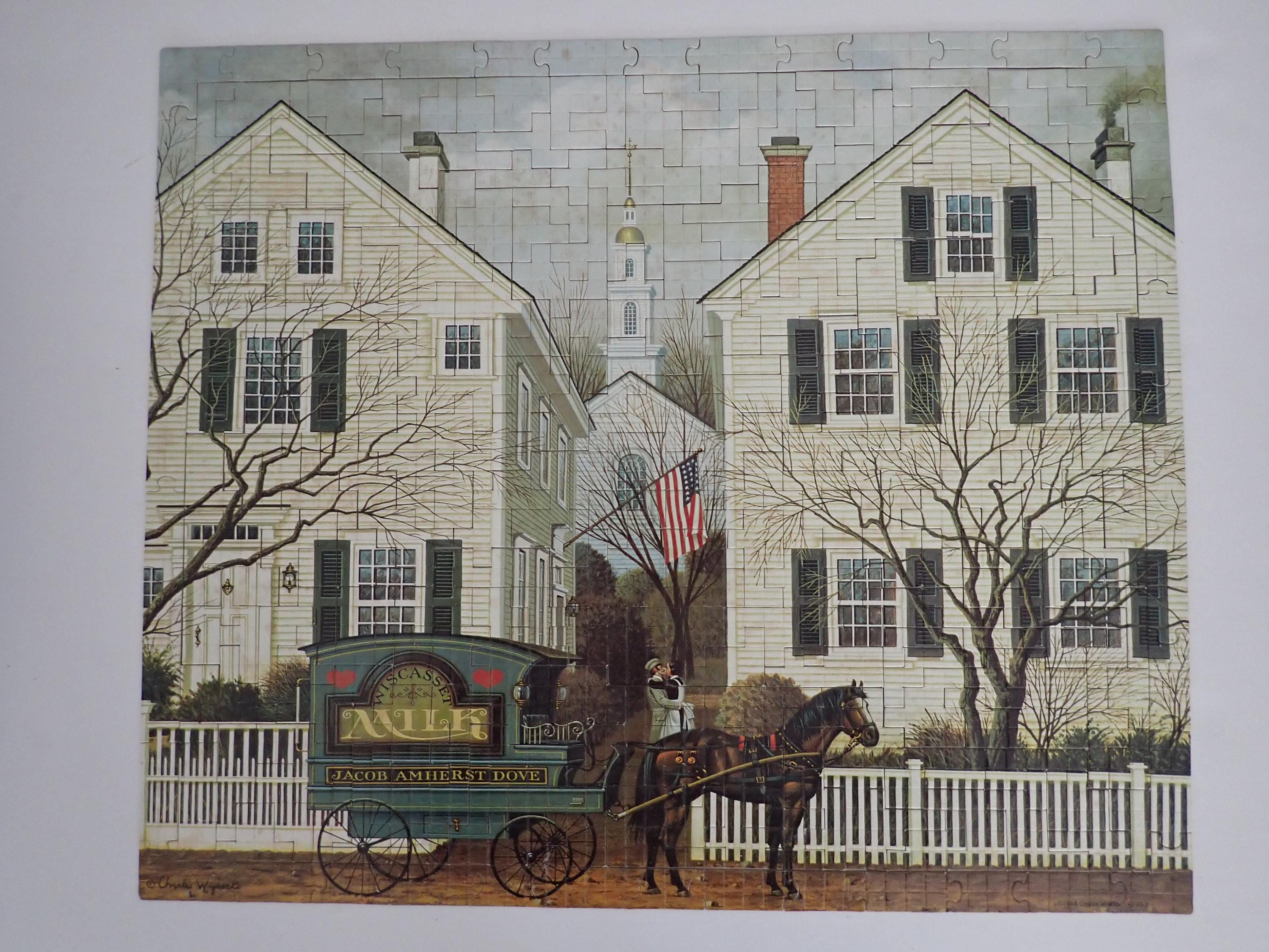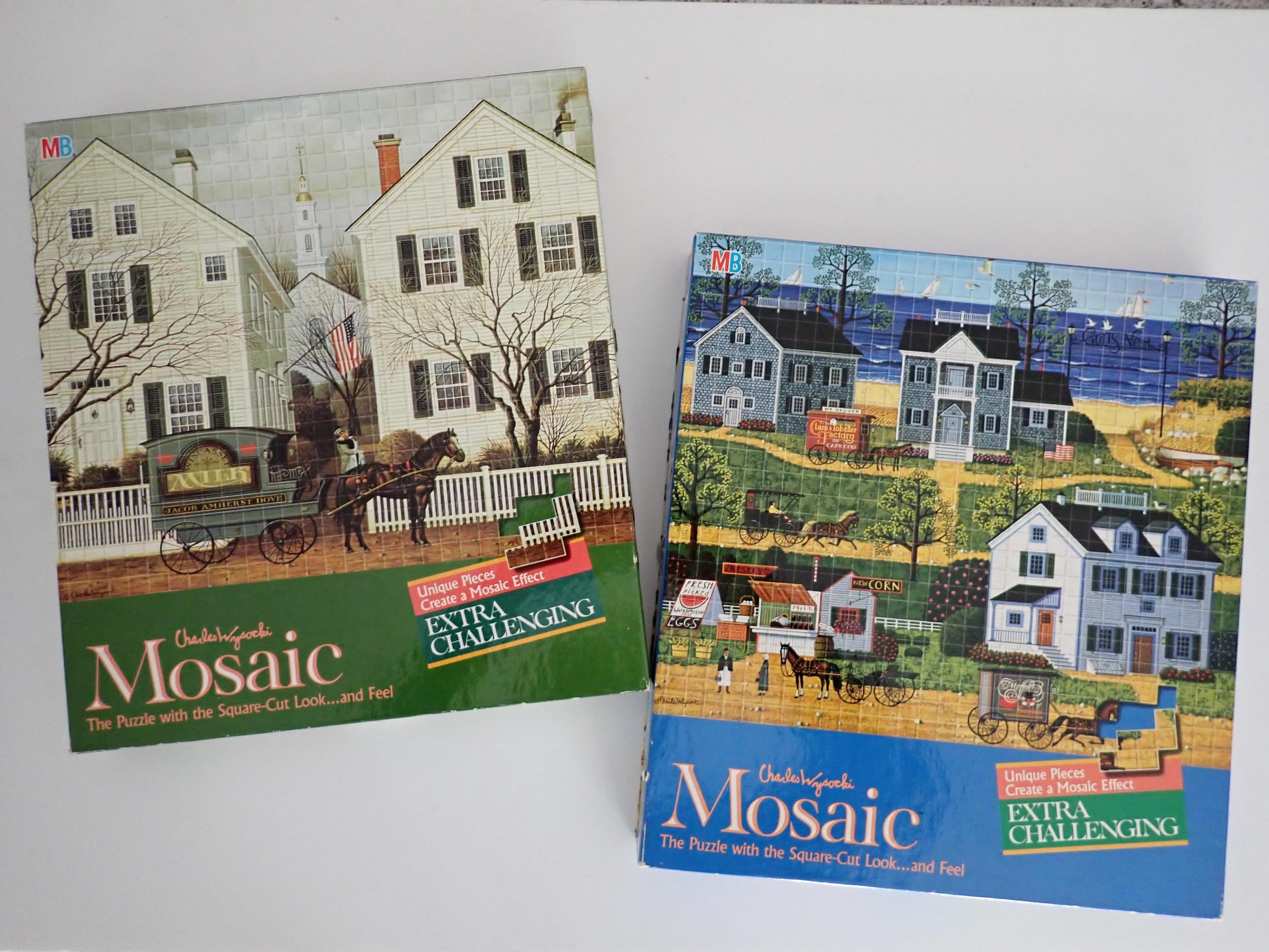 This set of 2 jigsaw puzzles by Charles Wysocki includes 2 mosaic puzzles - the Gulls Nest and Jacob Amherst My Milkman. Both puzzles feature unique mosaic, square cut puzzle pieces. The puzzles have a finished size of 17" x 20". The box does not state the number of pieces but these are 300 piece puzzles. Both puzzles are in very good condition with no missing pieces and no damage to any of the pieces. The boxes are in nice condition but do have some tape on the edges.