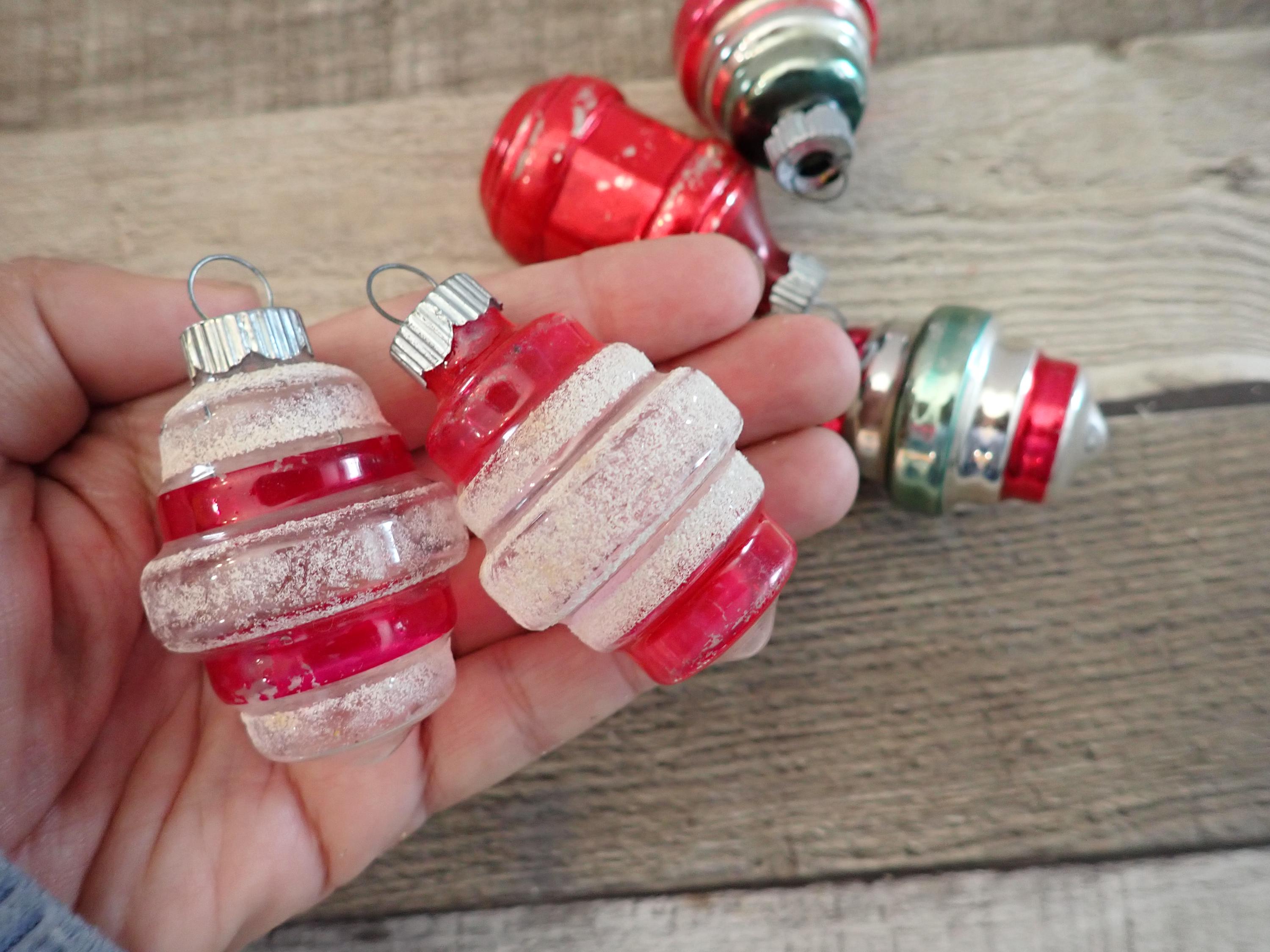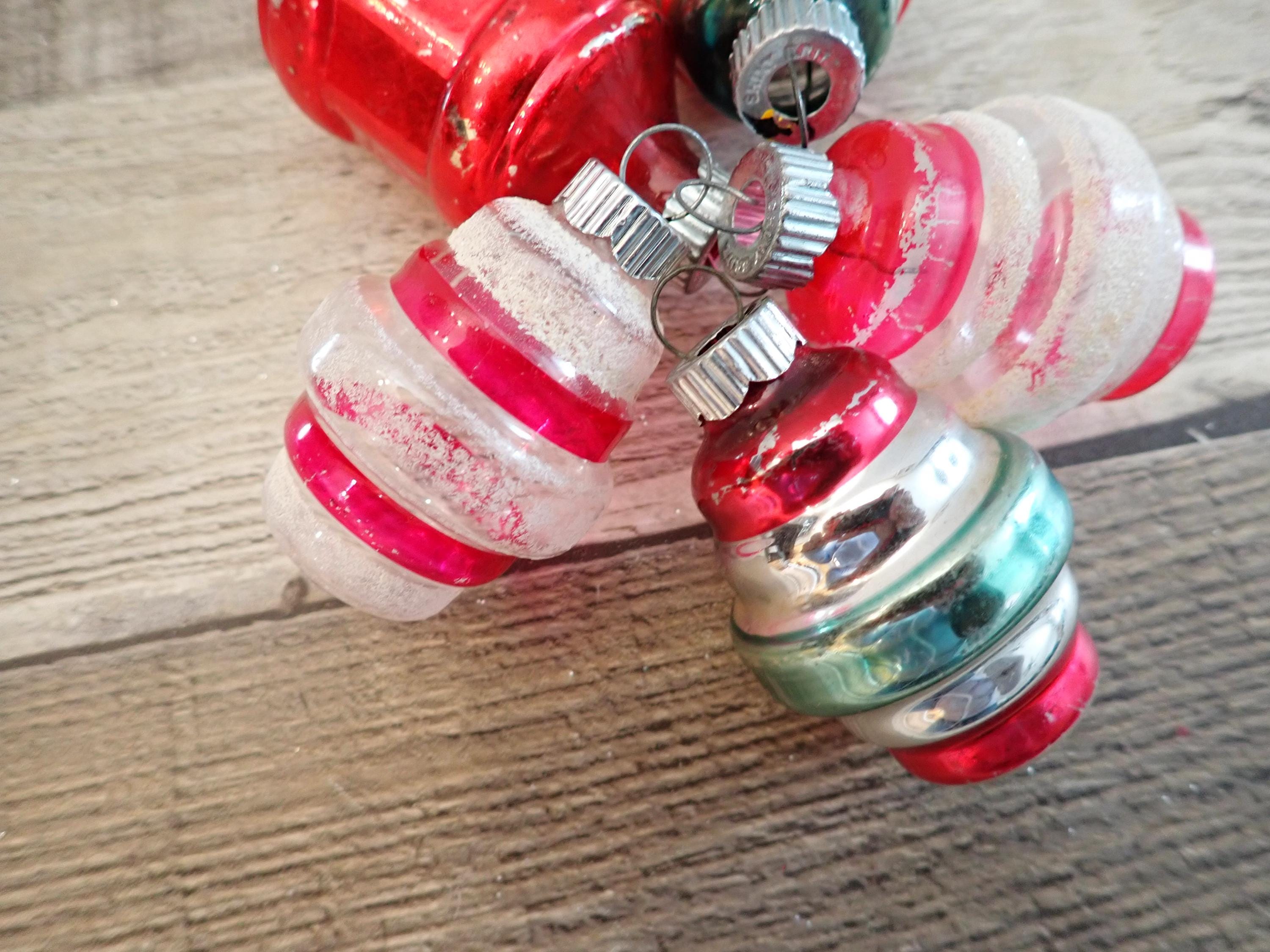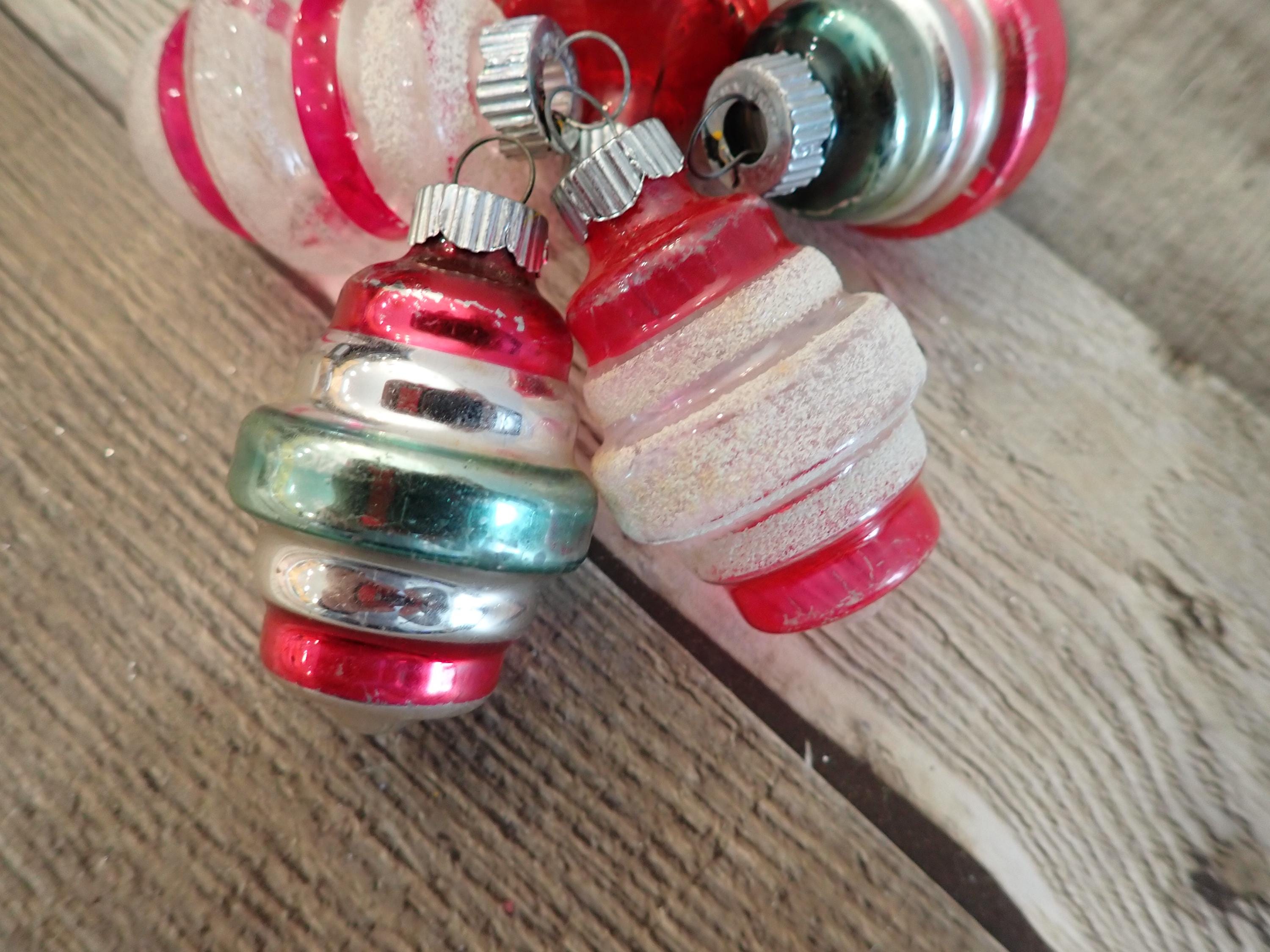 This set of glass UFO and barrel shaped ornaments includes 5 ornaments - 2 of which are unsilvered. There are 4 ornaments in the same shape - 2 are silvered and 2 are not They have striped designs in red, white, and blue. There is one additional coordinating solid red barrel ornament. The ornaments are 2.25" tall and 1.5" in diameter, and they all have silver Shiny Brite caps. The ornaments are all in very good condition with no chips or cracks, however there is some fading of color on a few of the ornaments, and some wear to the mica. One of the unsilvered ornaments has a bit more wear the mica than the other. Great set of cool and modern looking ornaments!