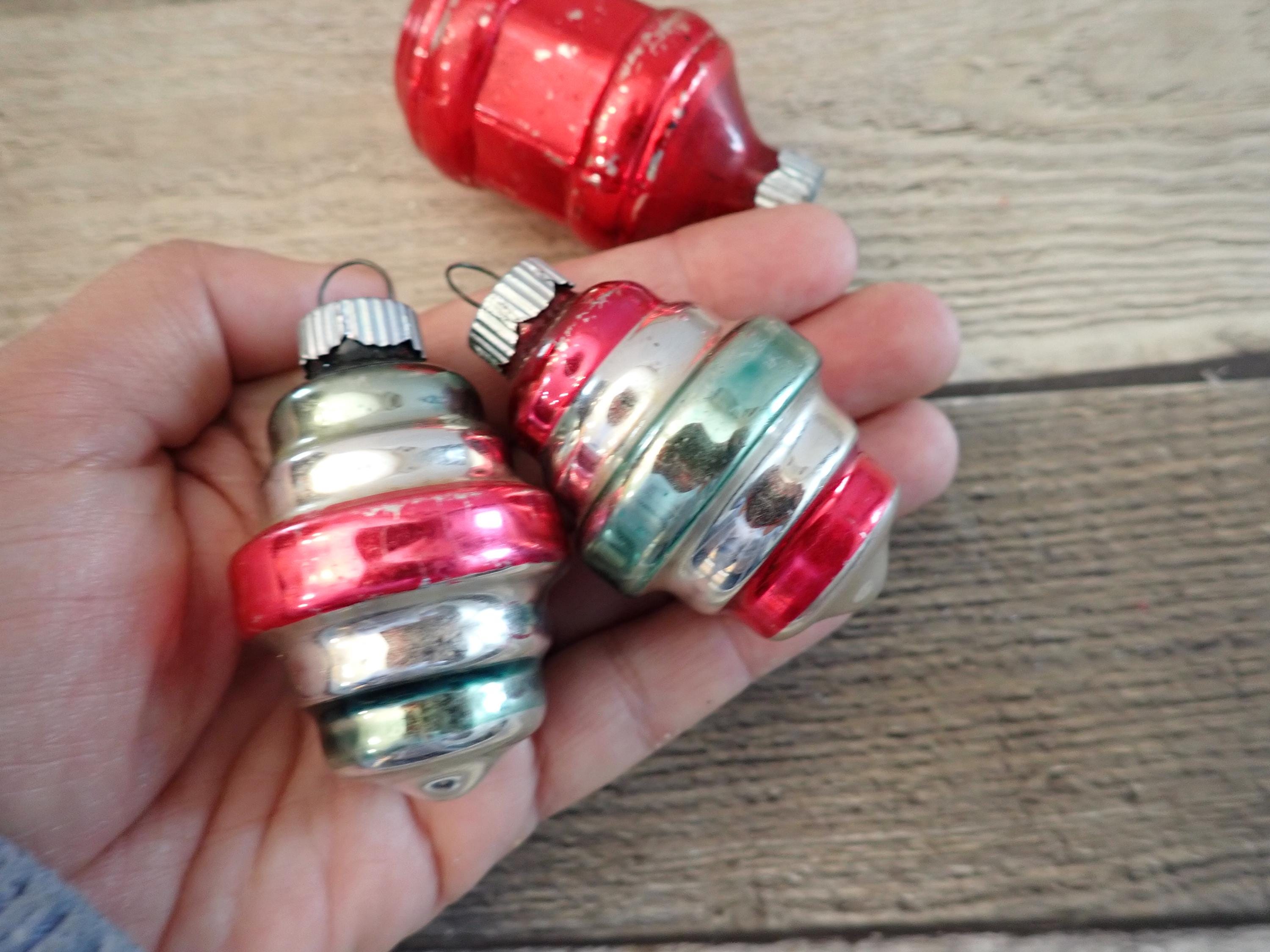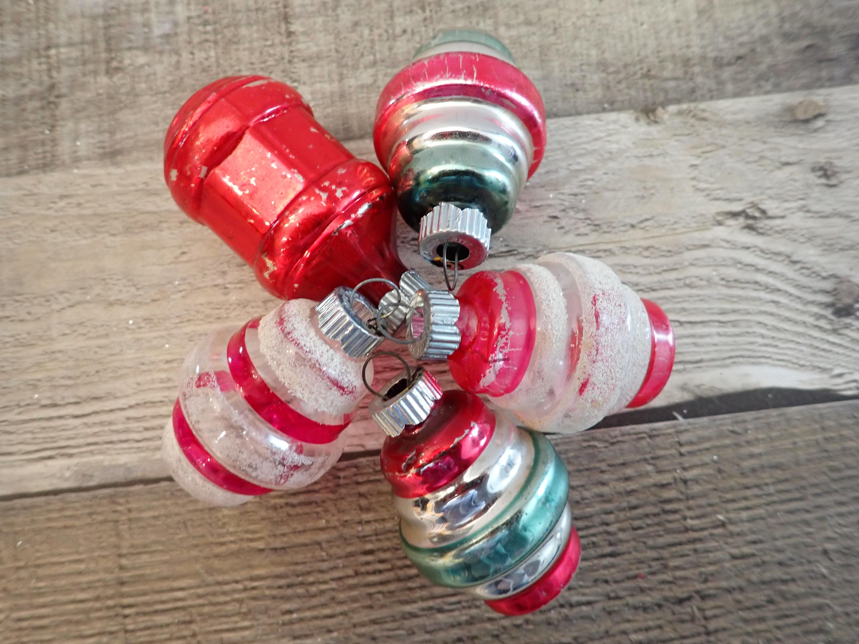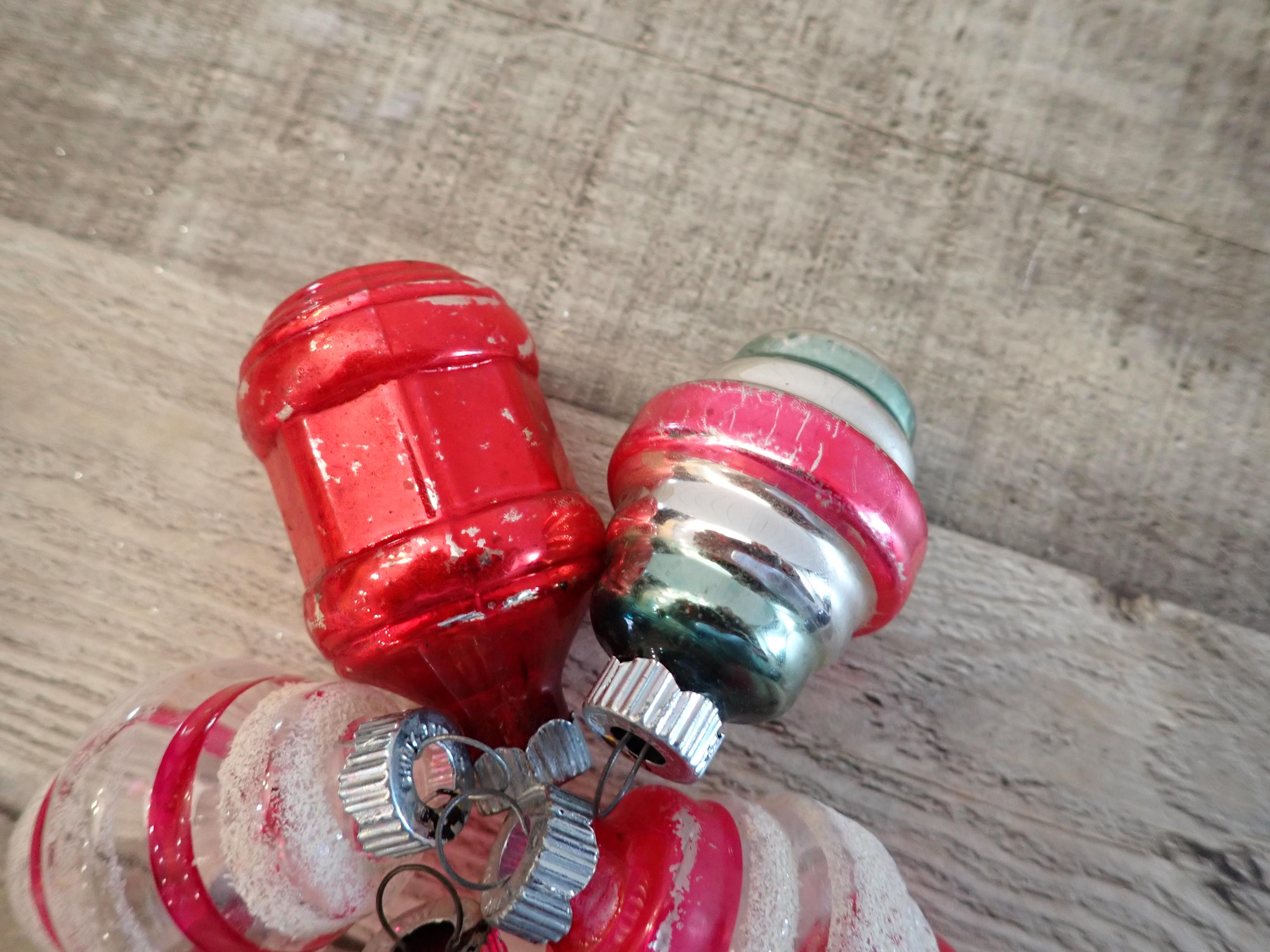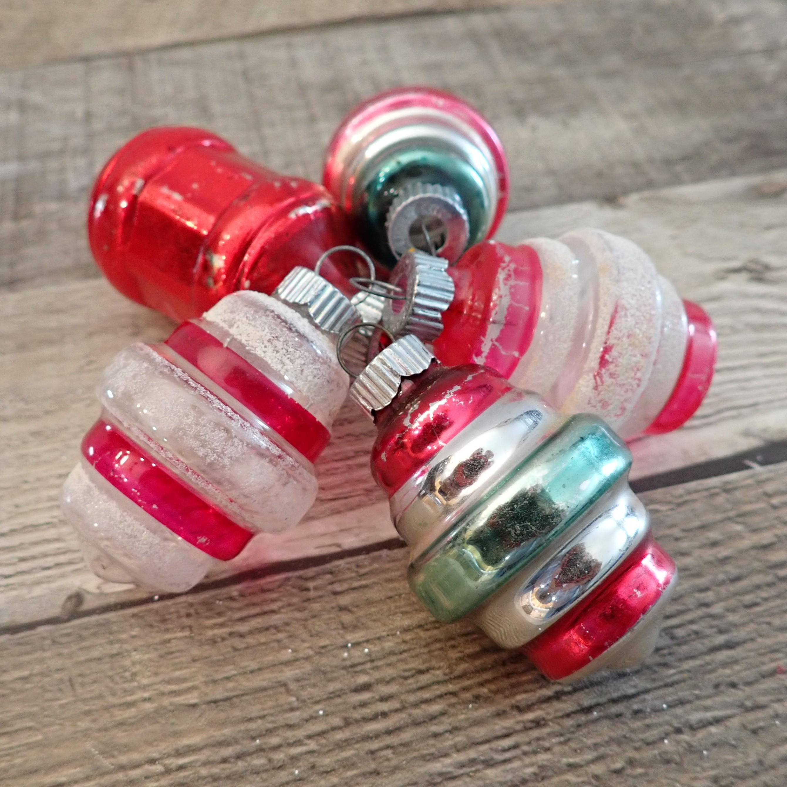 This set of glass UFO and barrel shaped ornaments includes 5 ornaments - 2 of which are unsilvered. There are 4 ornaments in the same shape - 2 are silvered and 2 are not They have striped designs in red, white, and blue. There is one additional coordinating solid red barrel ornament. The ornaments are 2.25" tall and 1.5" in diameter, and they all have silver Shiny Brite caps. The ornaments are all in very good condition with no chips or cracks, however there is some fading of color on a few of the ornaments, and some wear to the mica. One of the unsilvered ornaments has a bit more wear the mica than the other. Great set of cool and modern looking ornaments!