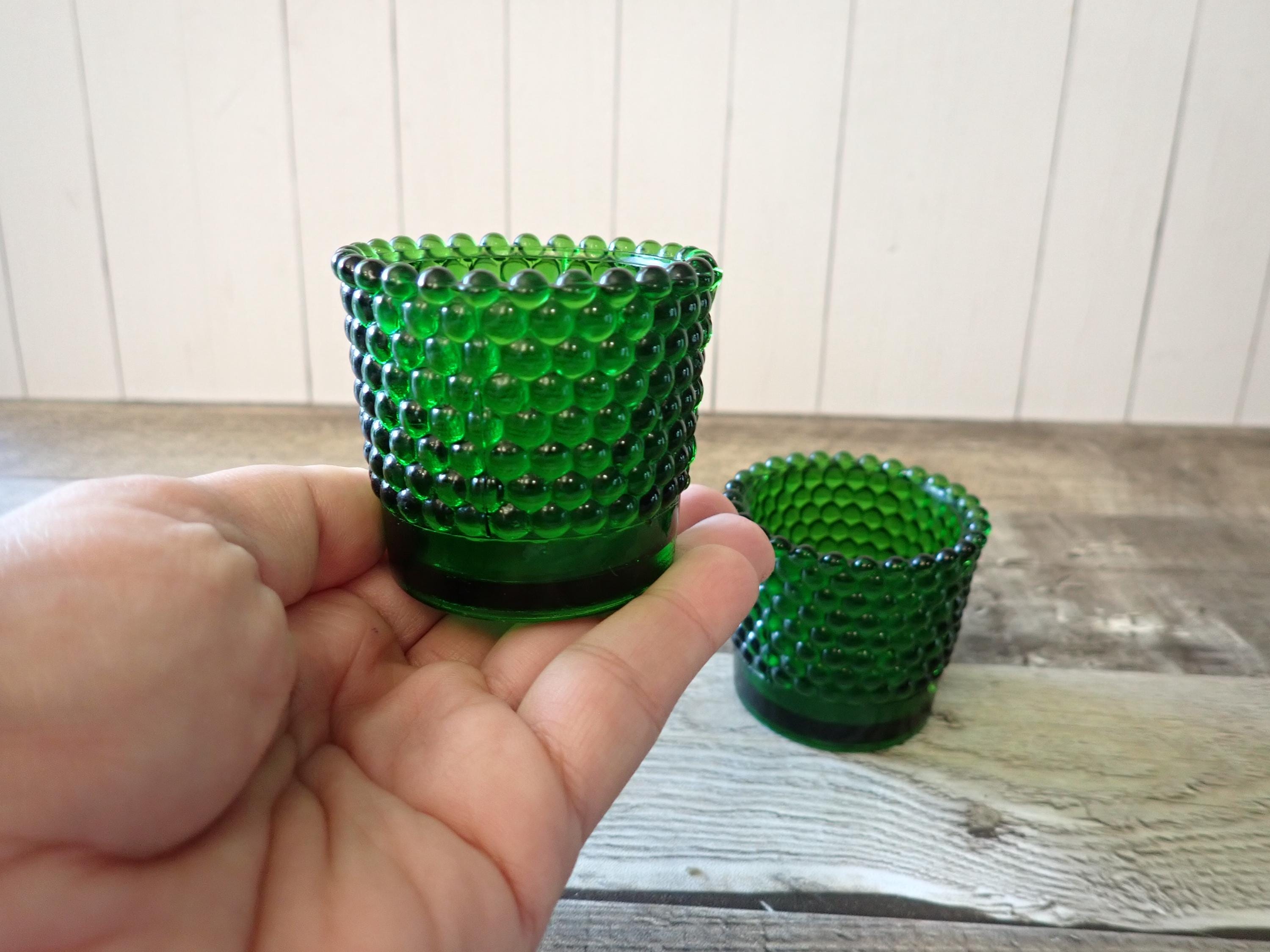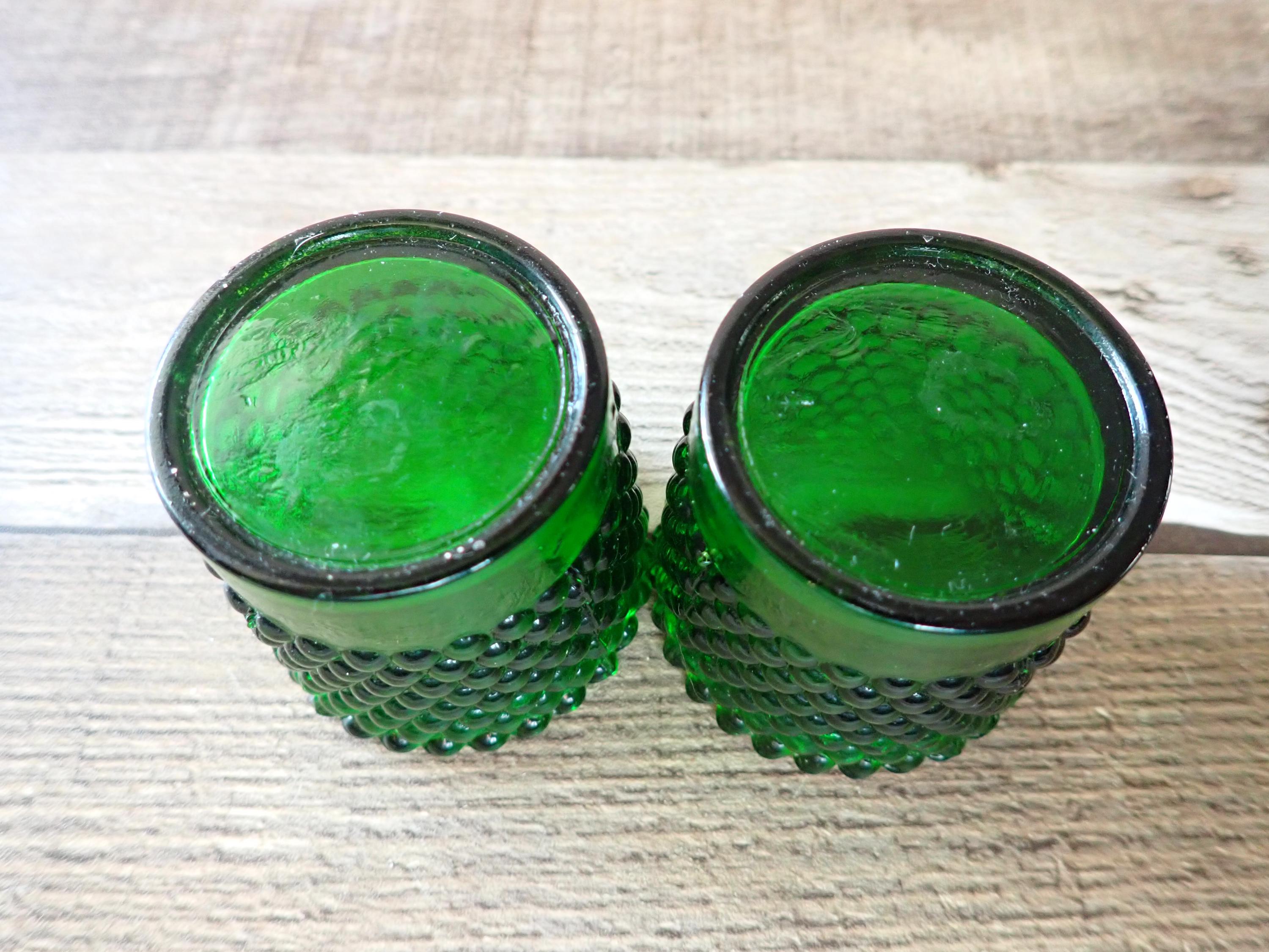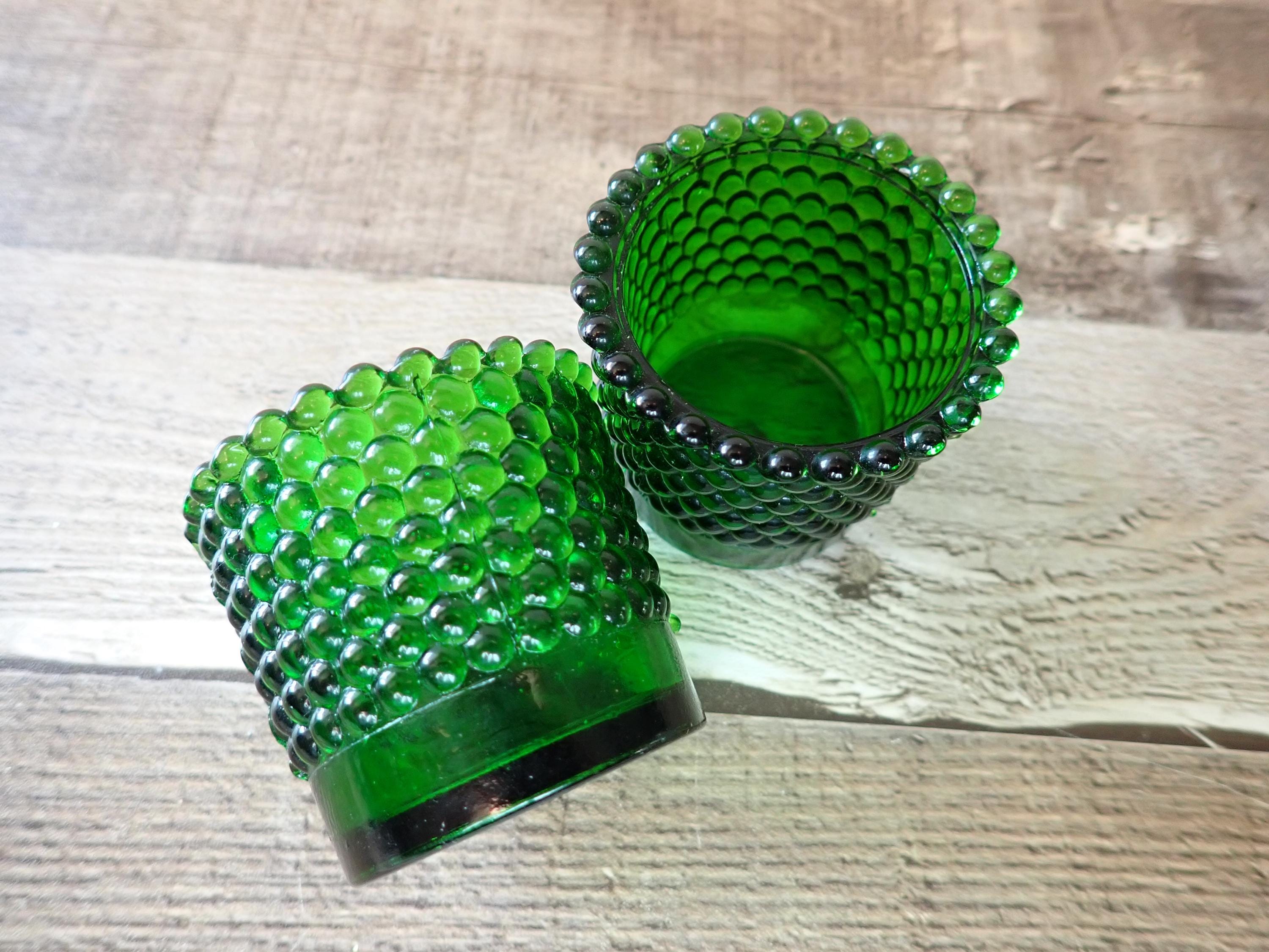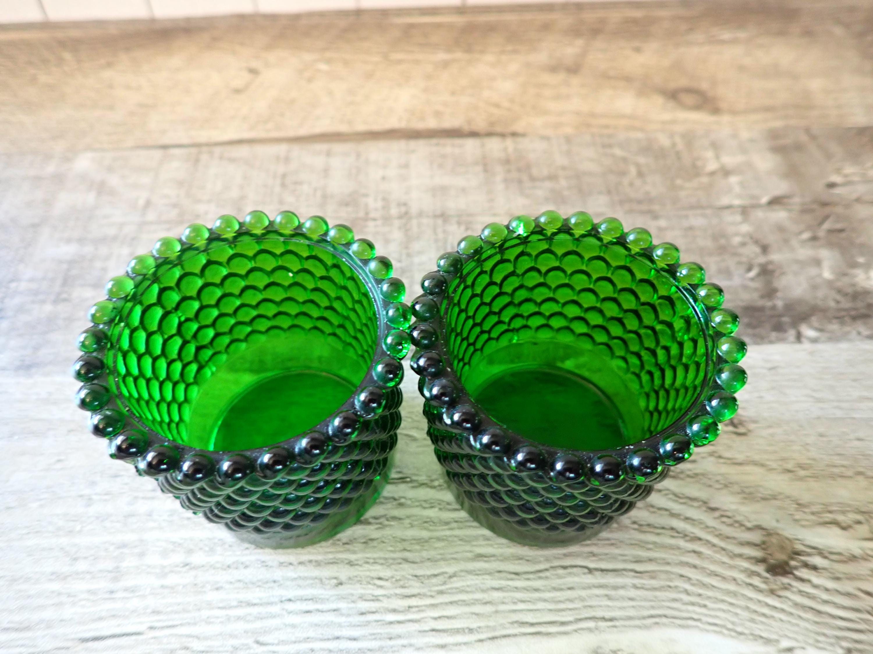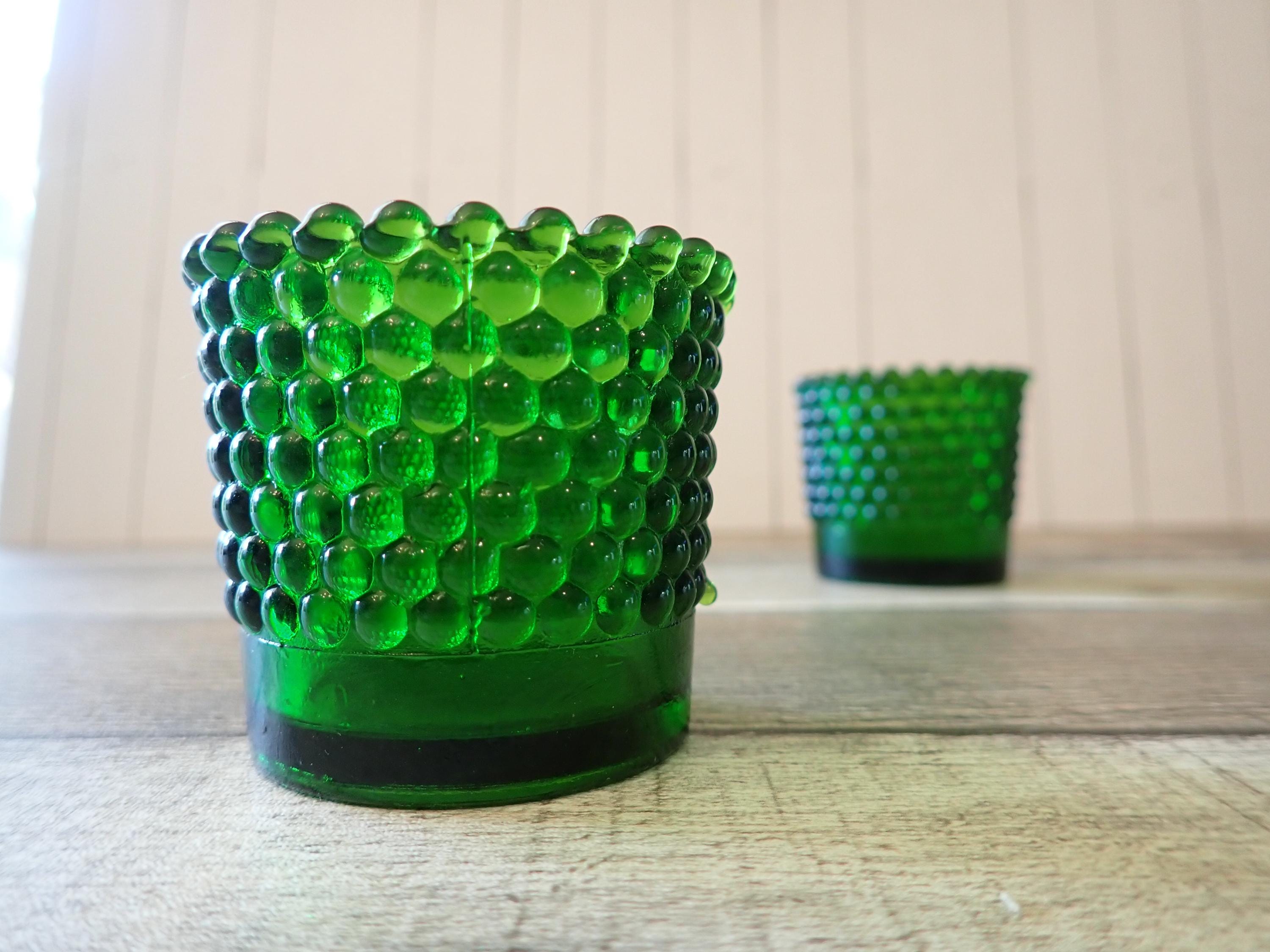 This set of candle holders includes 2 matching green glass candle holders in a Hobnail pattern. They are 2" tall and 2.25" in diameter. They are a green glass with a round base. The opening it 1.75" in diameter to hold a tealight candle or a votive candle. They can also hold a battery operated votive (as is lit in the last photo.) The candle holders are in very nice condition with no chips or cracks. There are 2 sets of votives available if you are looking for a set of 4.