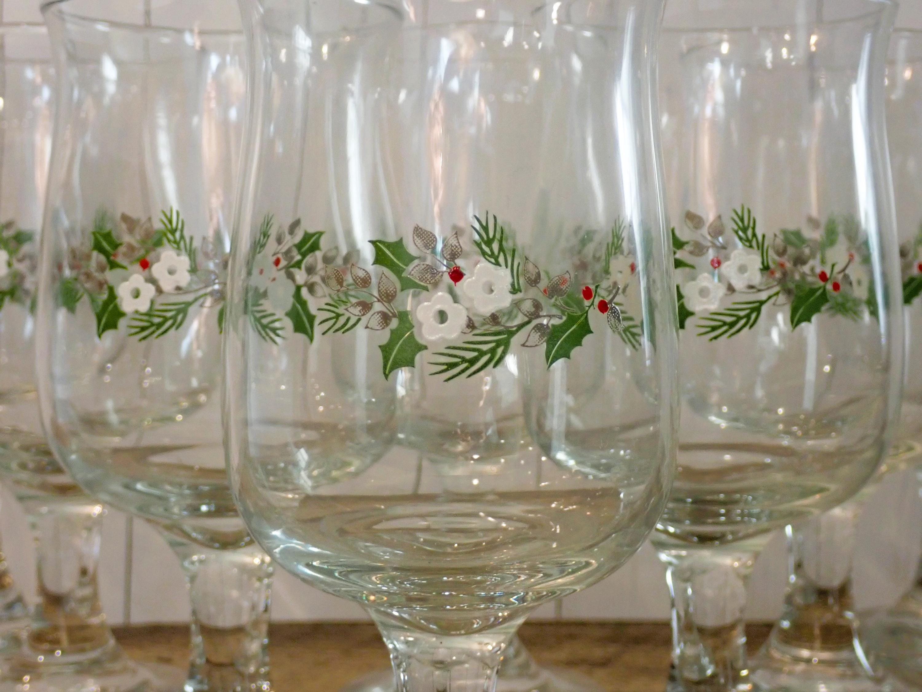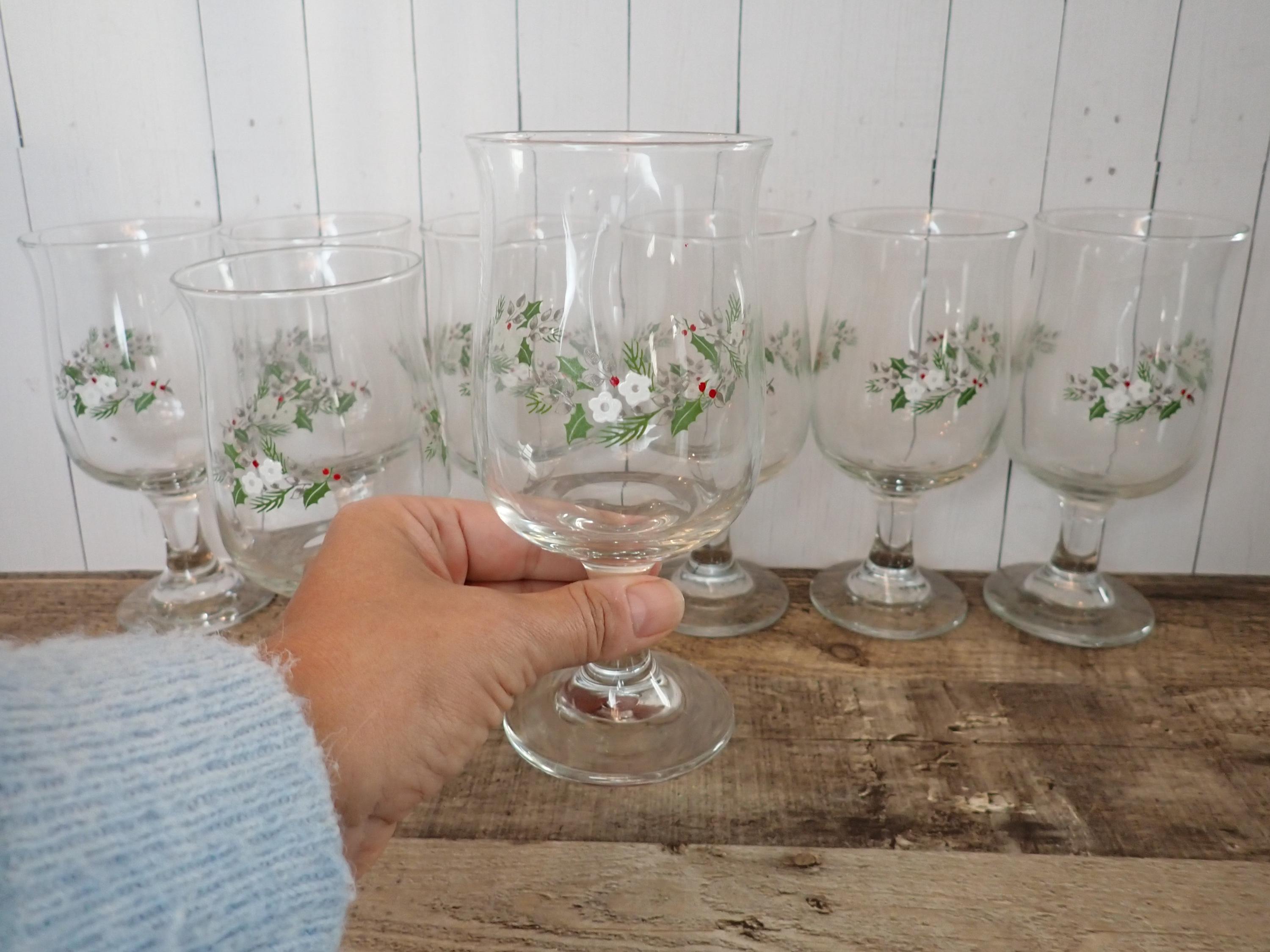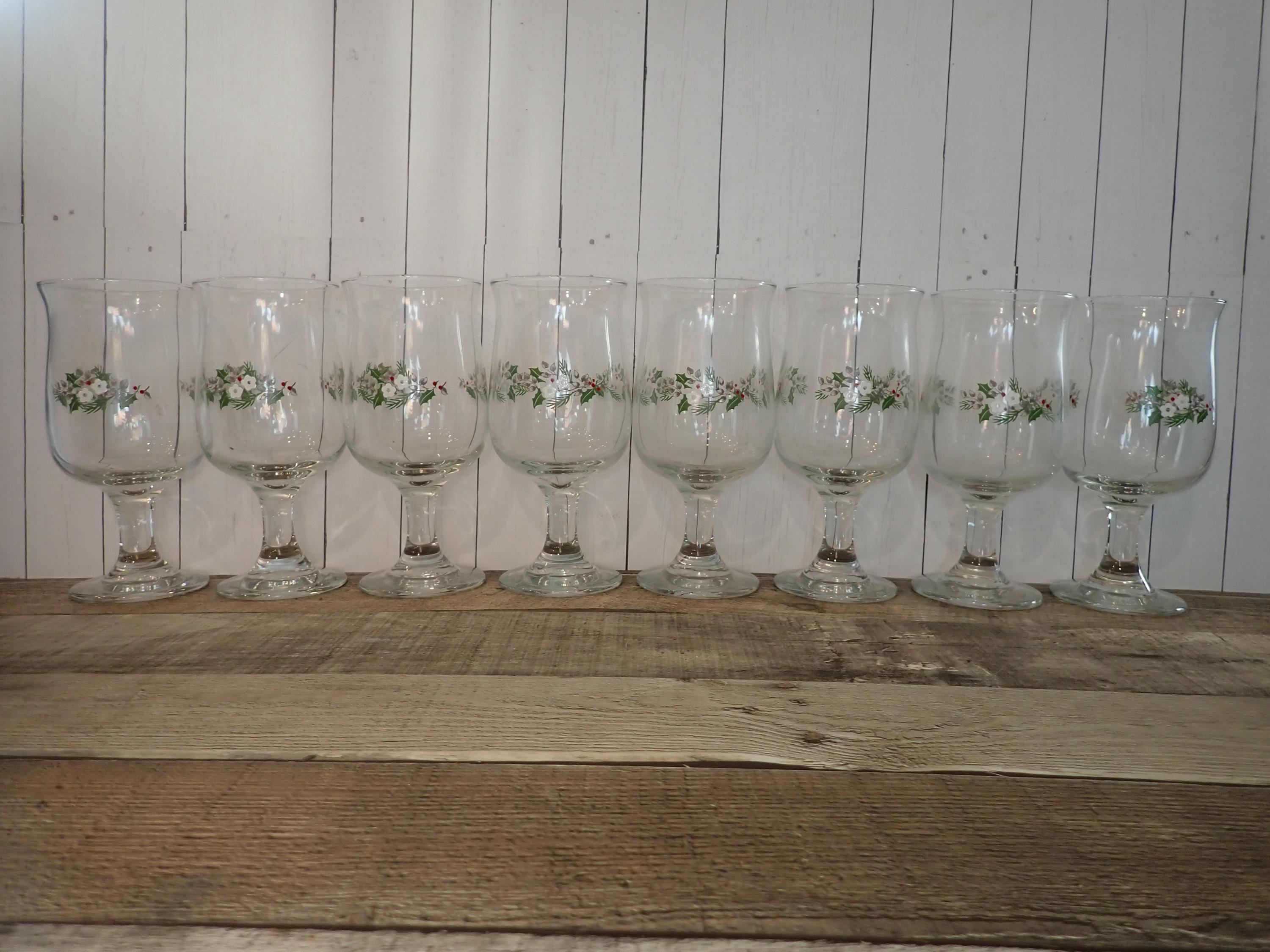 This set of 8 wine glasses by Pfaltzgraff are from the Christmas Heirloom pattern and are 5.5" tall and 3" in diameter. They are a clear glass with a green holly and evergreen branch design, mixed with small white flowers with gray leaves. They are all marked Pfaltzgraff USA on the bottoms. The glasses can hold 10 oz. comfortable, or 12 oz. filled to the rim. All 8 glasses are in very good condition with no chips or cracks, and very few surface scratches. The graphics are bright and clear.