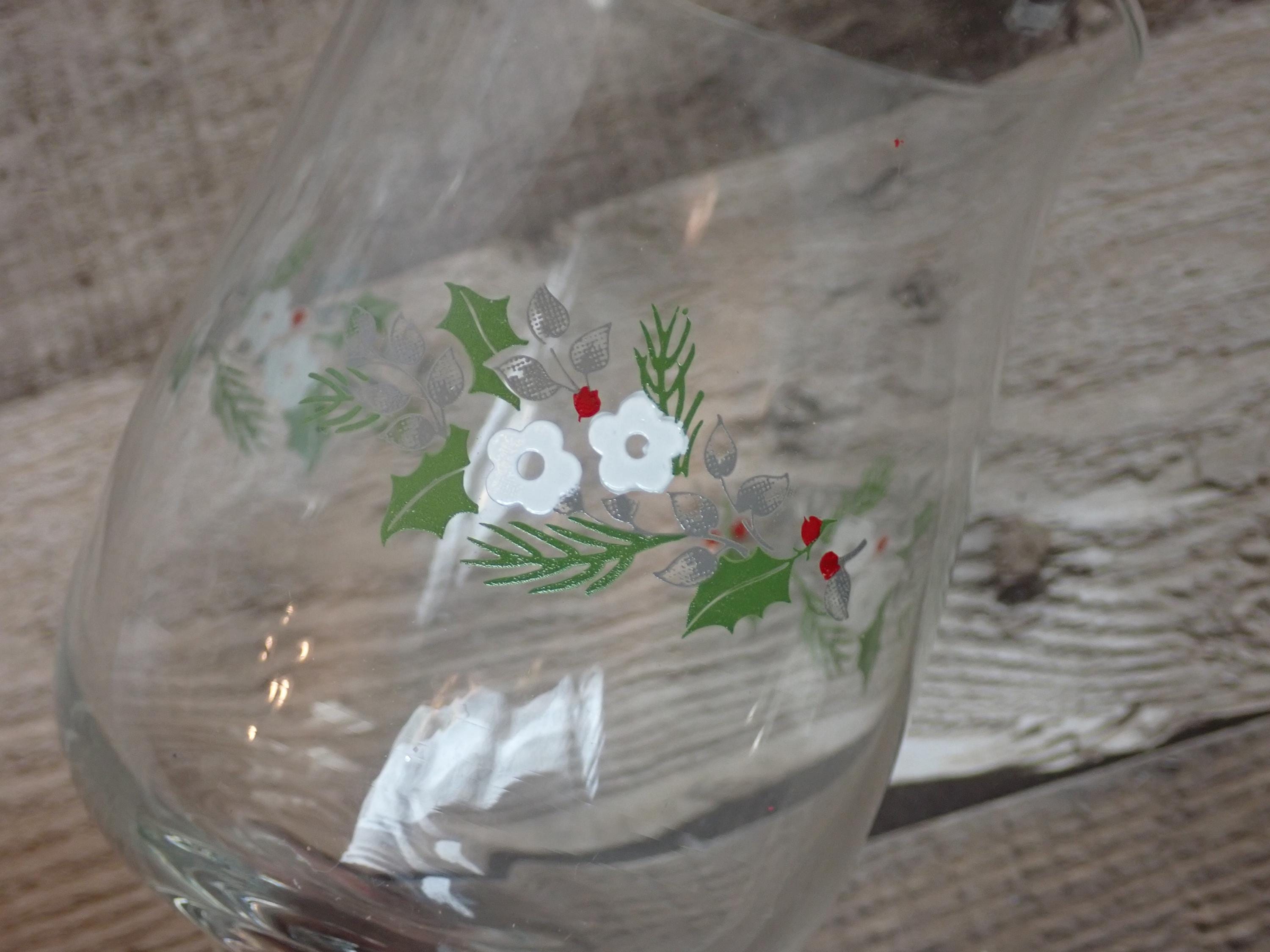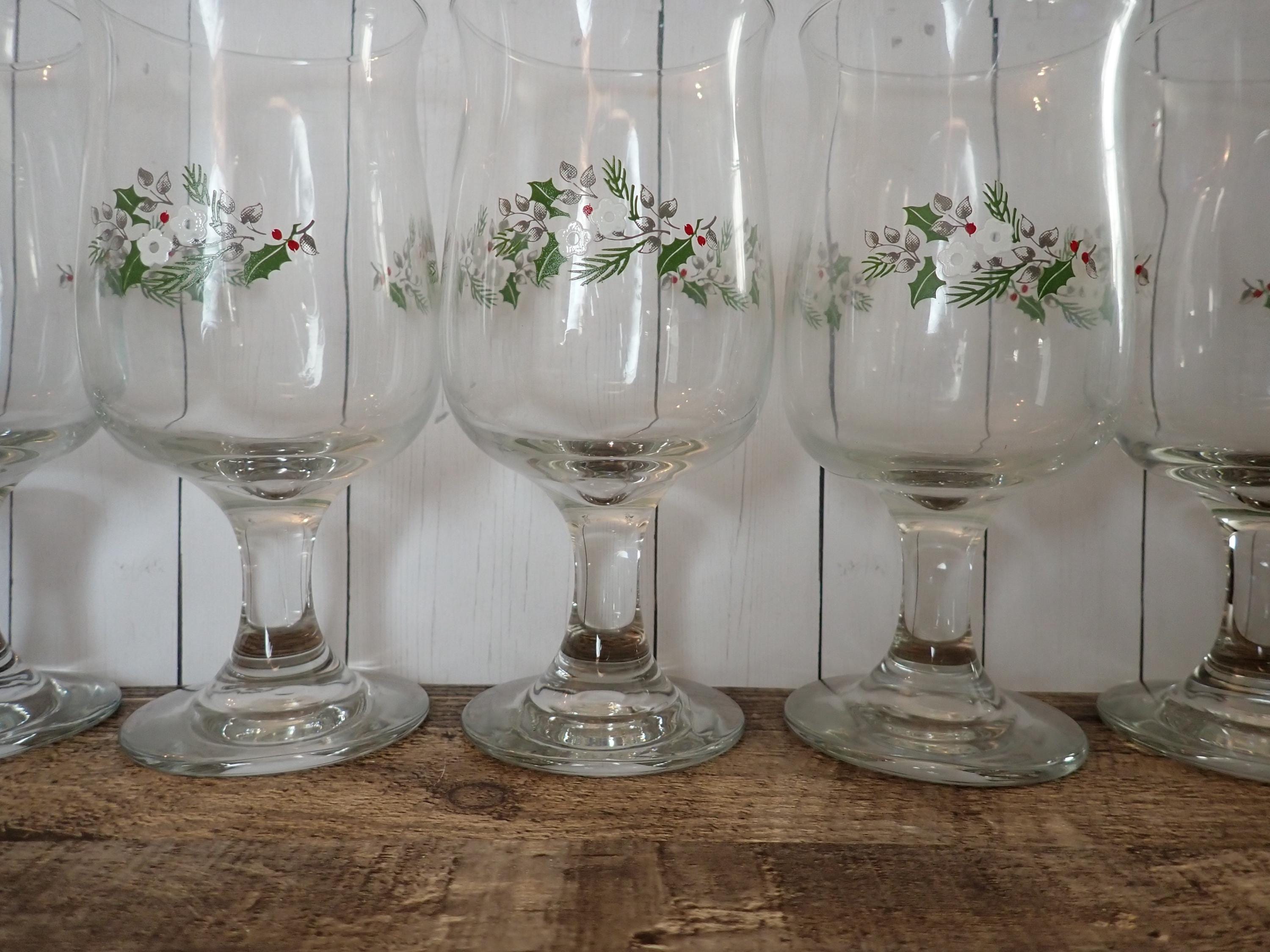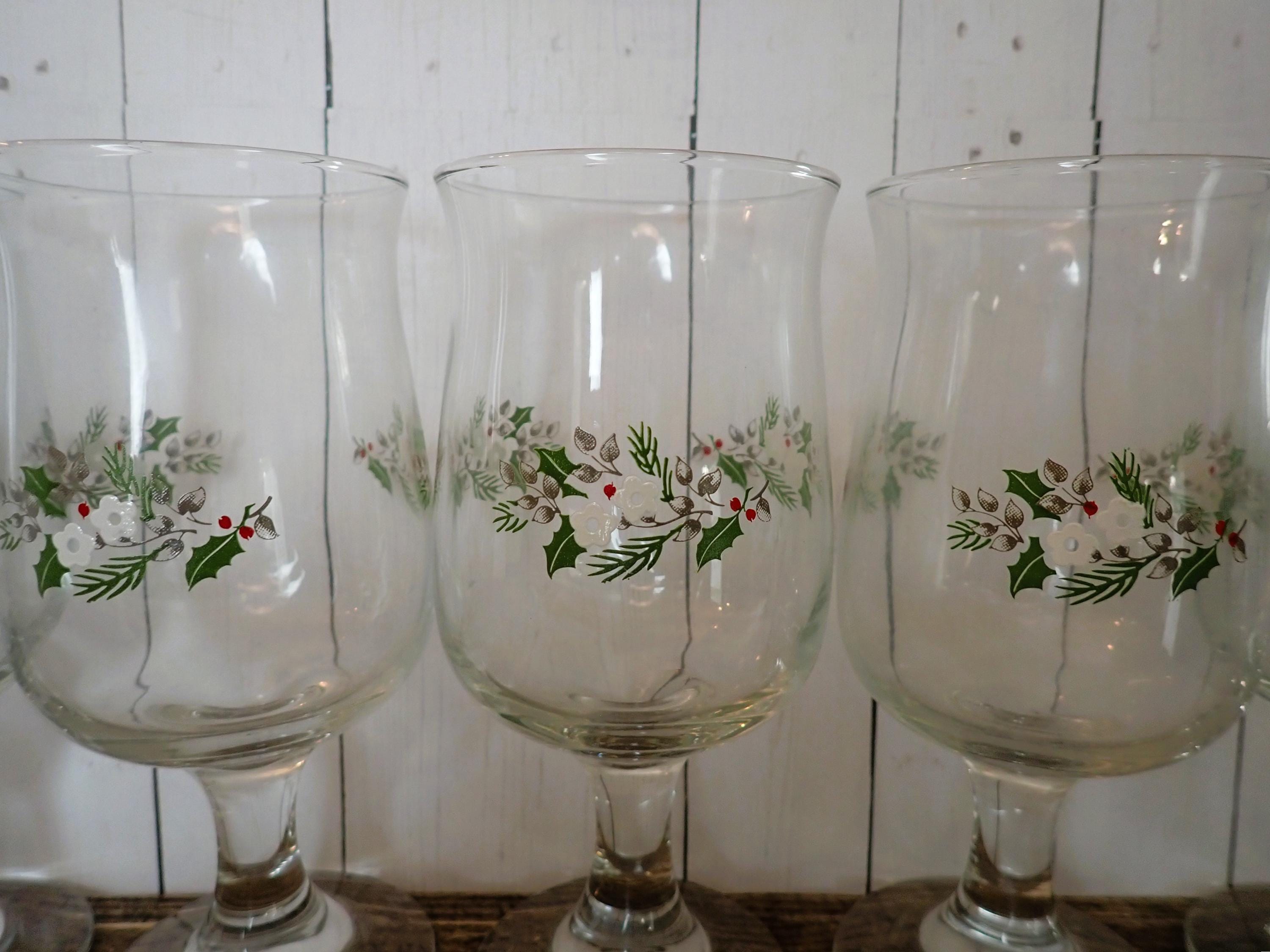 This set of 8 wine glasses by Pfaltzgraff are from the Christmas Heirloom pattern and are 5.5" tall and 3" in diameter. They are a clear glass with a green holly and evergreen branch design, mixed with small white flowers with gray leaves. They are all marked Pfaltzgraff USA on the bottoms. The glasses can hold 10 oz. comfortable, or 12 oz. filled to the rim. All 8 glasses are in very good condition with no chips or cracks, and very few surface scratches. The graphics are bright and clear.