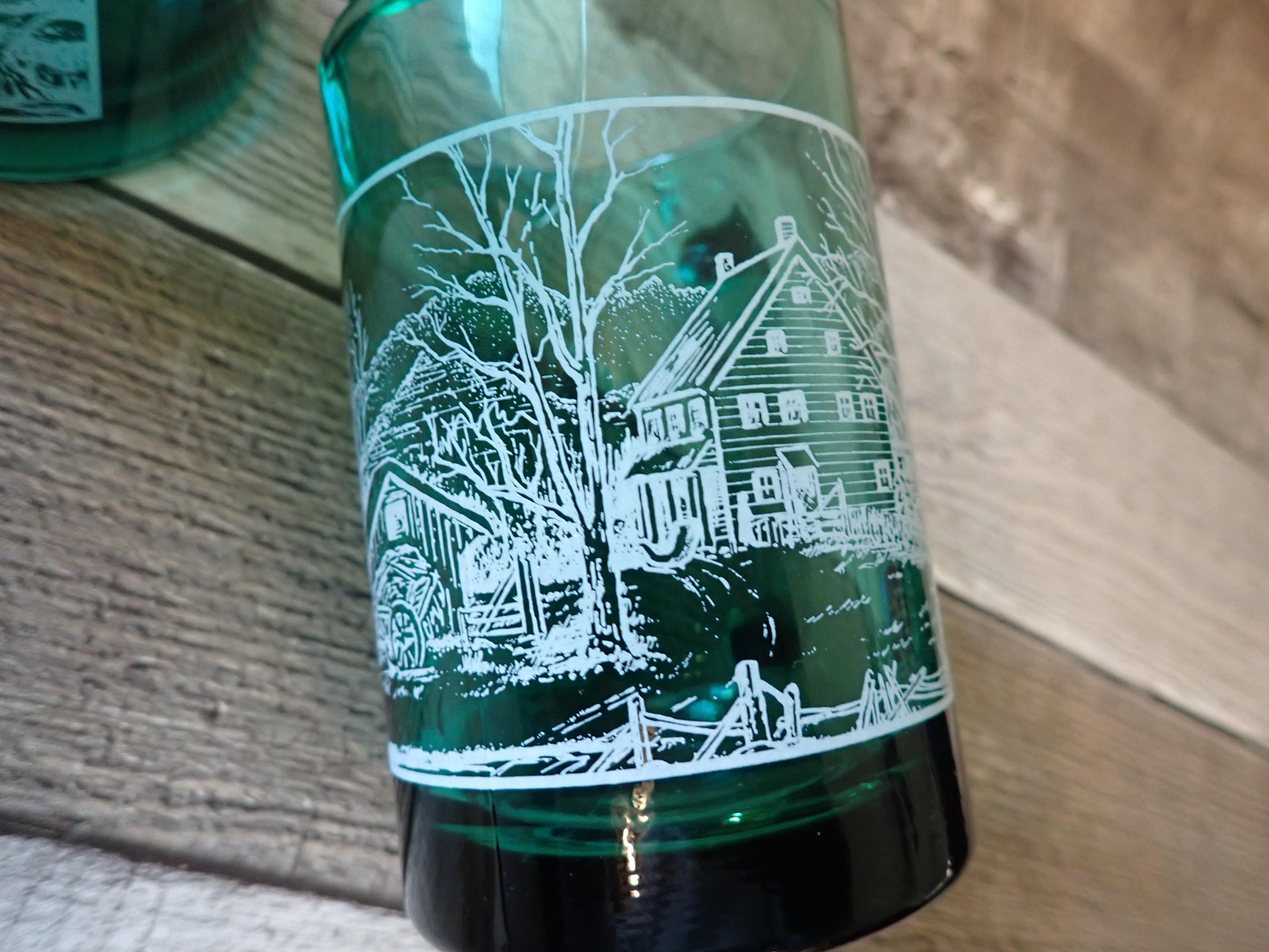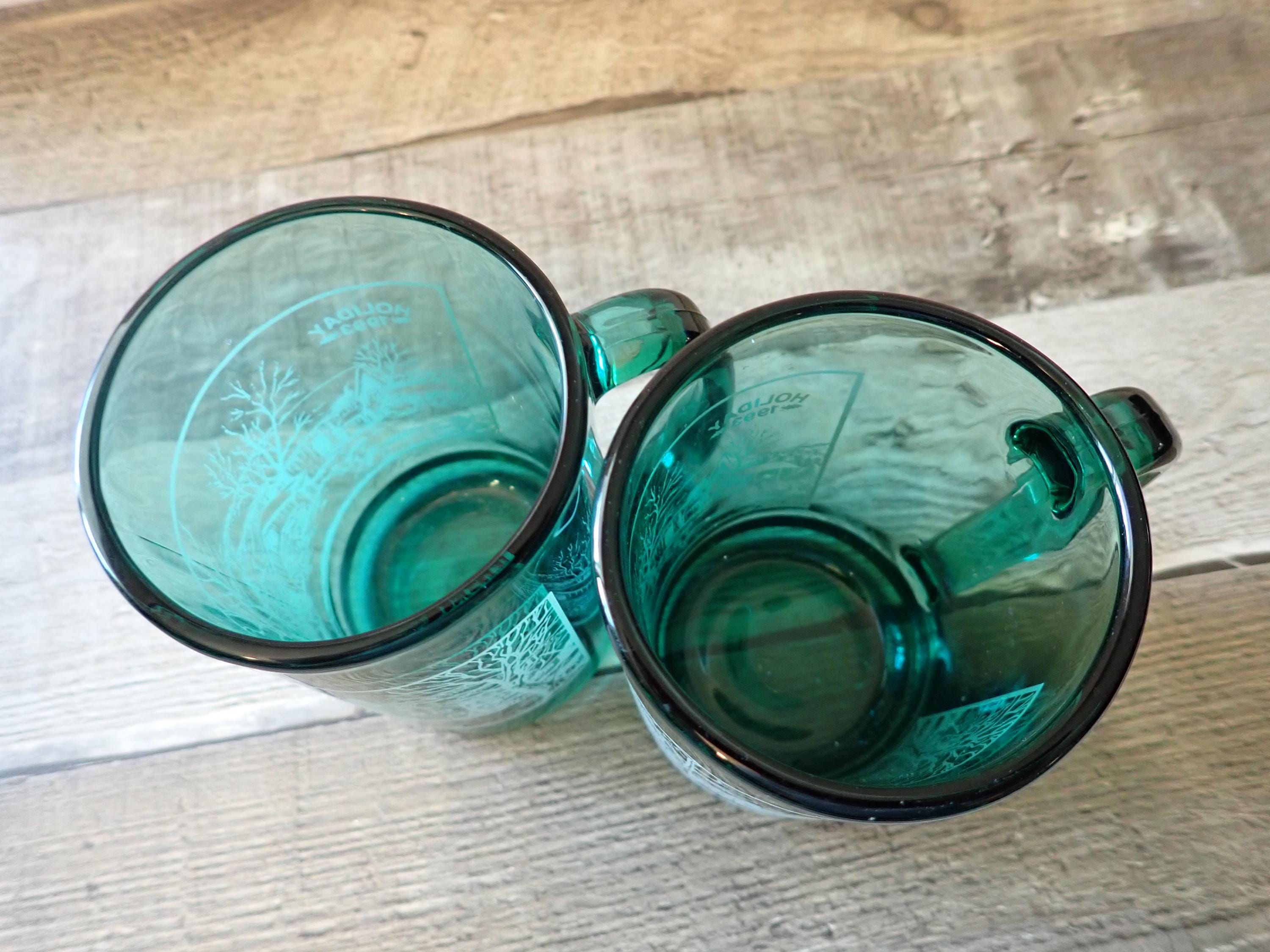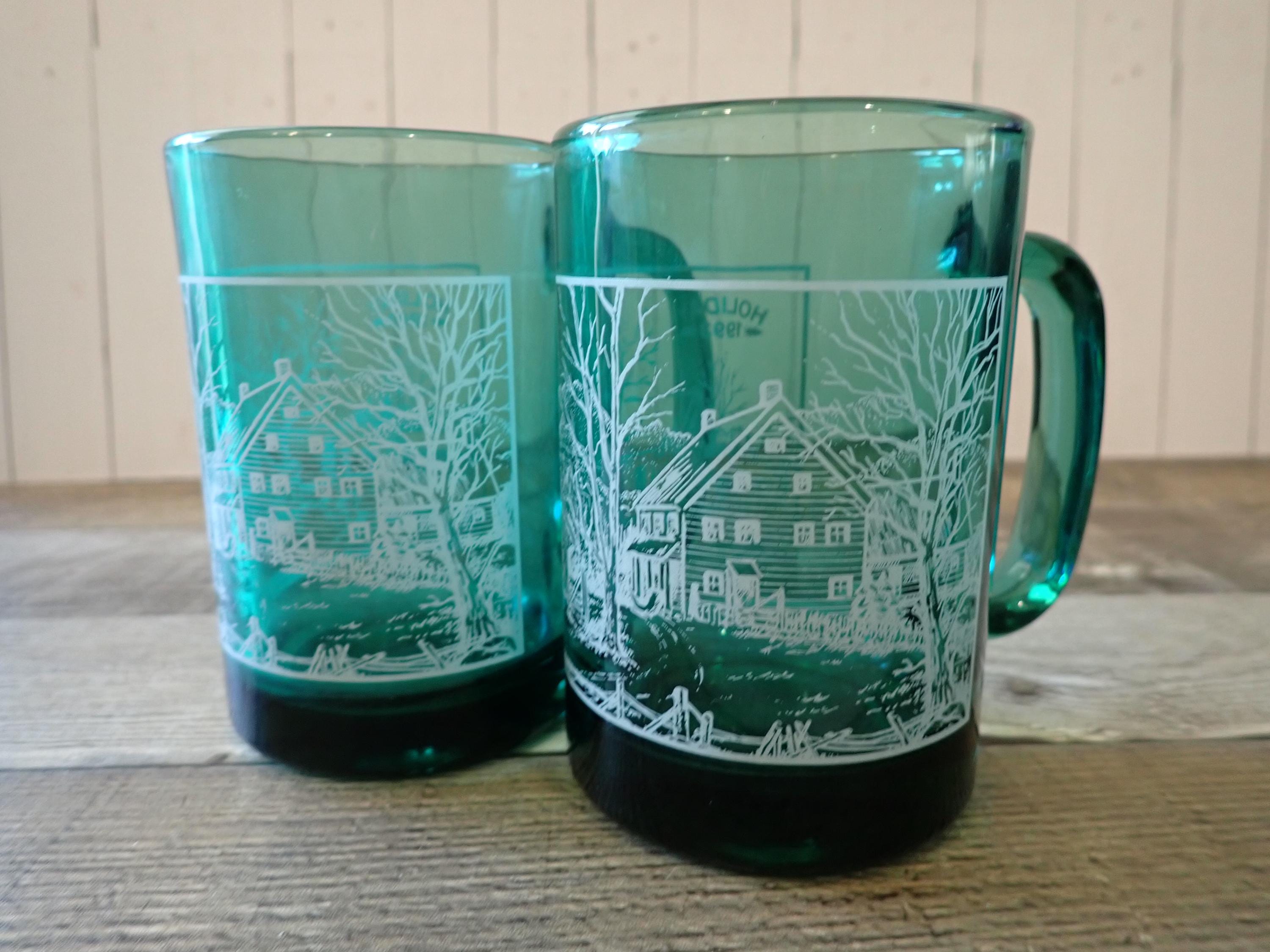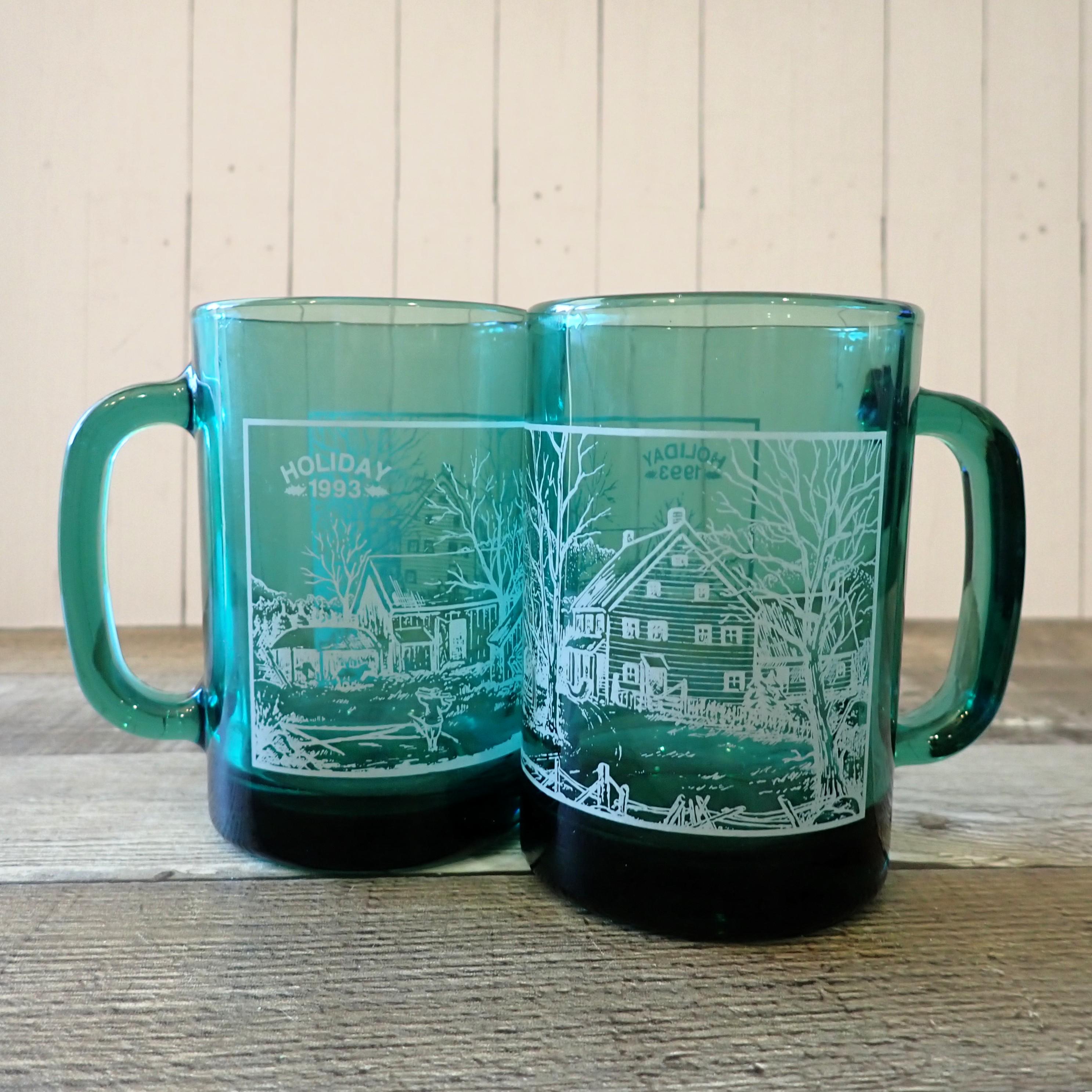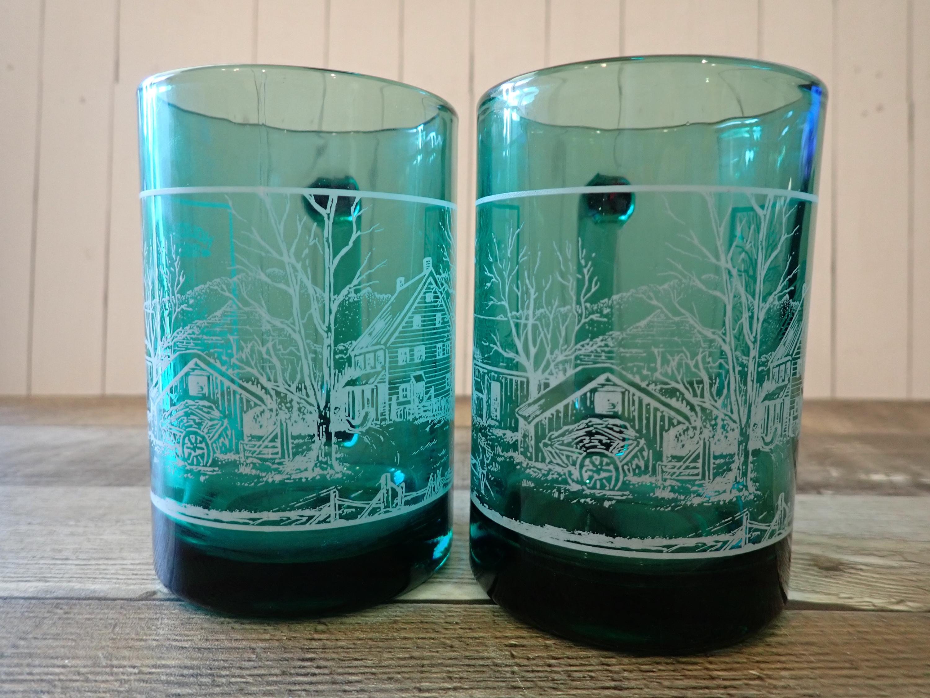 This set of 2 green glass mugs includes 2 matching mugs in an emerald green color. They are a thick, heavy glass and measure 4.25" tall and 3" in diameter. They have a white winter farmhouse scene with trees, barns, and animals. There are no makers marks on the mugs. The mugs can hold 10 oz. filled to the rim. Both mugs are in very good condition with no chips or cracks, and the white graphics are intact and bright. Great set of green glass mugs!