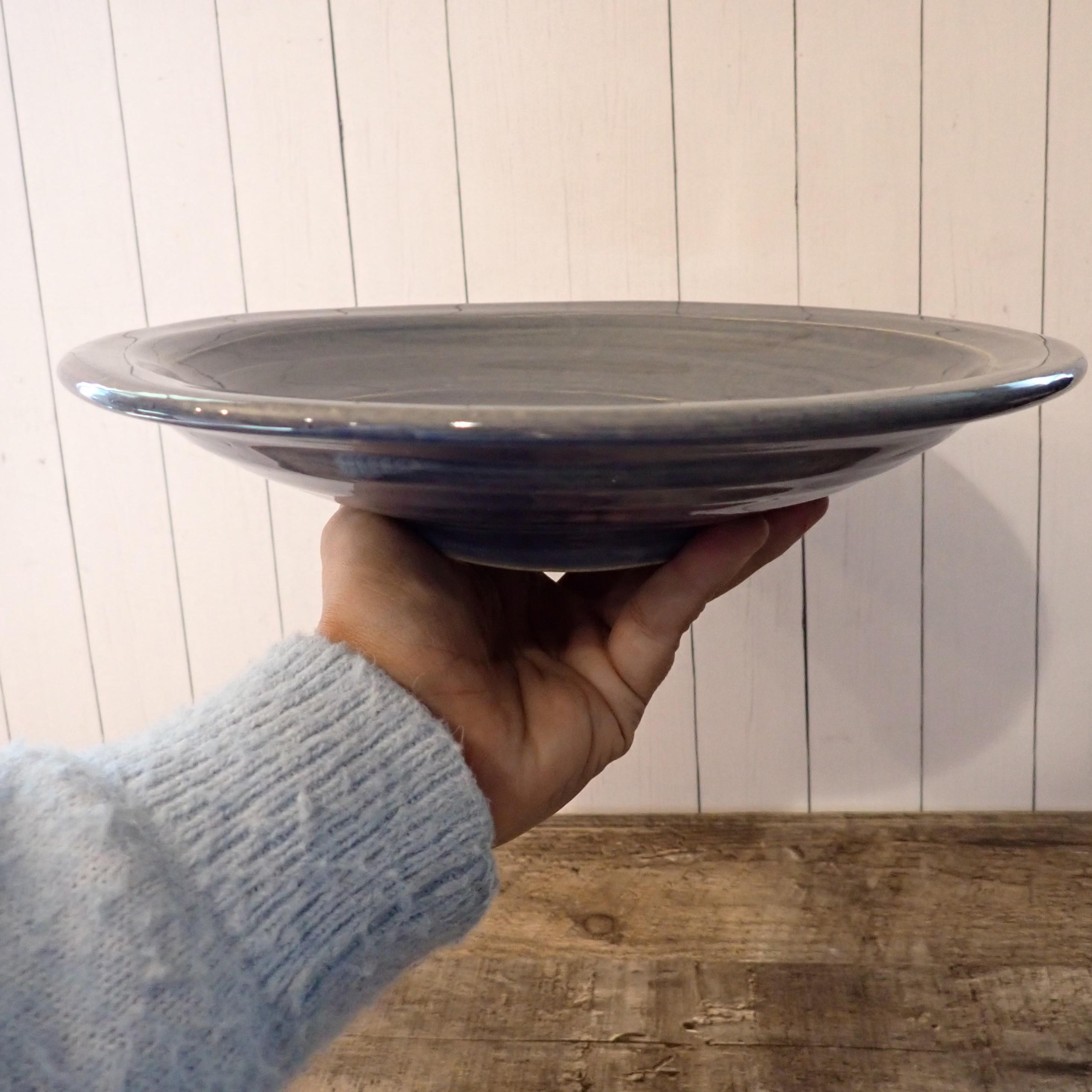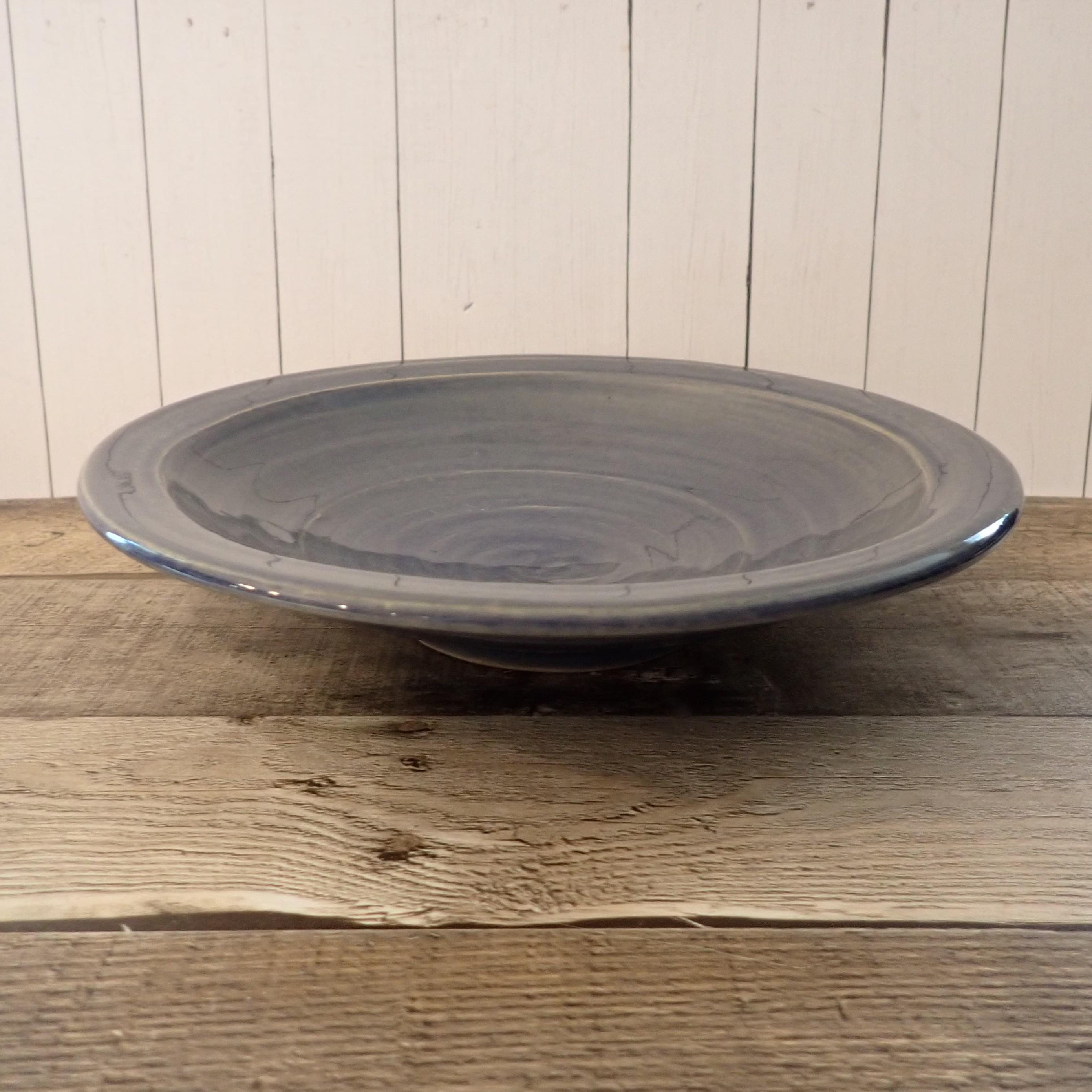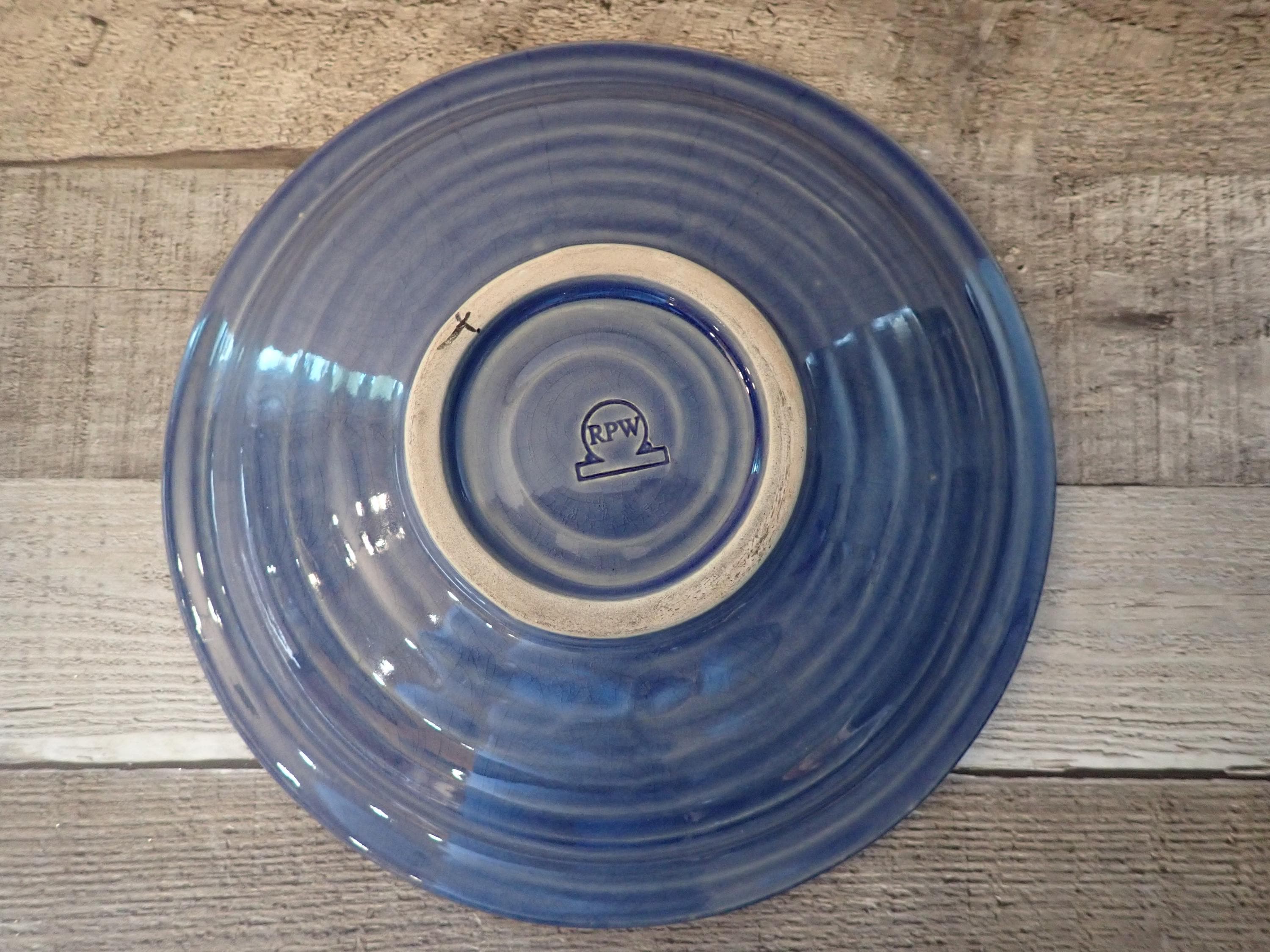 This Rowe Pottery Works soup or pasta bowl is 9.5" in diameter and 2" tall. The bowl is a gray stoneware and has a solid blue glaze on the bowl. The bottom of the bowl is with the Rowe Pottery Works Logo. The bowl is in very good condition with no chips or cracks.