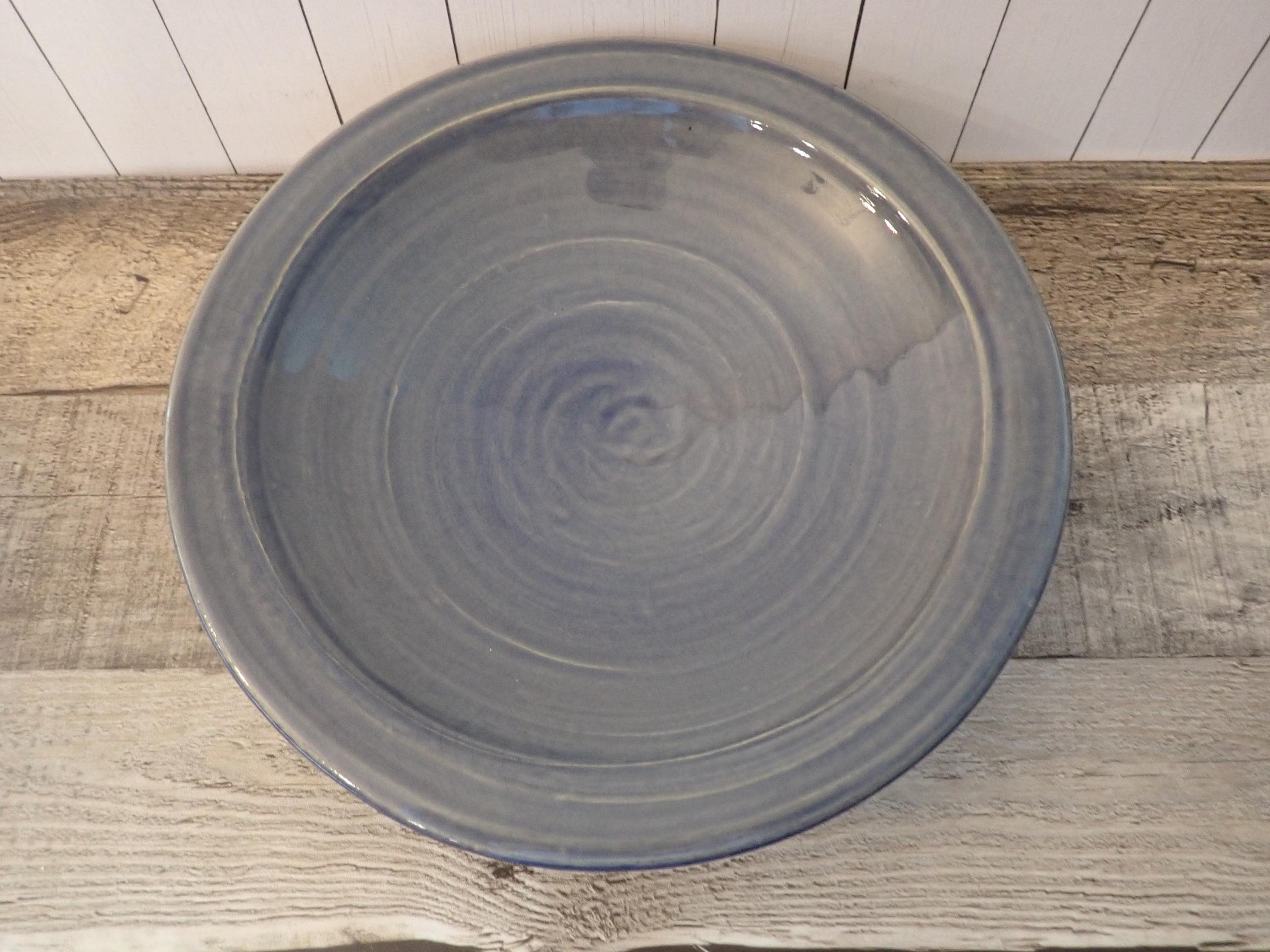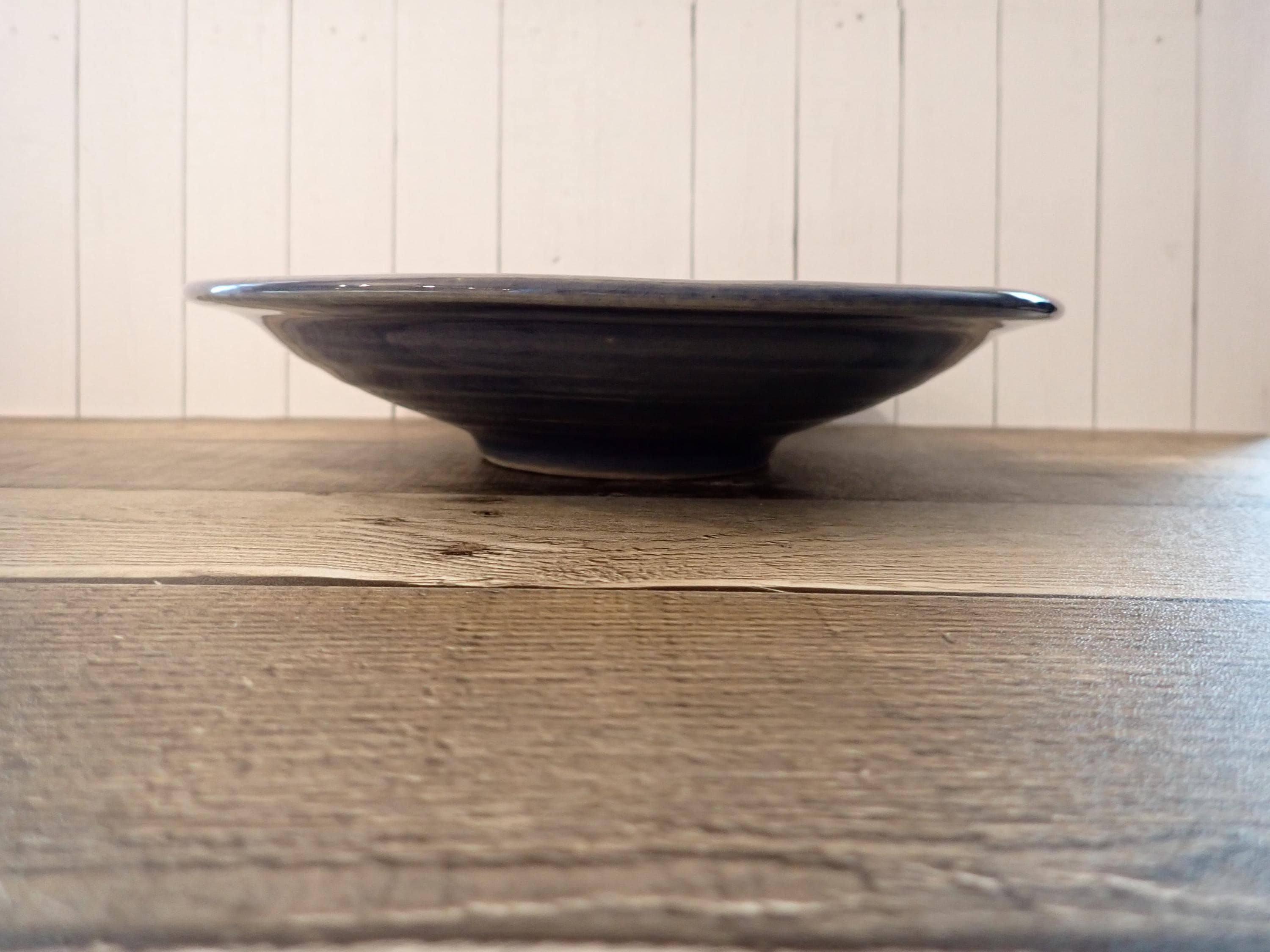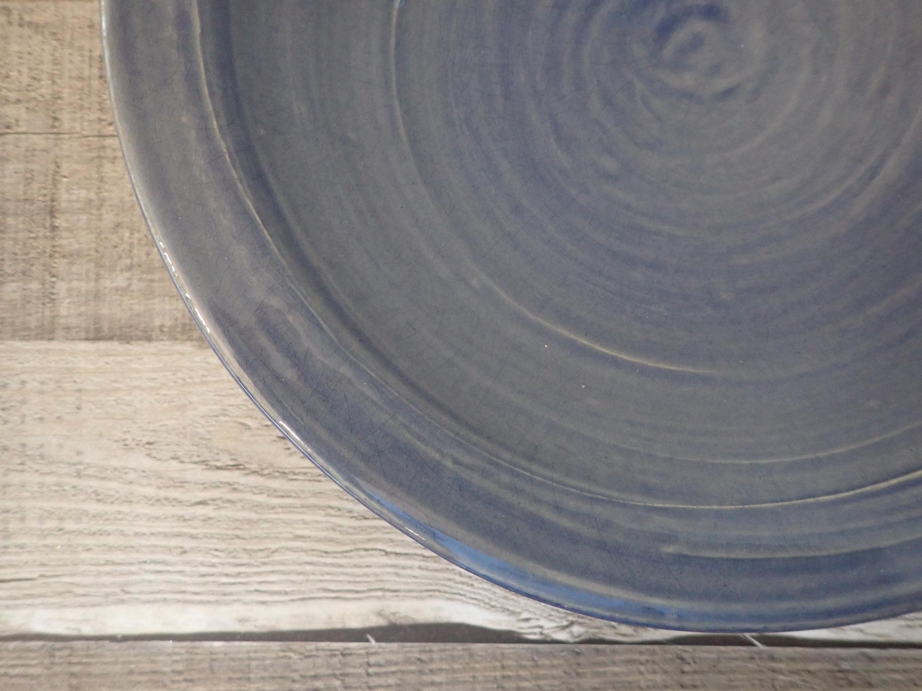 This Rowe Pottery Works soup or pasta bowl is 9.5" in diameter and 2" tall. The bowl is a gray stoneware and has a solid blue glaze on the bowl. The bottom of the bowl is with the Rowe Pottery Works Logo. The bowl is in very good condition with no chips or cracks.