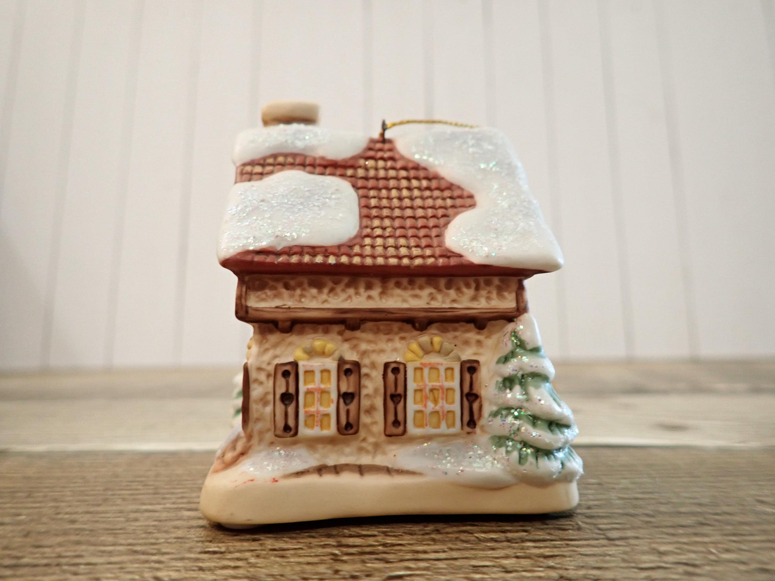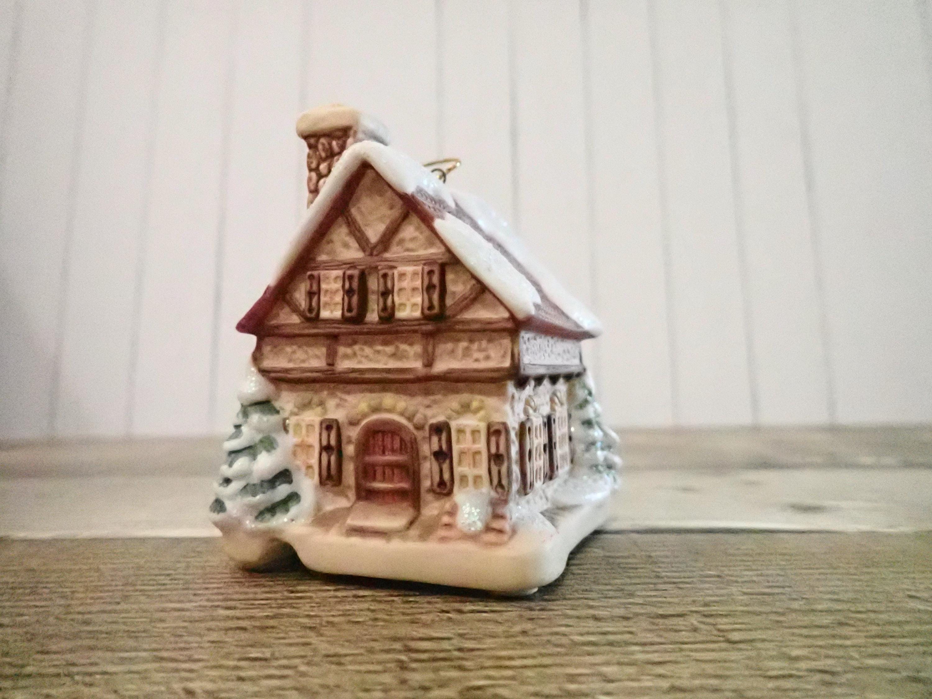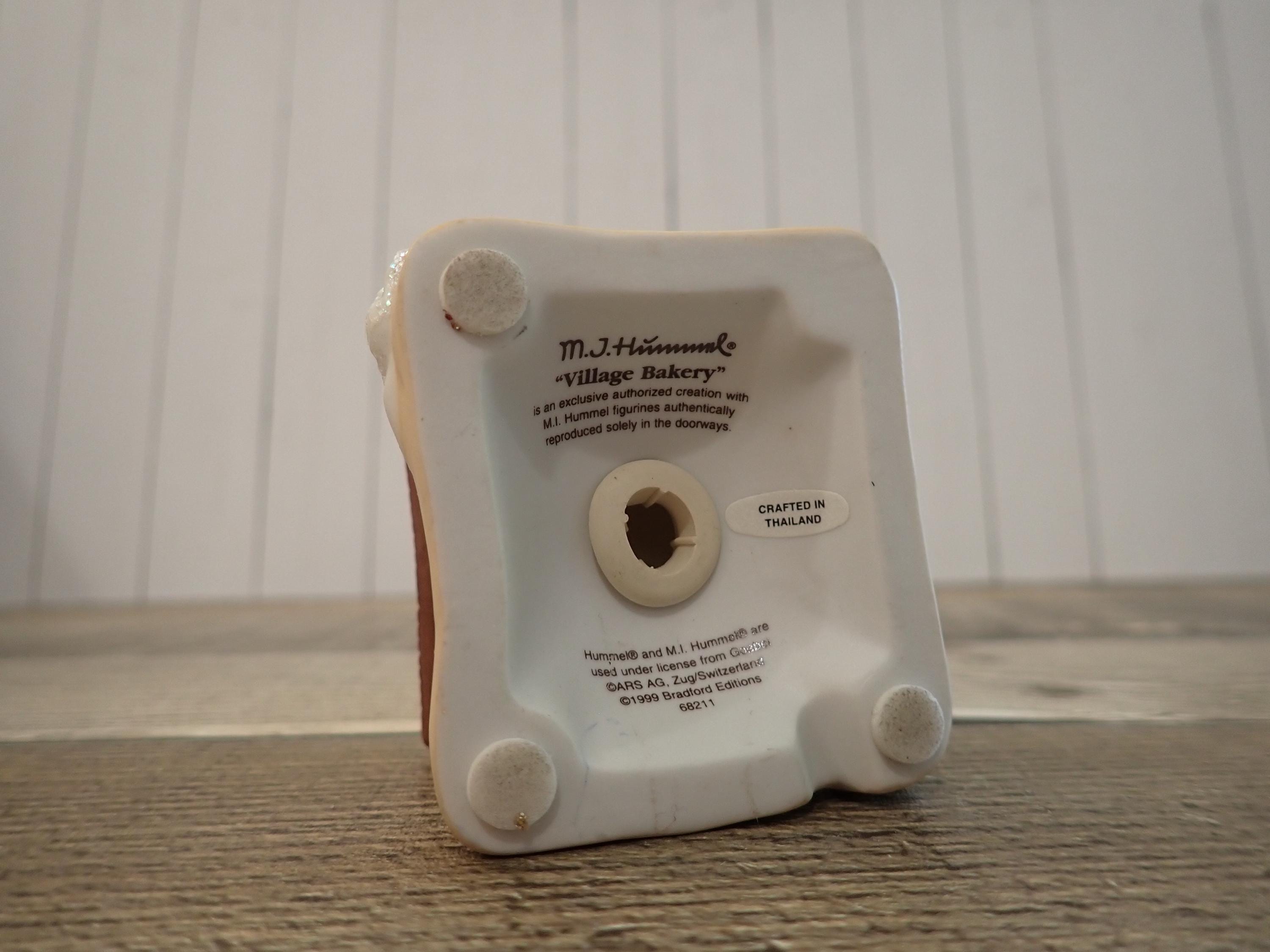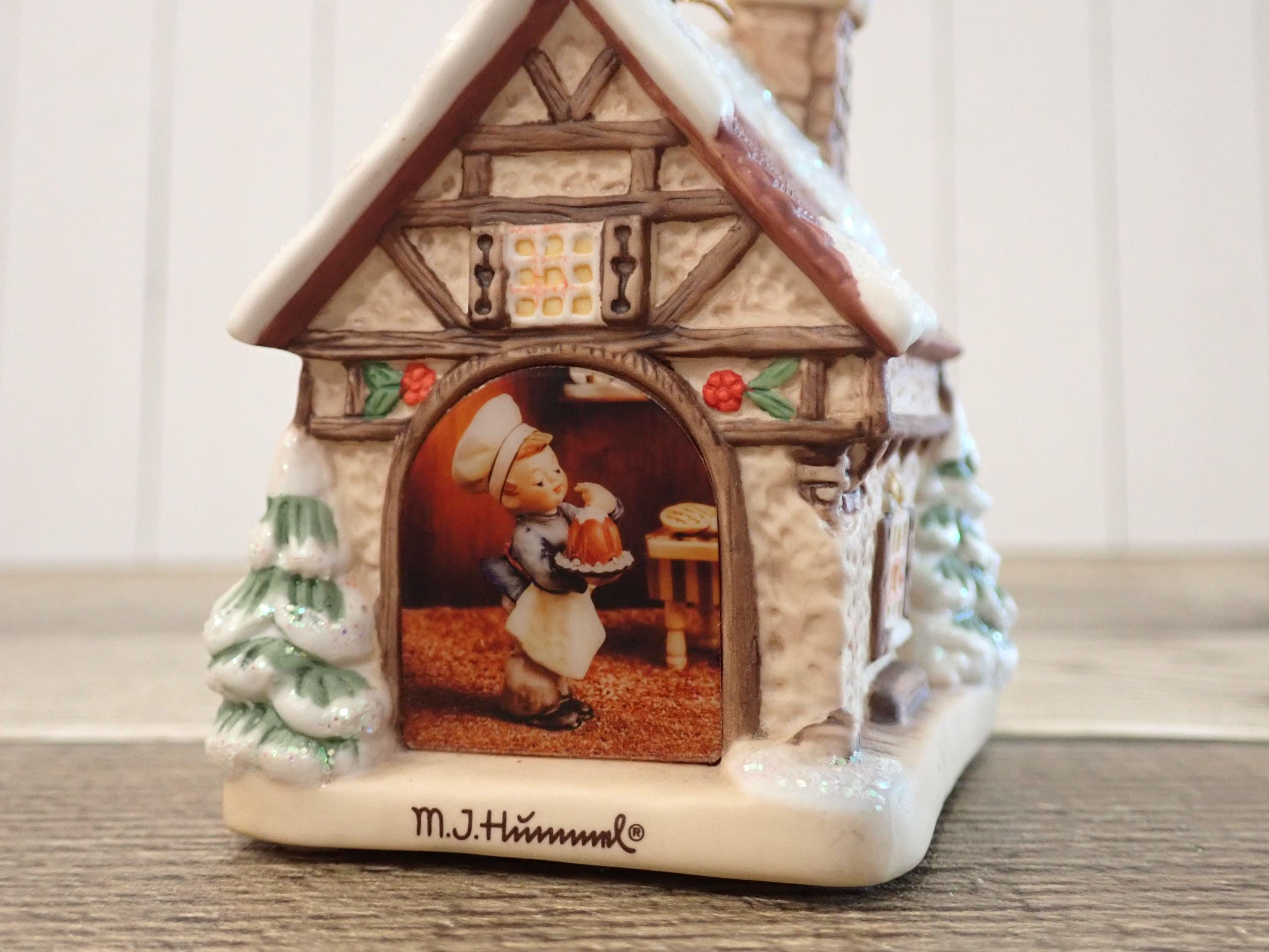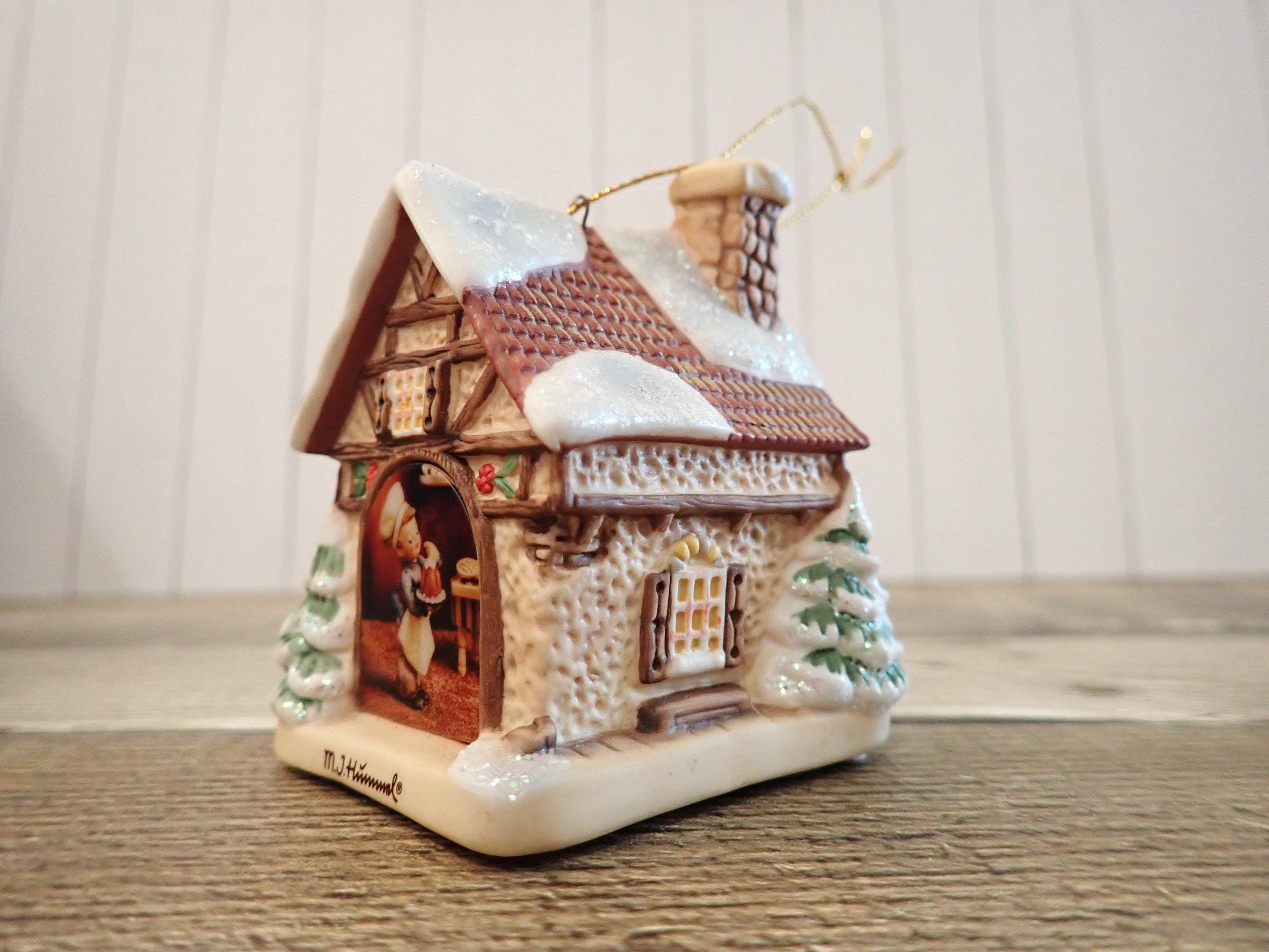 This ceramic Hummel ornament is 2" wide and deep, and 2.5" tall. It is a house shaped ornament with a scene of a Hummel figuring carrying a cake in one of the doorways. The ornament is in very good condition with no damage.