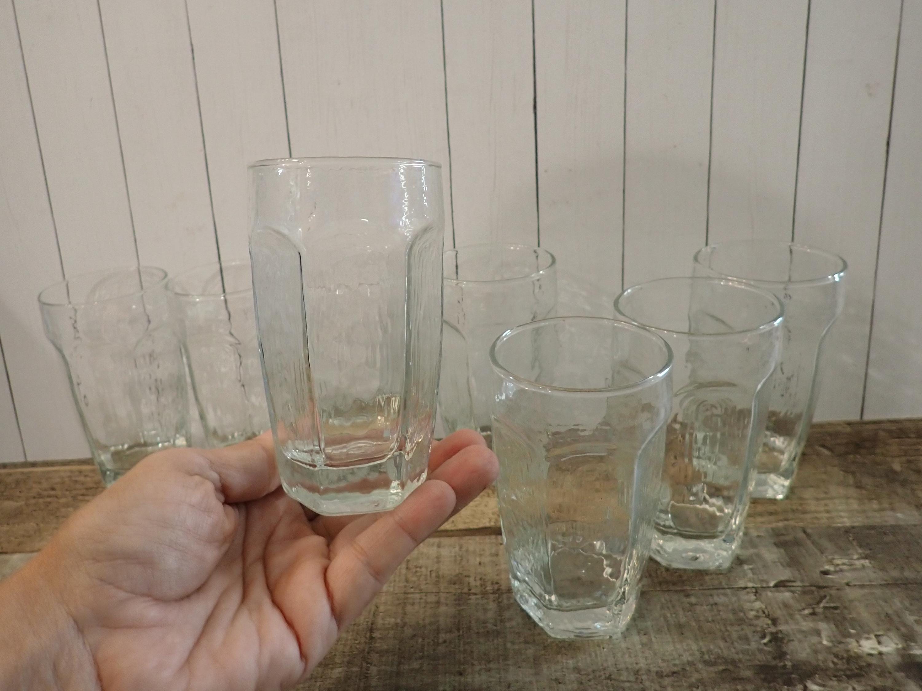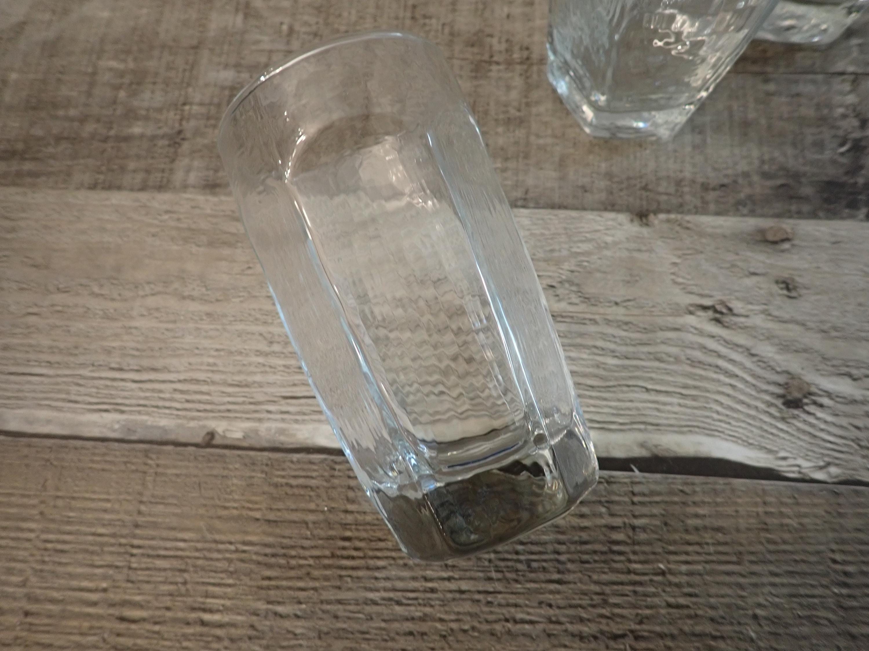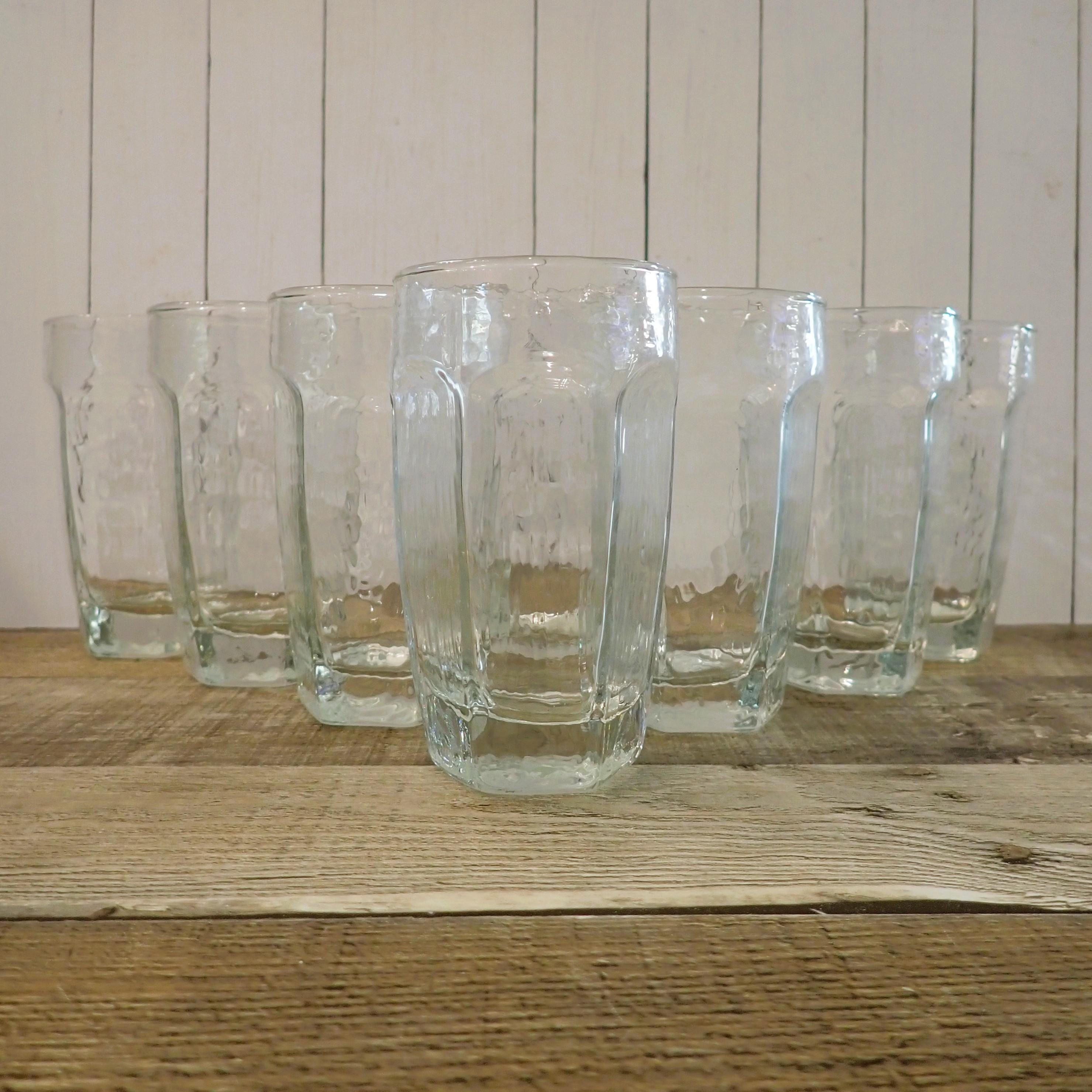 This set of 8 clear glasses by Libbey are in the Chivalry pattern. They are each 4.5" tall and 2.5" in diameter and are the 8 oz. highball glass. They have flat paneled sides with a rounded bevel at the top, and have a lightly textured glass. These are the smallest size of the tumbler style glasses available in this pattern (the larger cooler glasses are 6.25" tall and the iced tea glasses are 5.5" tall.) They can each hold 8 ounces filled to the rim. All 8 glasses are in very good condition with no chips or cracks, but there are some light scratches around the rims. The glasses in this set may be from different production years and have slight variations in the texture of the glass. Great set of Chivalry glasses!