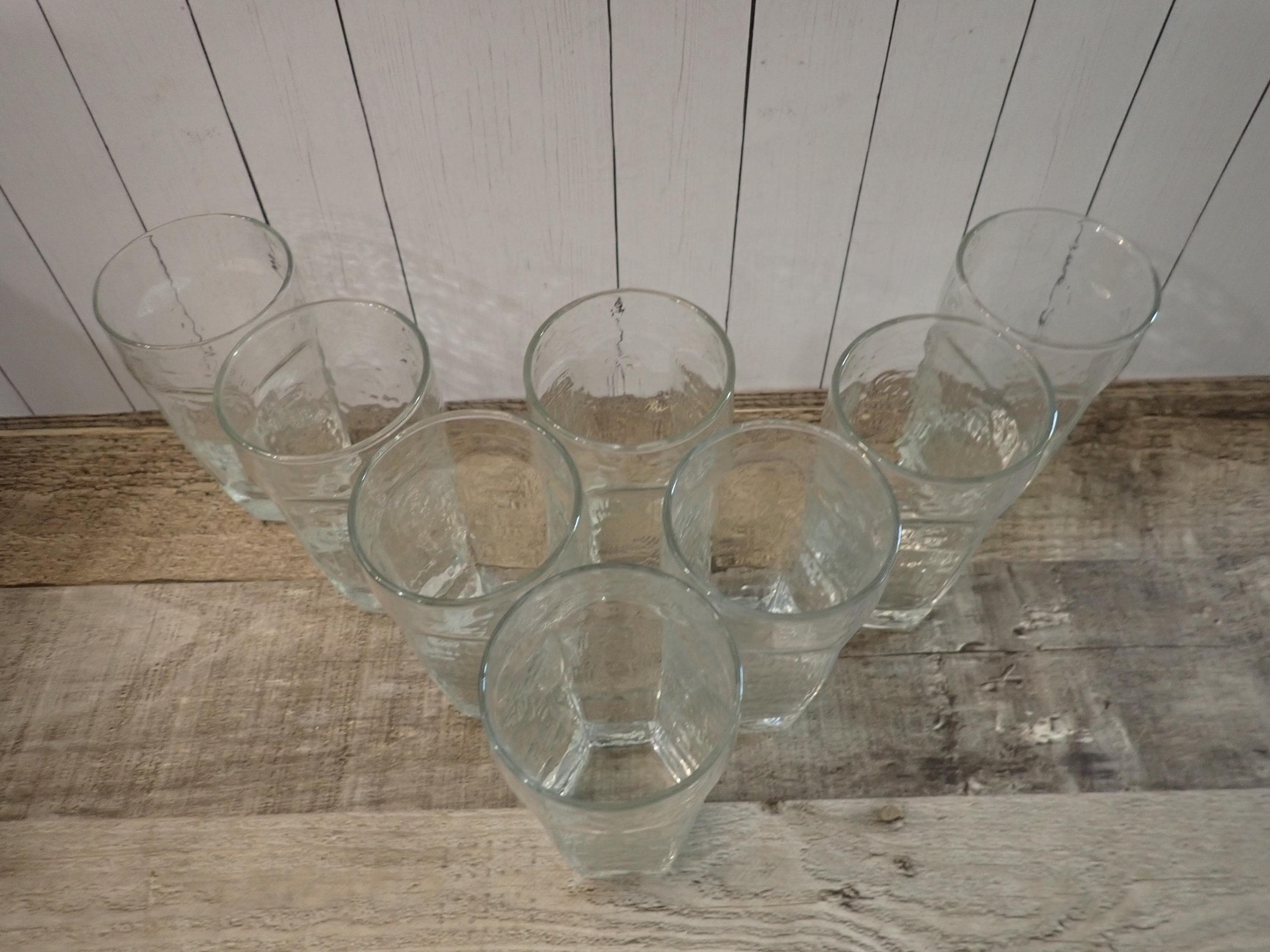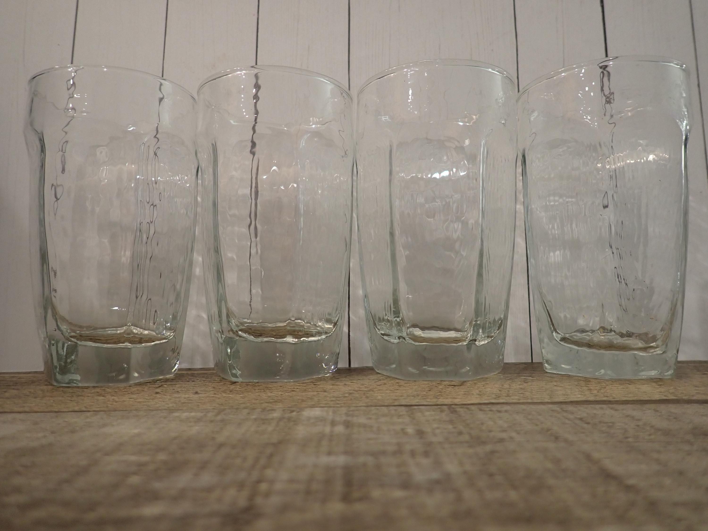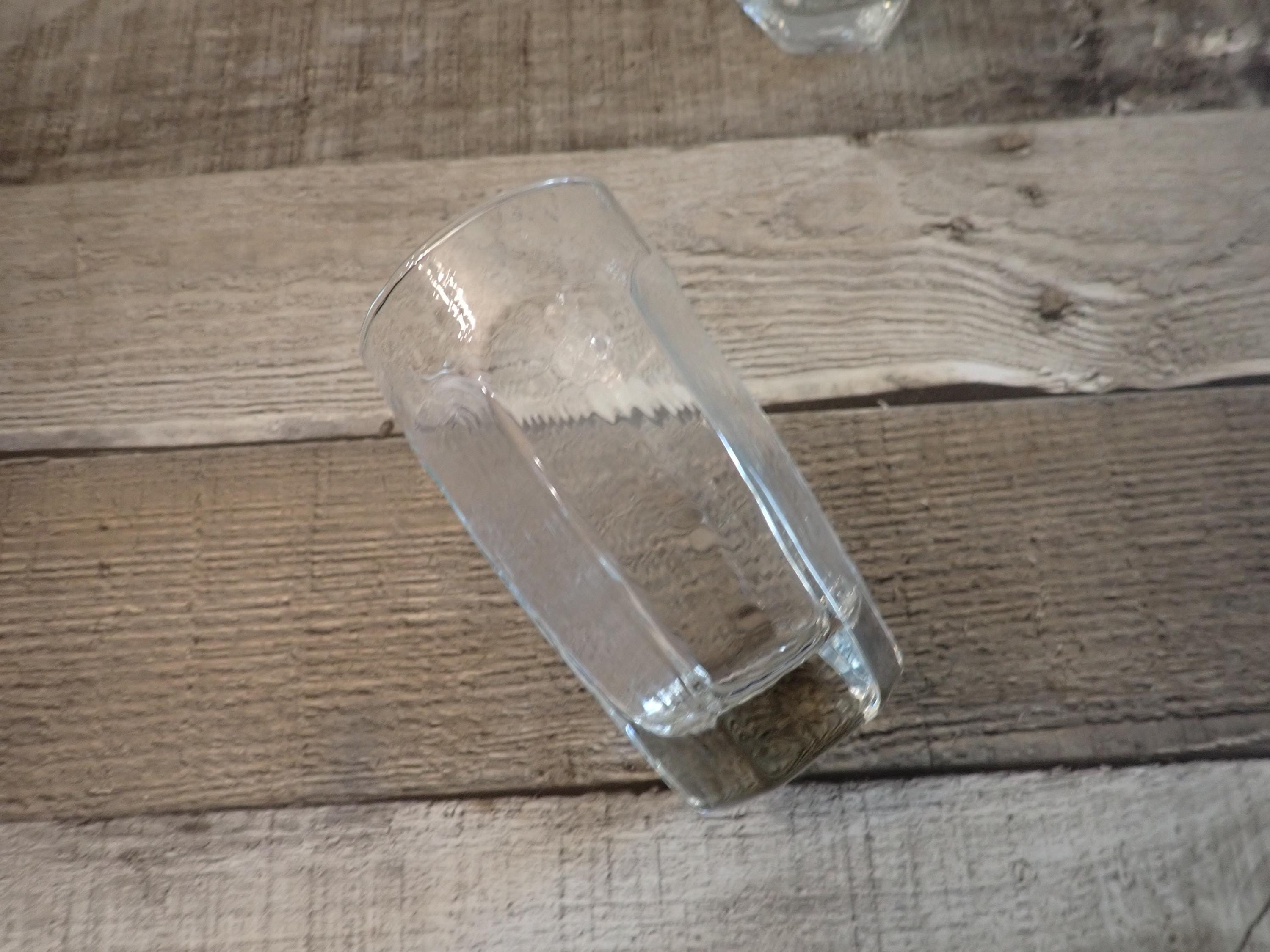 This set of 8 clear glasses by Libbey are in the Chivalry pattern. They are each 4.5" tall and 2.5" in diameter and are the 8 oz. highball glass. They have flat paneled sides with a rounded bevel at the top, and have a lightly textured glass. These are the smallest size of the tumbler style glasses available in this pattern (the larger cooler glasses are 6.25" tall and the iced tea glasses are 5.5" tall.) They can each hold 8 ounces filled to the rim. All 8 glasses are in very good condition with no chips or cracks, but there are some light scratches around the rims. The glasses in this set may be from different production years and have slight variations in the texture of the glass. Great set of Chivalry glasses!