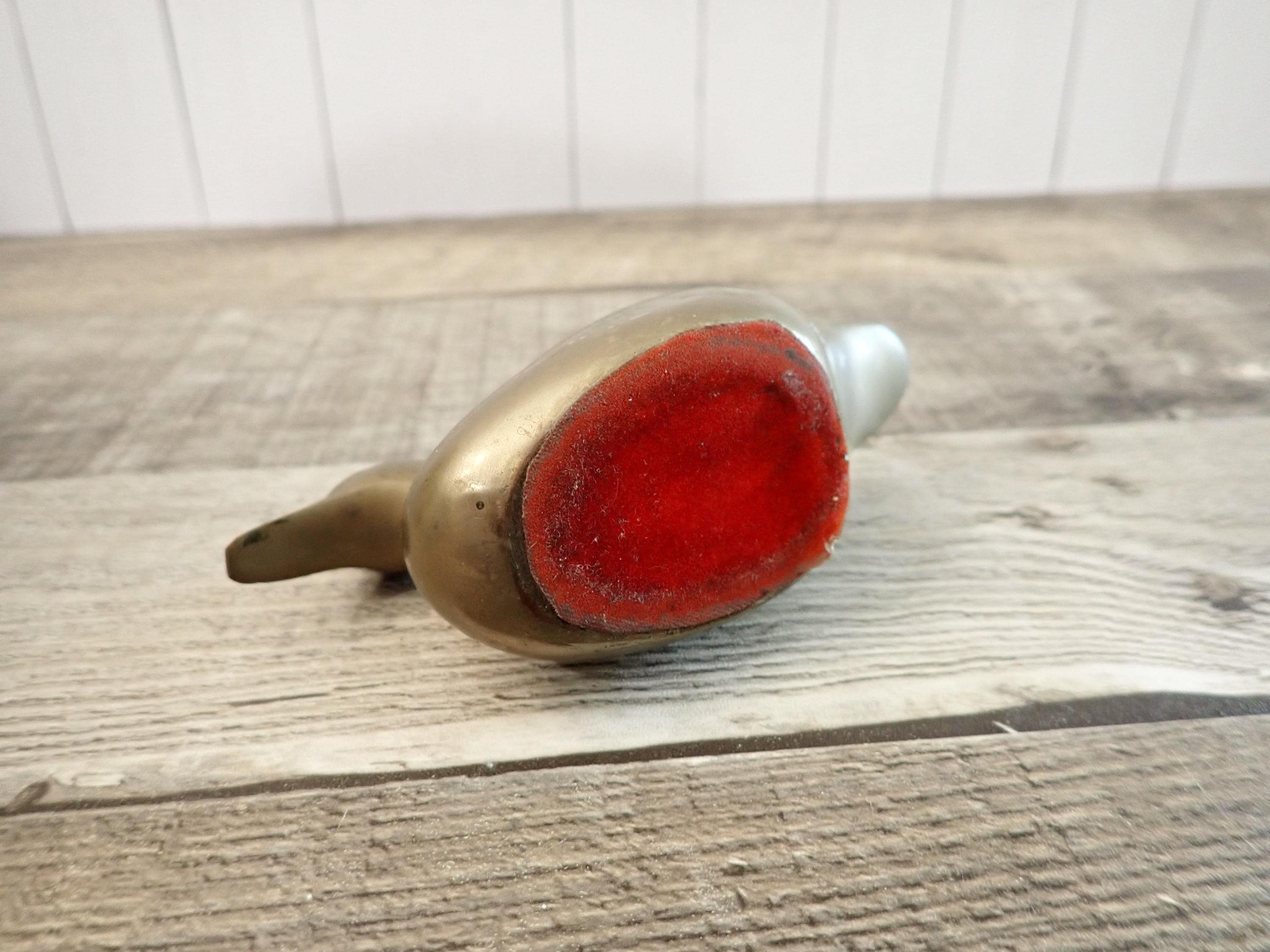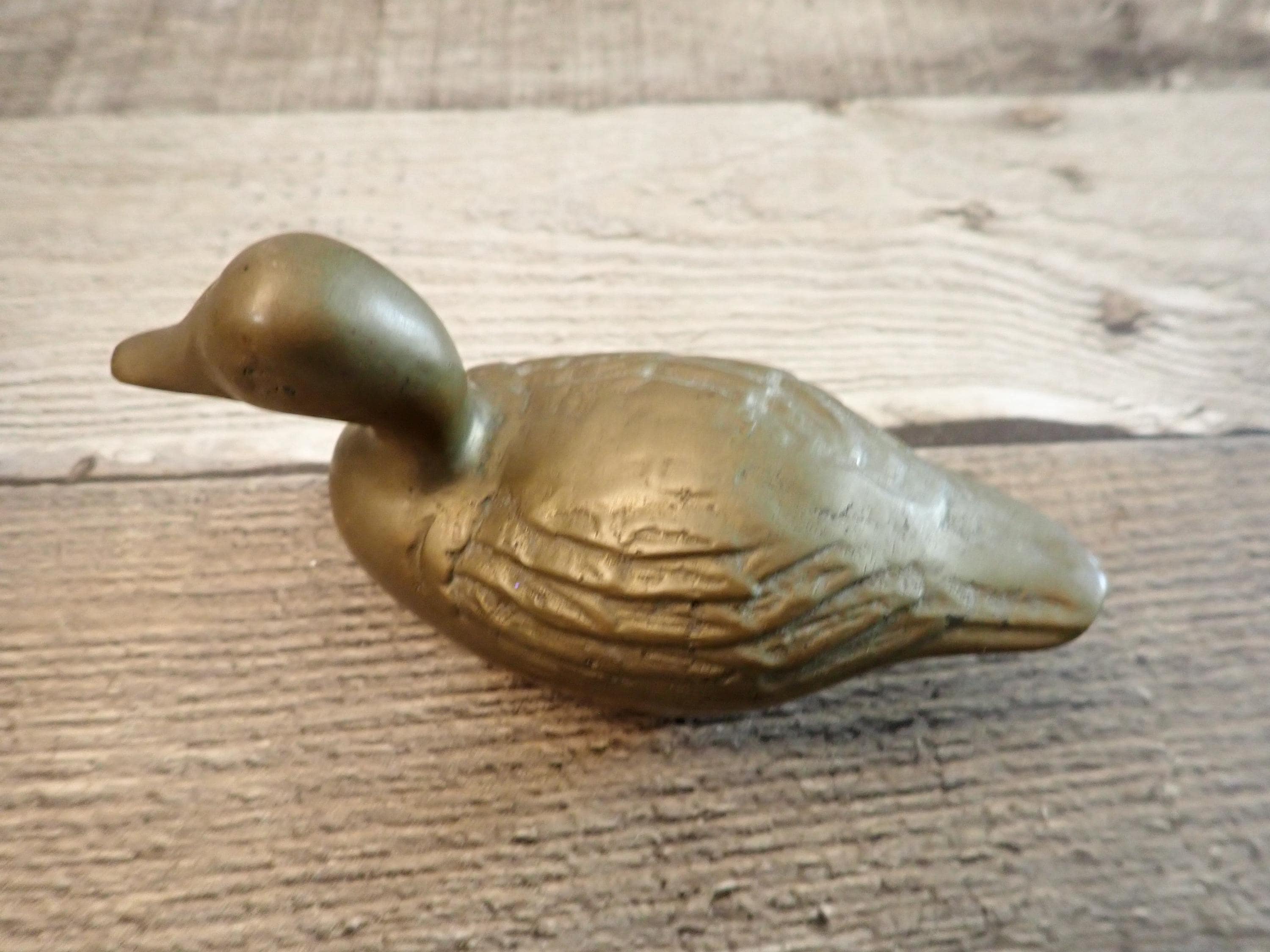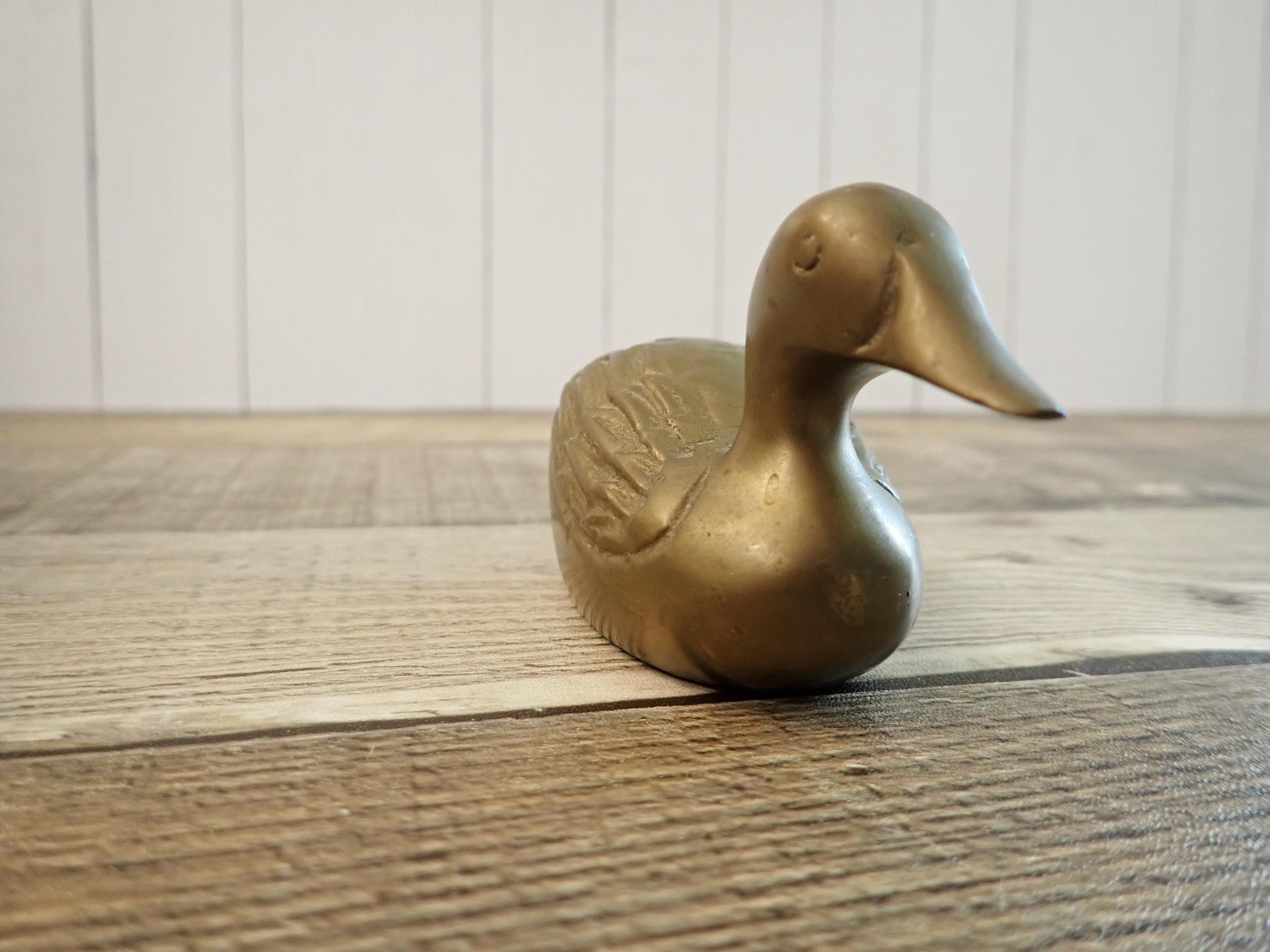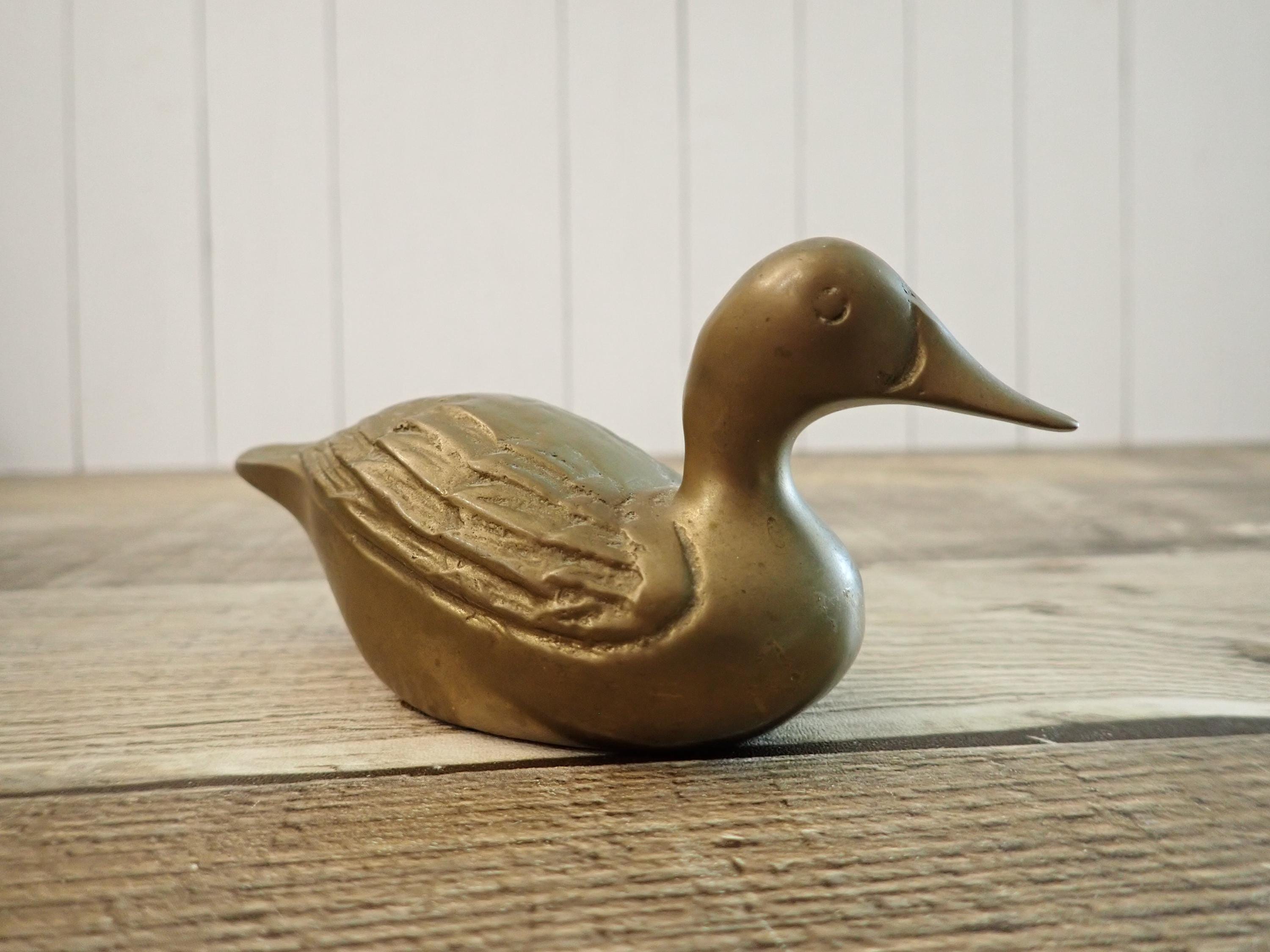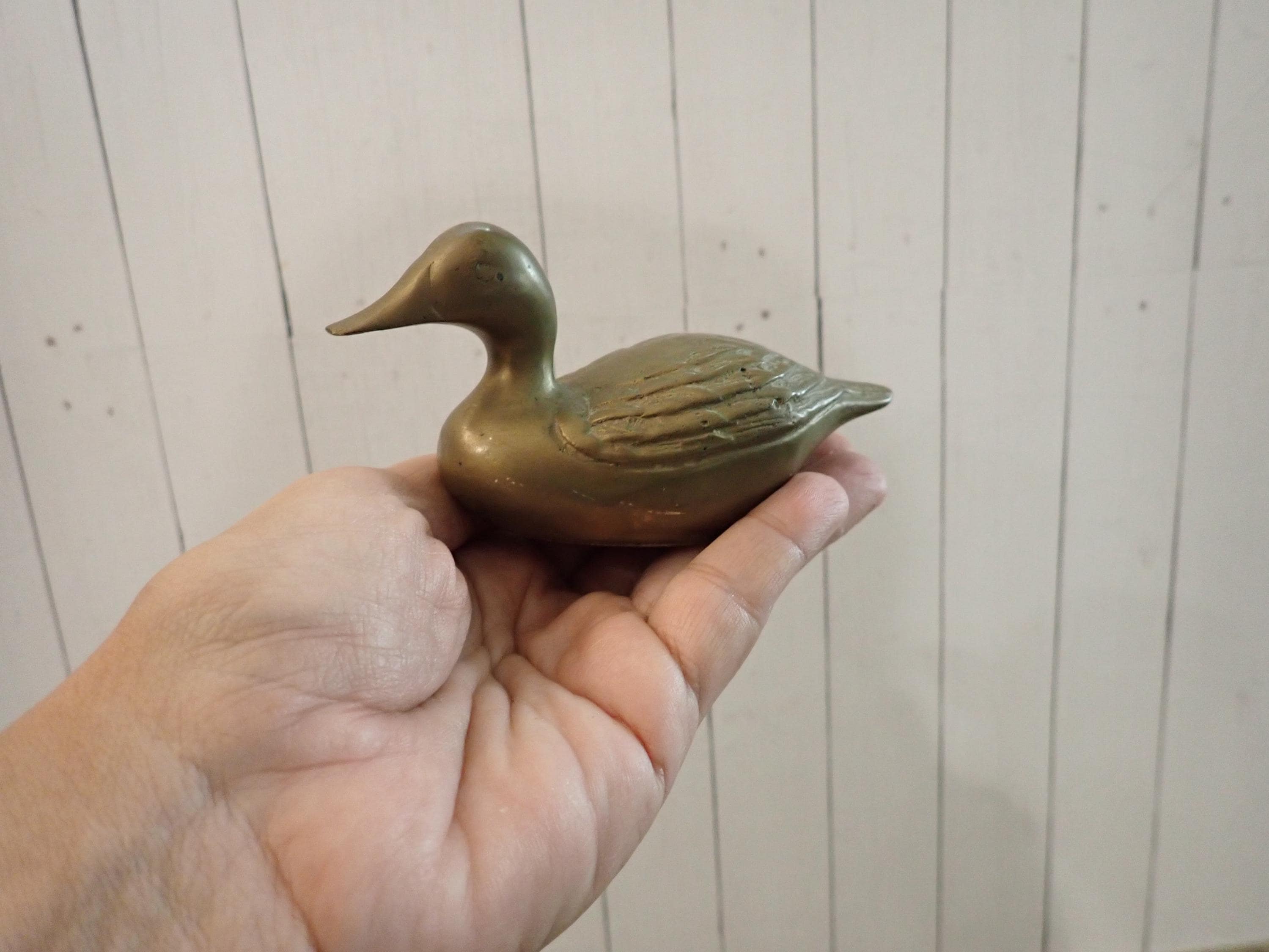 This small brass duck 2" tall, 4.5" long, and 2" wide. He sits in an upright position, and is nicely detailed with feather on his body. The figurine is in very good condition.